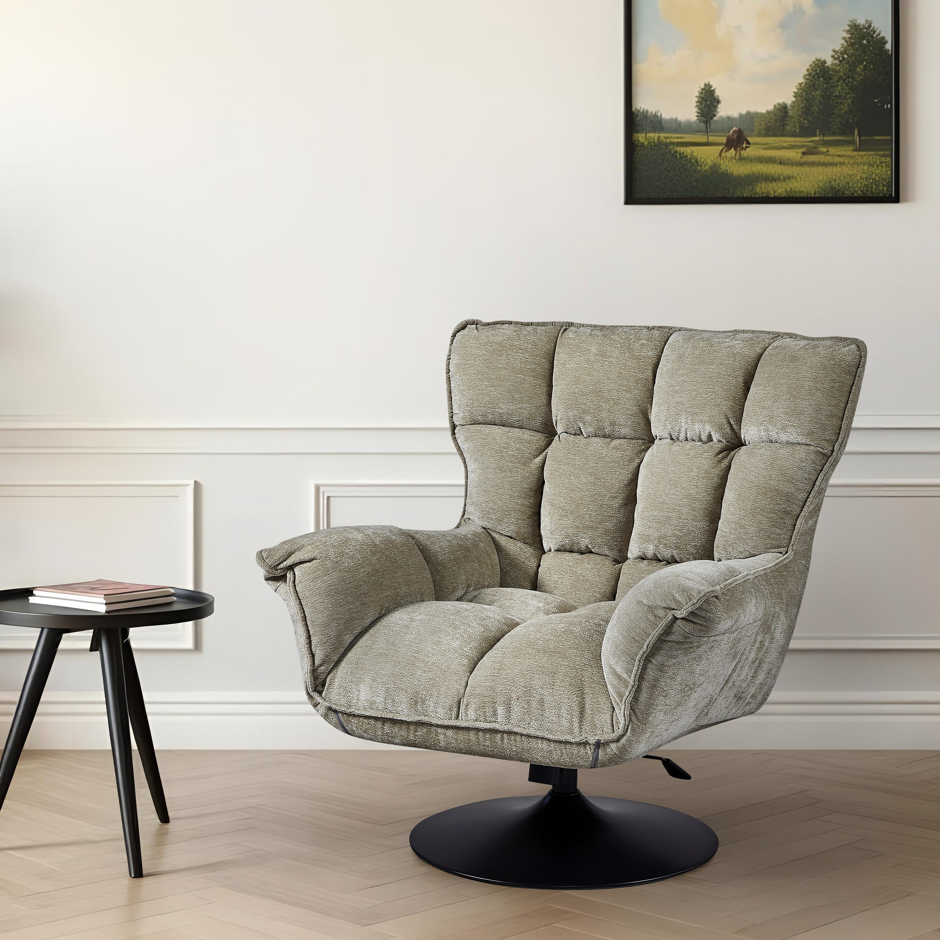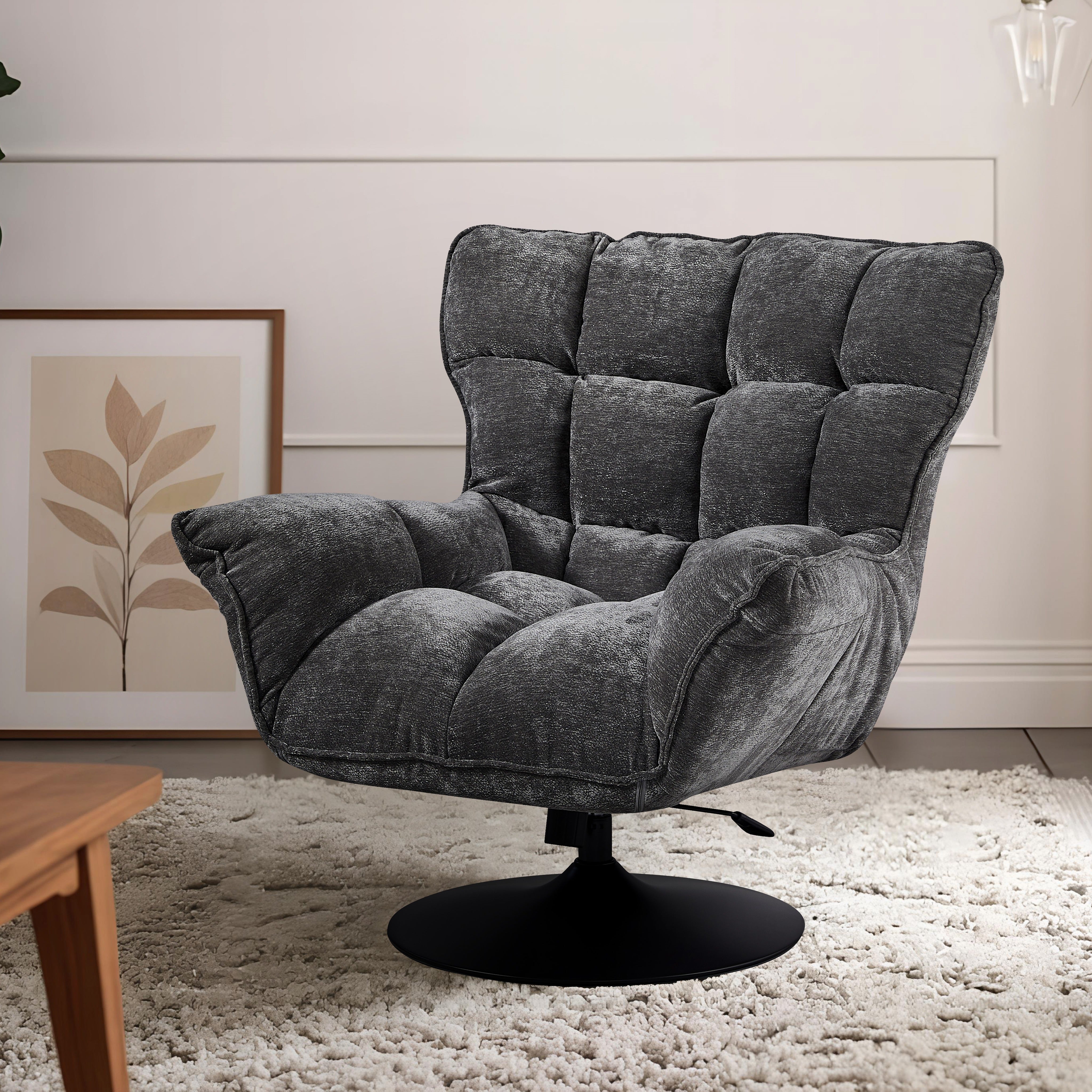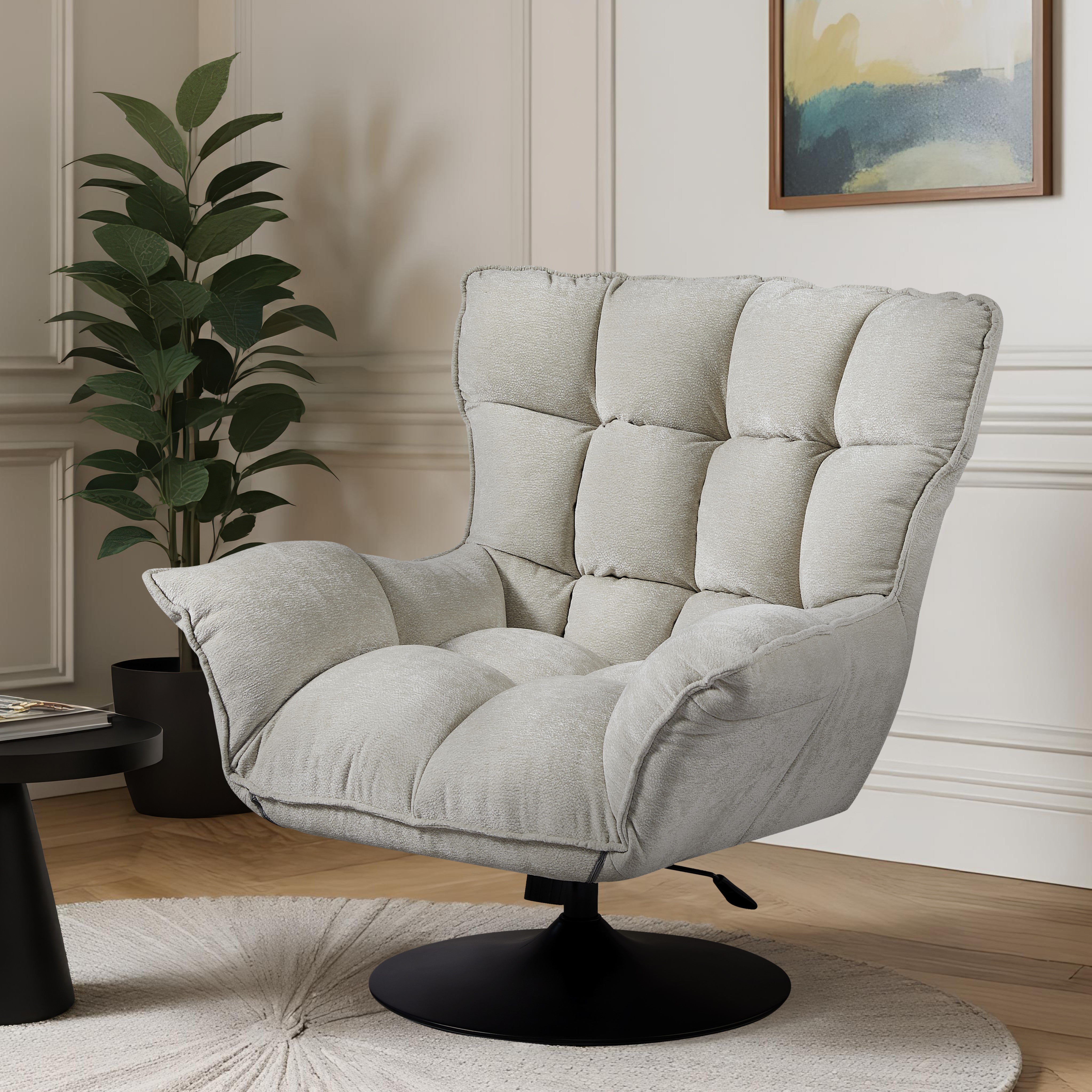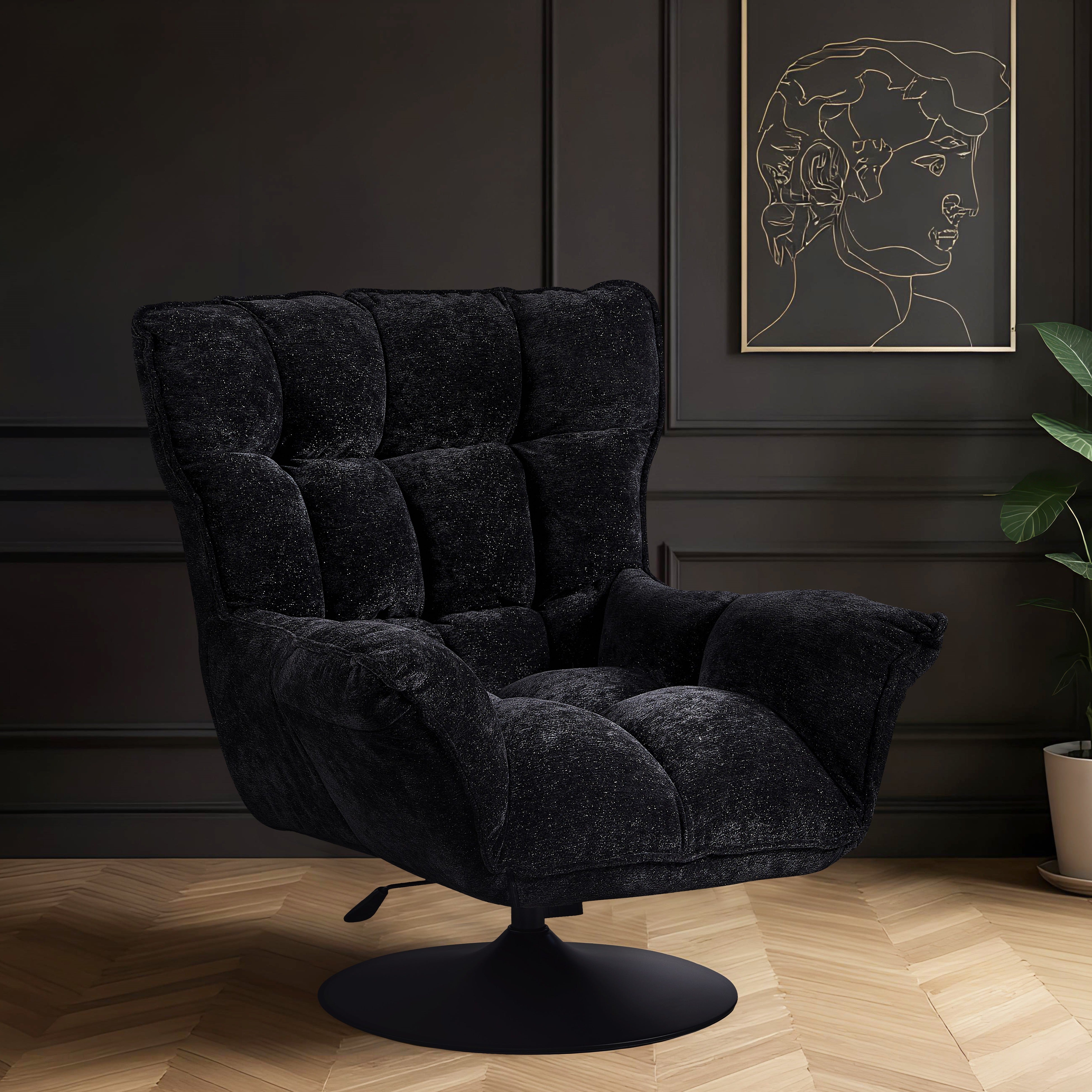 Jego obszerna, ergonomiczna forma z wysokim oparciem i miękkim siedziskiem idealnie otula sylwetkę, zapewniając optymalne podparcie podczas odpoczynku. Całość spoczywa na solidnej, czarnej podstawie ze stali, która dzięki funkcji obrotowej łączy stabilność z pełną swobodą ruchów, czyniąc ten mebel doskonałym wyborem do nowoczesnego salonu, gabinetu czy strefy chillout.