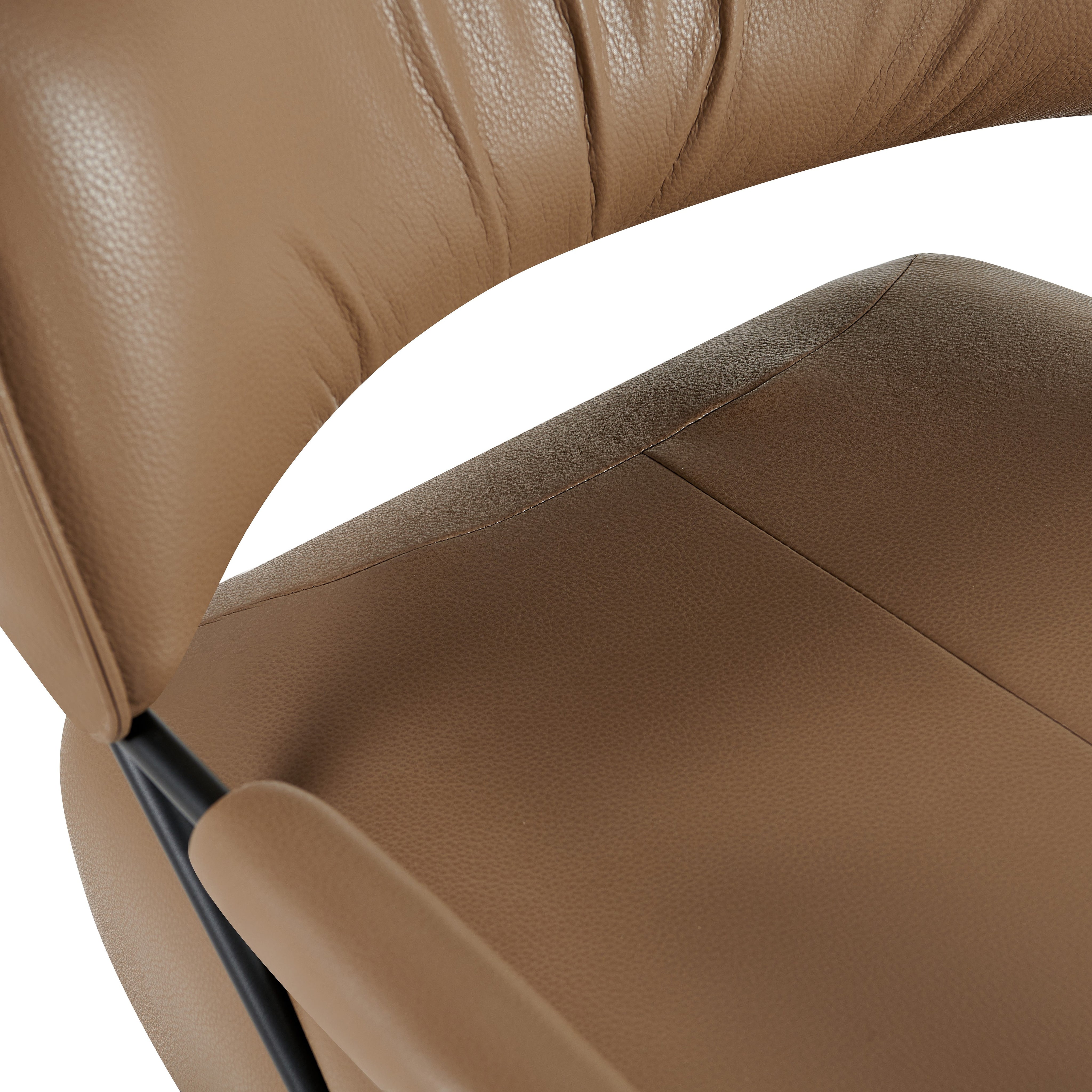 Smukłe nogi wykonane ze stali, malowane proszkowo na czarno, zapewniają stabilne podparcie oraz spójną estetykę całej konstrukcji, podkreślając nowoczesną formę fotela.