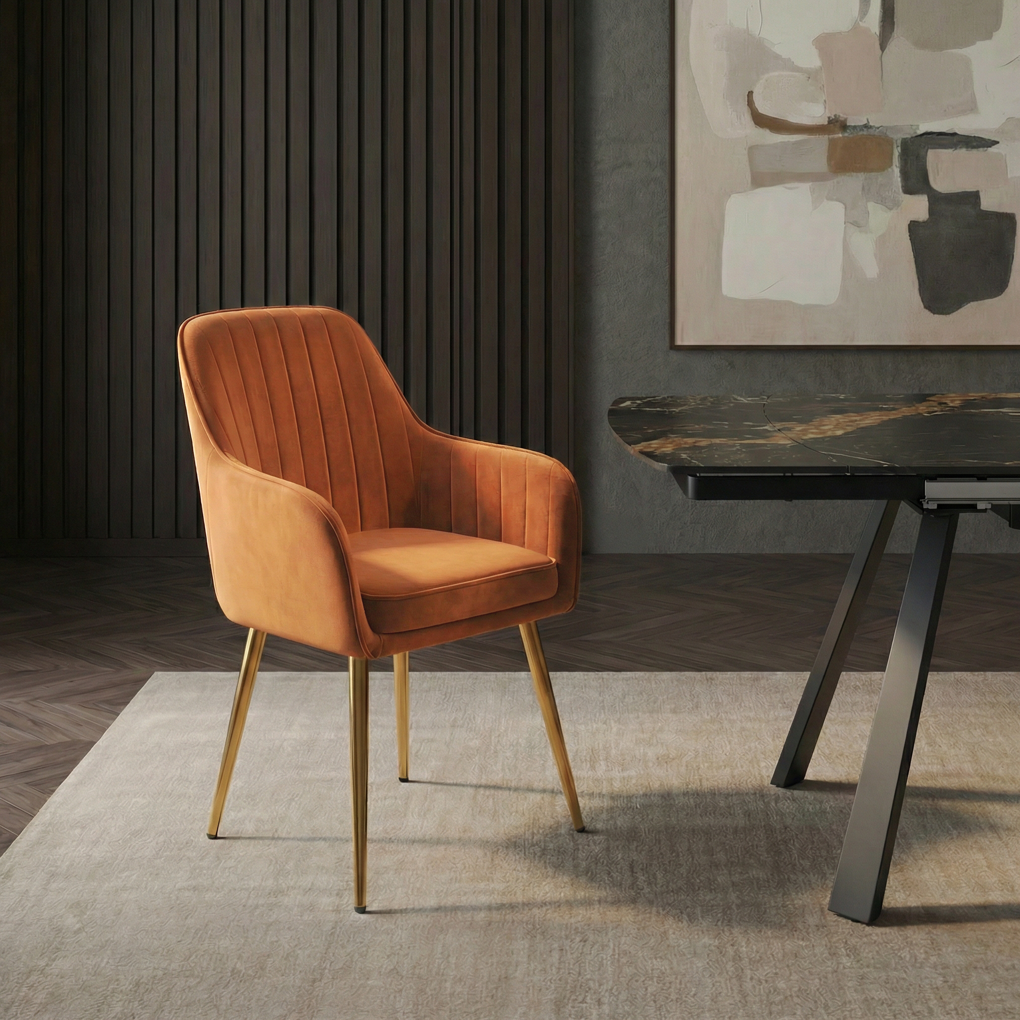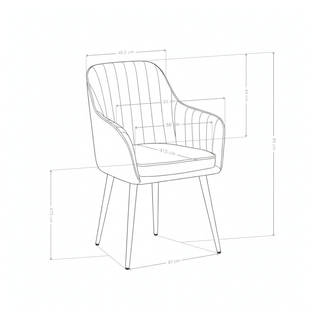 Miękka tapicerka welurowa jest przyjemna w dotyku i zapewnia komfort podczas codziennego użytkowania. Profilowane oparcie z pionowymi przeszyciami stabilnie podpiera plecy, a grube, dobrze wypełnione siedzisko zwiększa wygodę siedzenia zarówno przy posiłkach, jak i podczas dłuższych spotkań przy stole.
