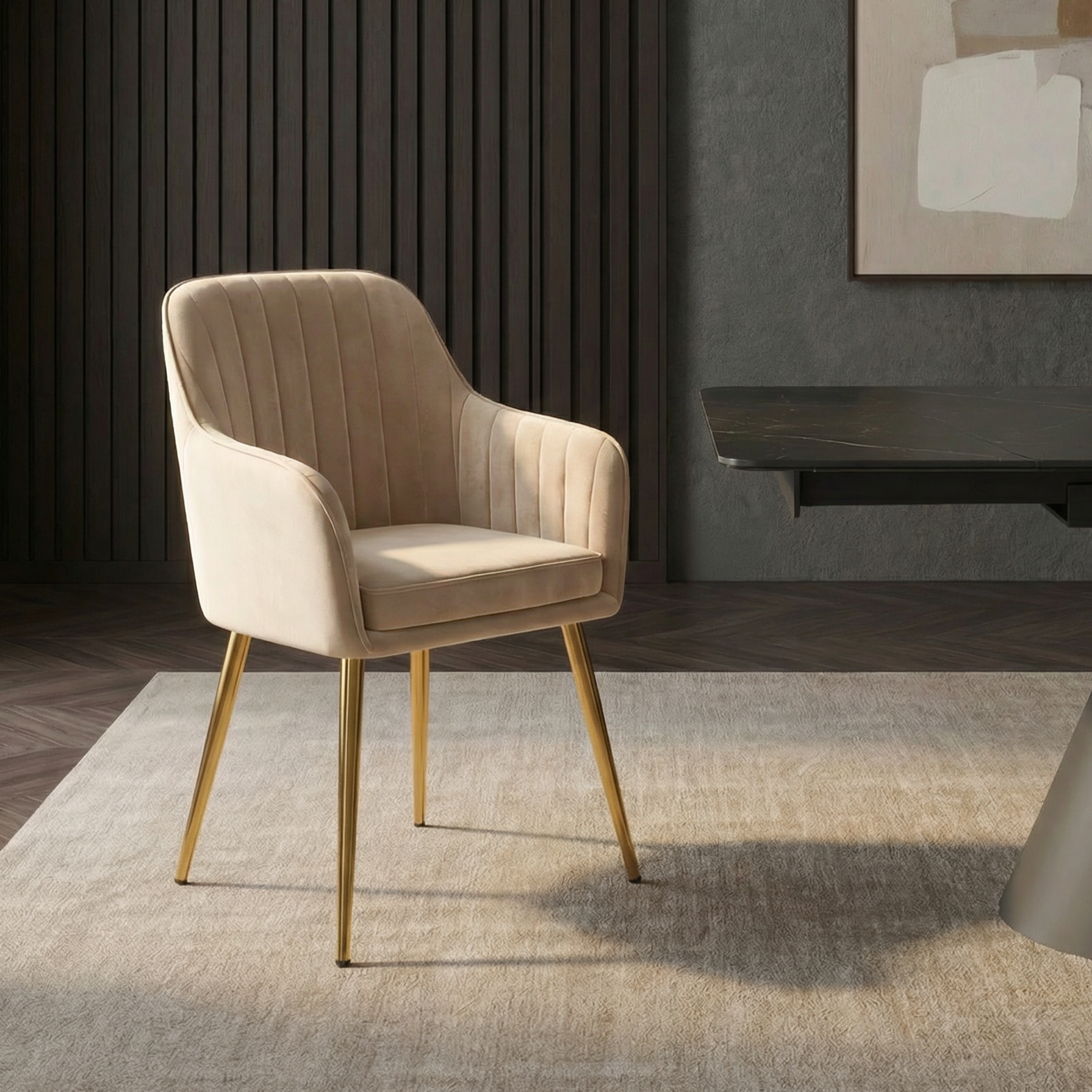 Krzesło 239 to eleganckie krzesło do jadalni tapicerowane welurem w kolorze beżowym, zaprojektowane z myślą o wnętrzach o podwyższonym standardzie wykończenia. Stonowana kolorystyka w połączeniu ze złotymi, chromowanymi nogami nadaje meblowi wyraźnie luksusowy, a jednocześnie nowoczesny charakter.