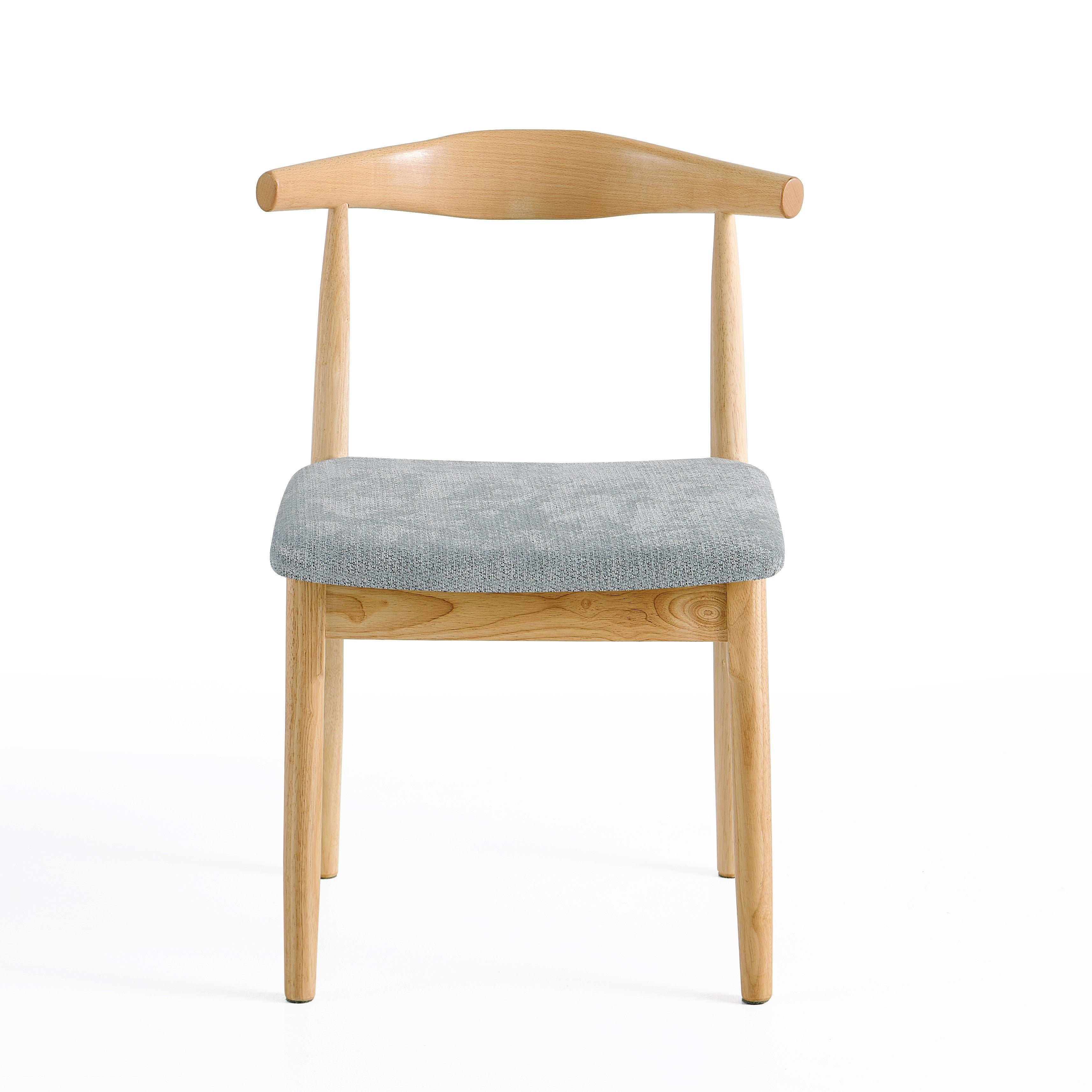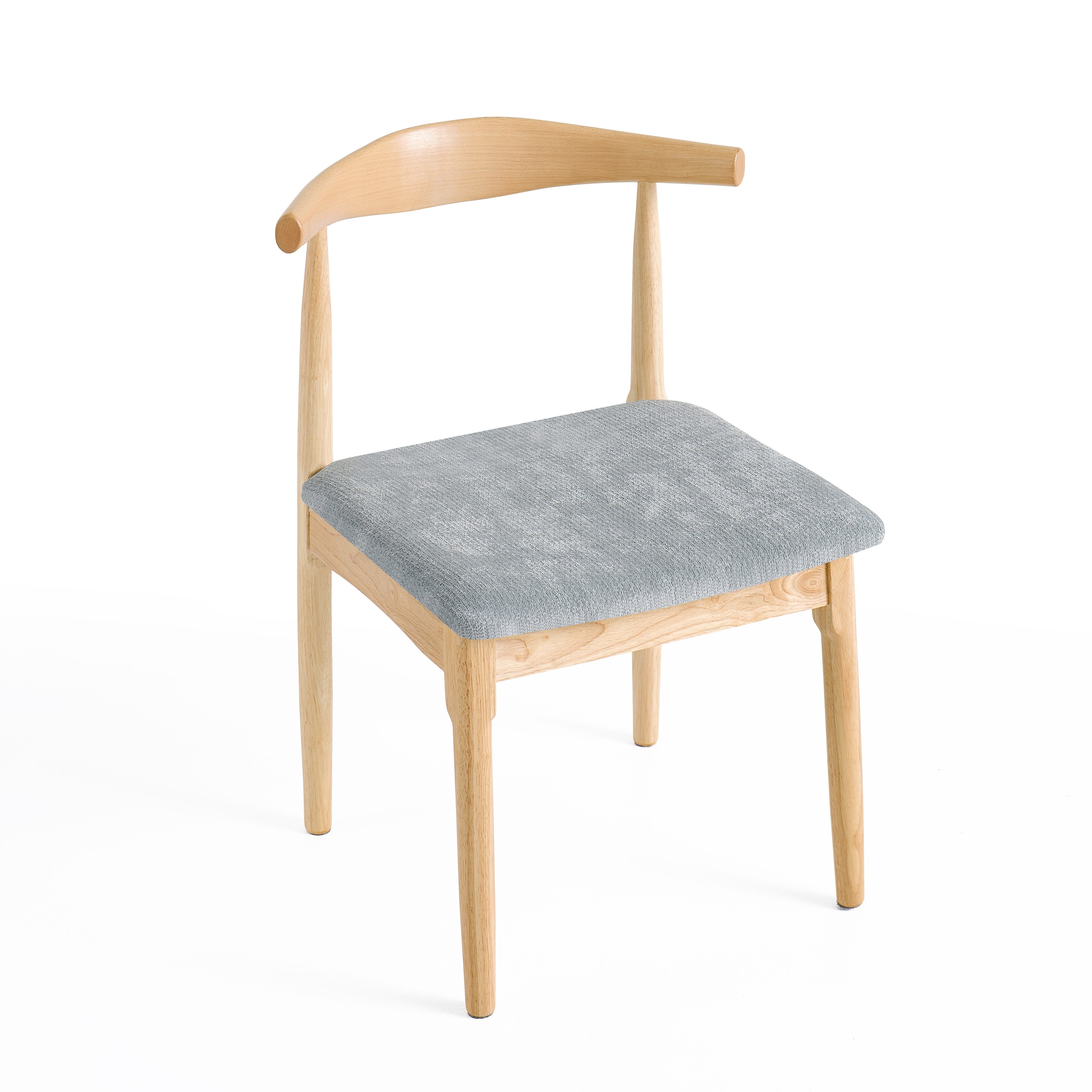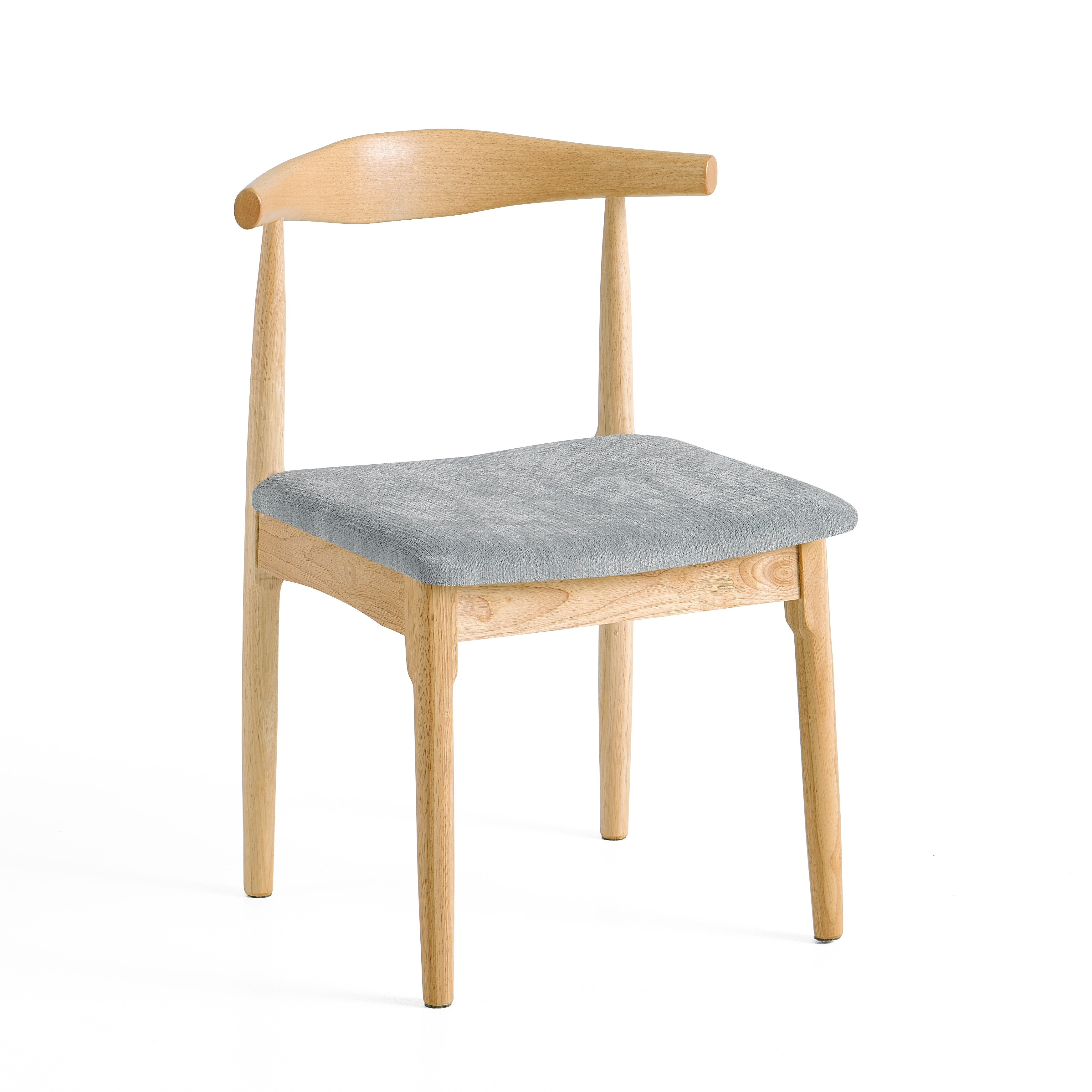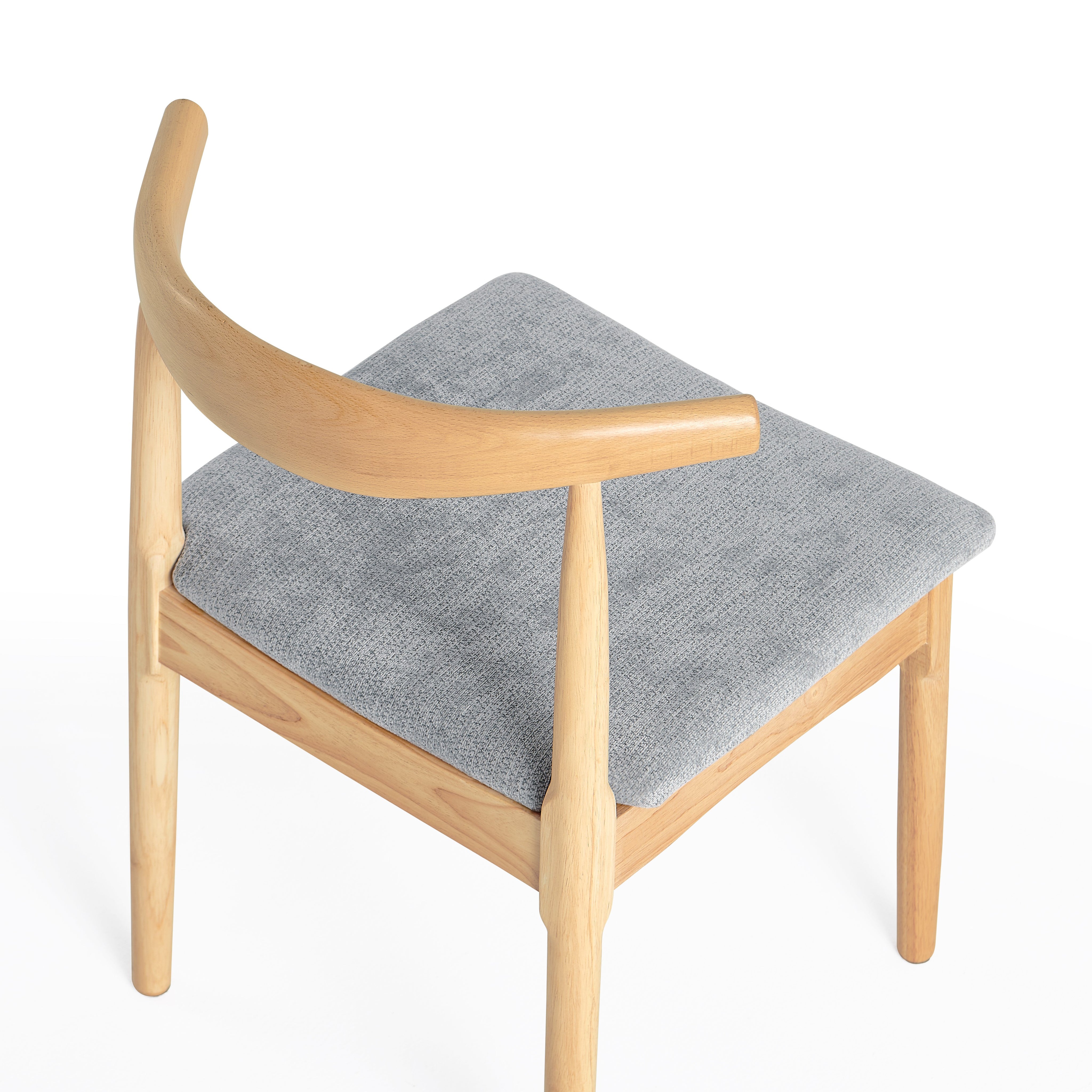 Siedzisko zostało tapicerowane miękką tkaniną w szarym kolorze, zapewniając wygodę podczas siedzenia przy stole. Delikatnie wyprofilowane oparcie stabilnie podpiera plecy i zwiększa komfort użytkowania.