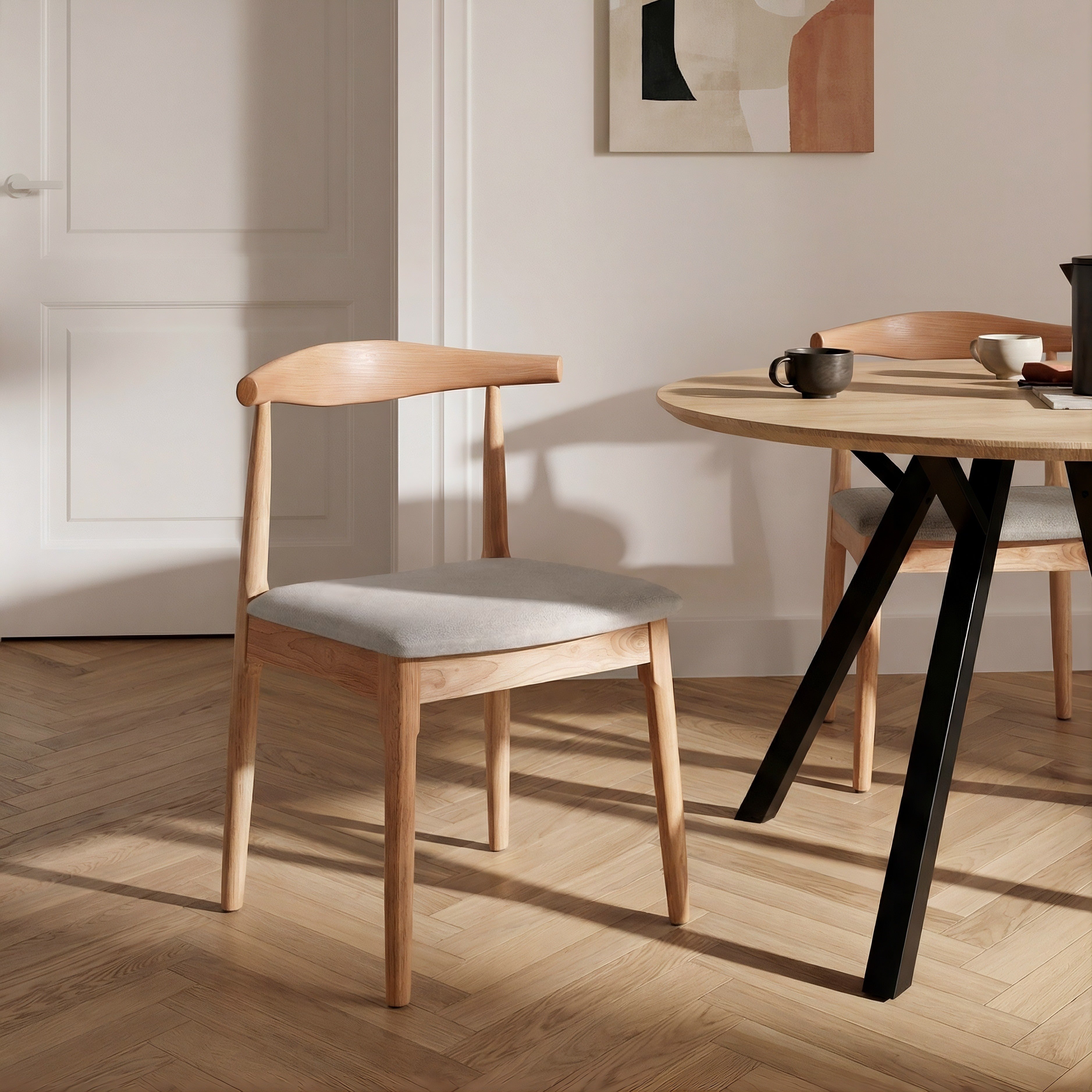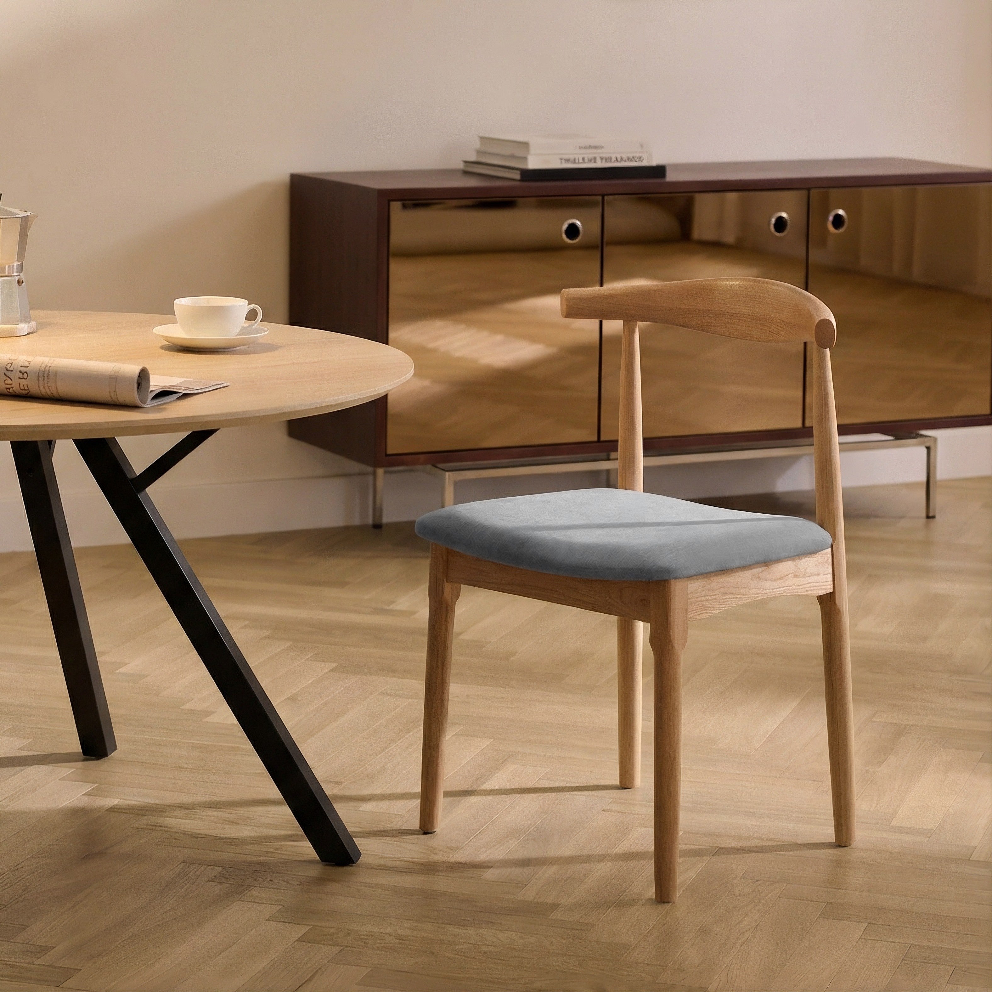Krzesło Naturalne Drewniane W Kolorze Dębu Tapicerowane Szare to praktyczne i estetyczne krzesło do jadalni, które łączy naturalny wygląd drewna z komfortem codziennego użytkowania. Konstrukcja wykonana jest z naturalnego drewna wykończonego w wybarwieniu na kolor dębu, dzięki czemu mebel zyskuje ciepły i uniwersalny charakter, dobrze komponujący się z nowoczesnymi, skandynawskimi oraz klasycznymi wnętrzami.
