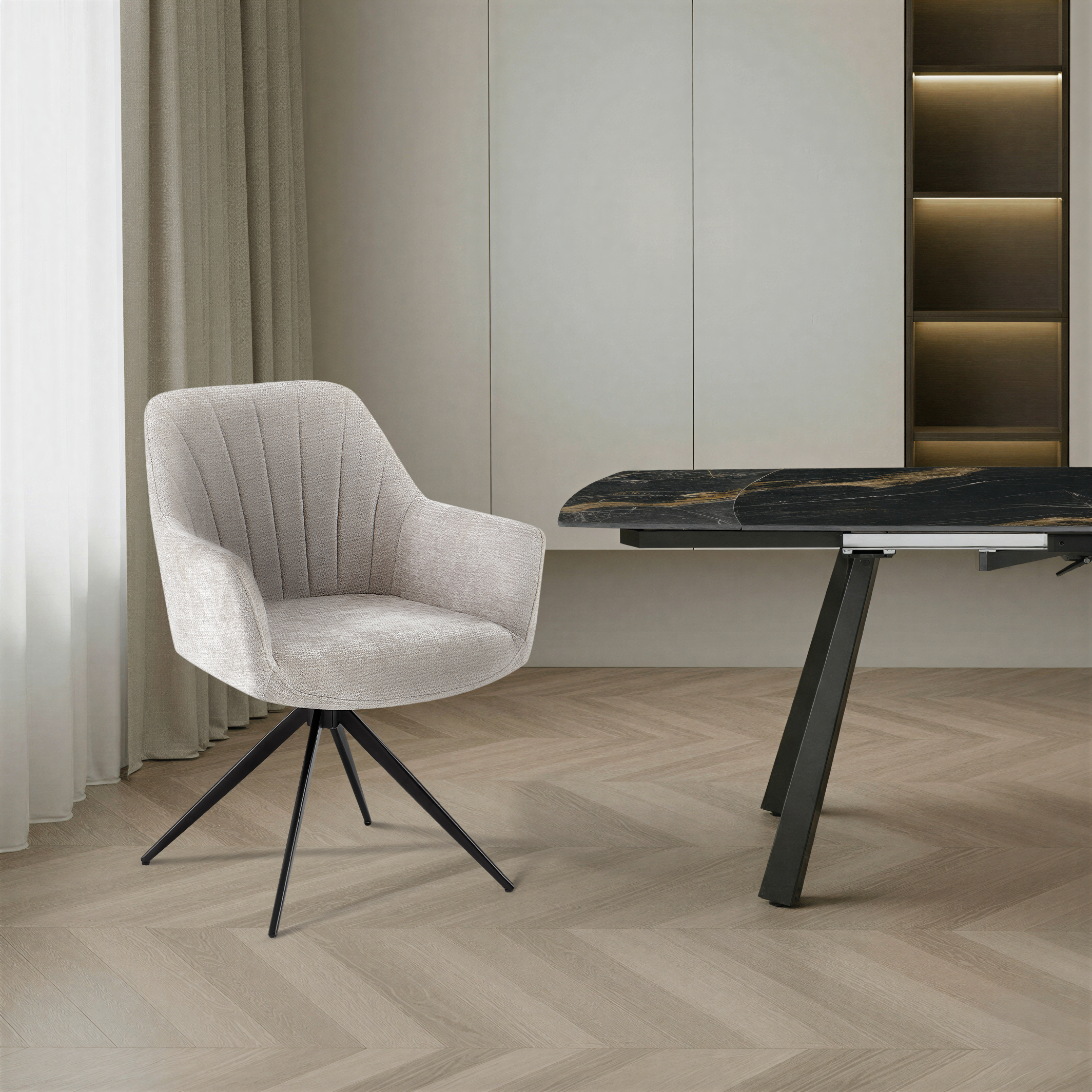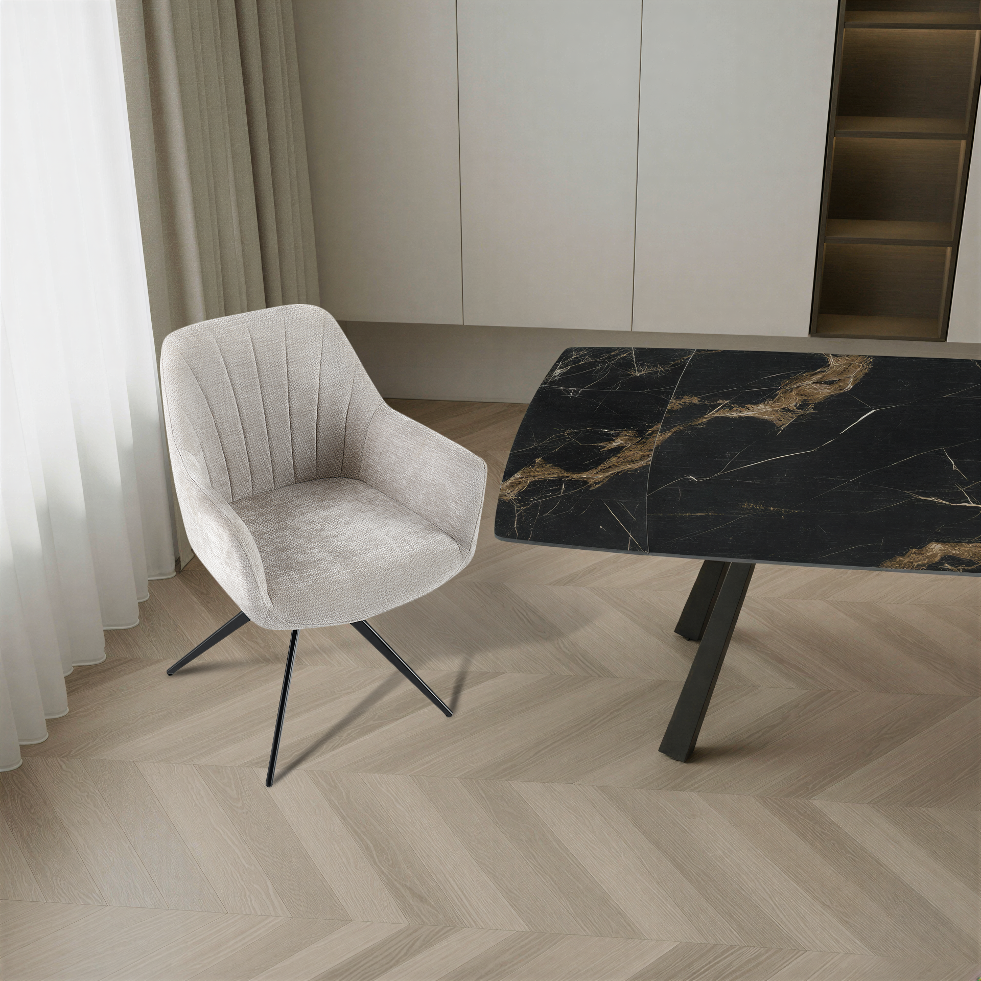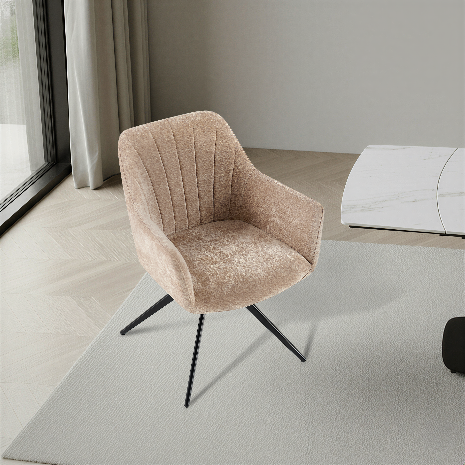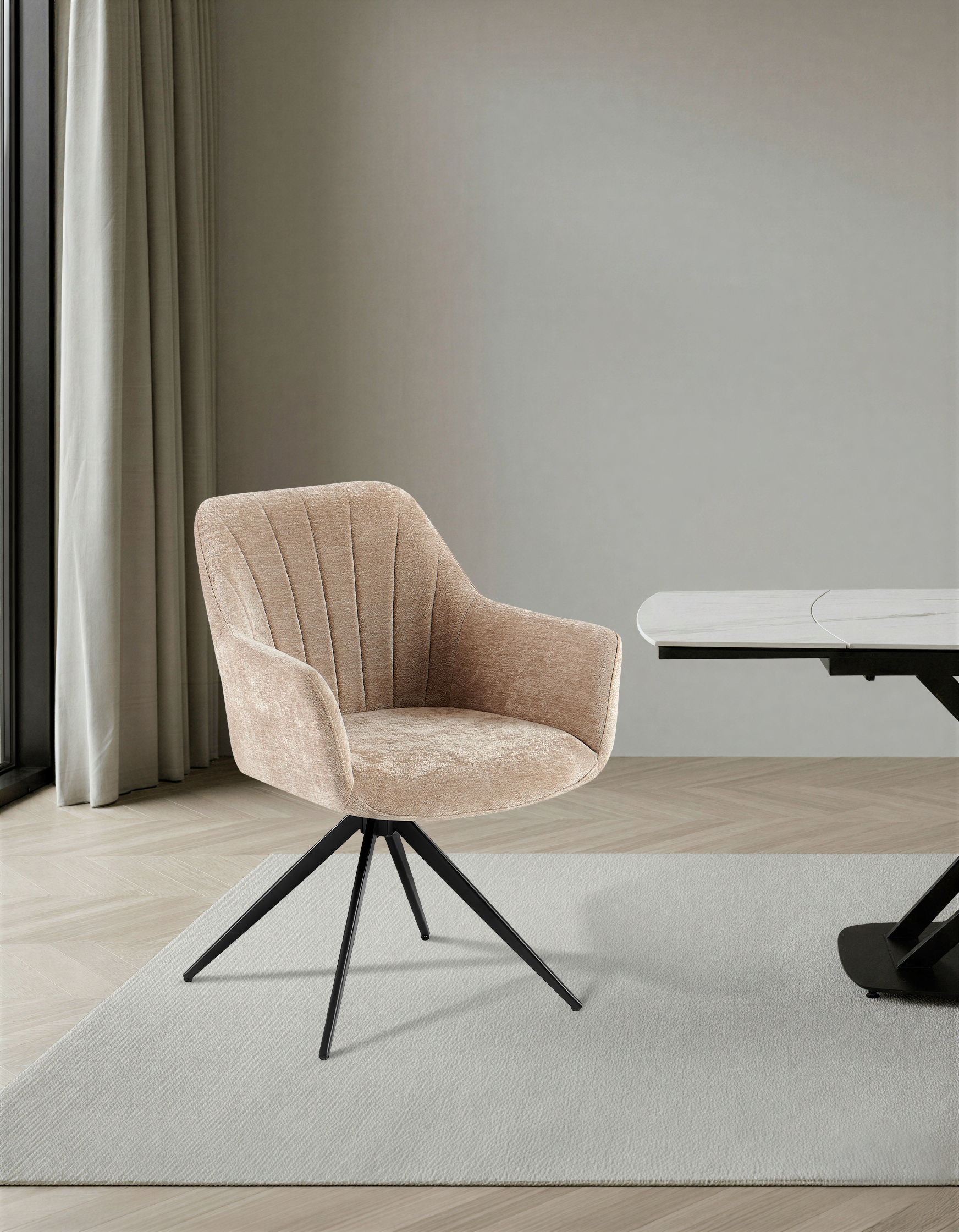 Krzesło zostało zaprojektowane z myślą o maksymalnym komforcie podczas codziennego użytkowania. Wykonane z wysokiej jakości, miękkiej i trwałej tkaniny premium w eleganckim beżowym kolorze, doskonale sprawdzi się w jadalni, salonie, biurze domowym, przestrzeni coworkingowej, a nawet w stylowych wnętrzach komercyjnych.