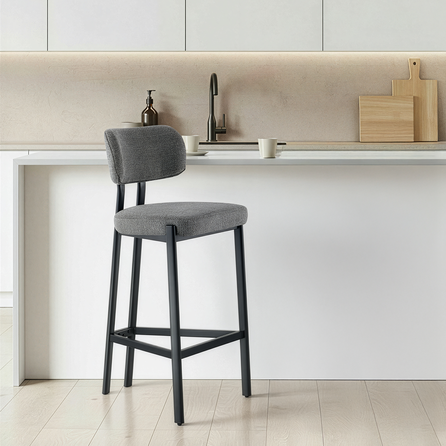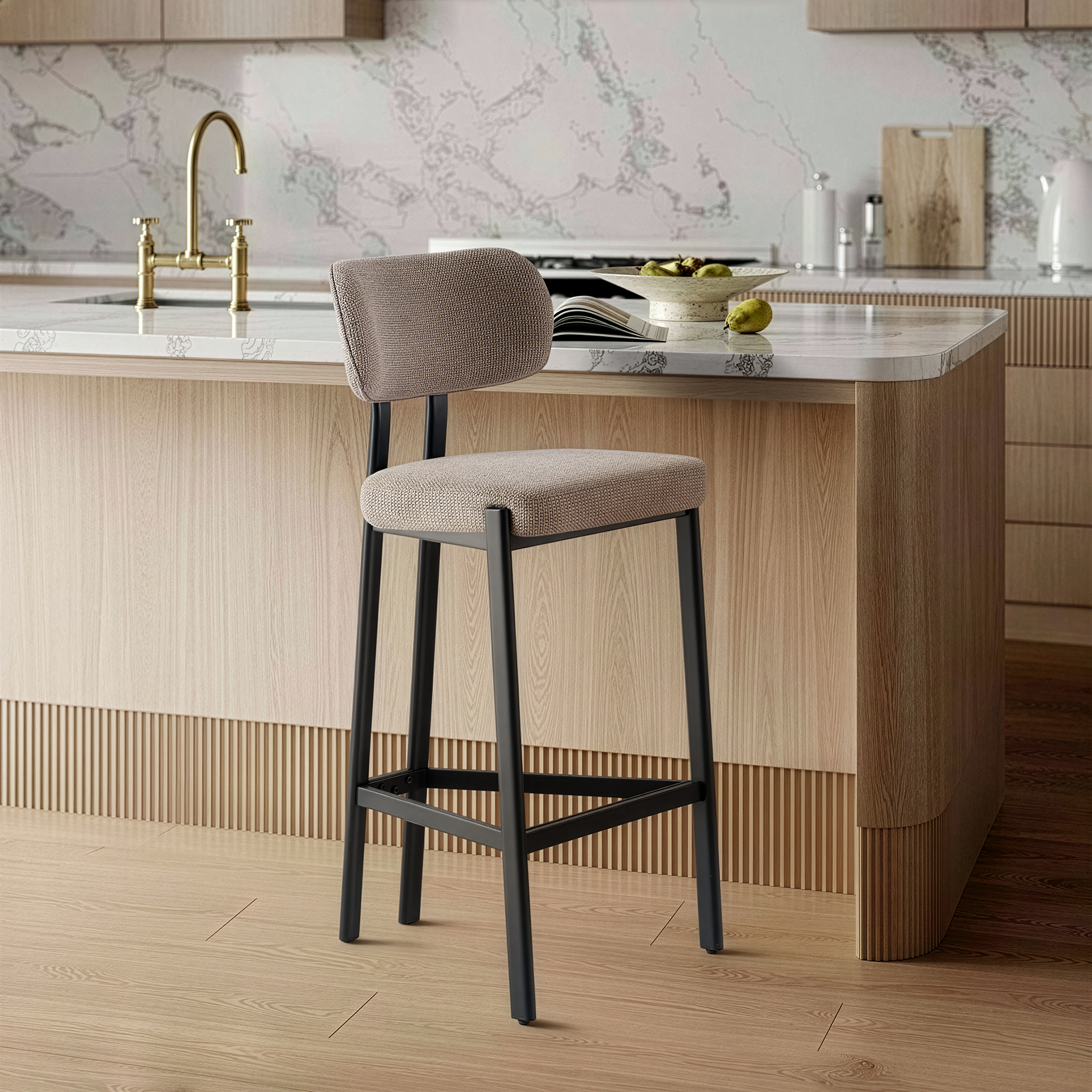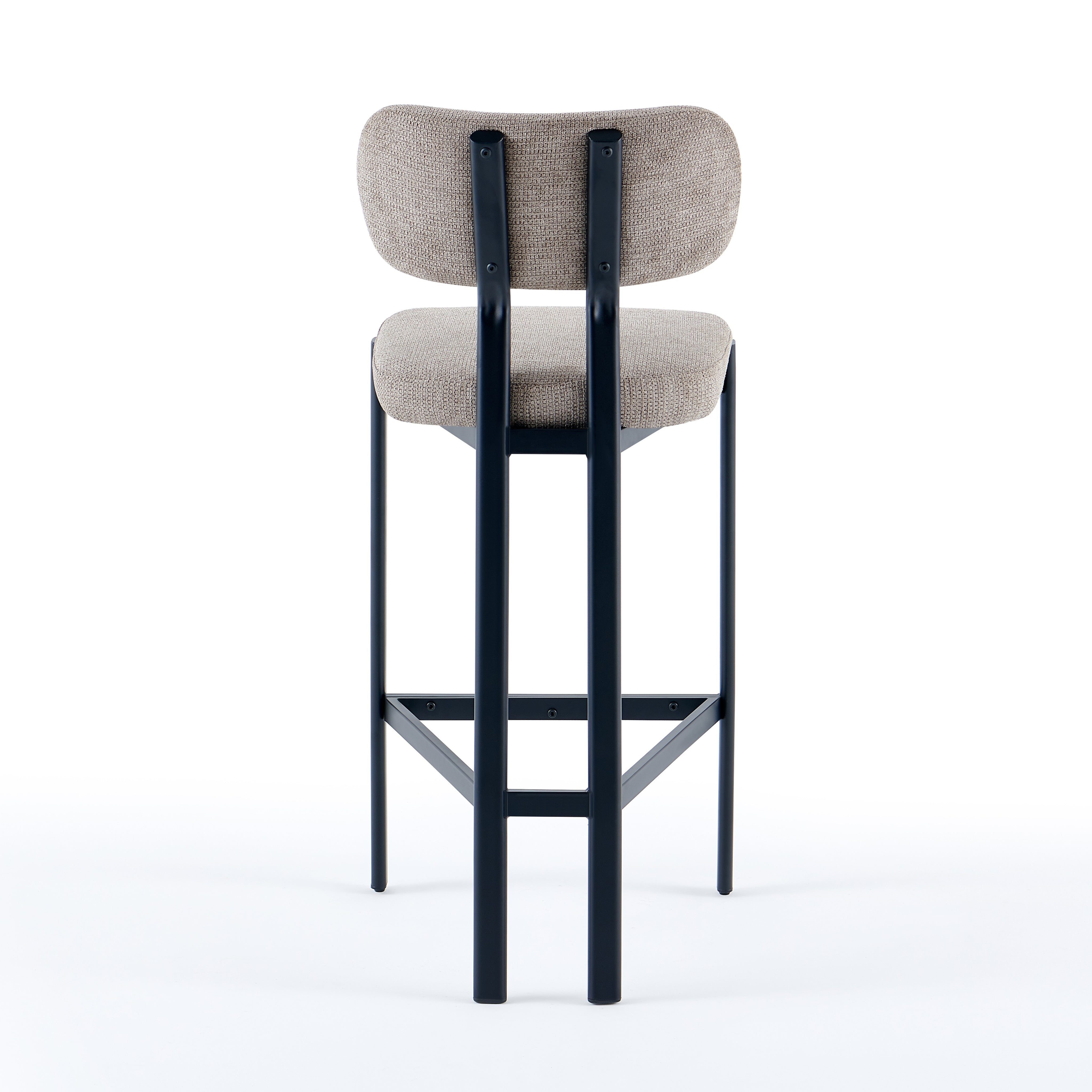 Krzesło Barowe Verity to kwintesencja nowoczesnego stylu, która idealnie dopełni aranżację domowej wyspy kuchennej lub strefy barowej. Tapicerowany przyjemną w dotyku tkaniną w odcieniu ciemnego beżu, wprowadza do wnętrza jasność i subtelną elegancję, harmonijnie współgrając z różnorodnymi paletami barw.