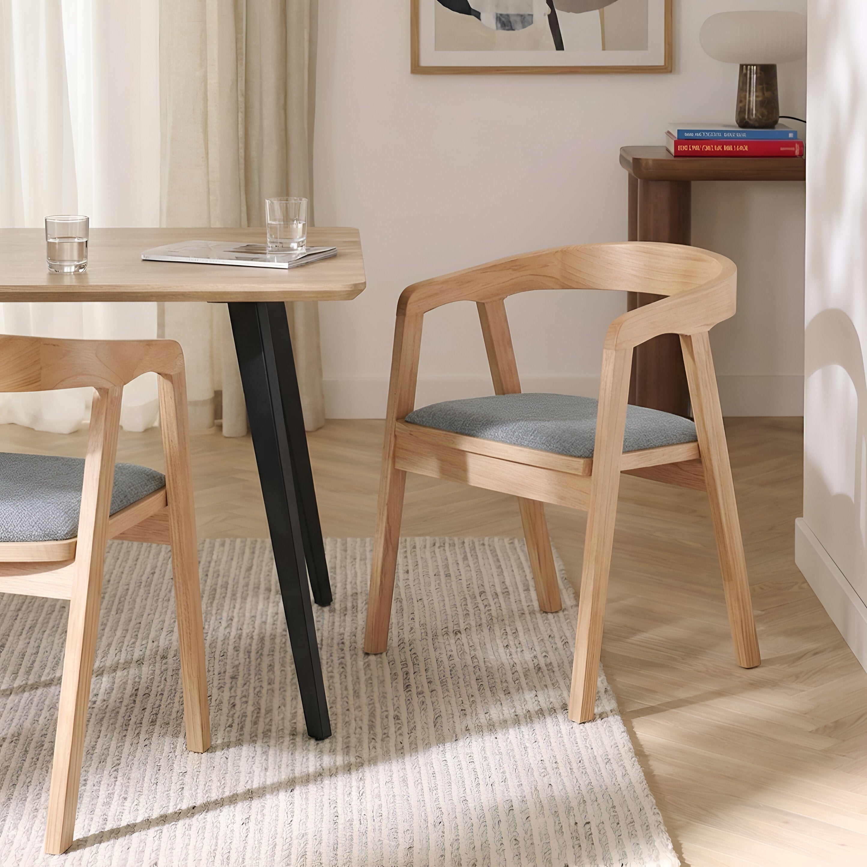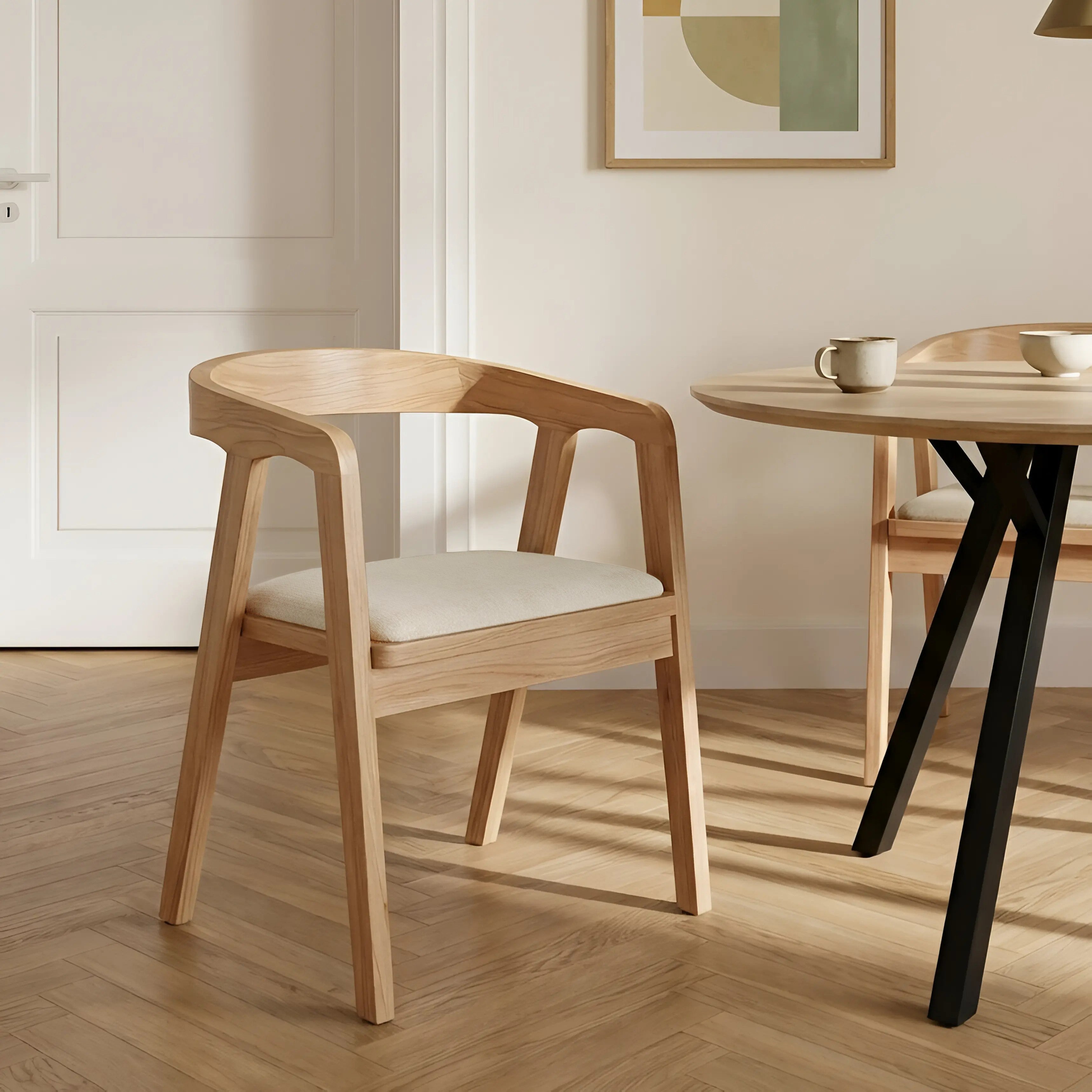 Siedzisko zostało tapicerowane jasnobeżową tkaniną o gładkiej, przyjemnej w dotyku strukturze, która zapewnia komfort podczas codziennego użytkowania. Delikatnie zaokrąglone oparcie połączone z podłokietnikami tworzy stabilne podparcie dla pleców i ramion, zwiększając wygodę siedzenia przy stole.