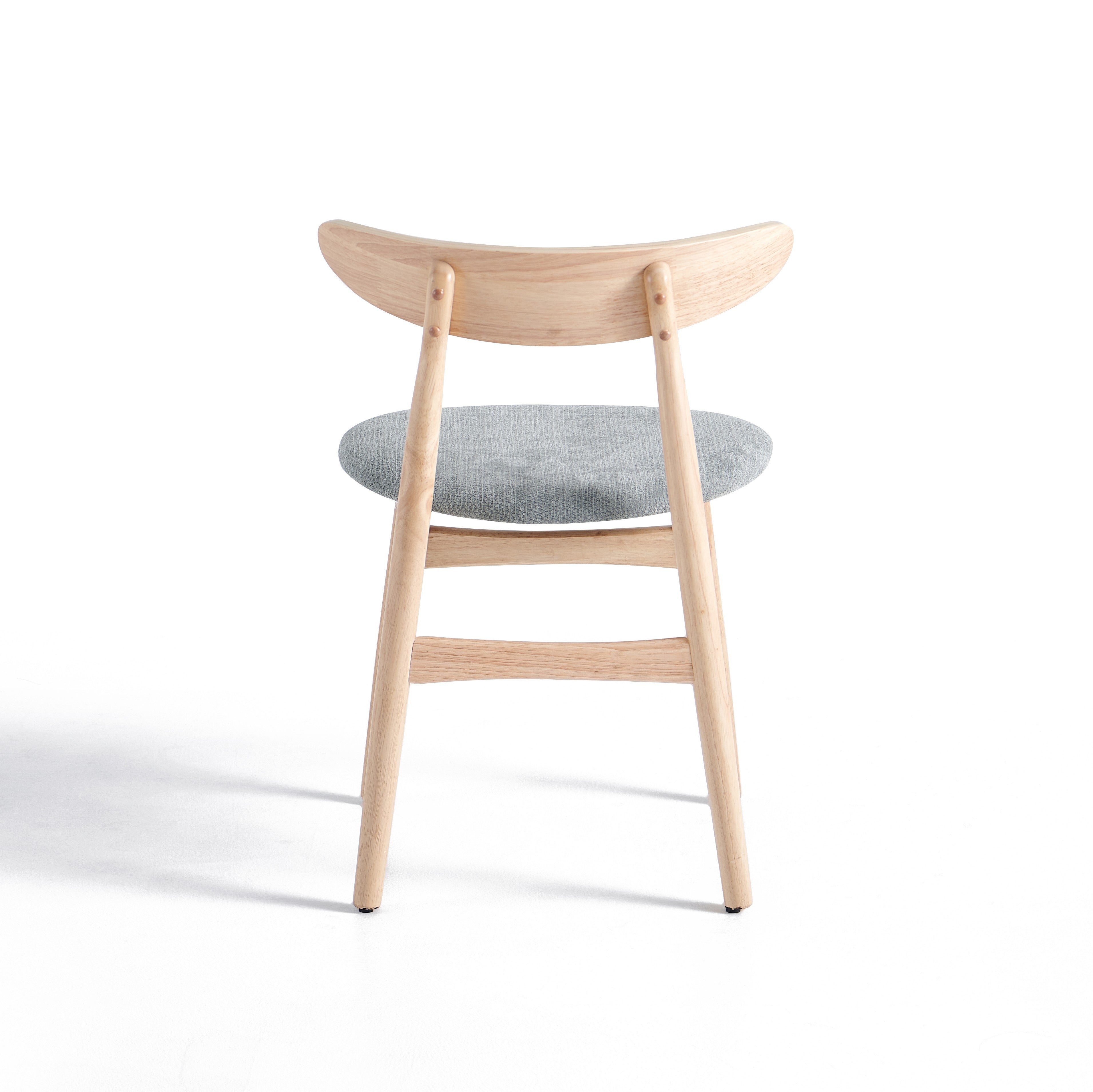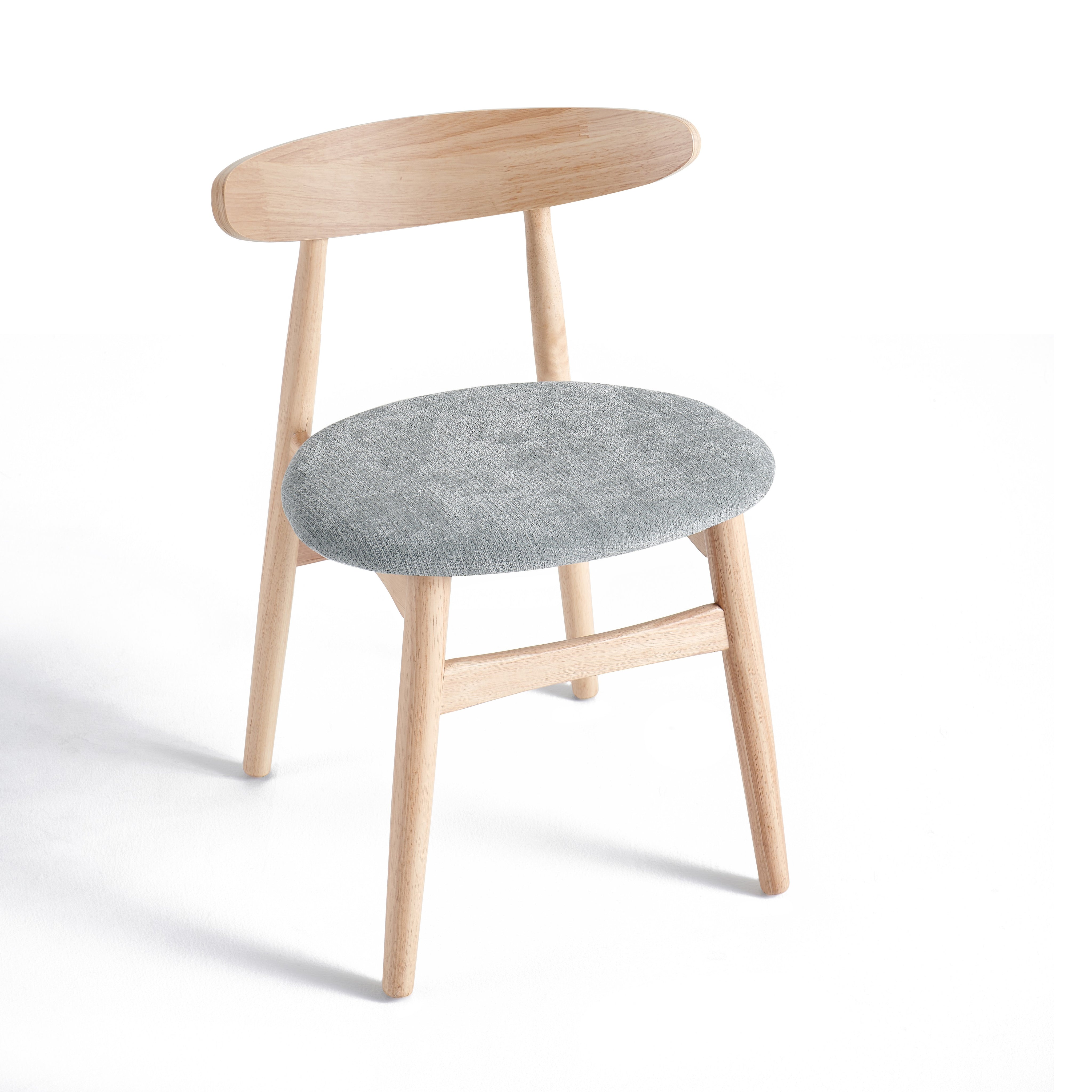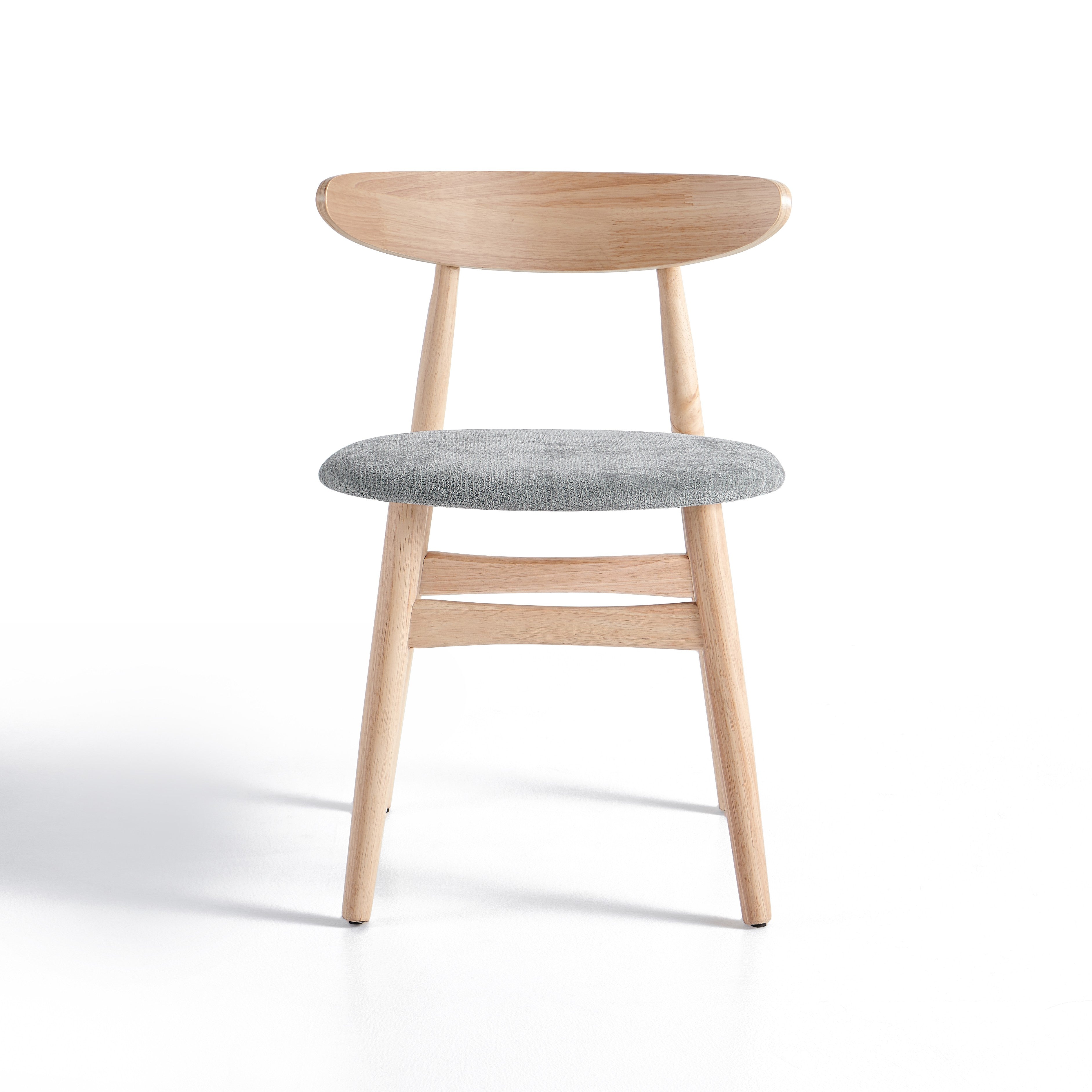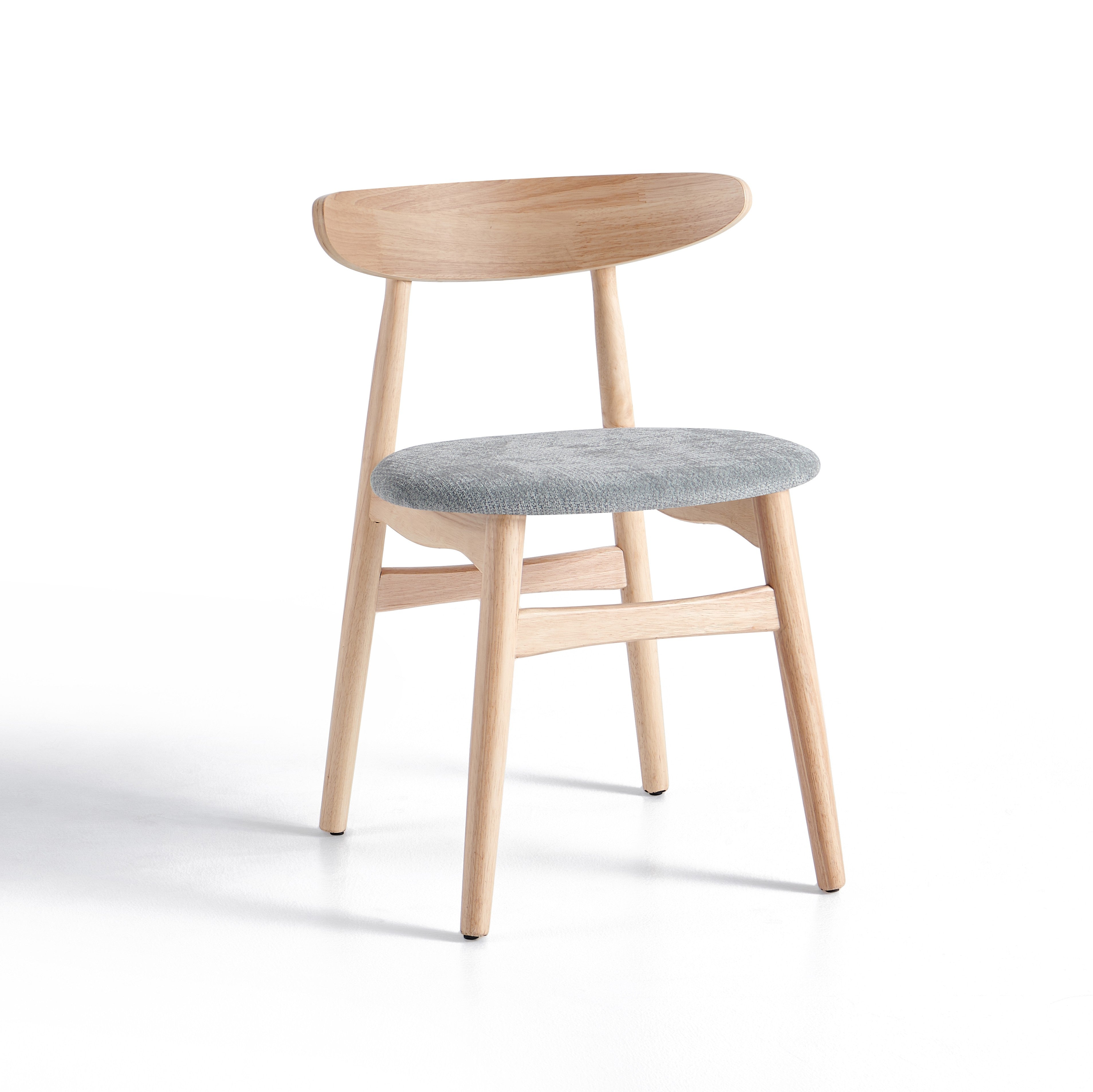 Model ten nie posiada tapicerowanego oparcia – zastosowano profilowane oparcie z litego drewna, ukształtowane w sposób ergonomiczny, aby naturalnie dopasowywało się do pleców i zapewniało wygodne podparcie podczas siedzenia. Tapicerowane siedzisko w szarej tkaninie zwiększa komfort użytkowania i jest praktyczne w codziennym użytkowaniu.