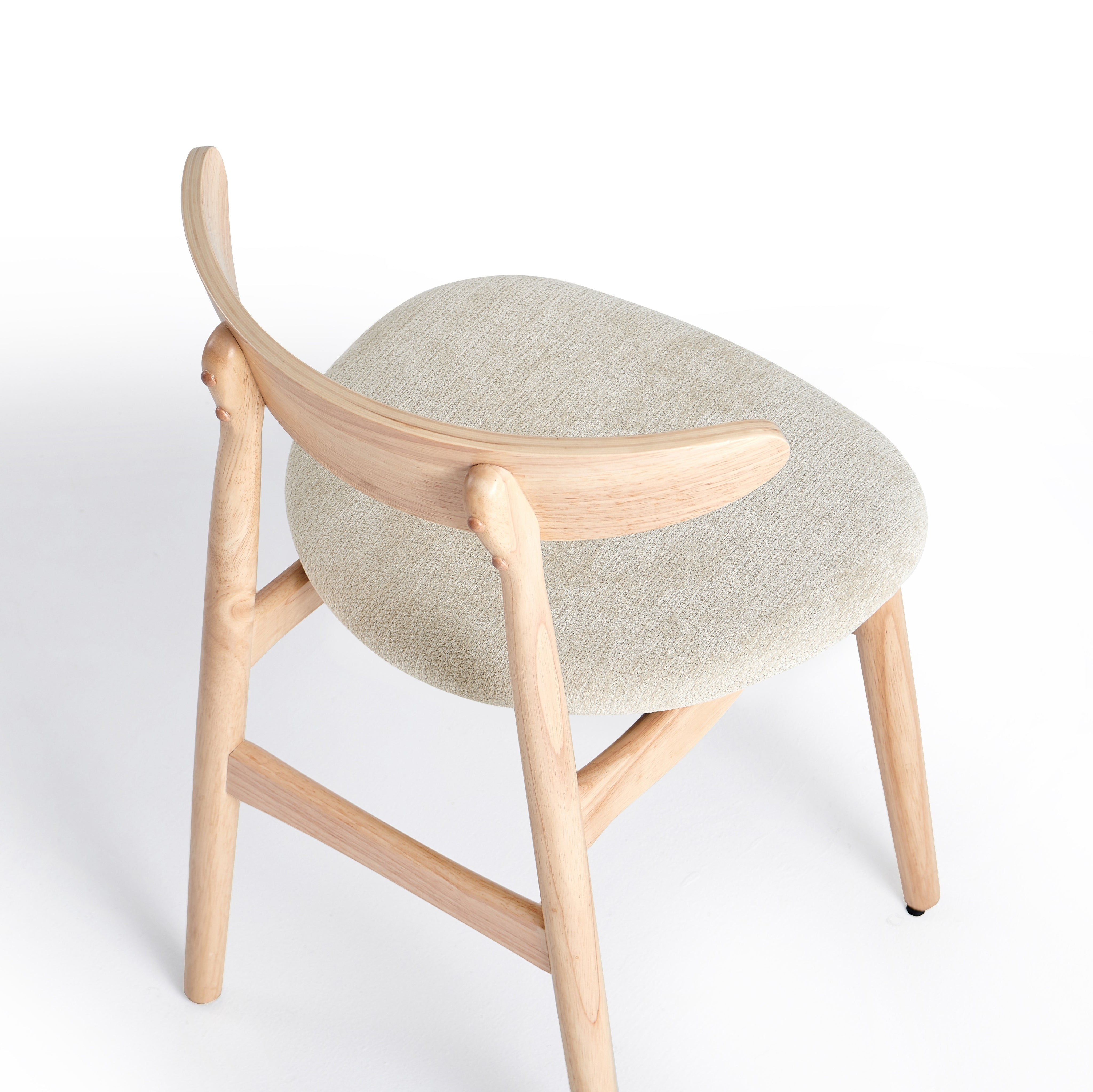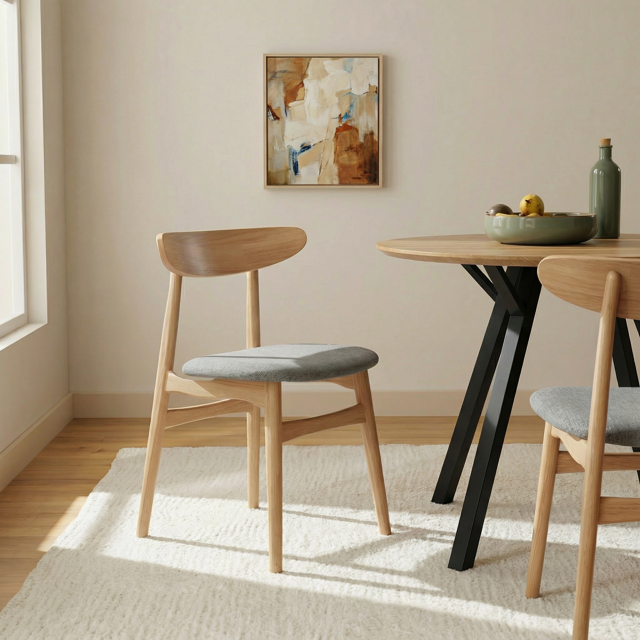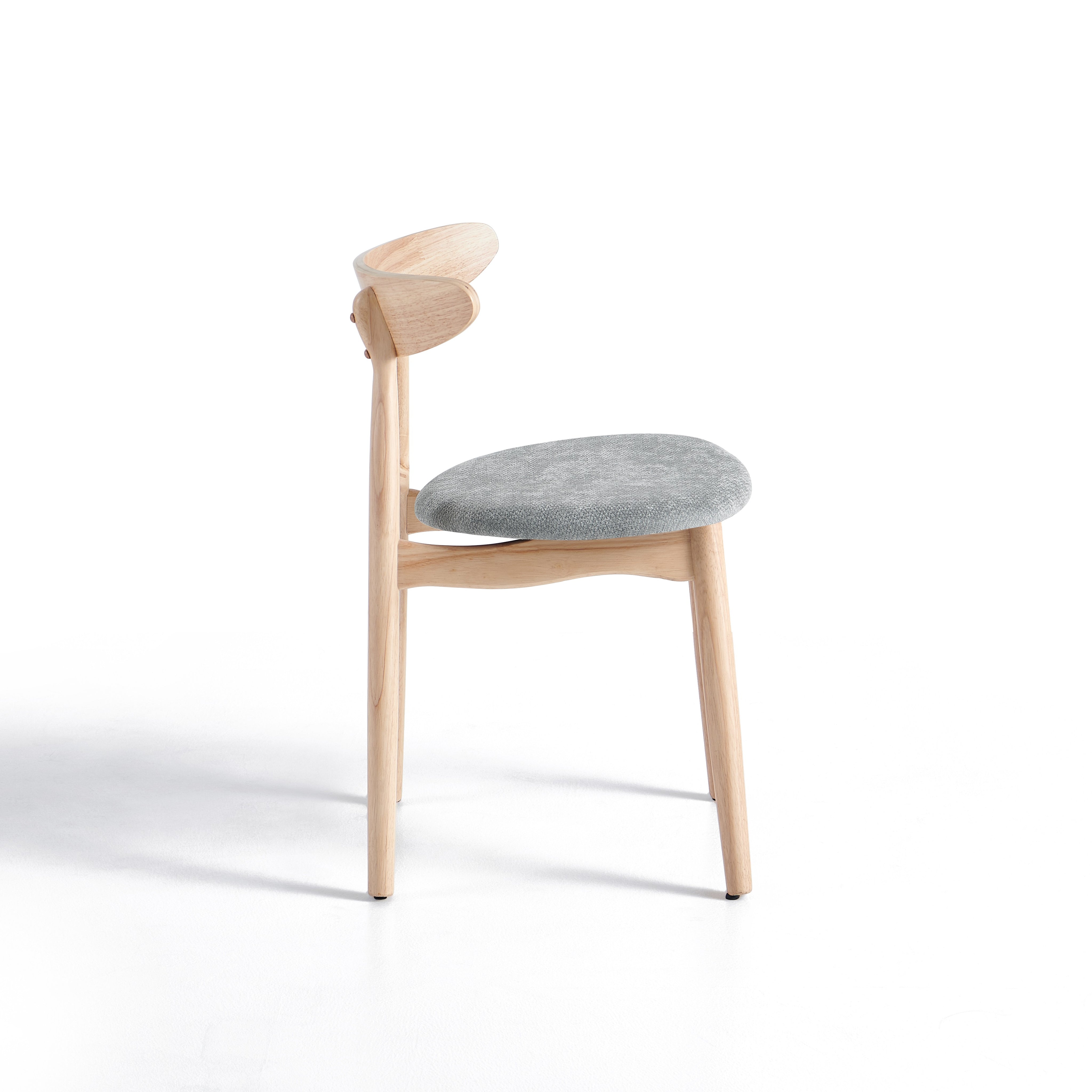 Model ten nie posiada tapicerowanego oparcia – zastosowano profilowane oparcie z litego drewna, ukształtowane w sposób ergonomiczny, aby naturalnie dopasowywało się do pleców i zapewniało wygodne podparcie podczas siedzenia. Tapicerowane siedzisko w szarej tkaninie zwiększa komfort użytkowania i jest praktyczne w codziennym użytkowaniu.