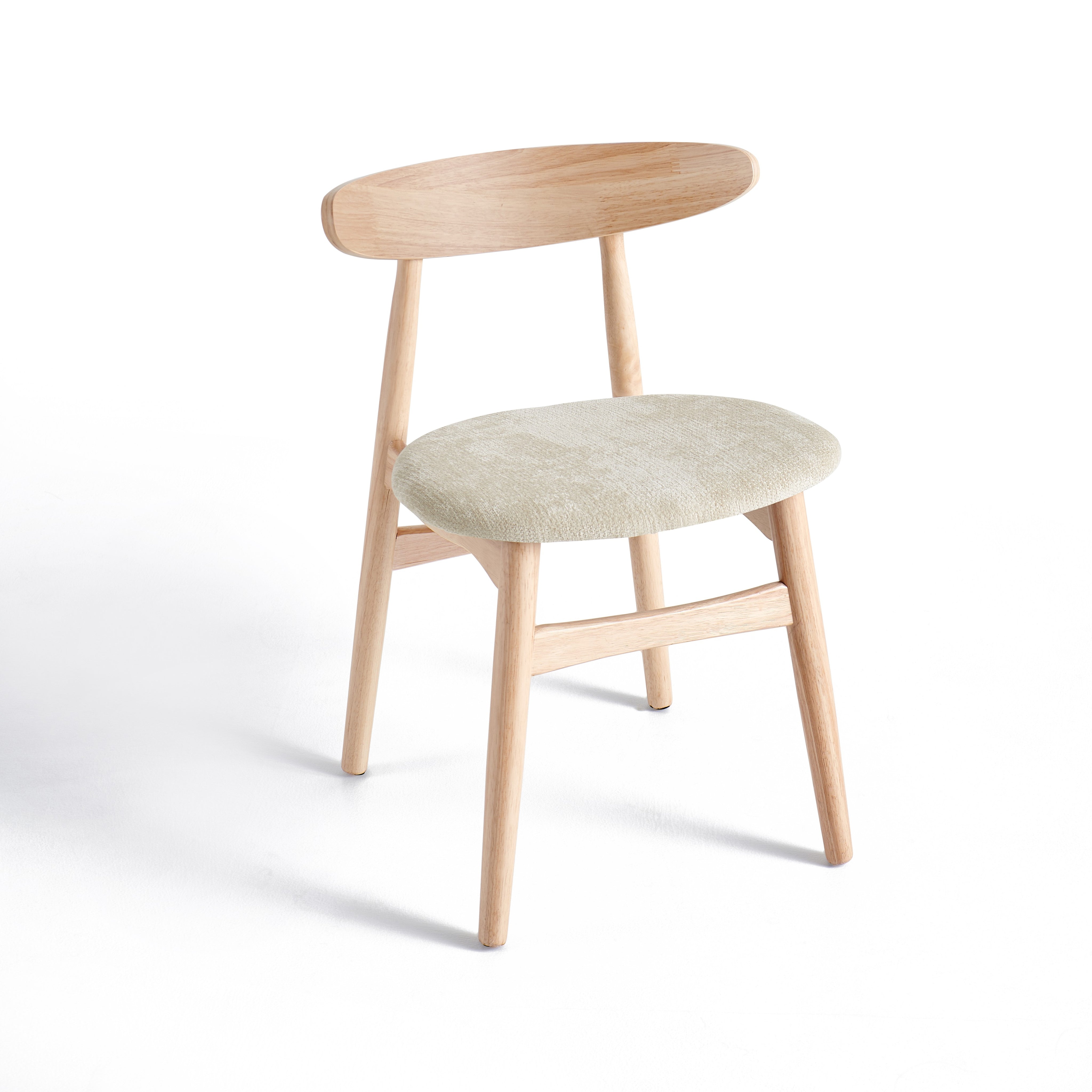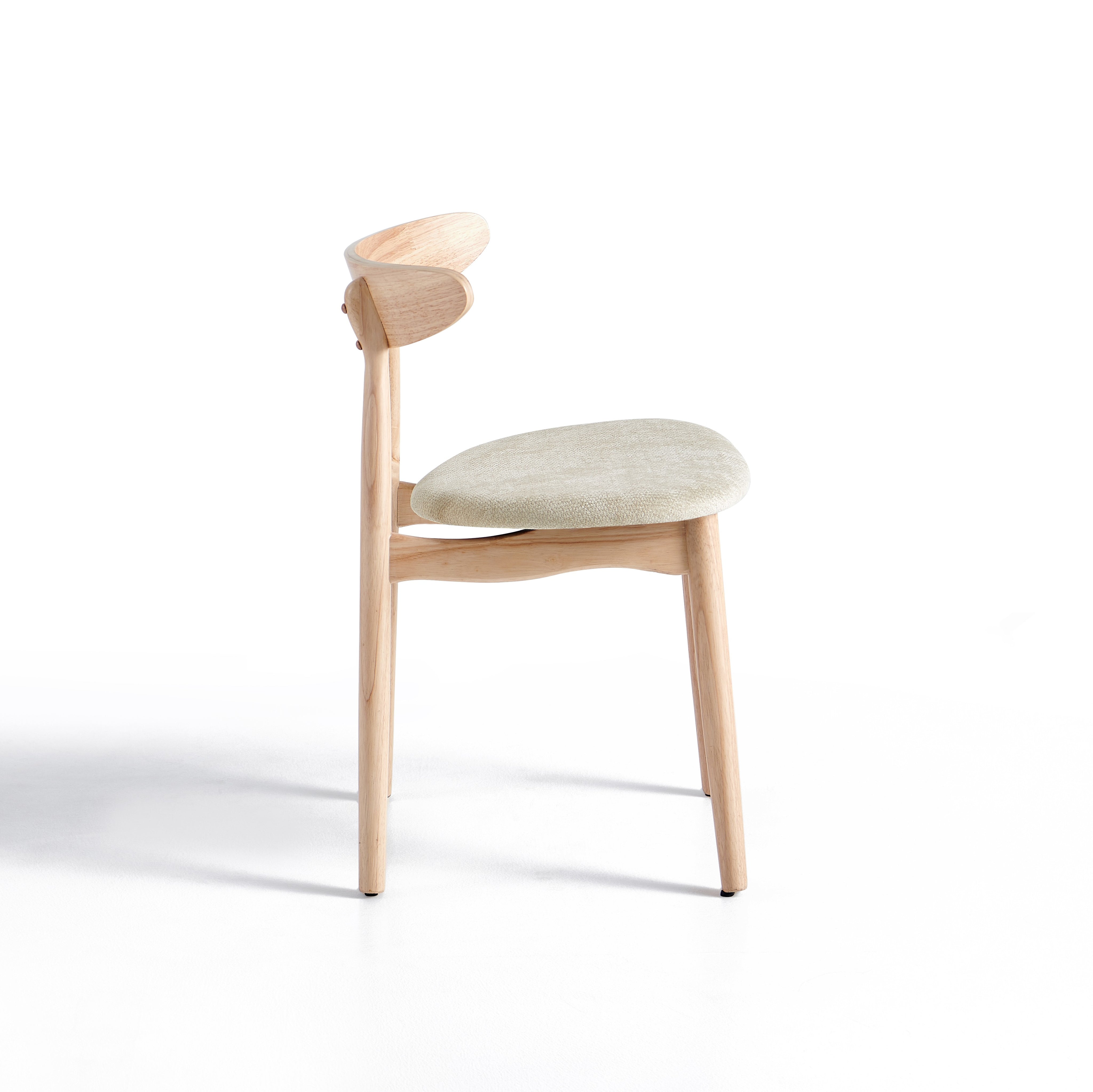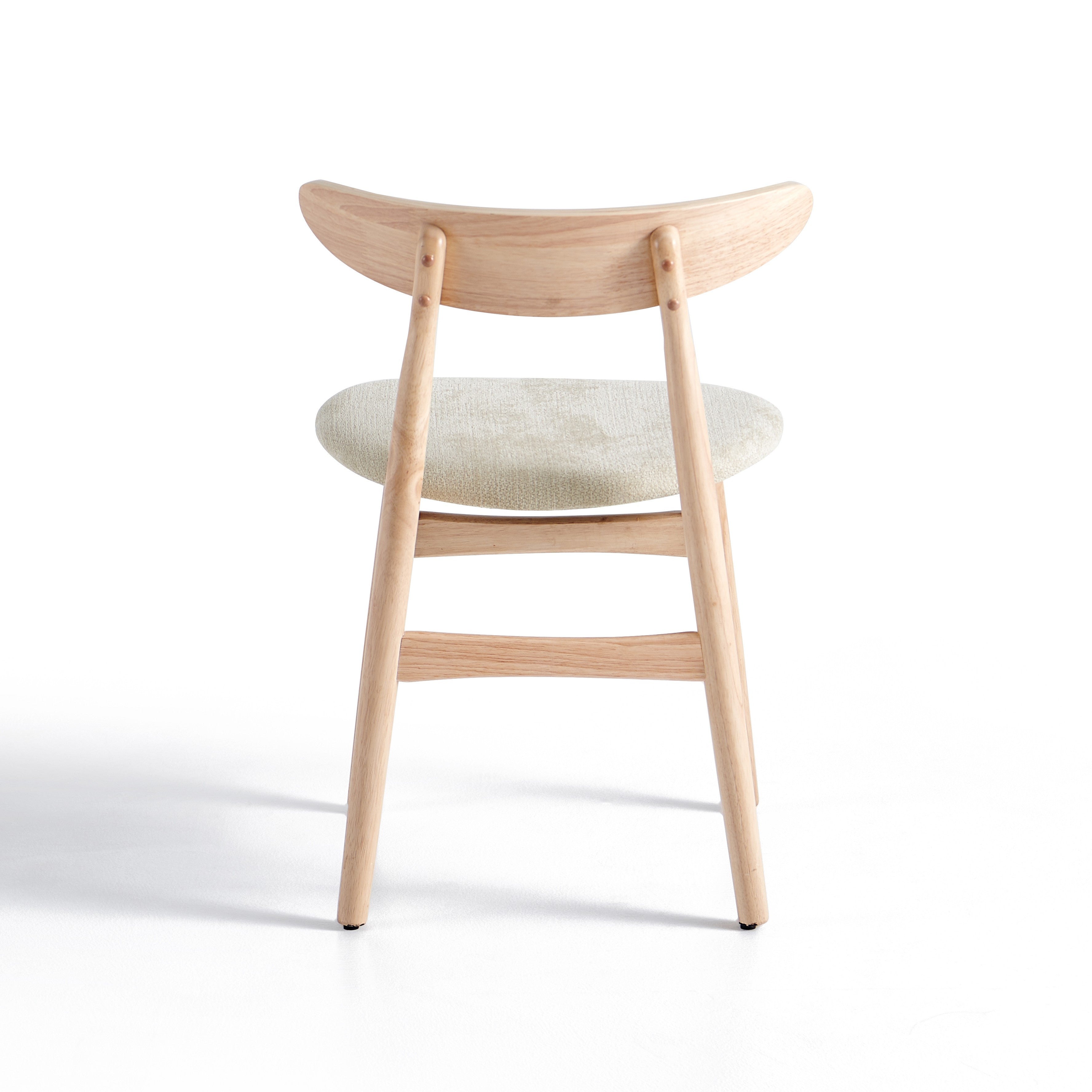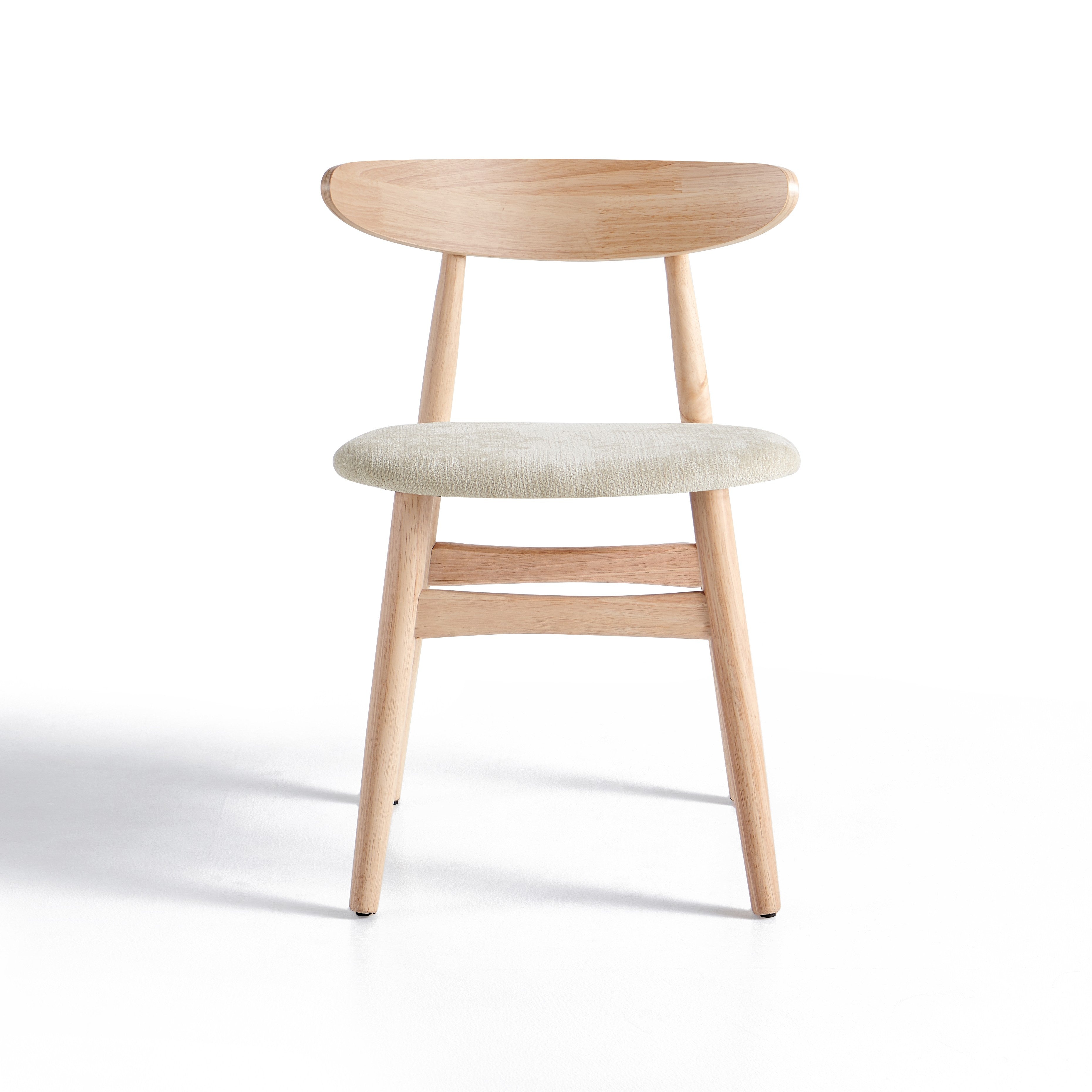 Model ten nie posiada tapicerowanego oparcia – zastosowano profilowane oparcie z litego drewna, ukształtowane w sposób ergonomiczny, aby naturalnie dopasowywało się do pleców i zapewniało wygodne podparcie podczas siedzenia. Tapicerowane siedzisko w szarej tkaninie zwiększa komfort użytkowania i jest praktyczne w codziennym użytkowaniu.
