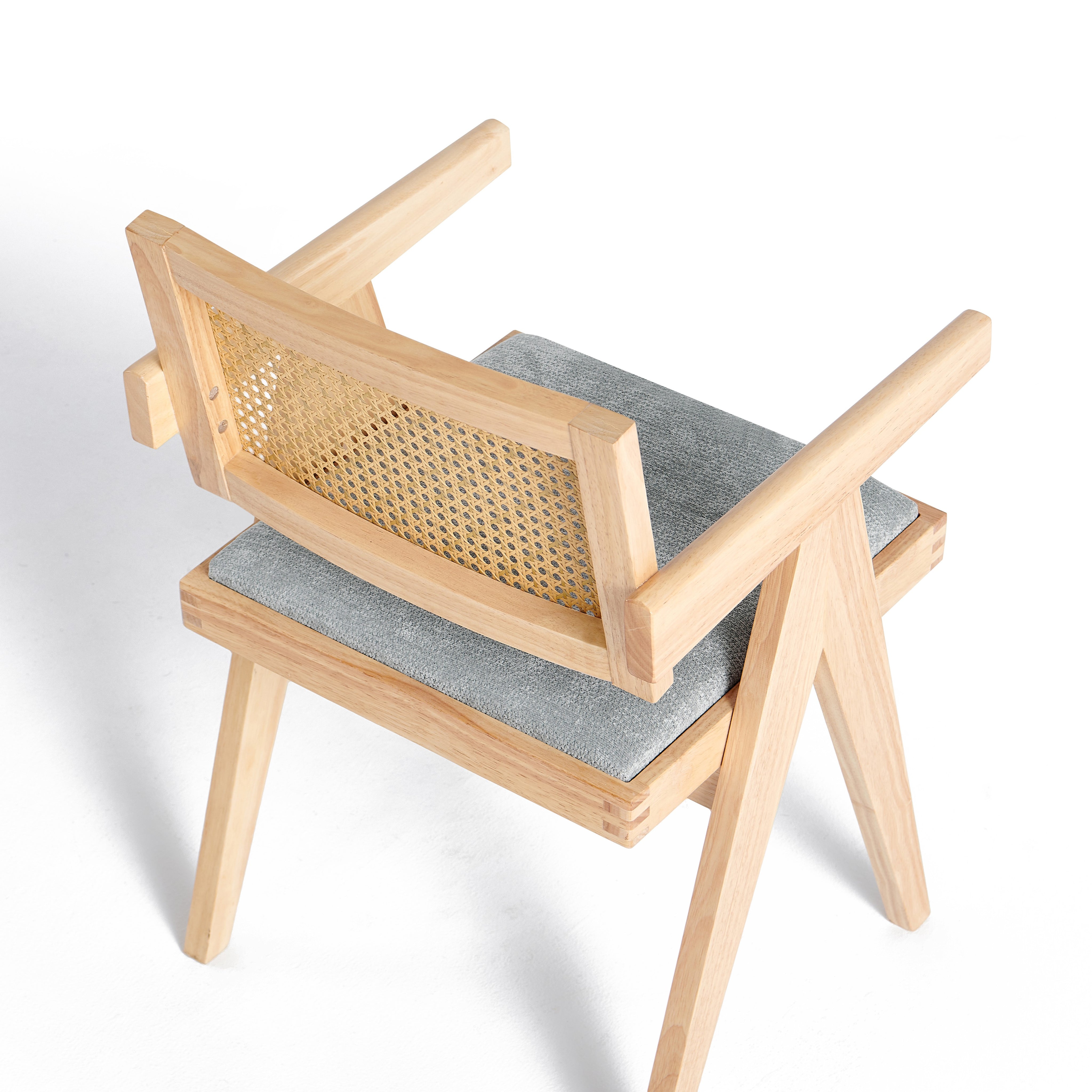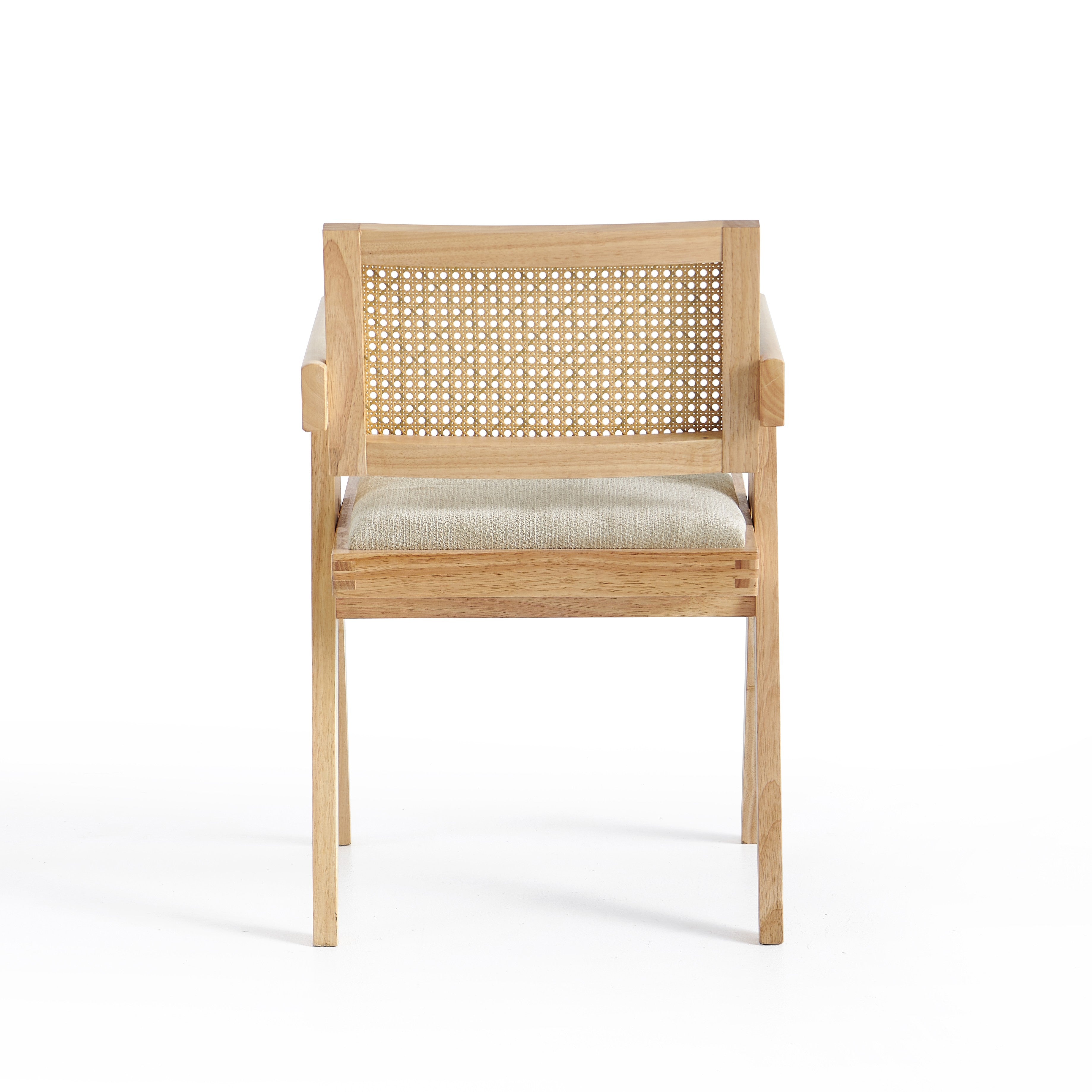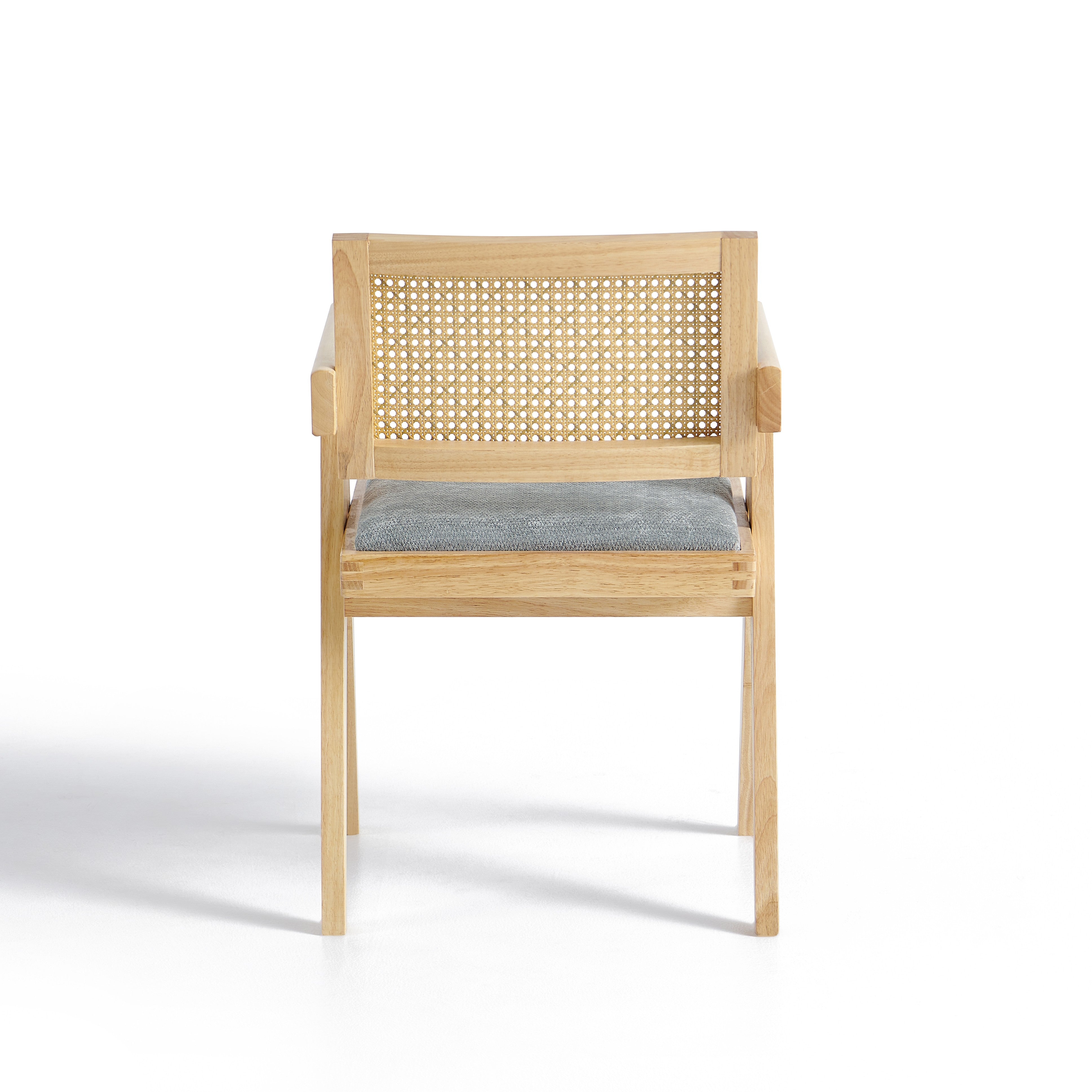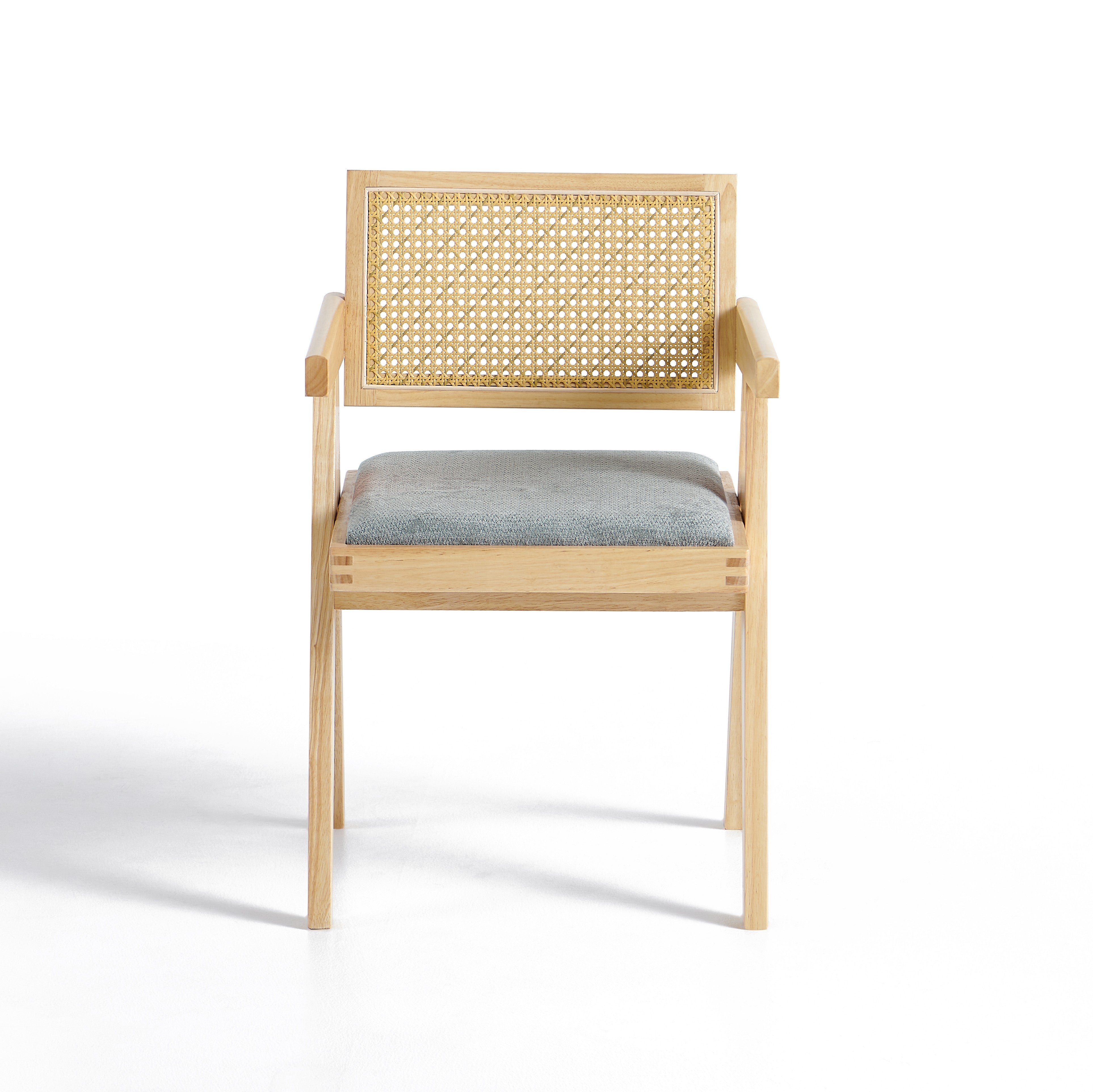 Model wyposażony jest w miękką, tapicerowaną poduszkę siedziska w kolorze szarym, która zapewnia komfort podczas codziennego użytkowania. Oparcie wykonane z naturalnej plecionki rattanowej zapewnia dobre podparcie pleców oraz poprawia wentylację, co zwiększa wygodę siedzenia.