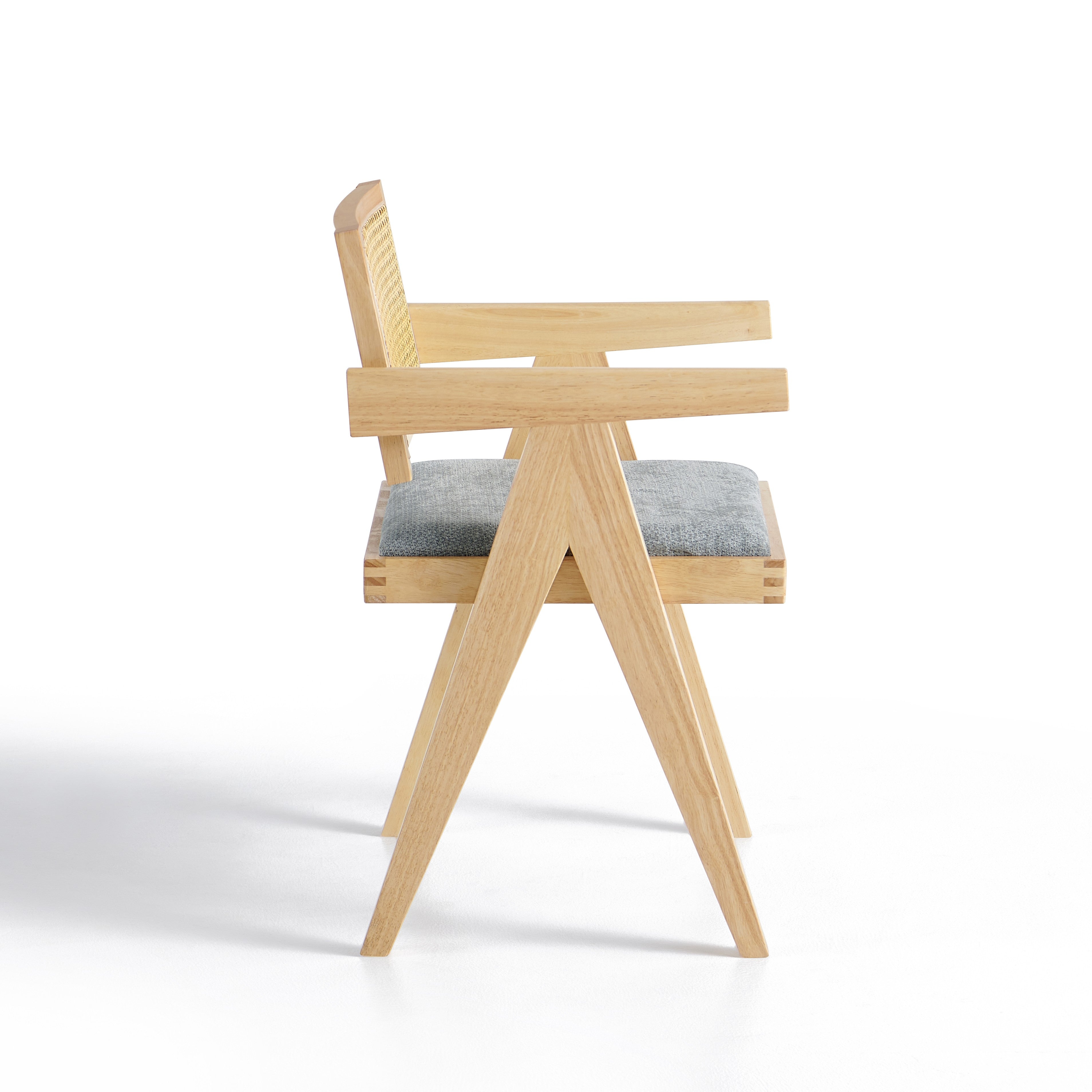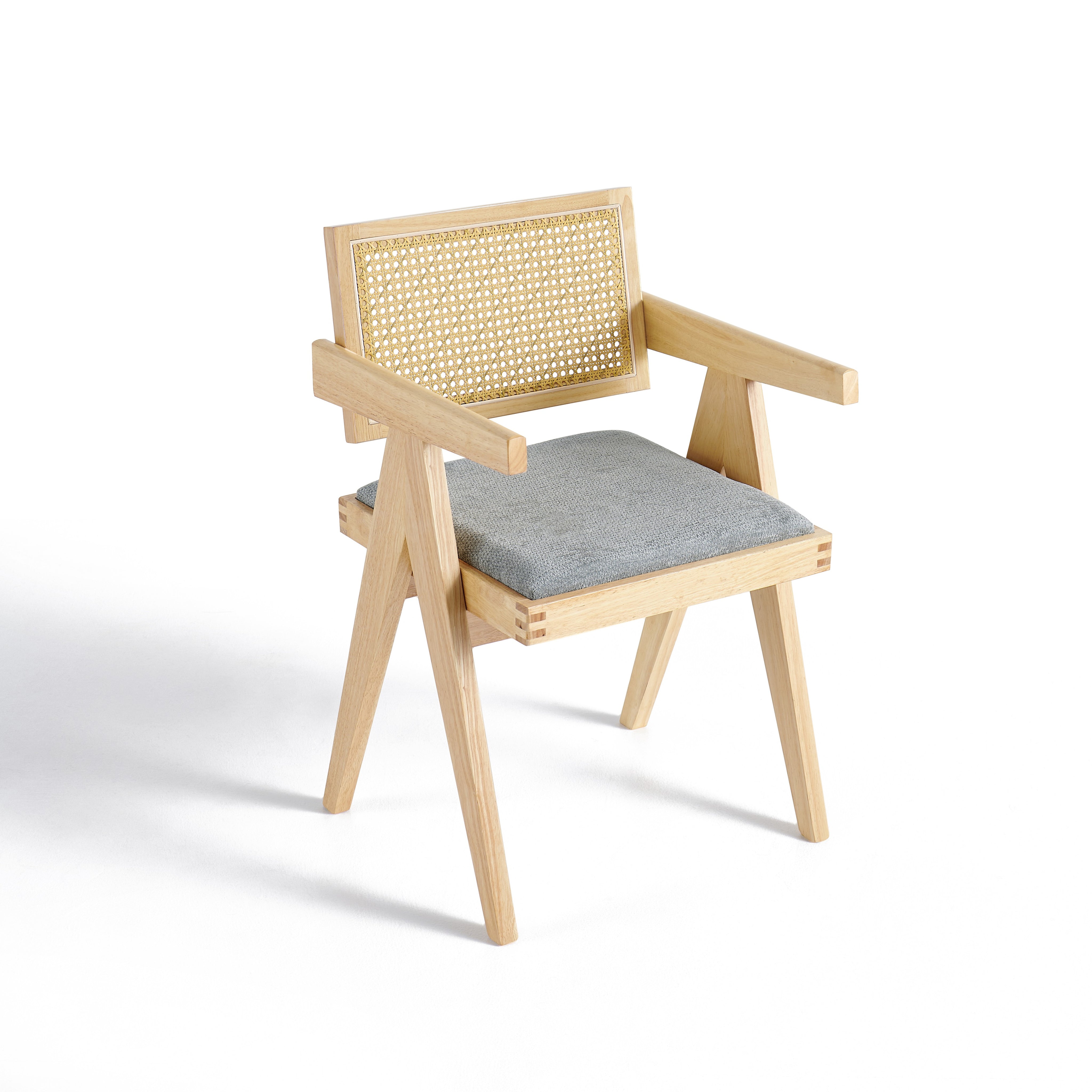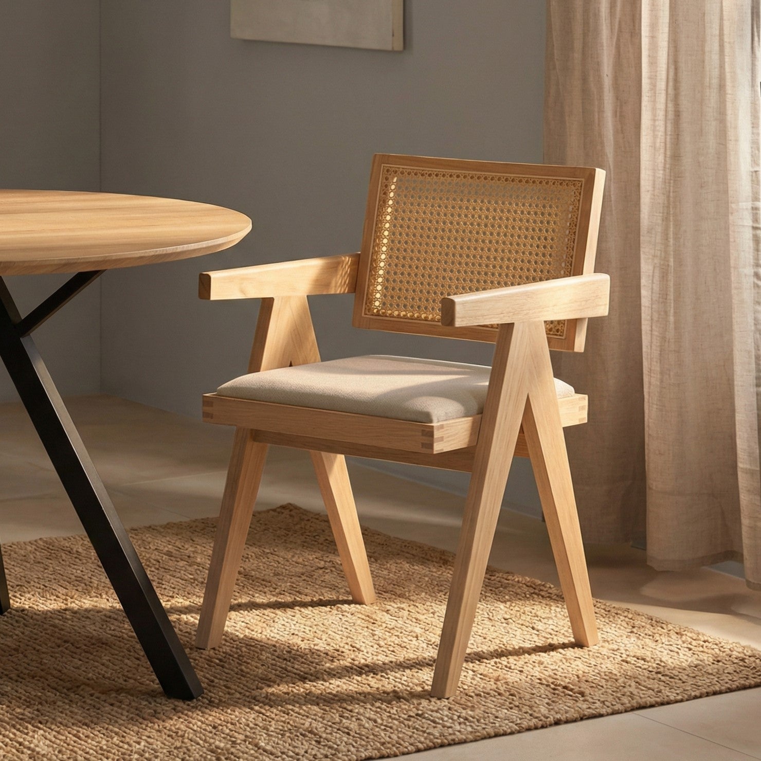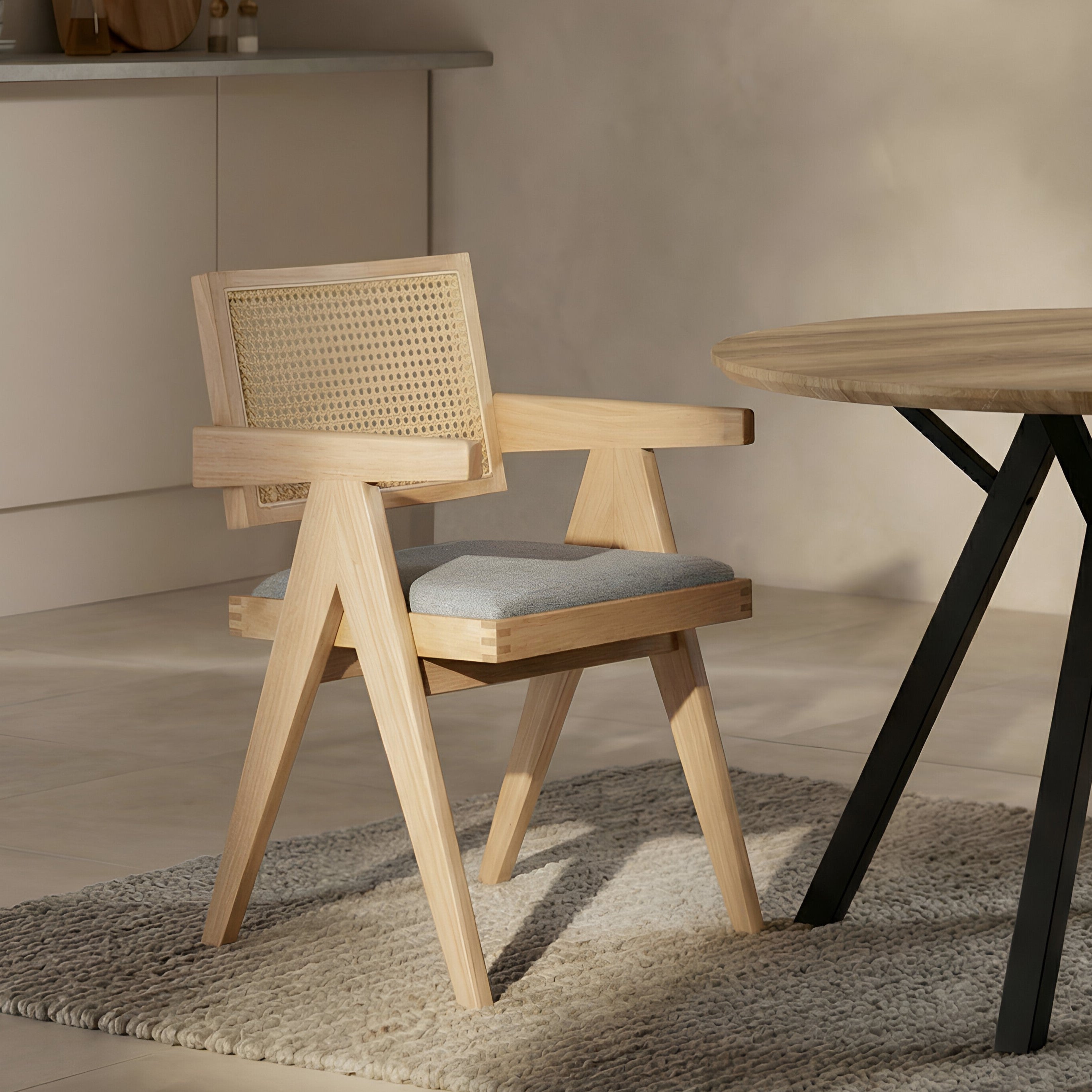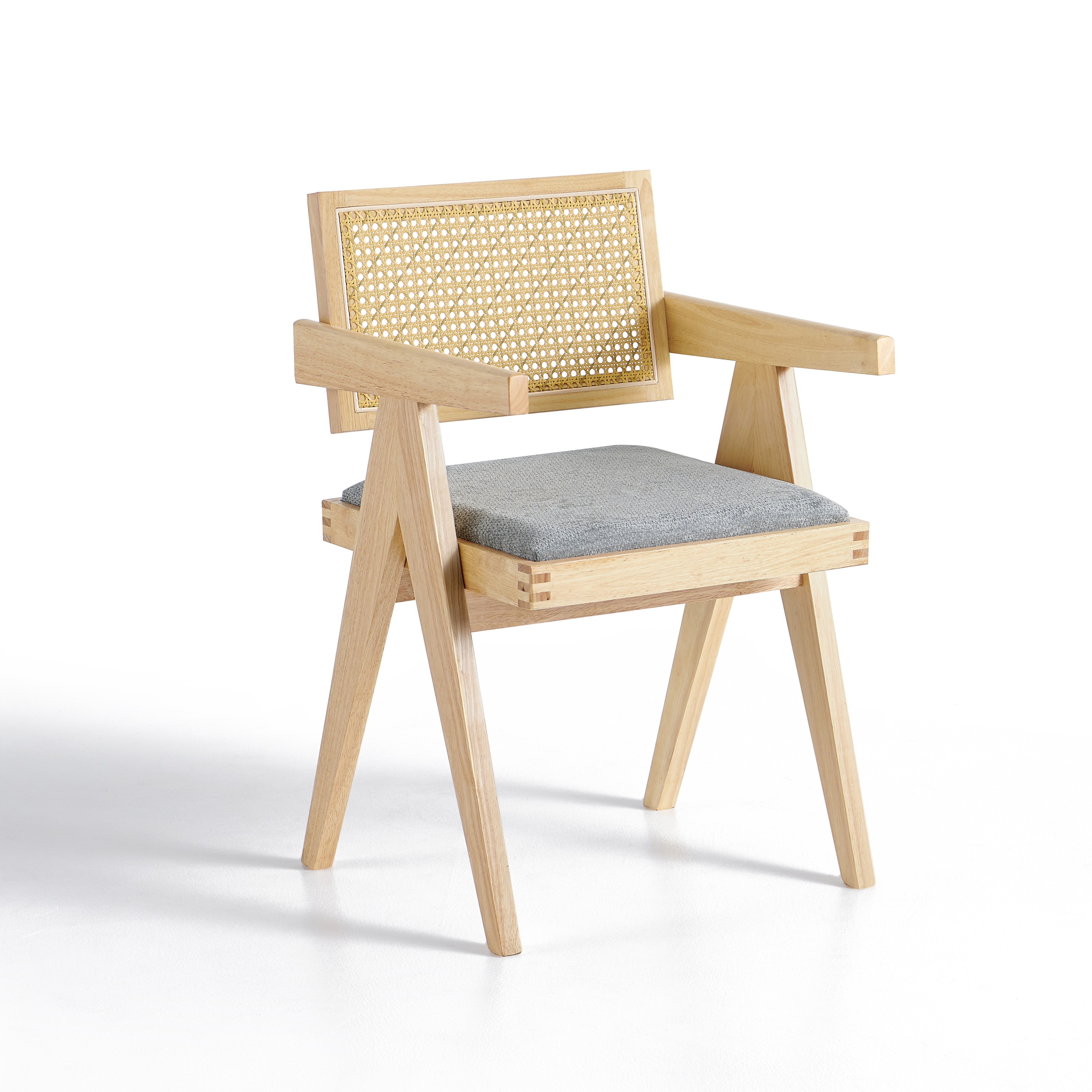 Model wyposażony jest w miękką, tapicerowaną poduszkę siedziska w kolorze szarym, która zapewnia komfort podczas codziennego użytkowania. Oparcie wykonane z naturalnej plecionki rattanowej zapewnia dobre podparcie pleców oraz poprawia wentylację, co zwiększa wygodę siedzenia.