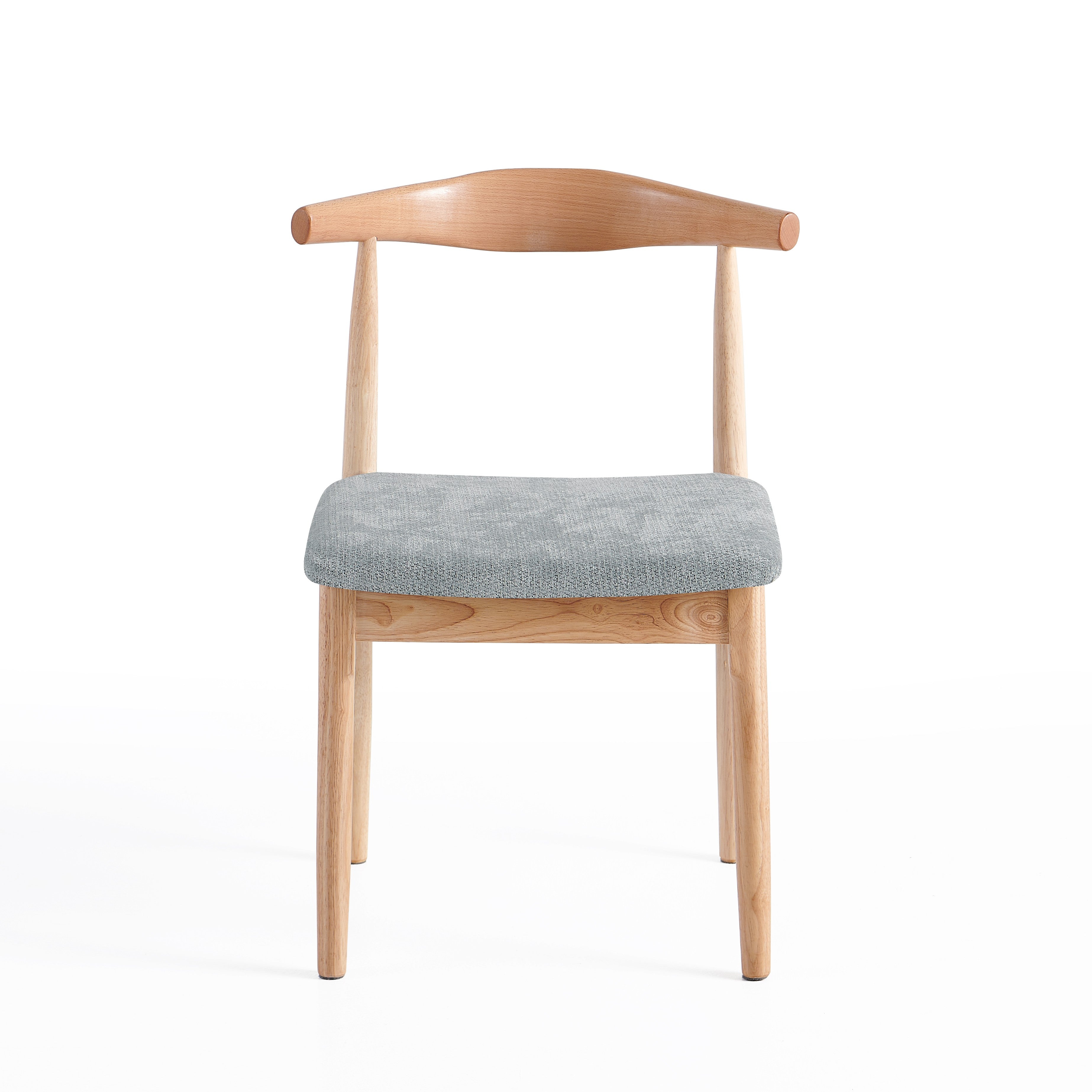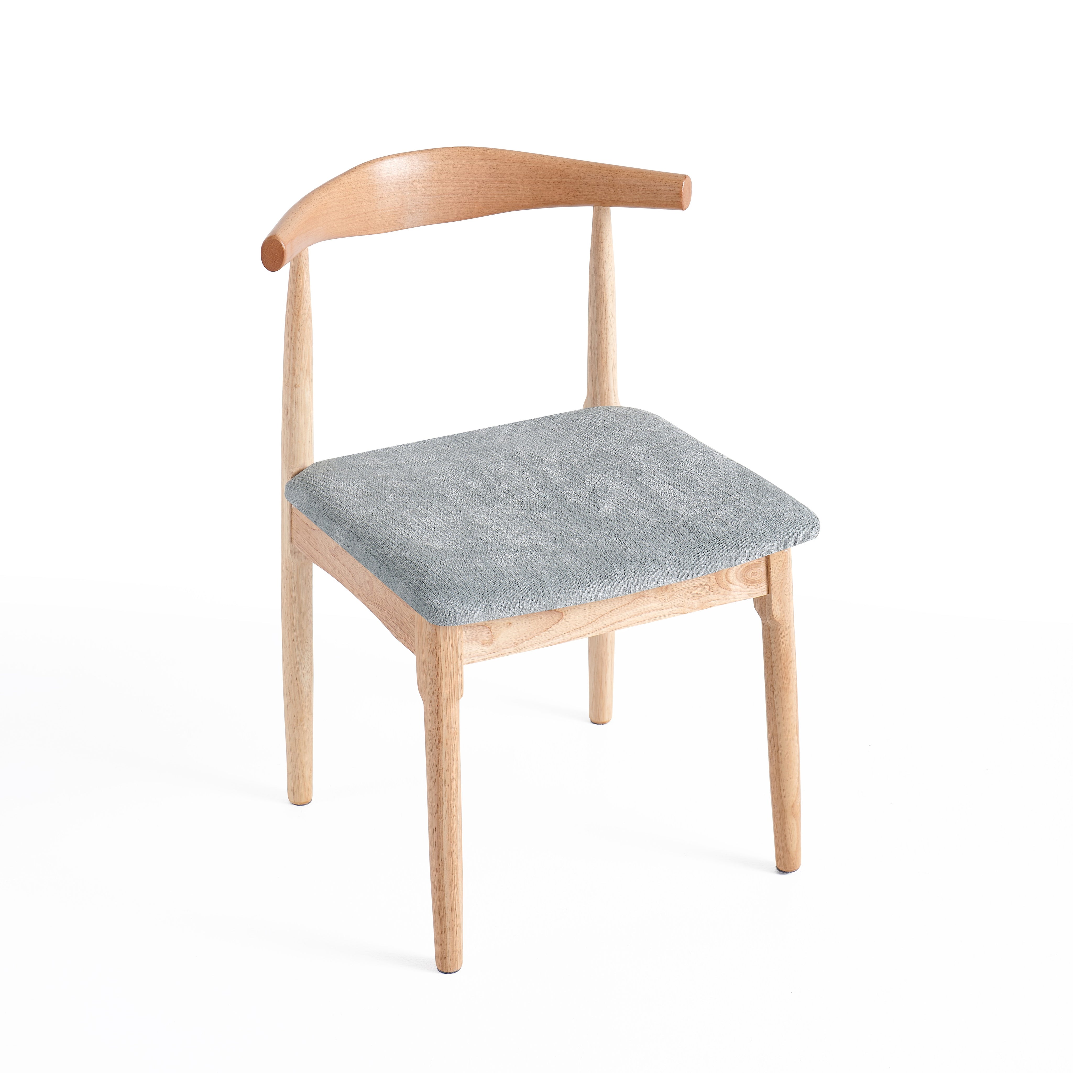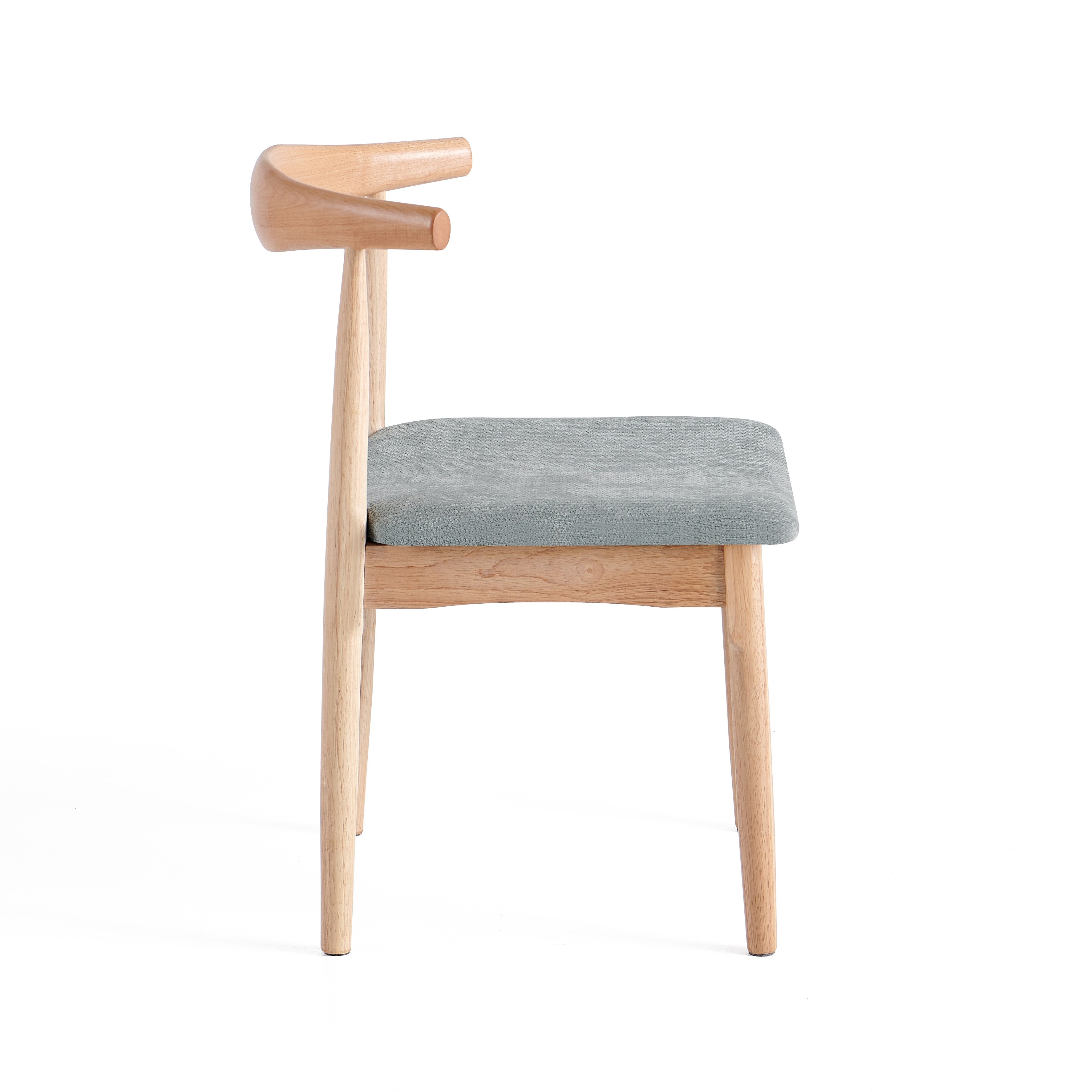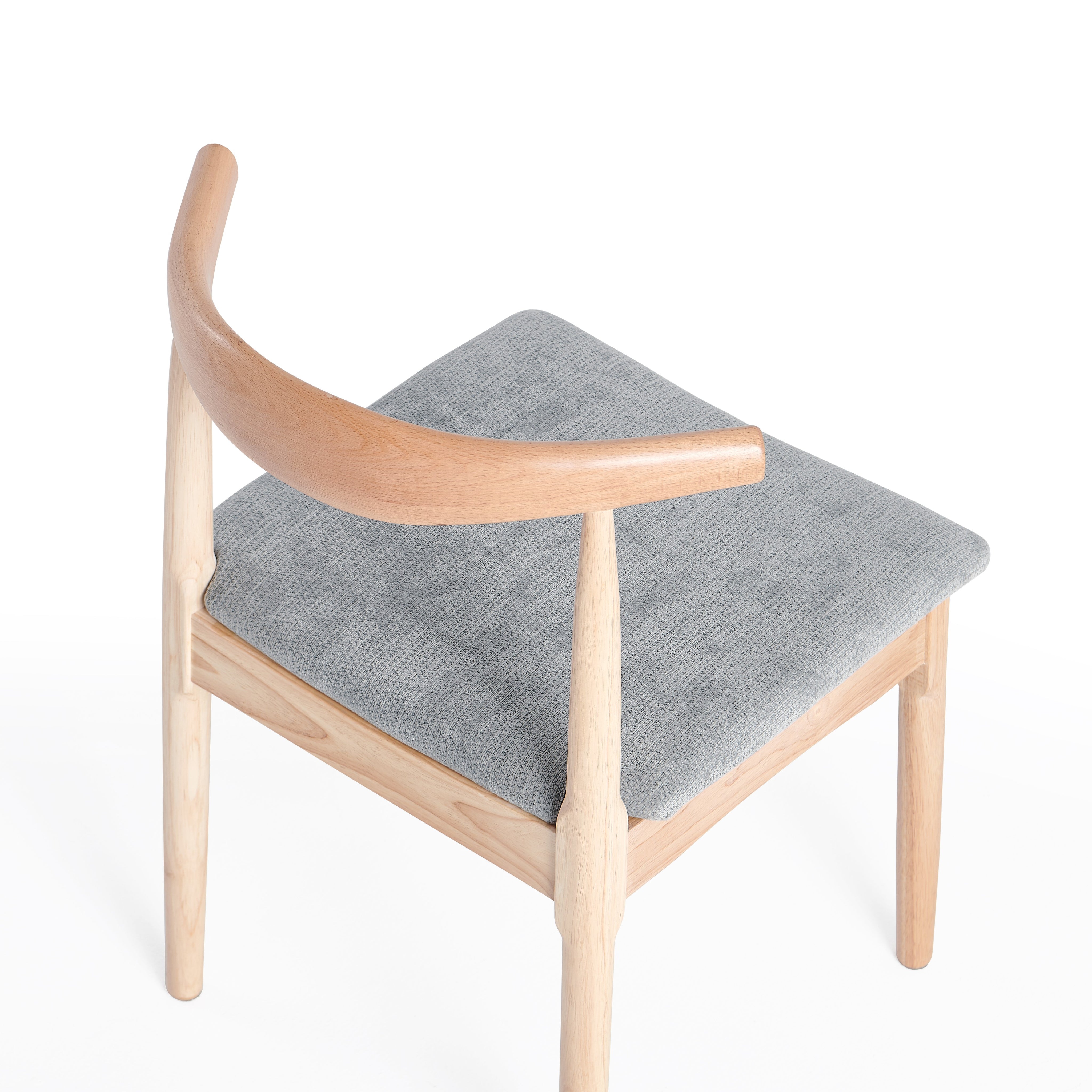 Siedzisko zostało tapicerowane miękką tkaniną w szarym kolorze, zapewniając wygodę podczas siedzenia przy stole. Delikatnie wyprofilowane oparcie stabilnie podpiera plecy i zwiększa komfort użytkowania.
