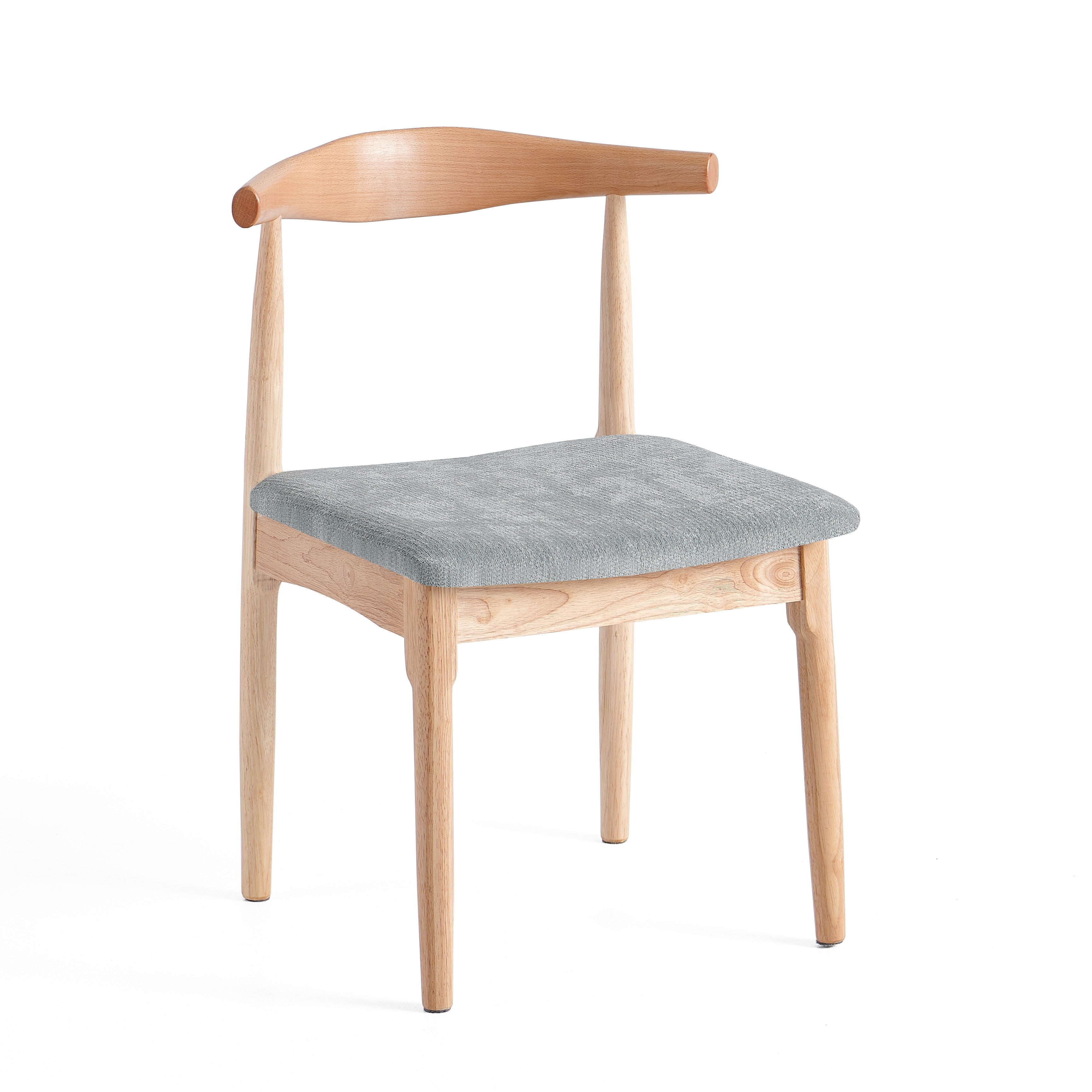 Krzesło do jadalni wykonane z naturalnego drewna w wybarwieniu na kolor dębu, z siedziskiem tapicerowanym miękką tkaniną w szarym odcieniu, HSC2516.