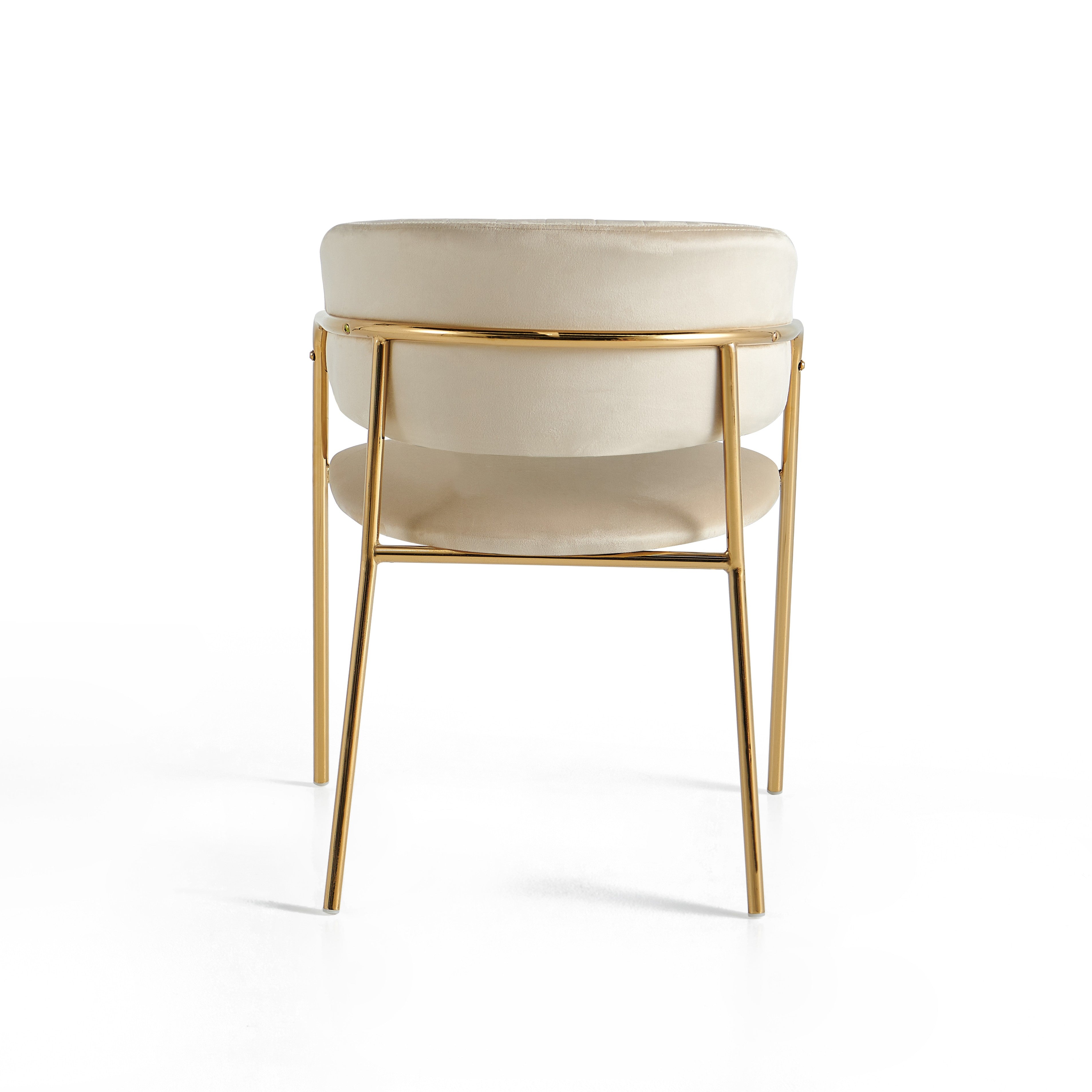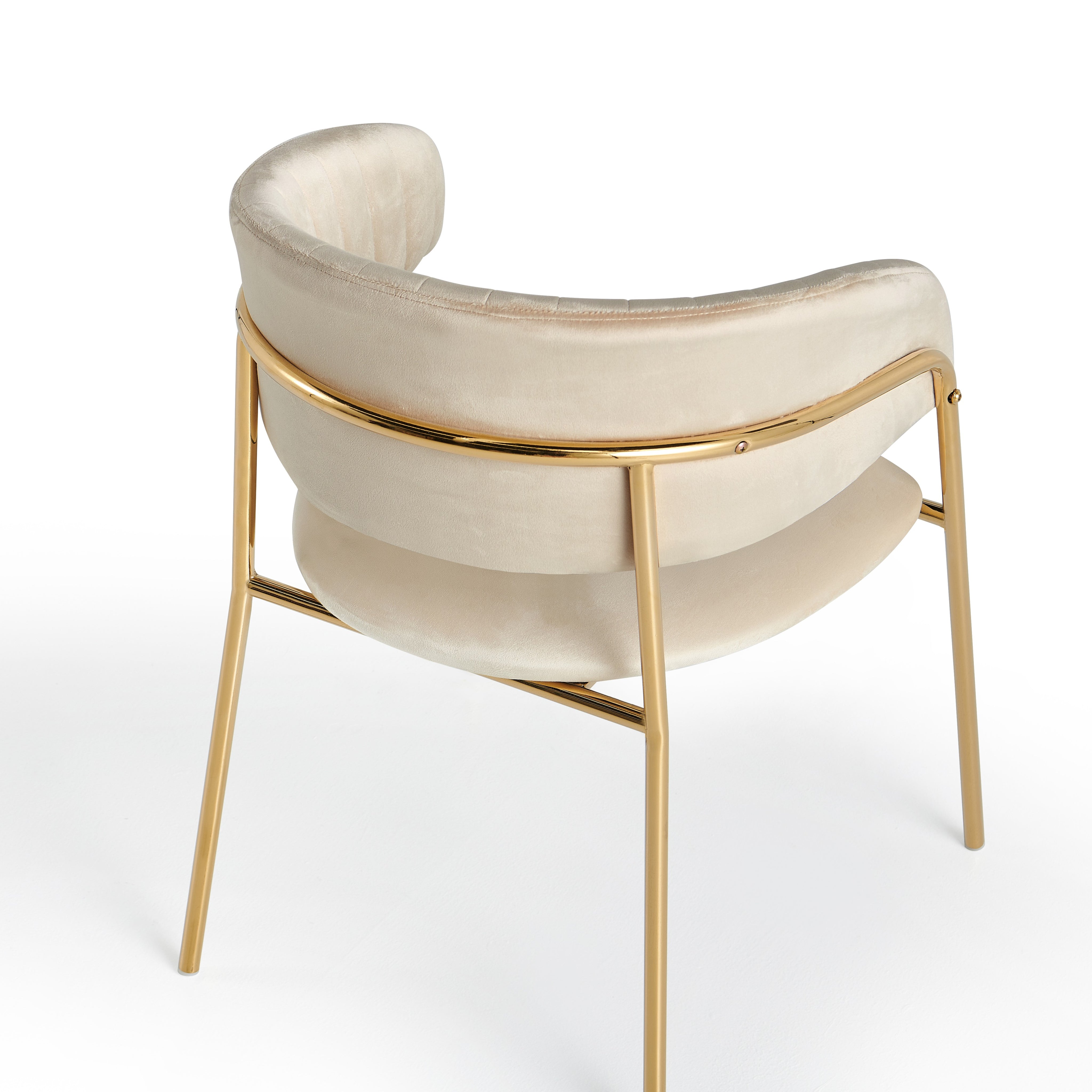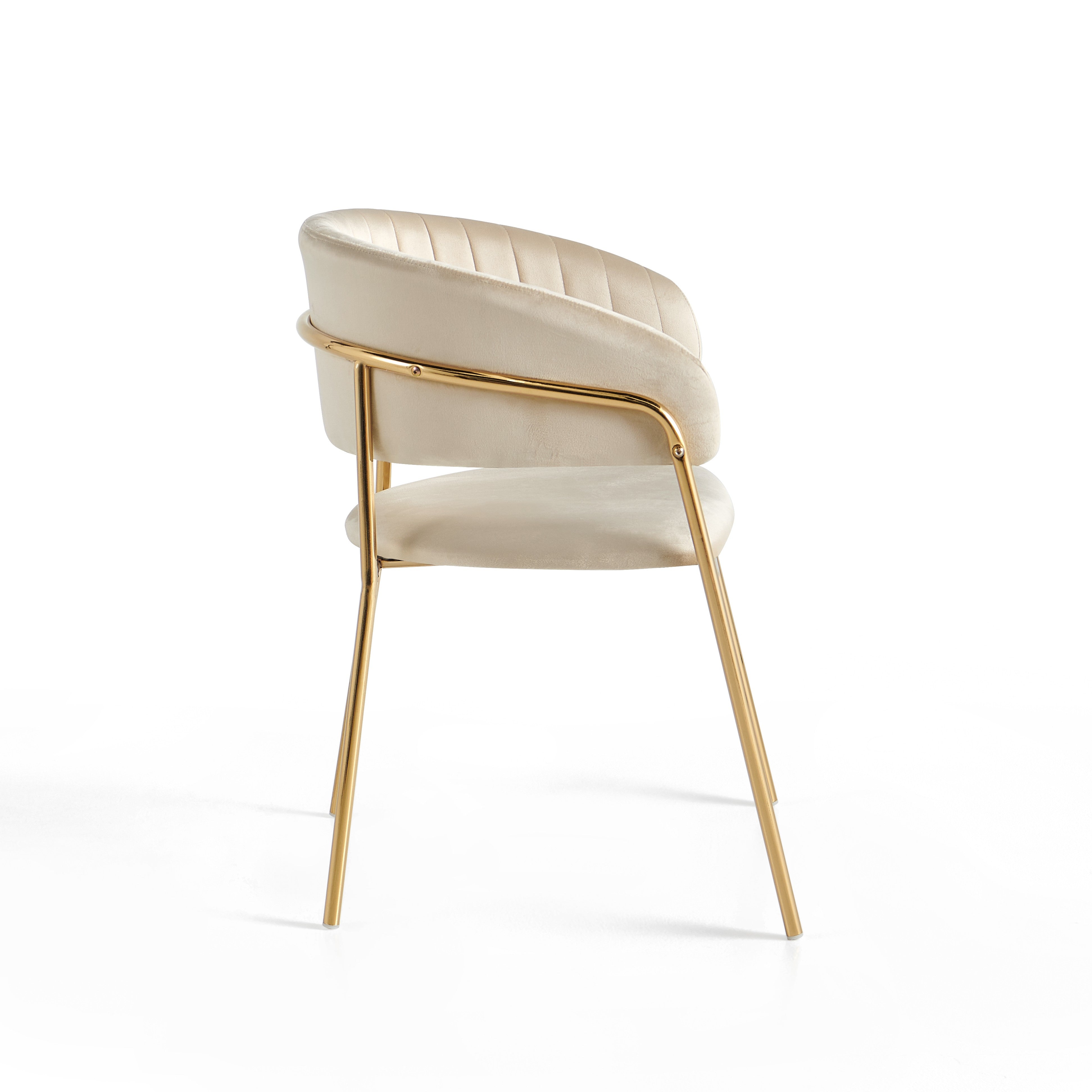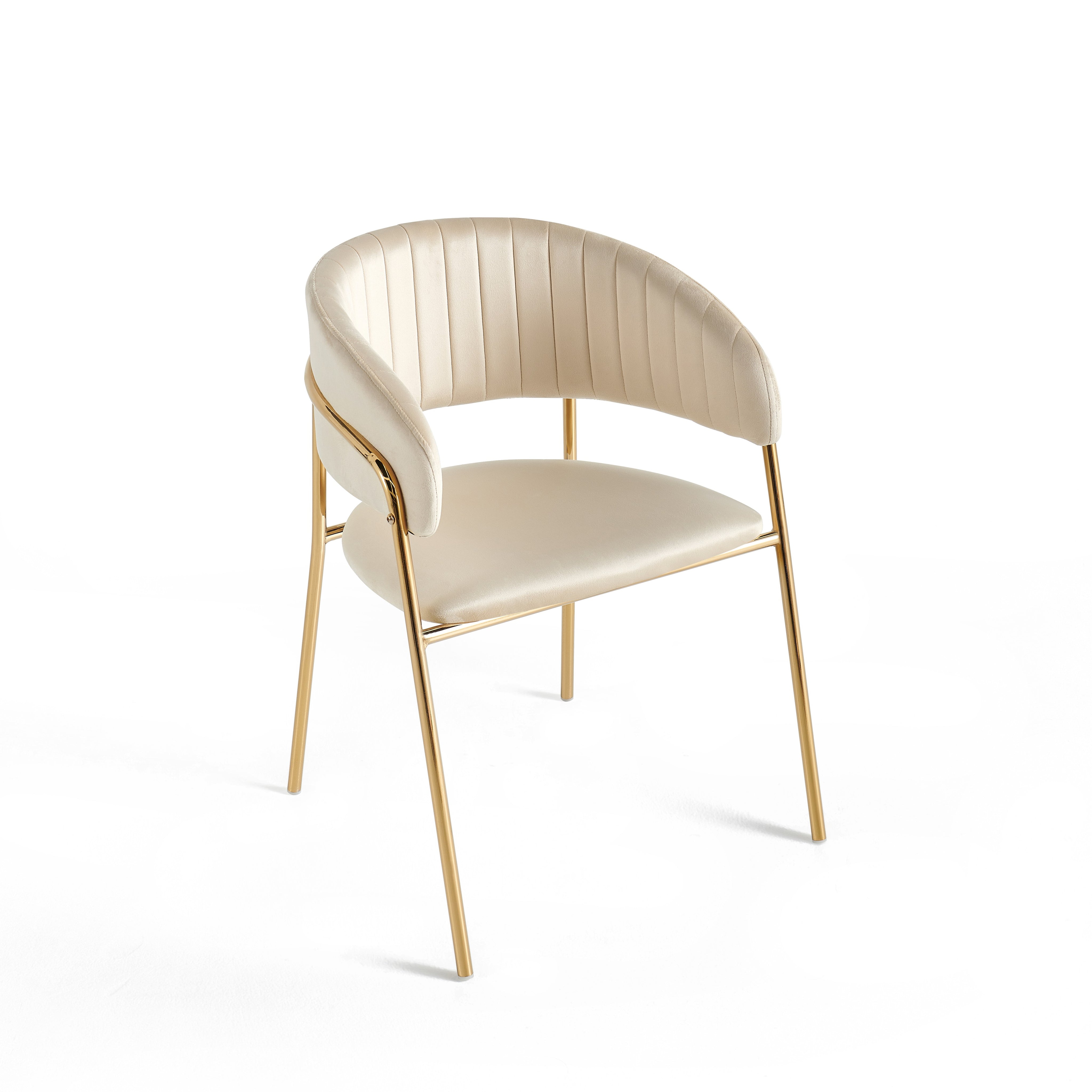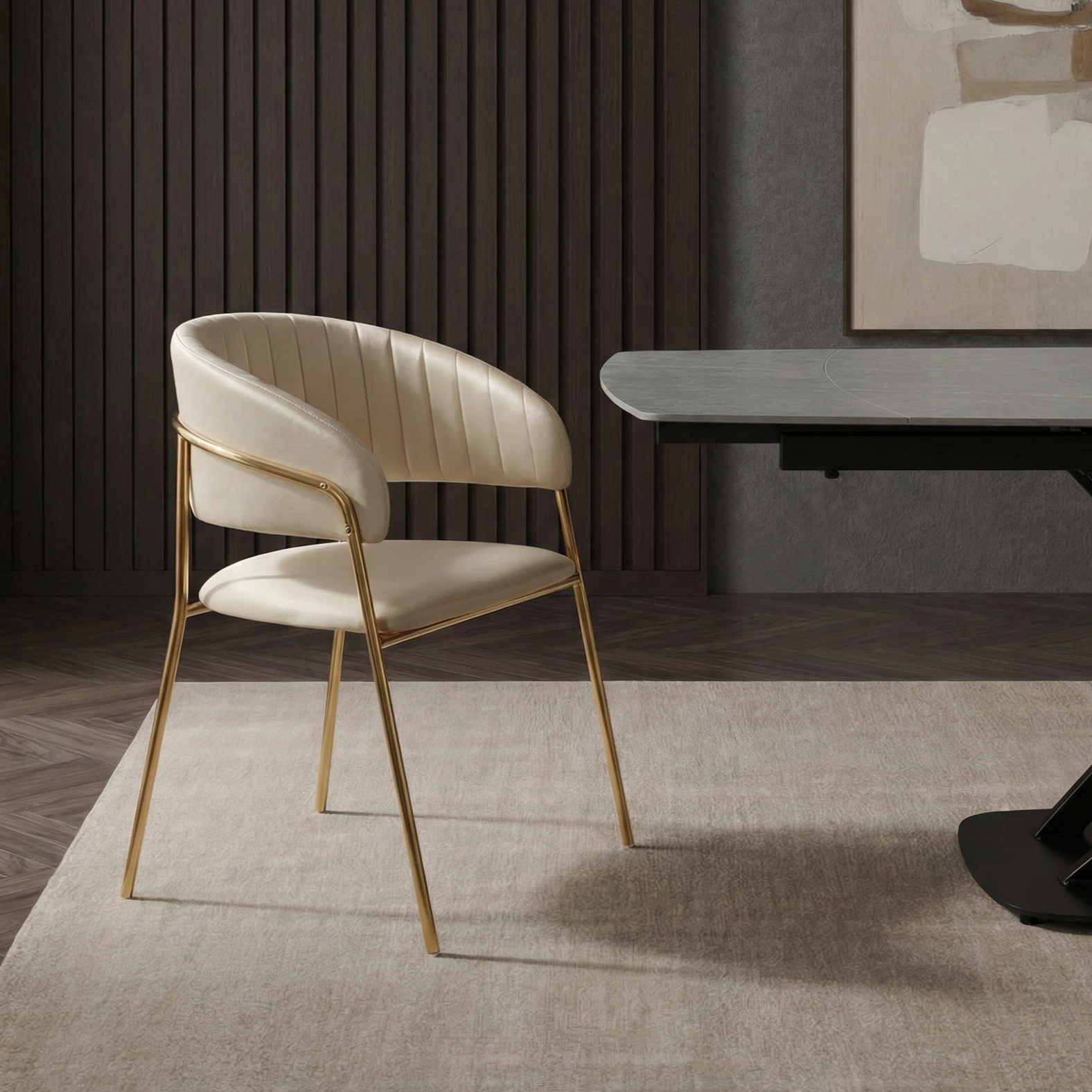 Krzesło 331 to eleganckie krzesło do jadalni tapicerowane welurem w głębokim, beżowym kolorze, łączące nowoczesną formę z wyraźnym, luksusowym akcentem. Beżowy kolor tapicerki w połączeniu ze złotymi nogami nadaje meblowi stylowy, reprezentacyjny wygląd, który dobrze odnajduje się w nowoczesnych i eleganckich wnętrzach.