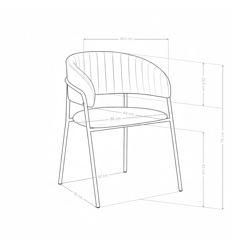 Miękka tapicerka welurowa jest przyjemna w dotyku i zapewnia komfort podczas codziennego użytkowania. Zaokrąglone oparcie z pionowymi przeszyciami delikatnie podpiera plecy, a dobrze wyprofilowane siedzisko zwiększa wygodę zarówno podczas posiłków, jak i dłuższego siedzenia przy stole.