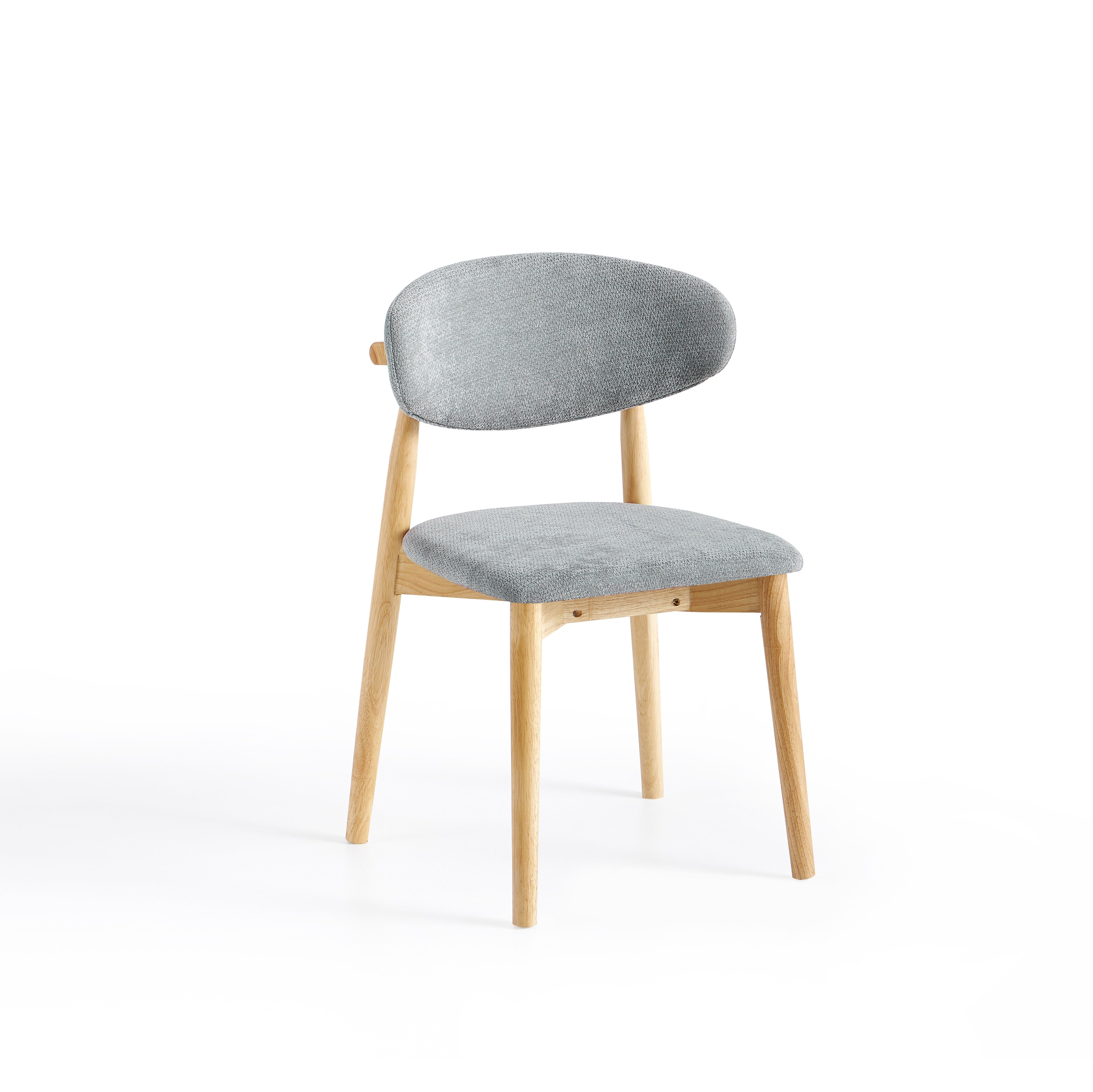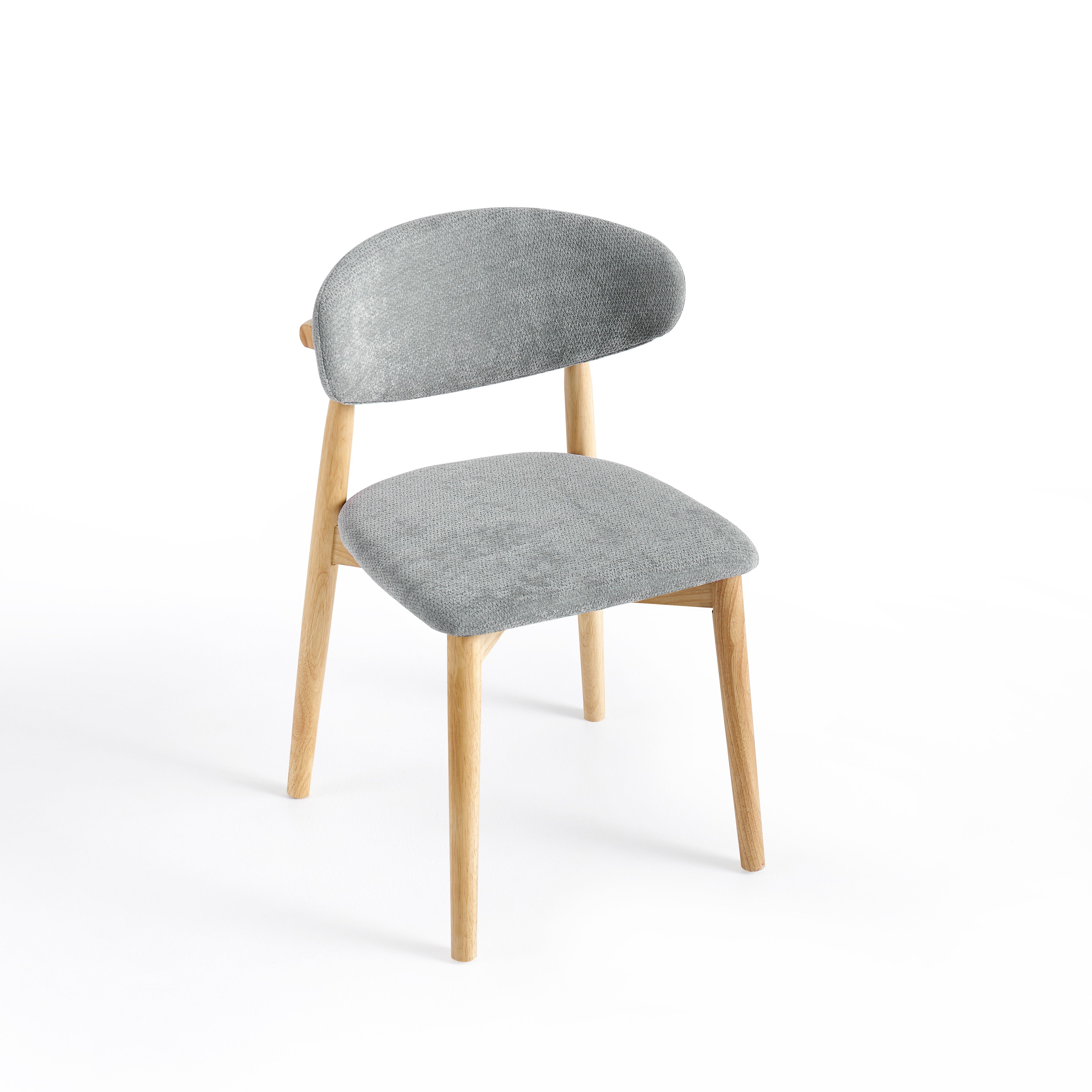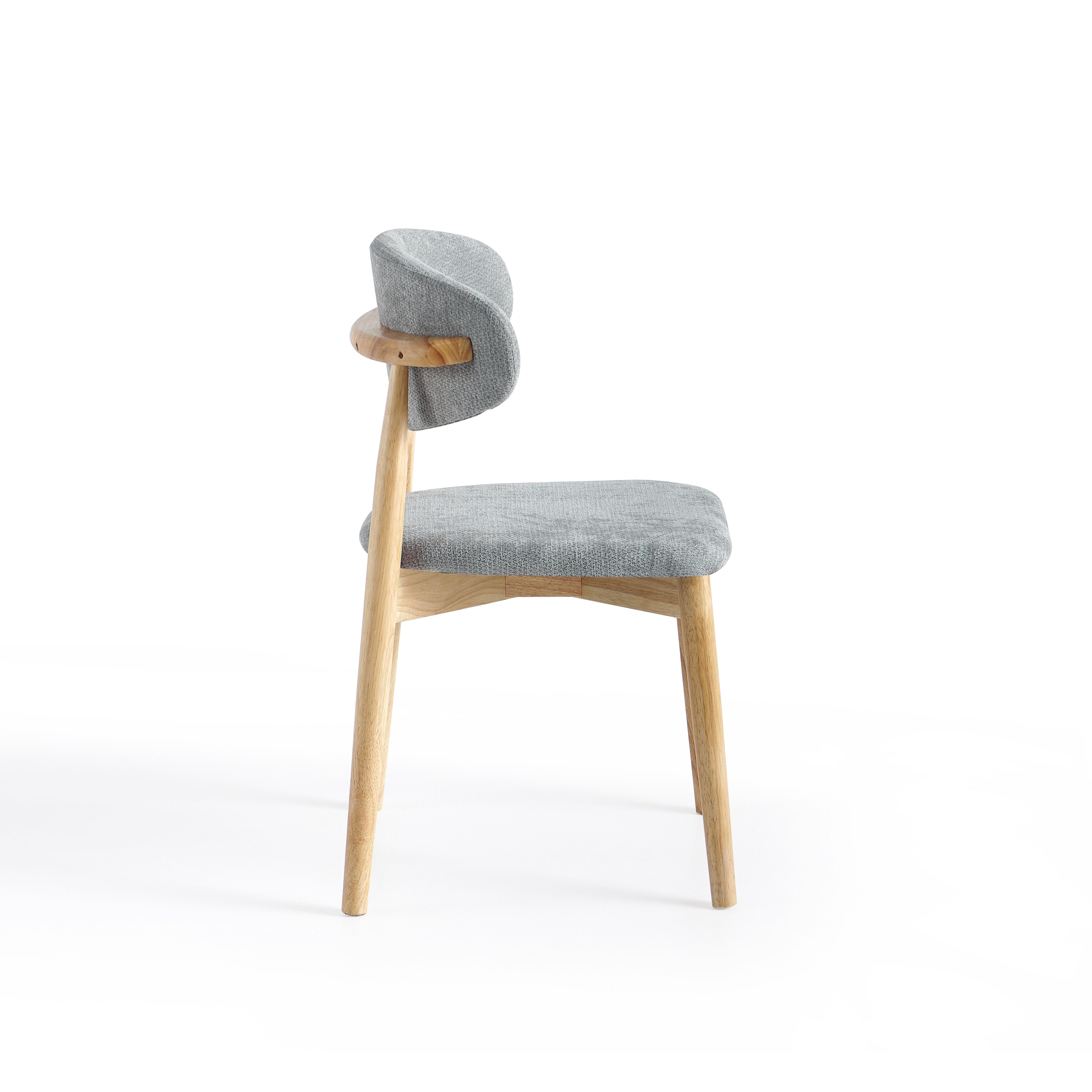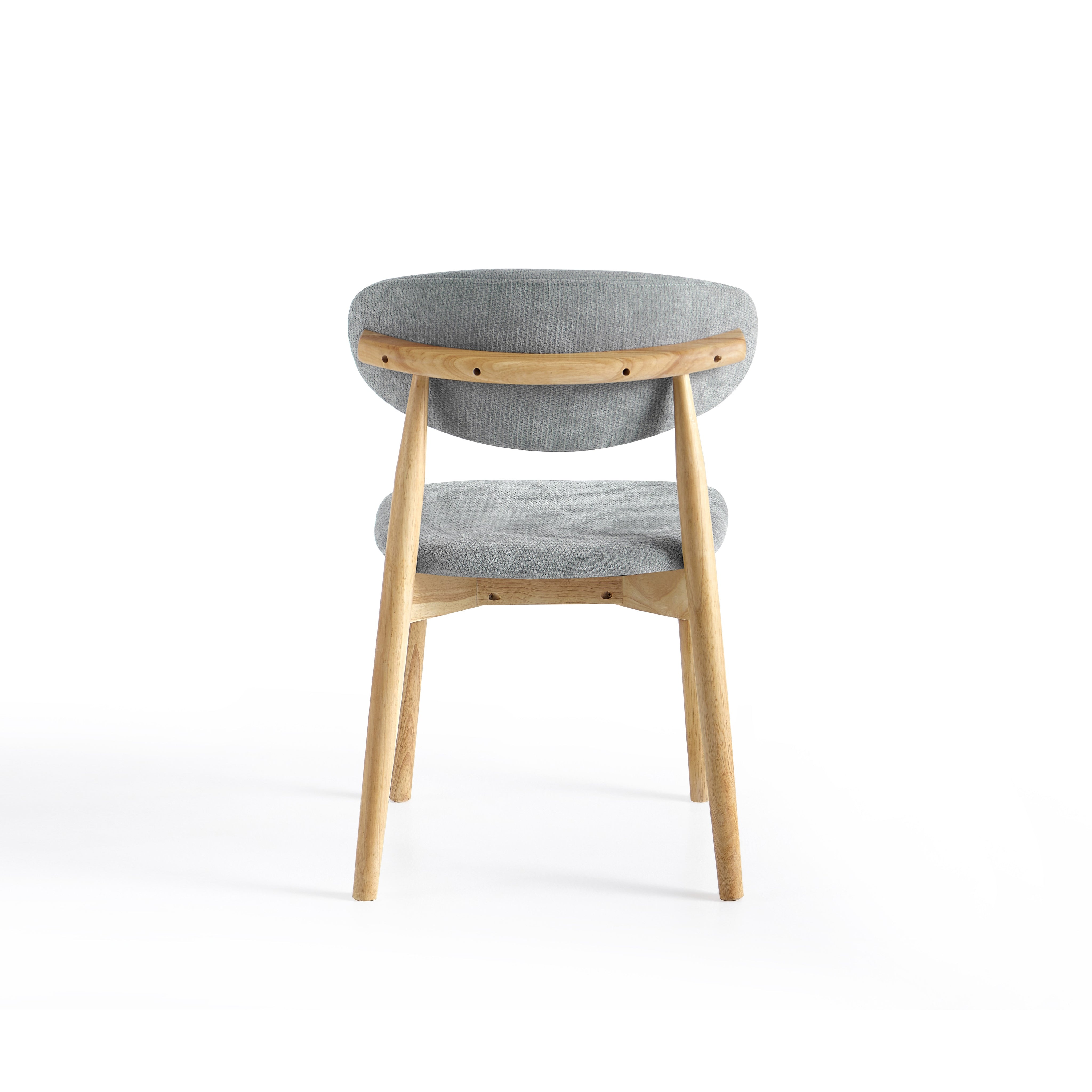 Siedzisko oraz oparcie zostały tapicerowane szarą tkaniną o gładkiej strukturze. Miękka poduszka oparcia zapewnia komfortowe podparcie pleców podczas siedzenia, a odpowiednio wyprofilowane siedzisko zwiększa wygodę użytkowania przy codziennych posiłkach.