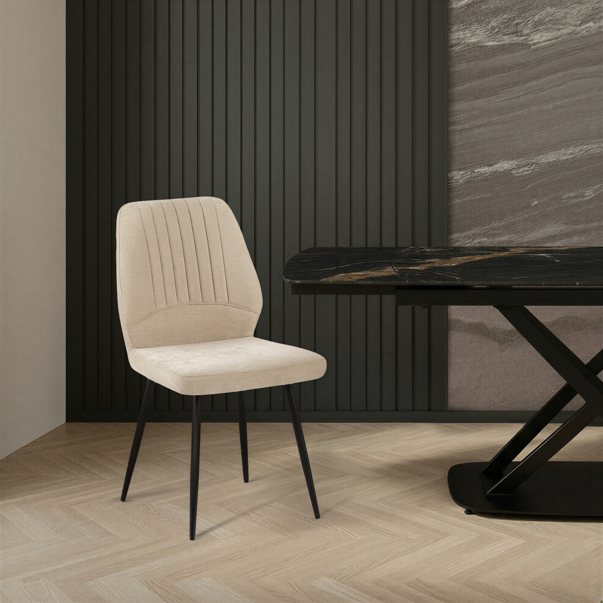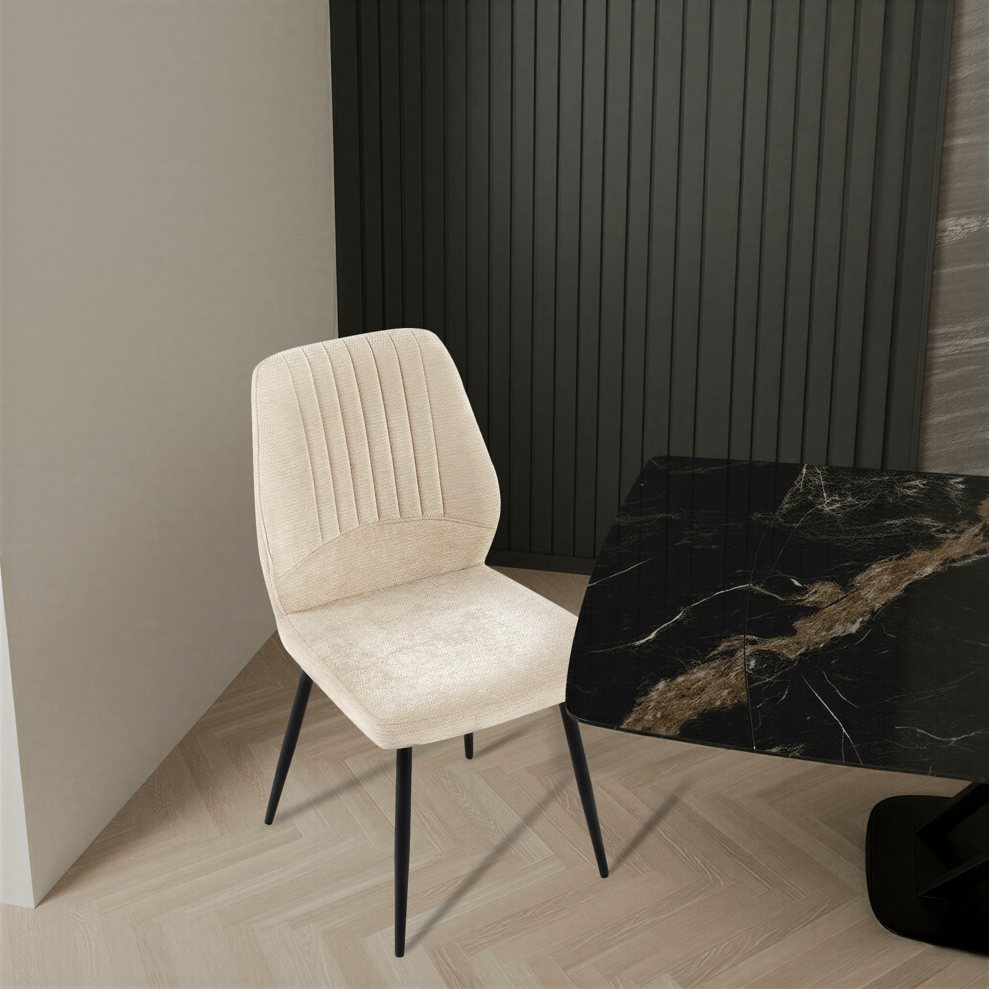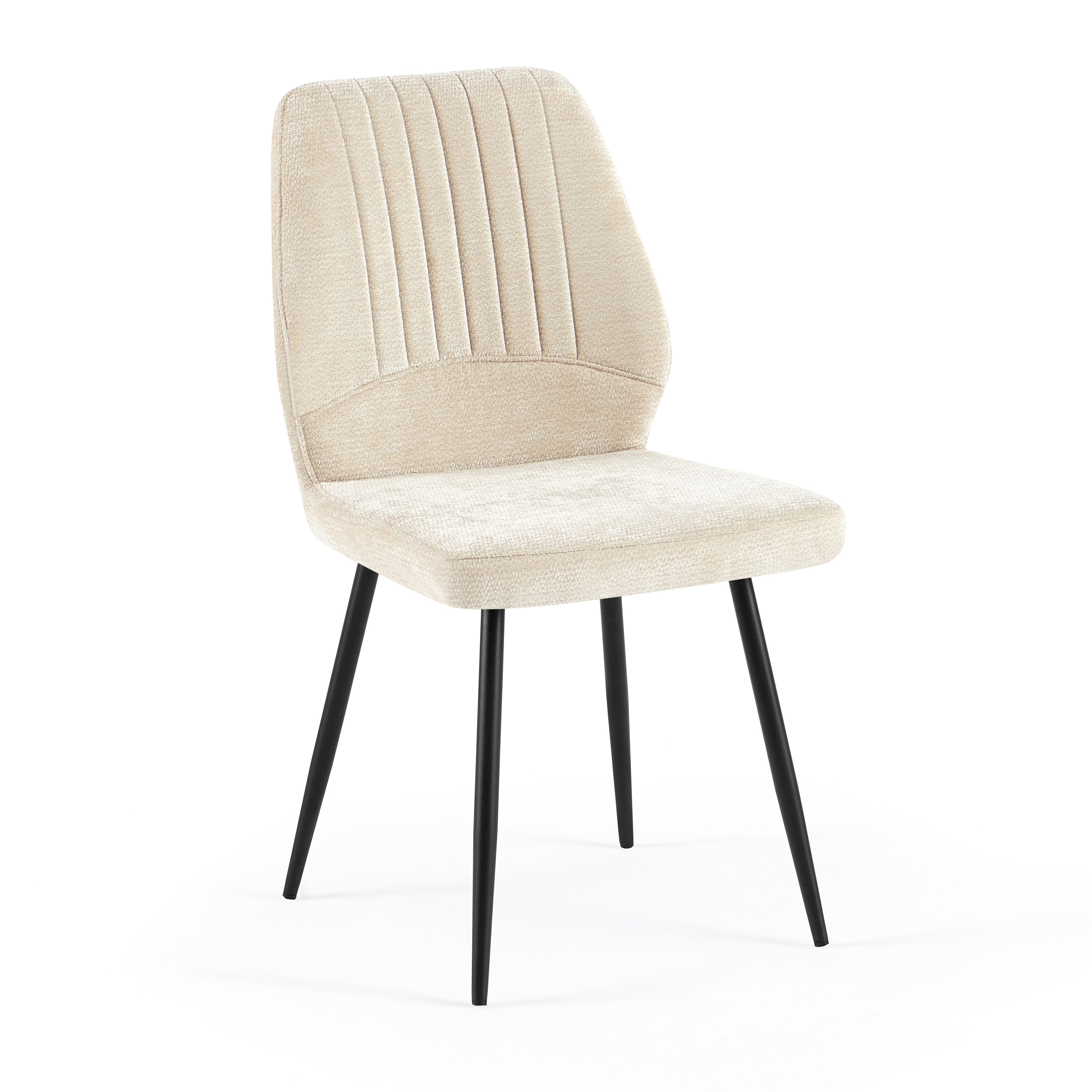 Krzesło Pulse zostało zaprojektowane z myślą o maksymalnym komforcie oraz estetyce współczesnych wnętrz. Wykonane z wysokiej jakości tkaniny premium w kolorze kremowym o delikatnej strukturze i dekoracyjnych pionowych przeszyciach, zapewnia elegancki wygląd oraz wyjątkową trwałość.