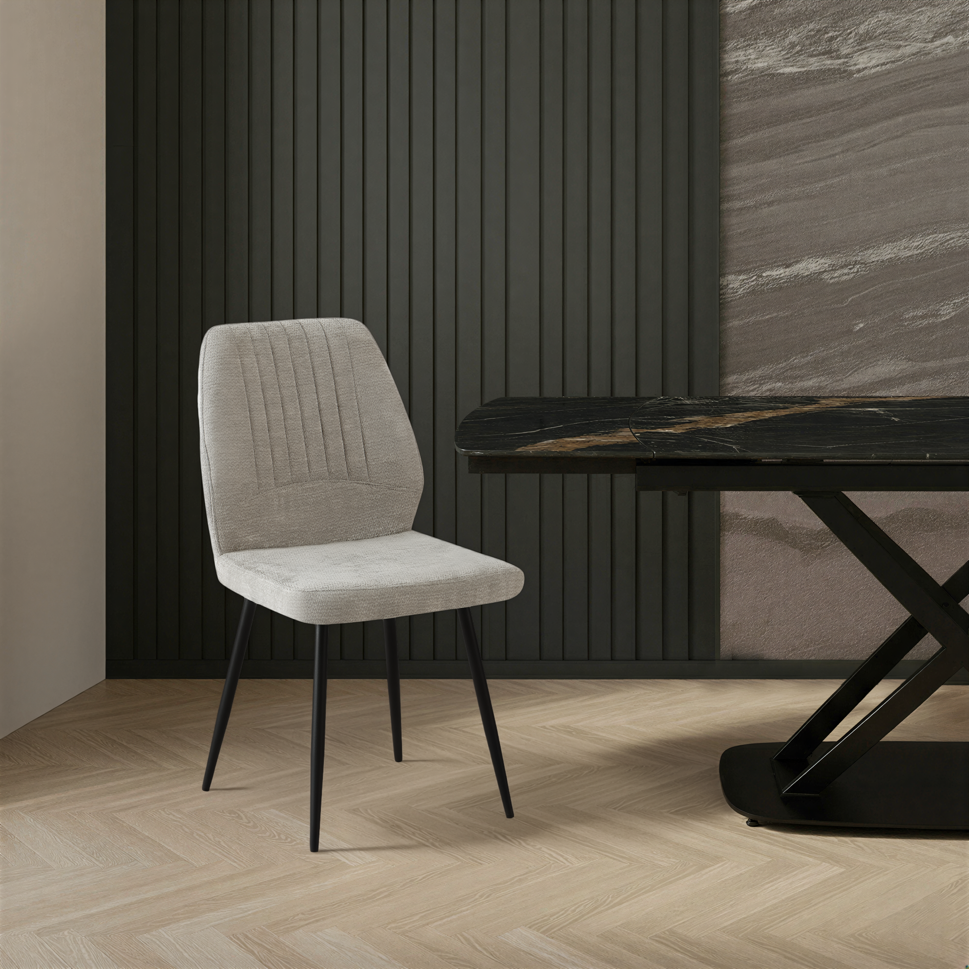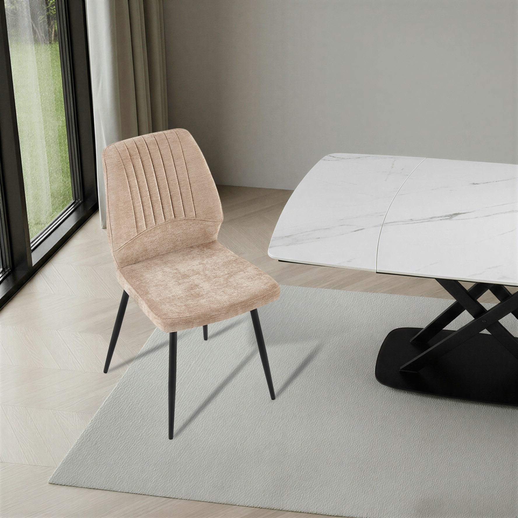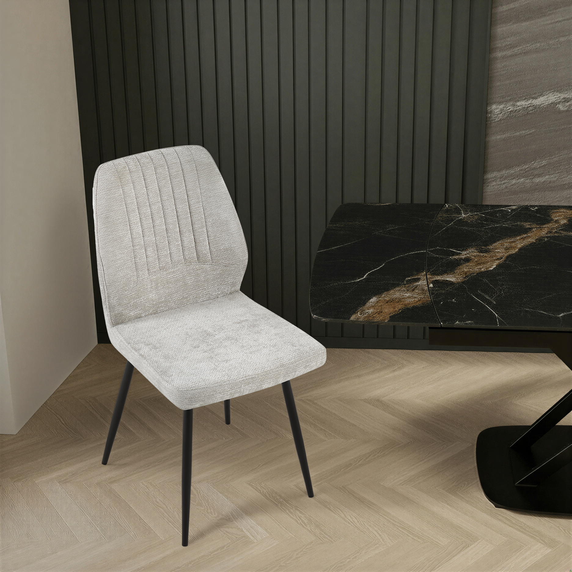 Krzesło Pulse zostało zaprojektowane z myślą o maksymalnym komforcie oraz estetyce współczesnych wnętrz. Wykonane z wysokiej jakości tkaniny premium w kolorze kremowym o delikatnej strukturze i dekoracyjnych pionowych przeszyciach, zapewnia elegancki wygląd oraz wyjątkową trwałość.