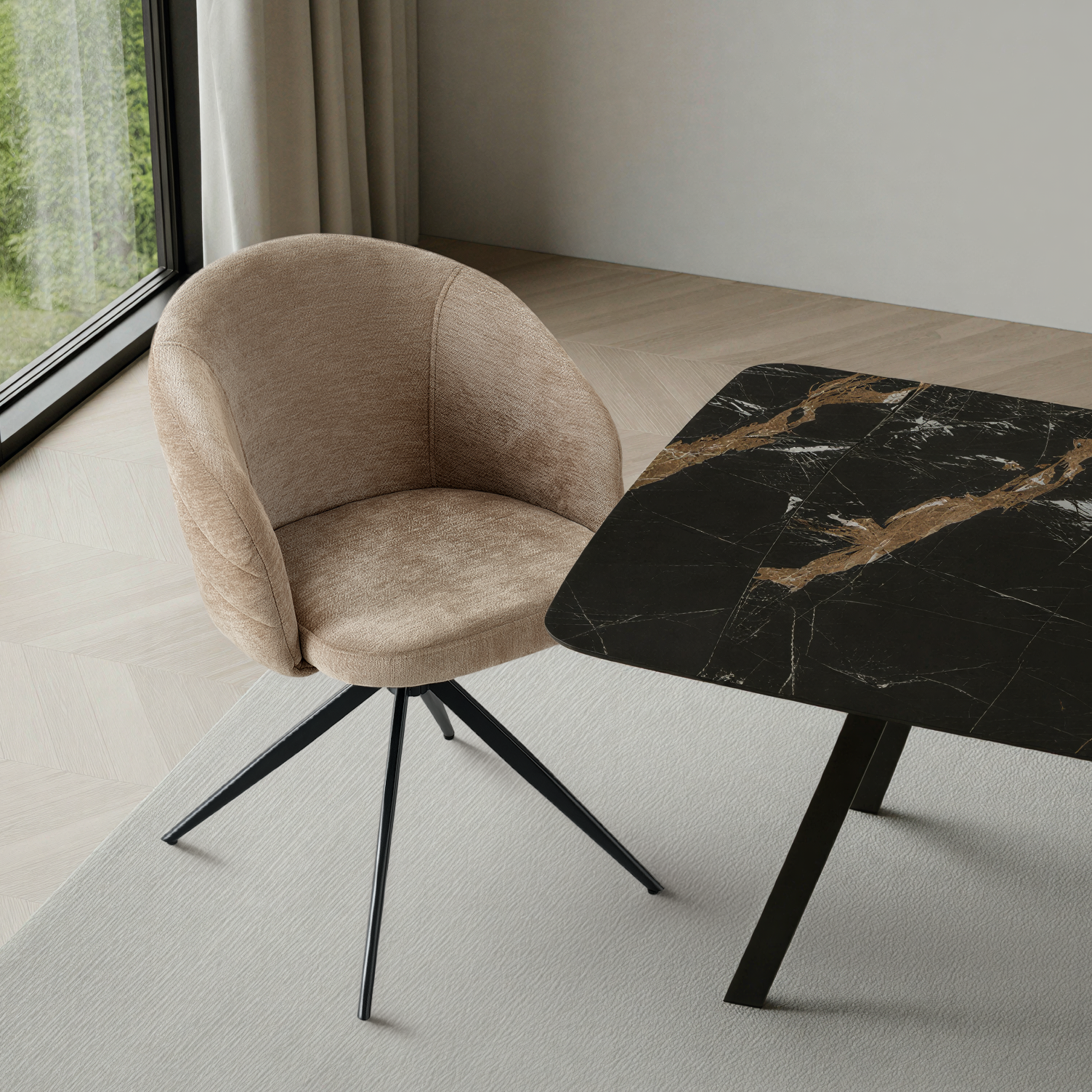 Krzesło Aura zostało stworzone z myślą o komforcie codziennego użytkowania oraz nowoczesnej estetyce. Wysokiej jakości, gładka tkanina tapicerska w eleganckim kremowym kolorze jest miękka w dotyku, odporna na zużycie i bardzo łatwa w pielęgnacji.