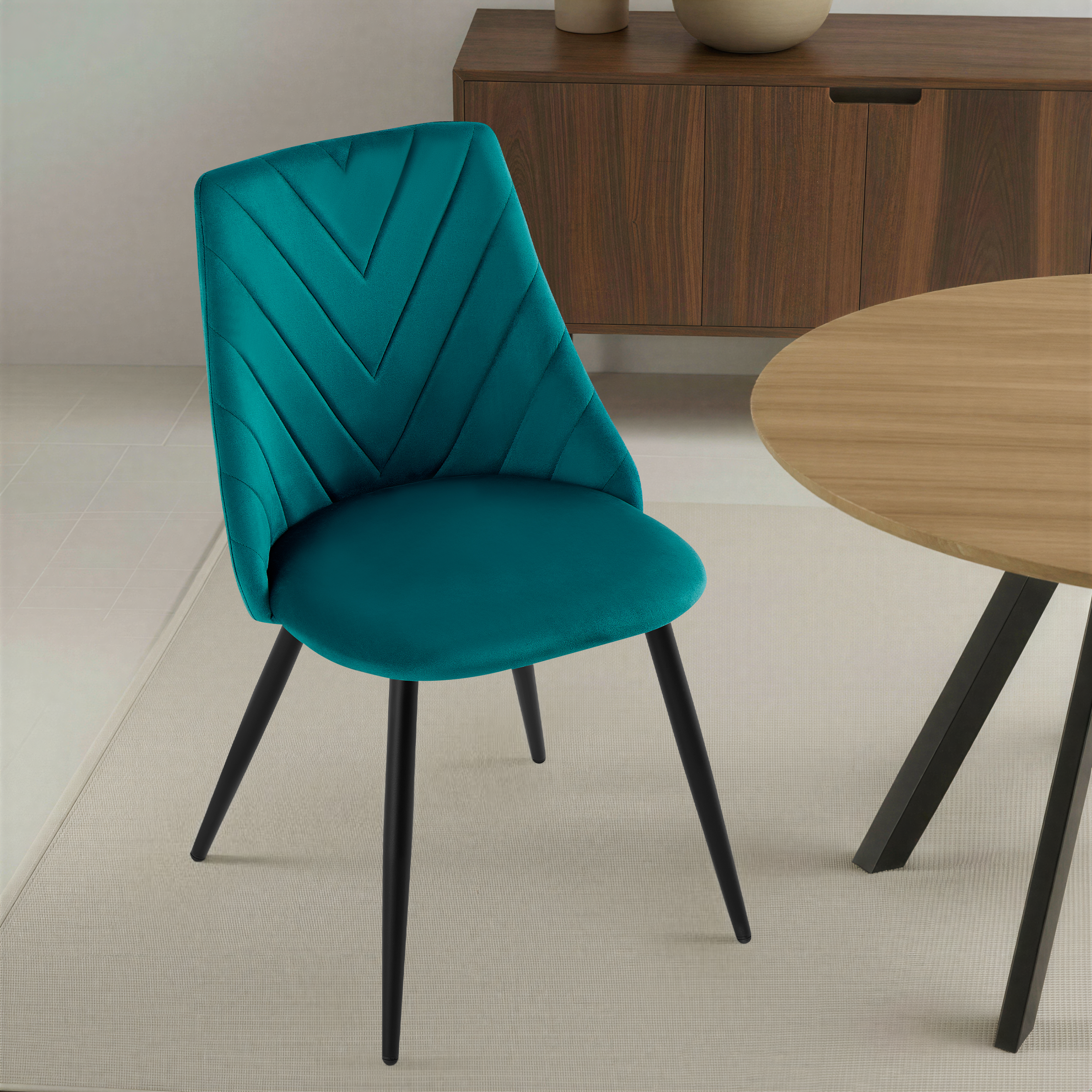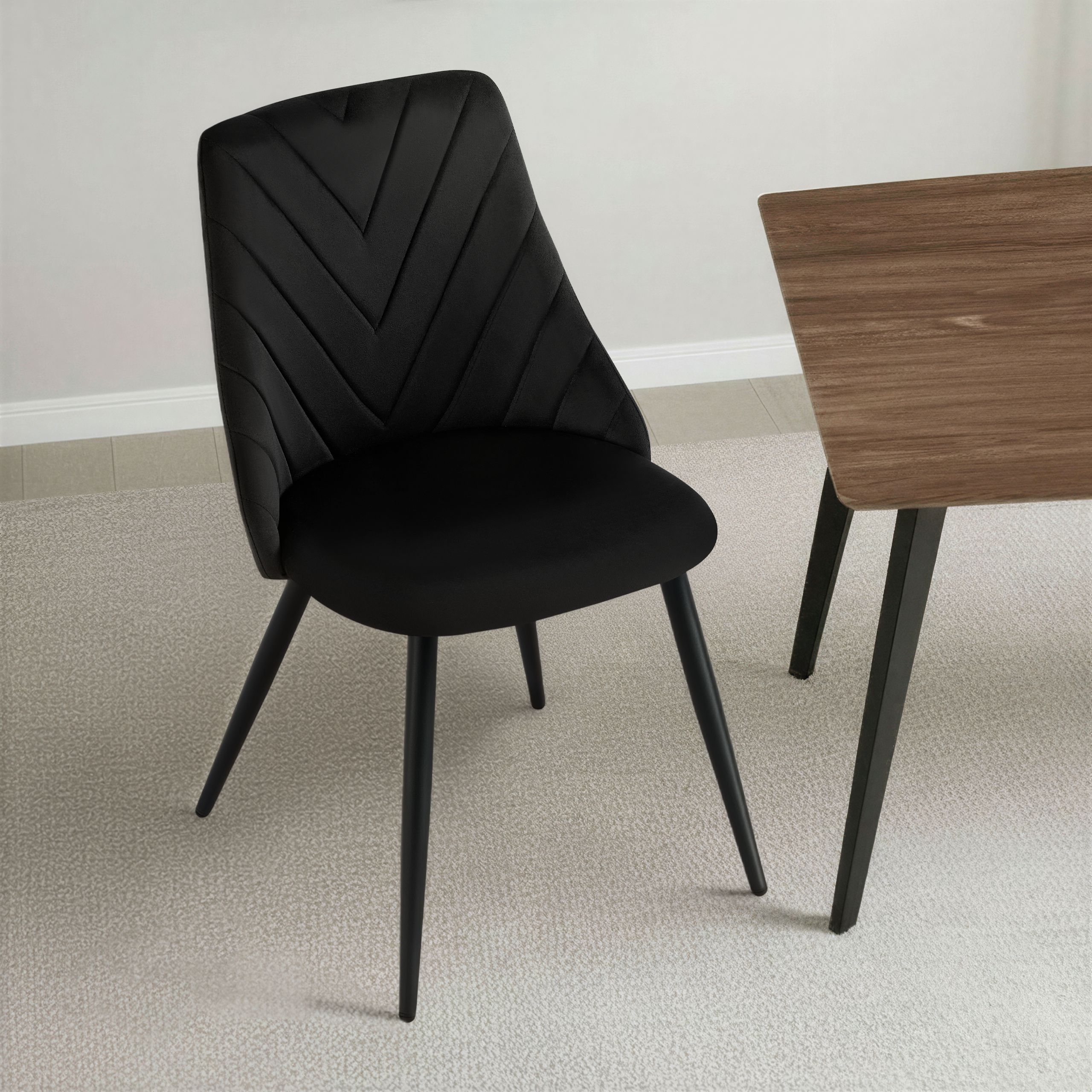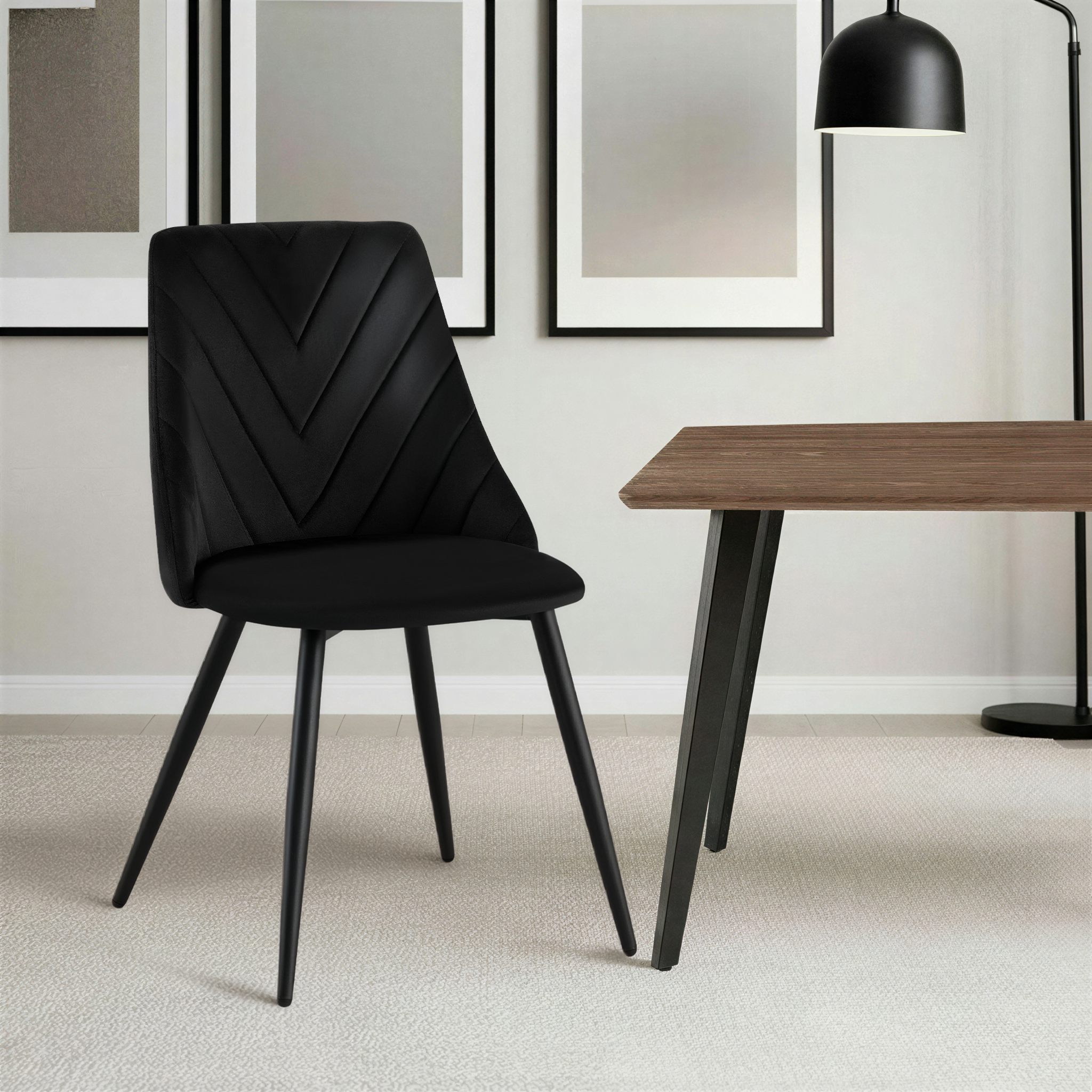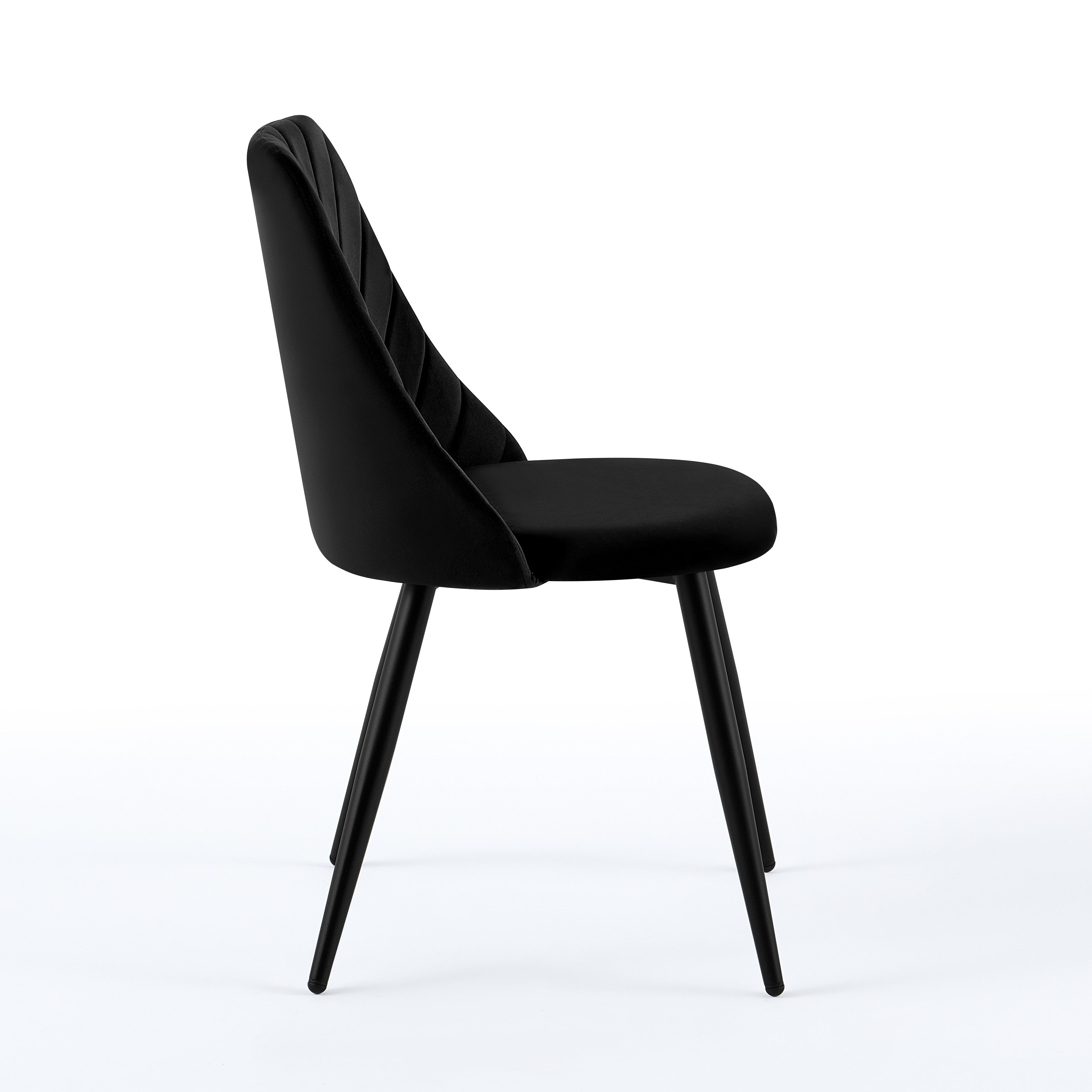 Krzesło Zephyr w odcieniu czarnym to propozycja dla wnętrz pełnych lekkości i elegancji. Idealne do jadalni, kawiarni, salonów beauty lub aranżacji w stylu nowoczesnym, boho czy glam. Aksamitna tapicerka w połączeniu z przeszyciem w jodełkę nadaje krzesłu wyjątkową miękkość wizualną i dekoracyjność. Zaokrąglone oparcie, sprężyste siedzisko oraz stabilne metalowe nogi malowane proszkowo sprawiają, że Zephyr doskonale sprawdzi się w jadalni, salonie, kawiarni lub nowoczesnych wnętrzach typu studio.