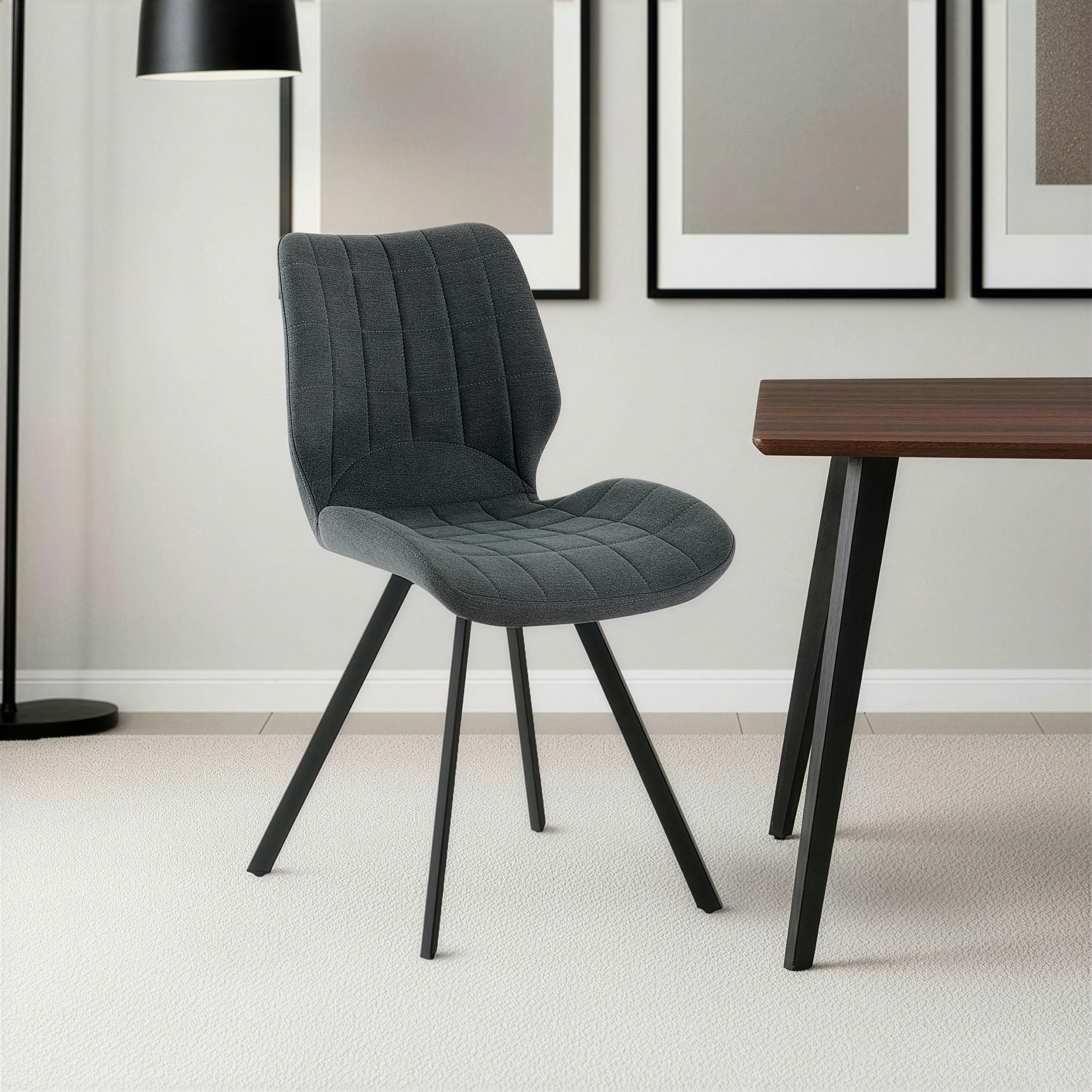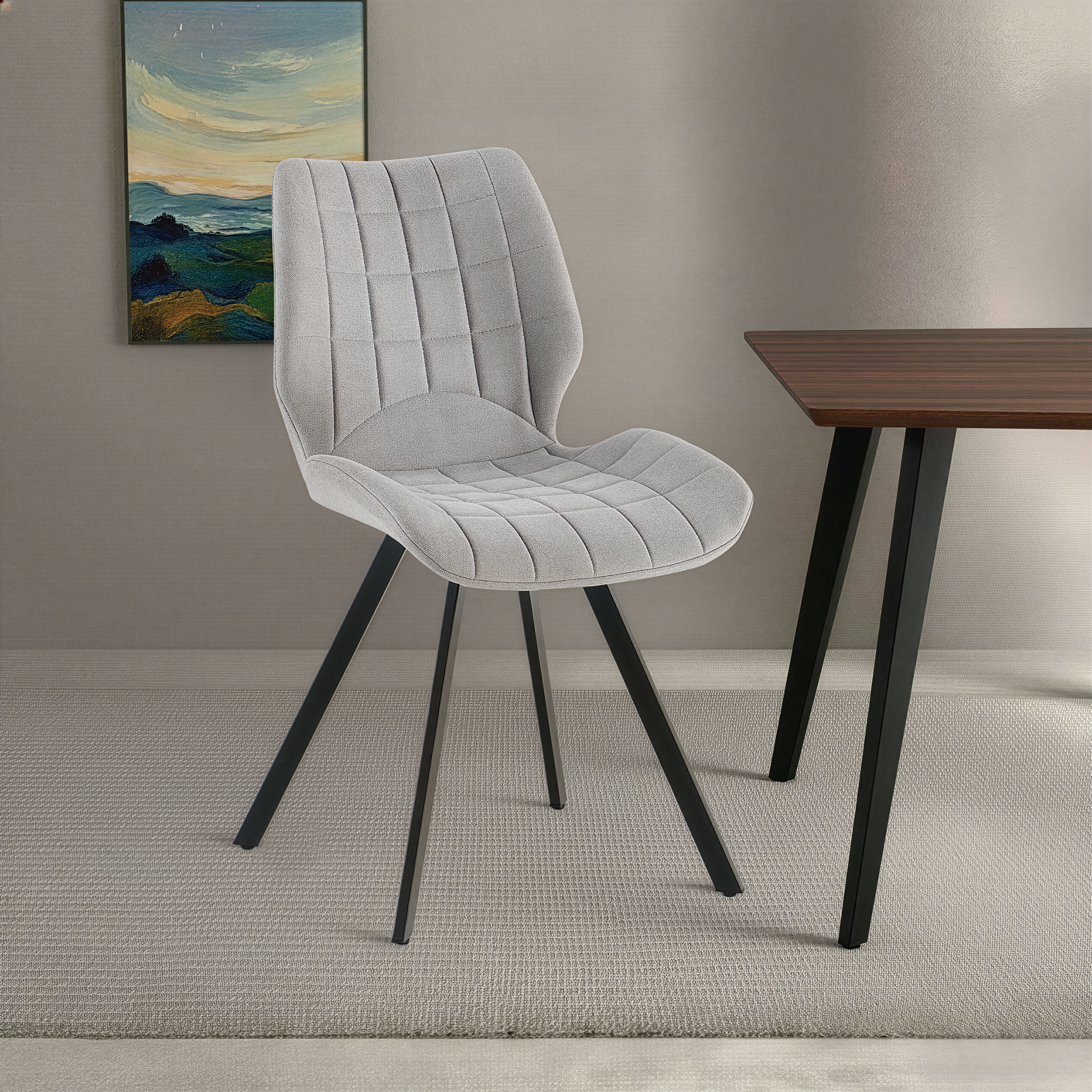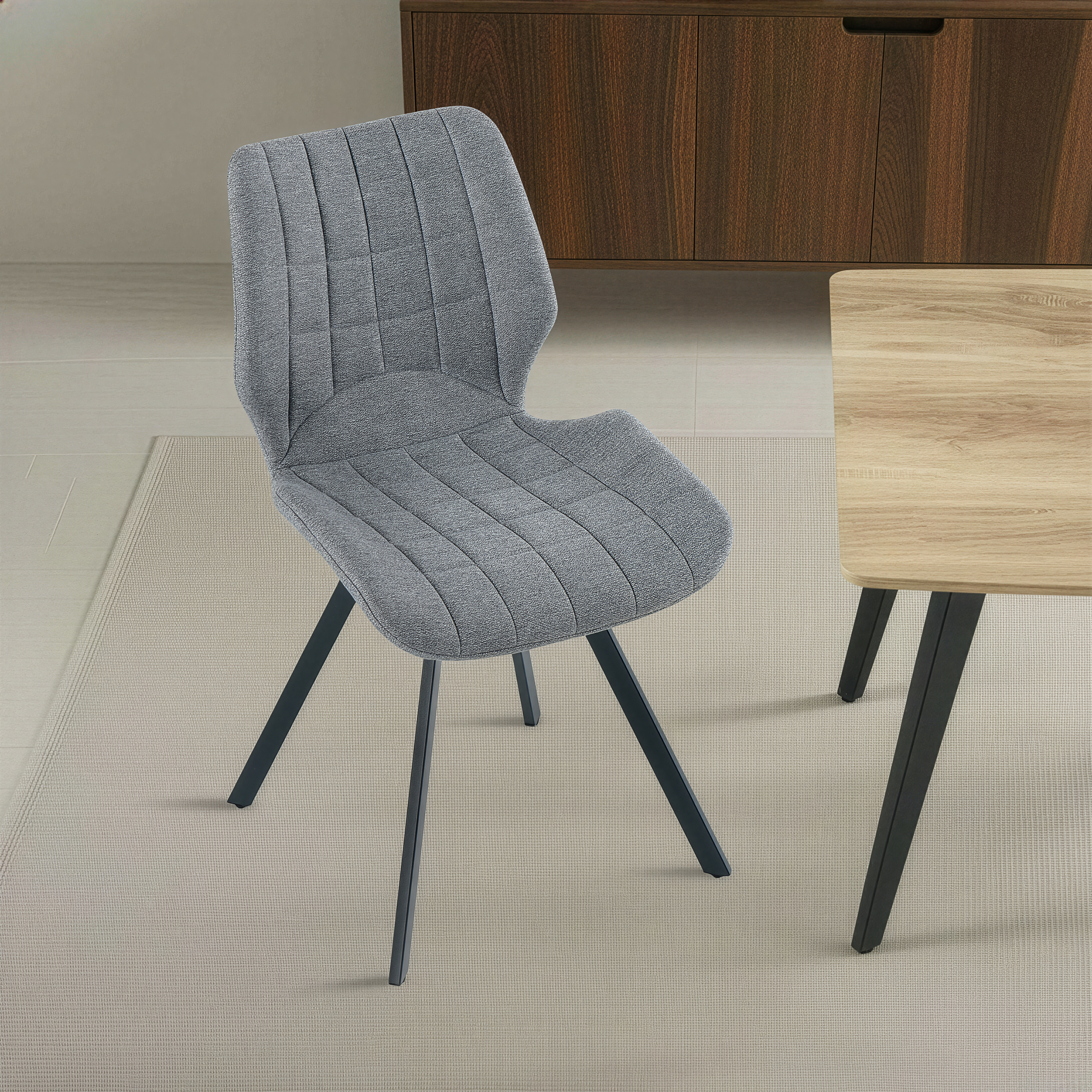 Krzesło Linea w odcieniu ciemnego beżu to synonim elegancji i nowoczesnego komfortu, idealnie wpisujący się w potrzeby współczesnych jadalni. Tapicerka z wysokiej jakości tkaniny zachwyca miękkością oraz stylowymi, pionowymi przeszyciami, które nadają meblowi unikalnego charakteru i wizualnej lekkości. Osadzone na solidnych, czarnych nogach ze stali, krzesło zapewnia stabilność i trwałość, stanowiąc doskonałą bazę dla codziennych posiłków. Jego ergonomiczny profil dba o wygodę pleców, a ciepła kolorystyka wprowadza do wnętrza przytulną, domową atmosferę, doskonale komponując się z aranżacjami w stylu loft, modern czy glamour.