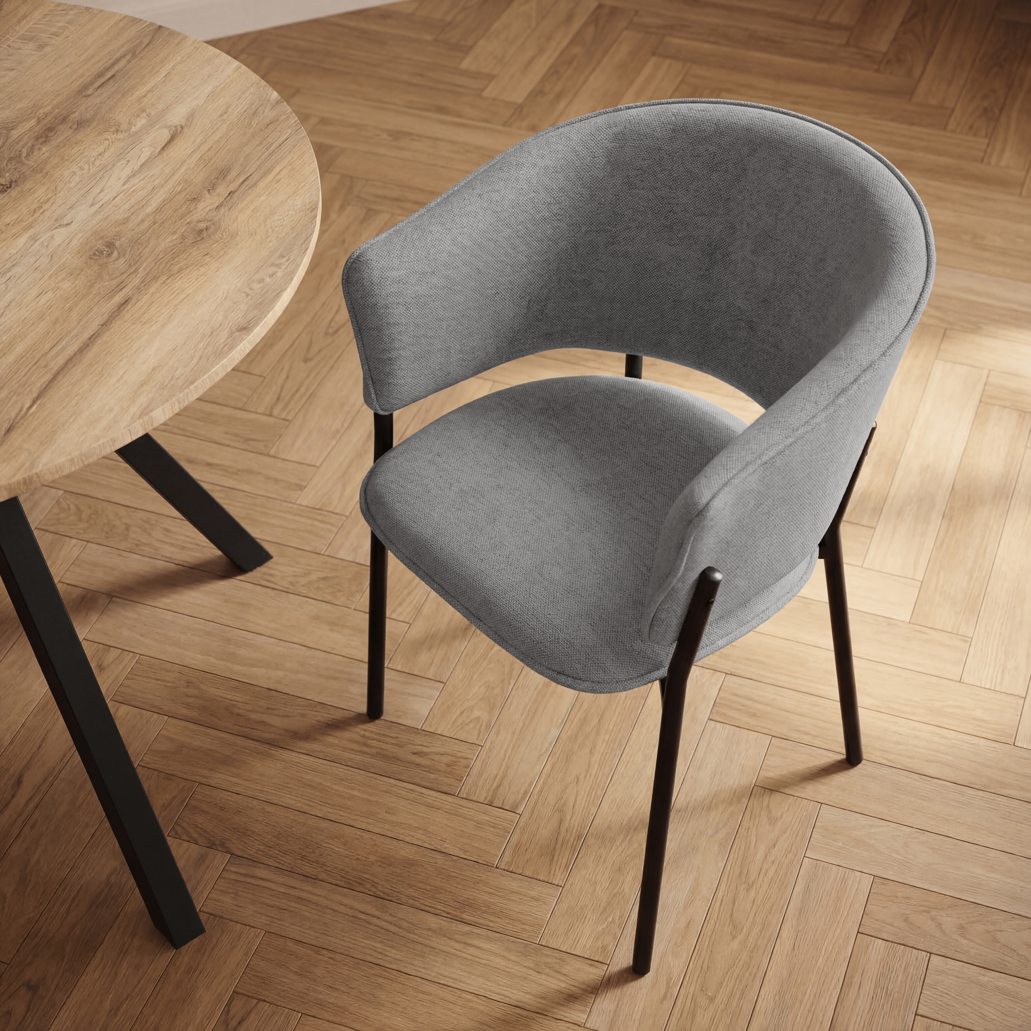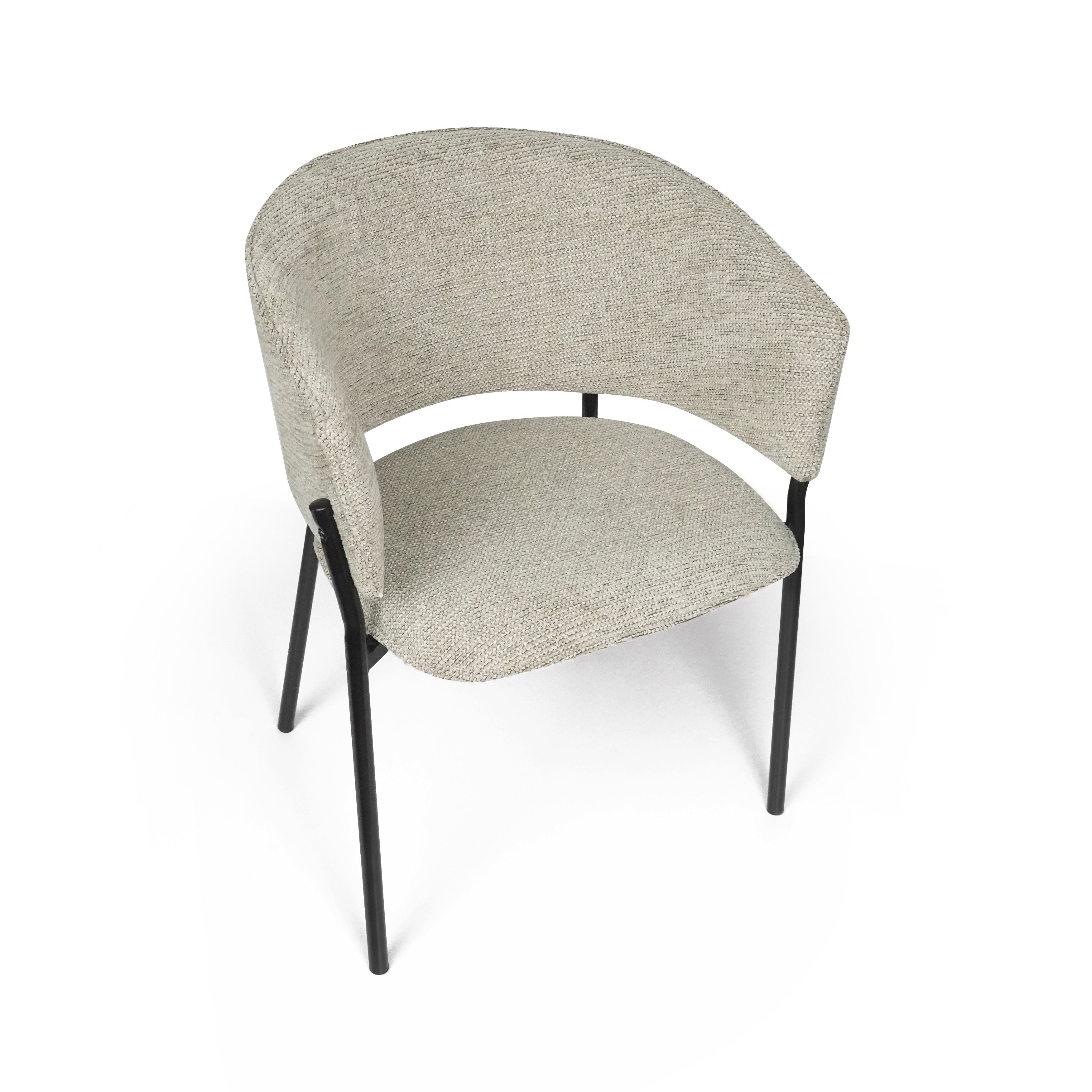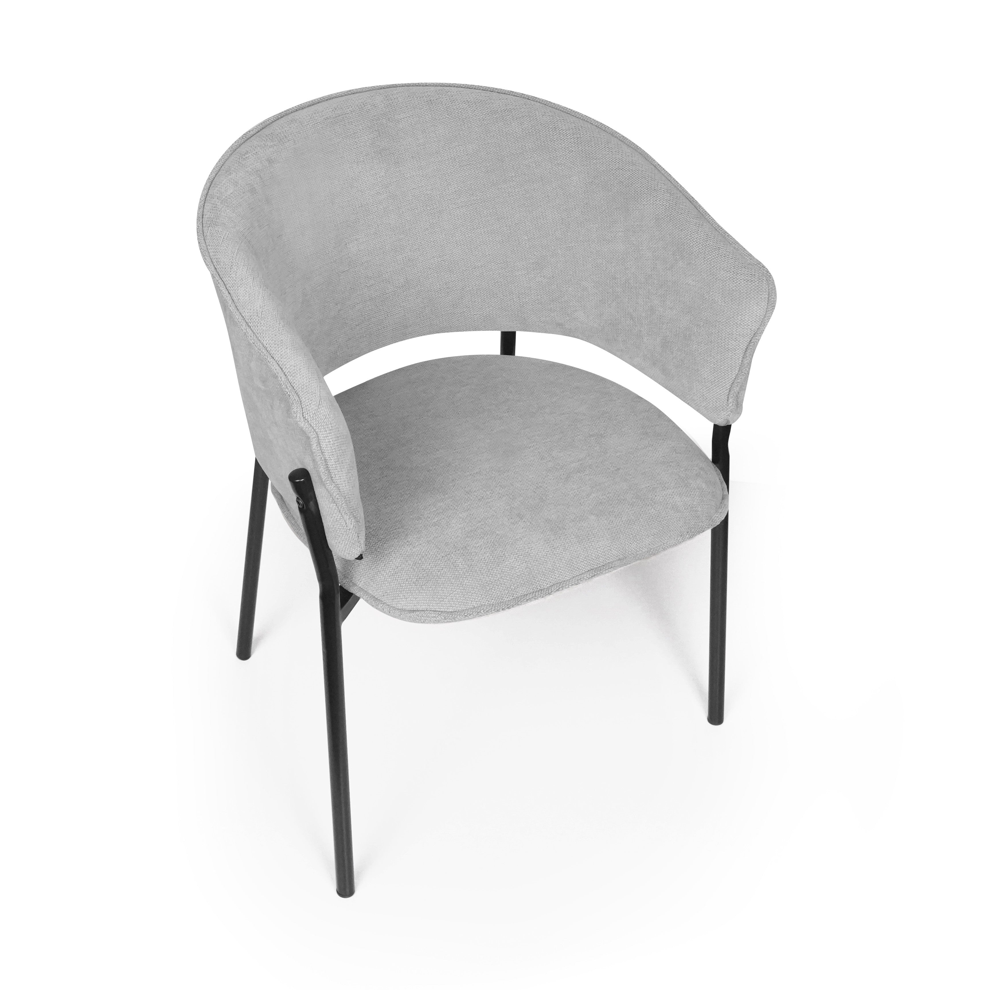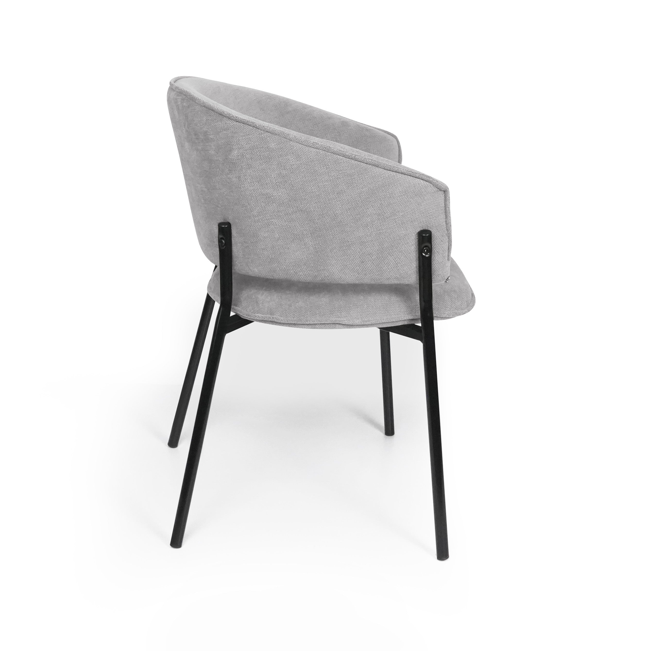 Siedzisko oraz oparcie są miękko tapicerowane, co zapewnia wysoki komfort podczas codziennego użytkowania. Charakterystyczne, półokrągłe oparcie delikatnie otula plecy, a zintegrowane podłokietniki zwiększają wygodę siedzenia i pozwalają na naturalne ułożenie ramion.