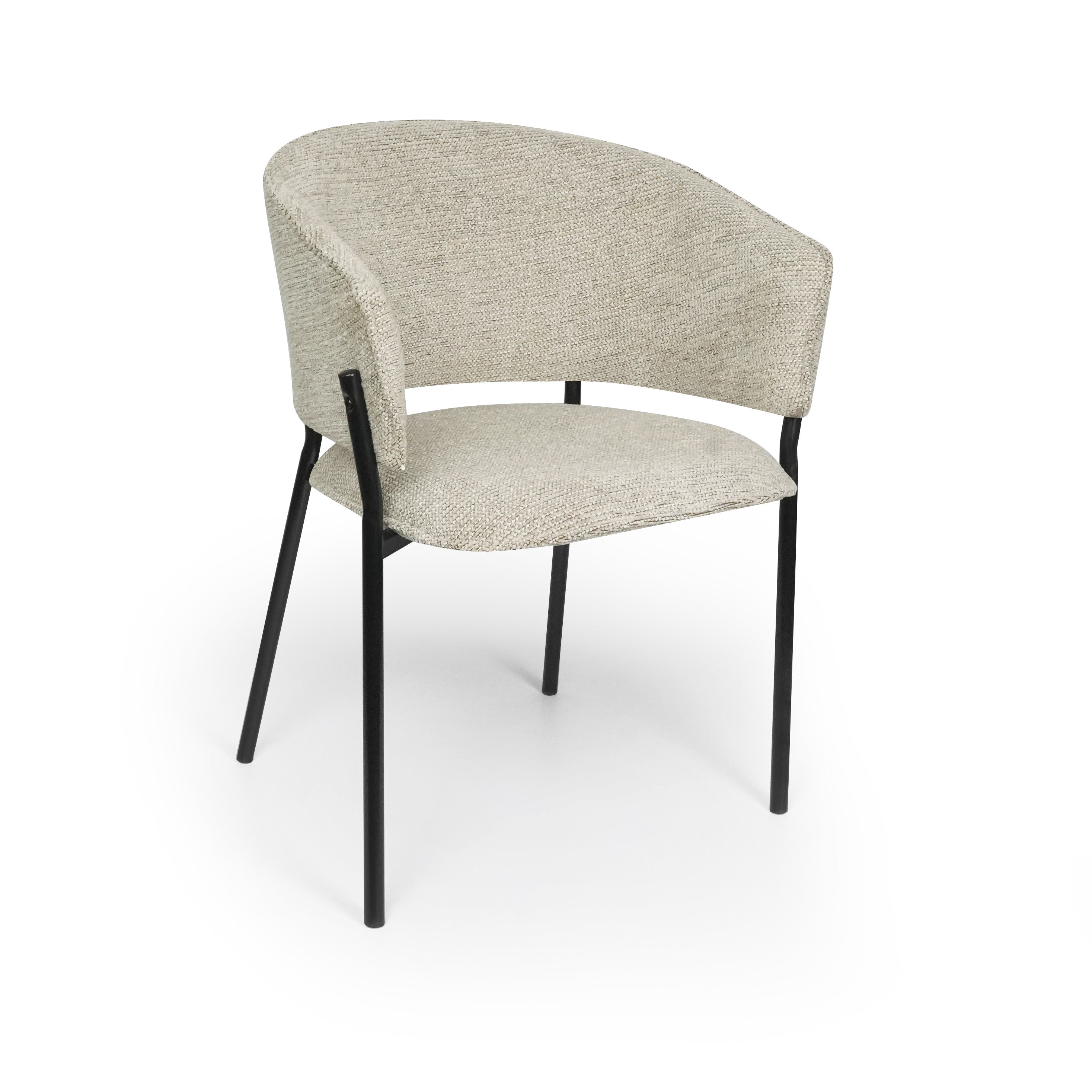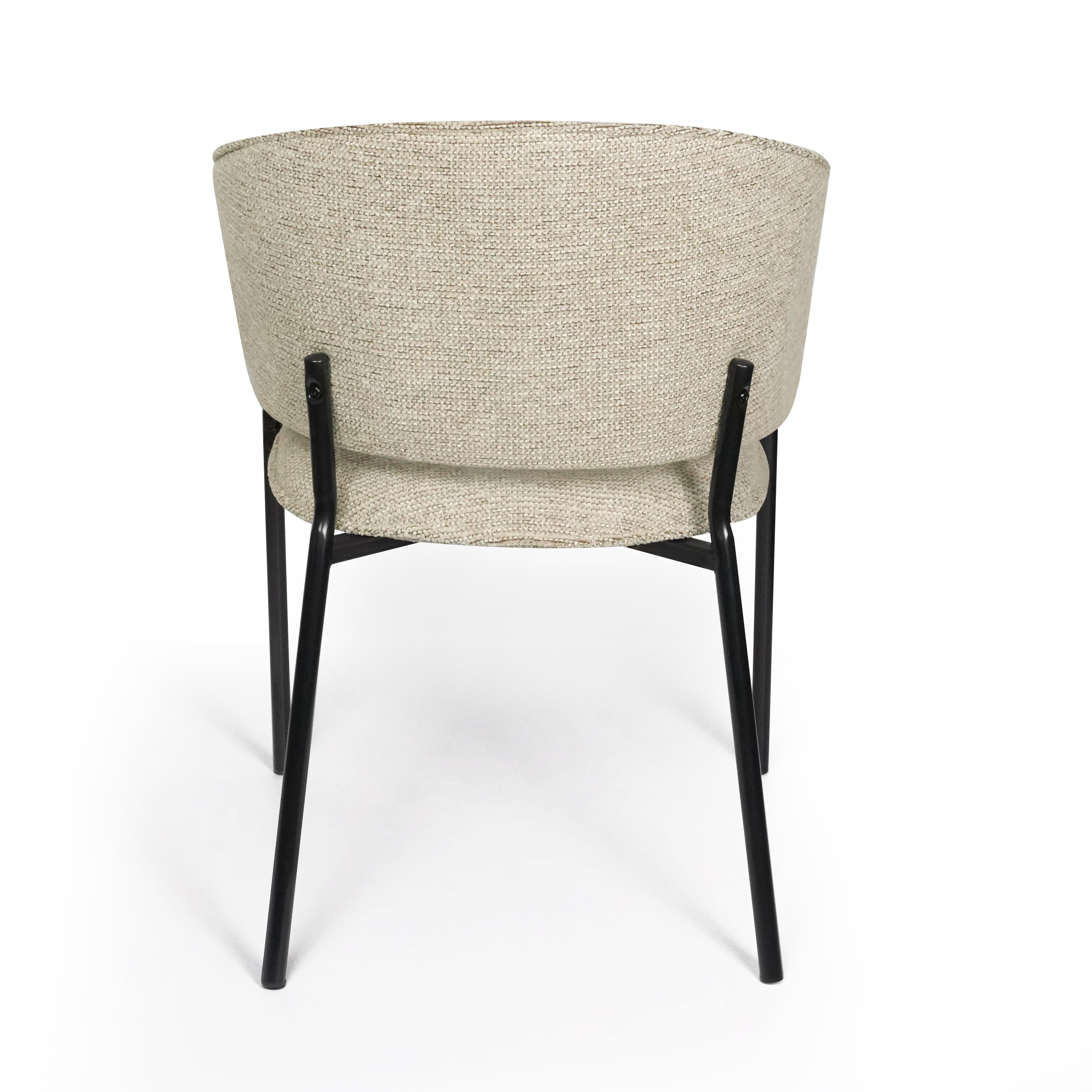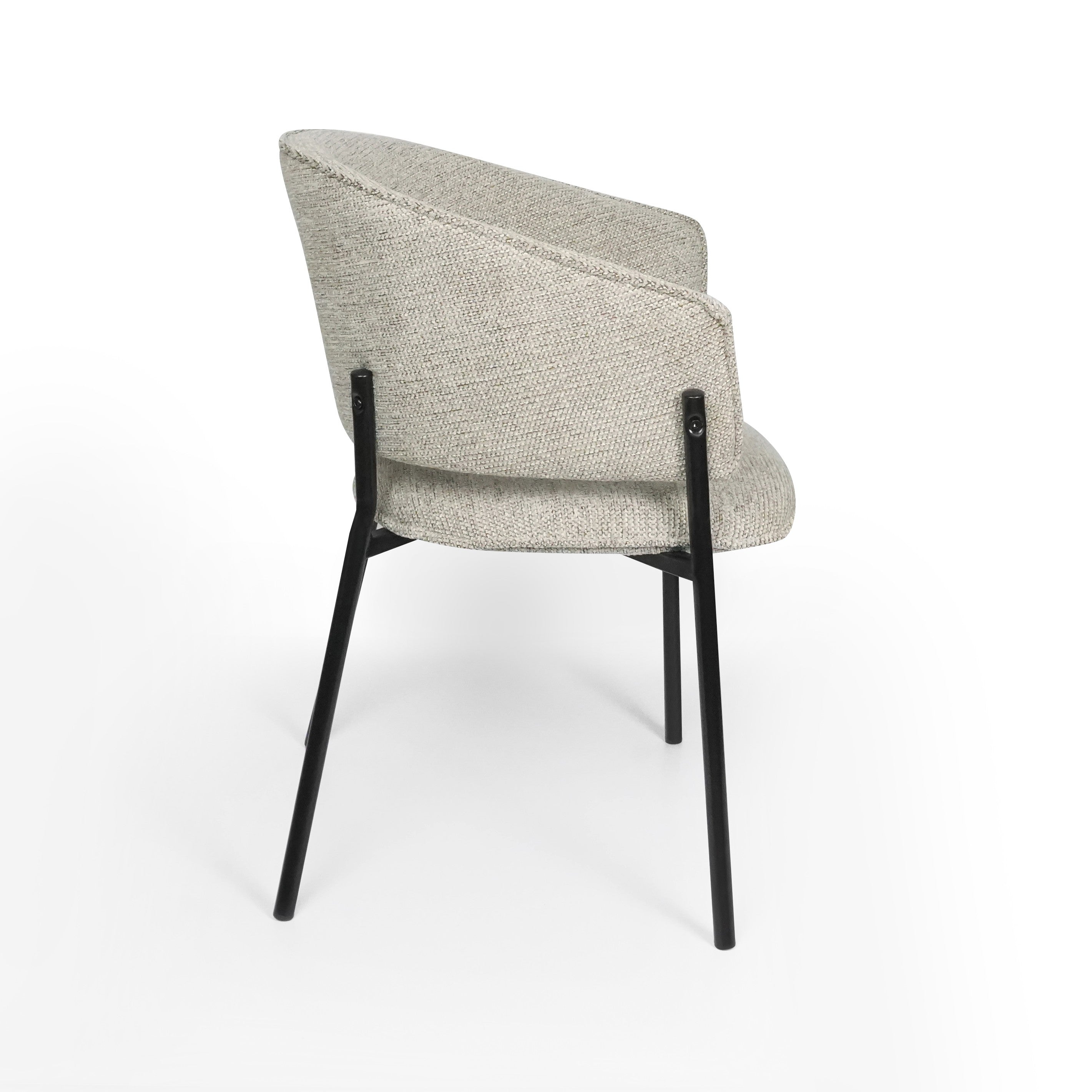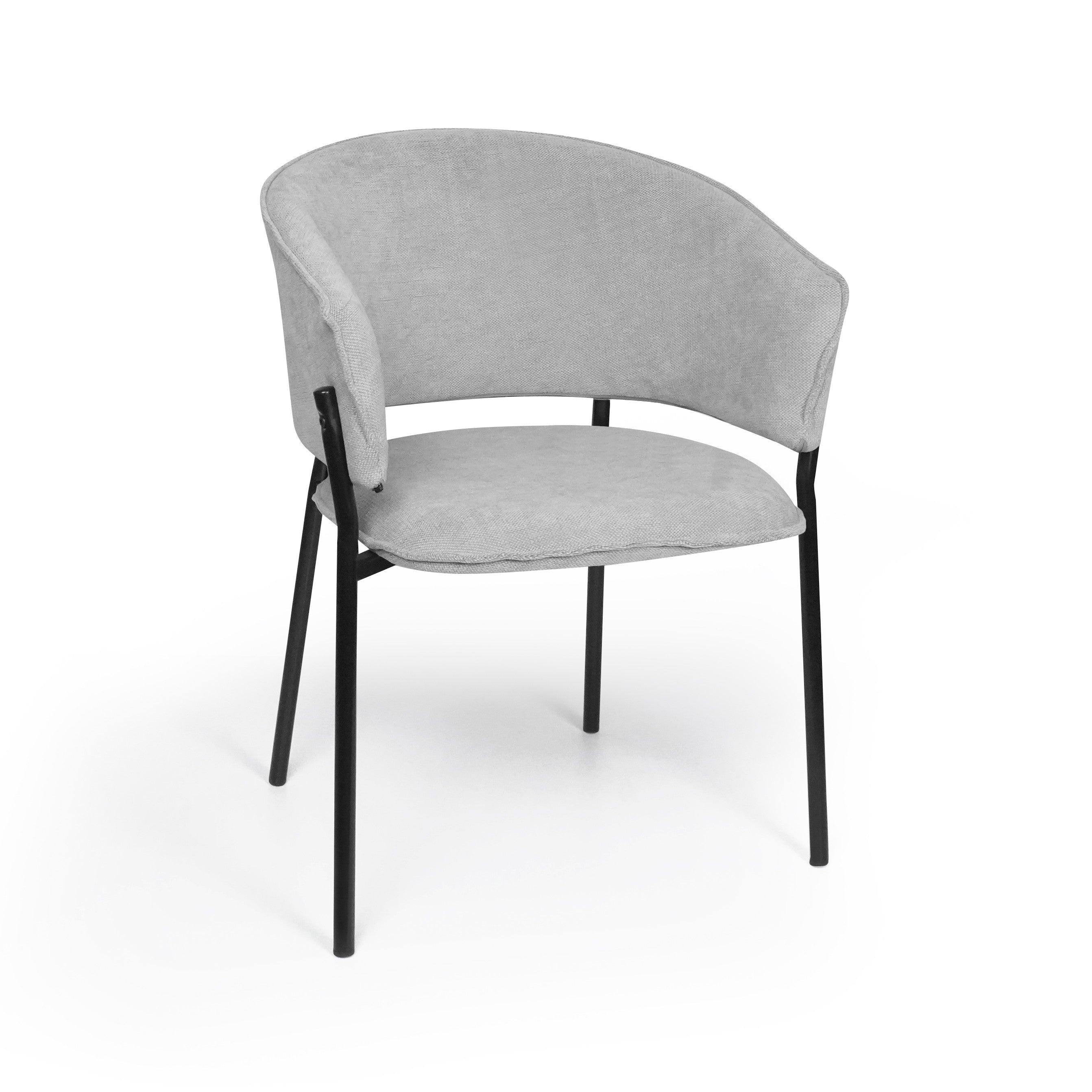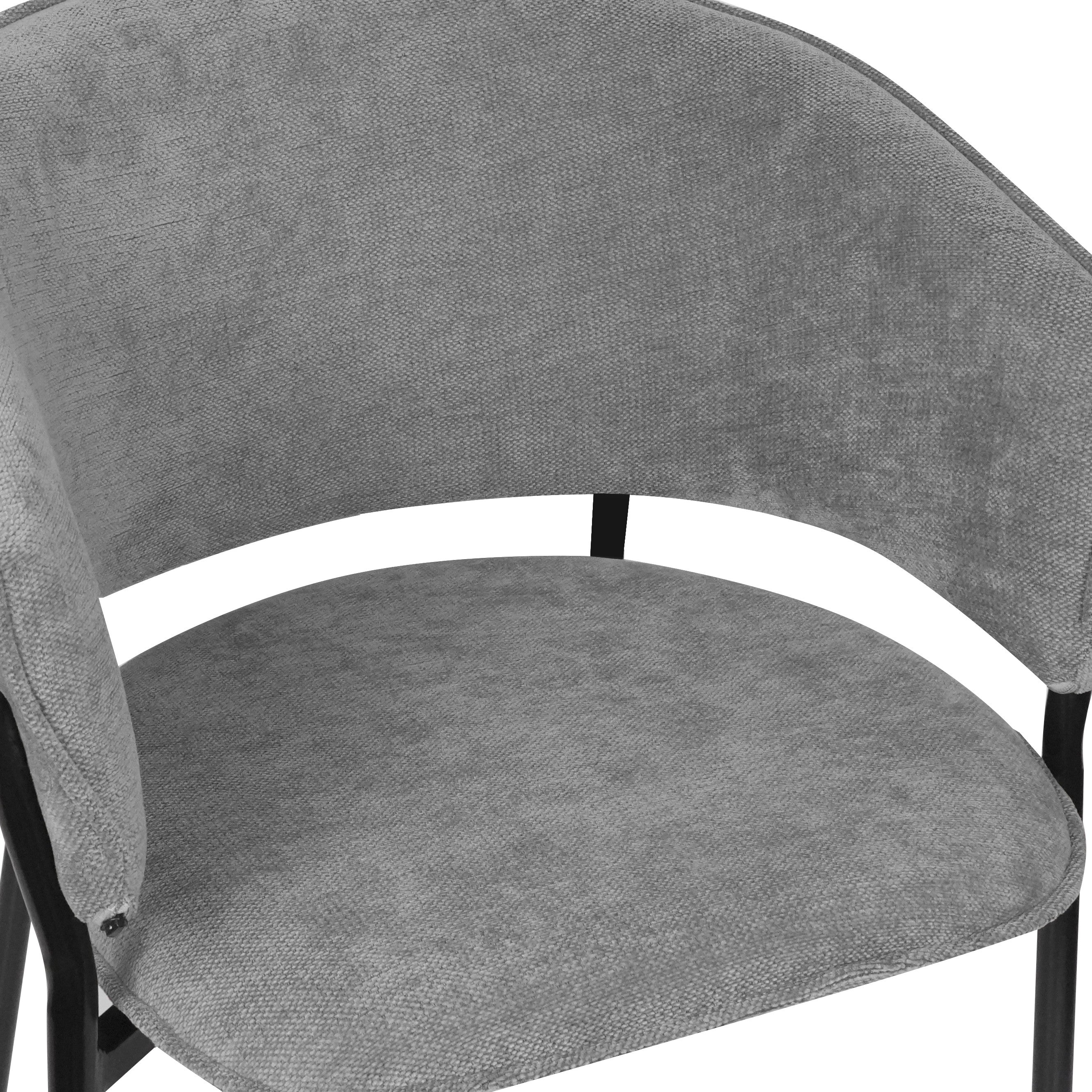 Siedzisko oraz oparcie są miękko tapicerowane, co zapewnia wysoki komfort podczas codziennego użytkowania. Charakterystyczne, półokrągłe oparcie delikatnie otula plecy, a zintegrowane podłokietniki zwiększają wygodę siedzenia i pozwalają na naturalne ułożenie ramion.