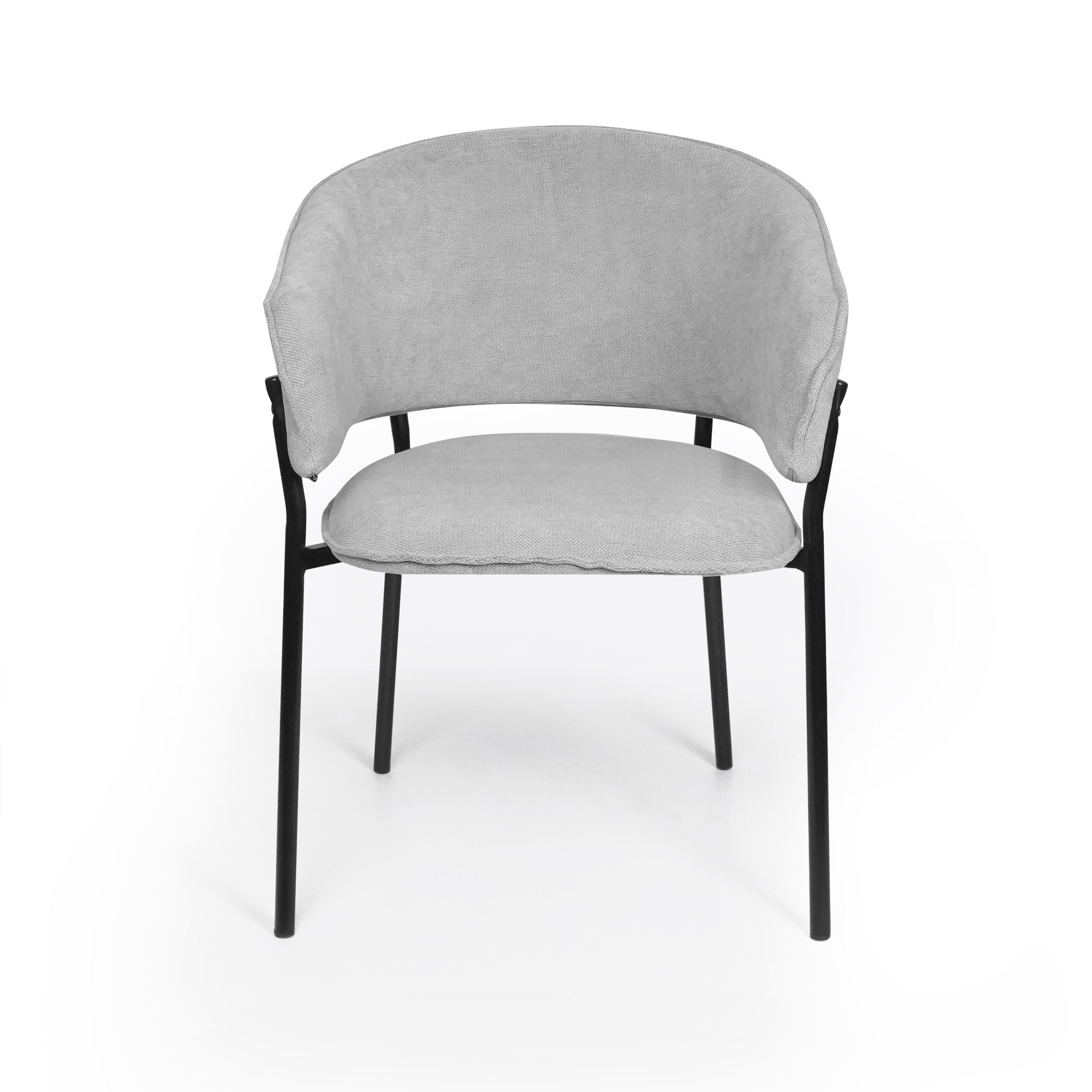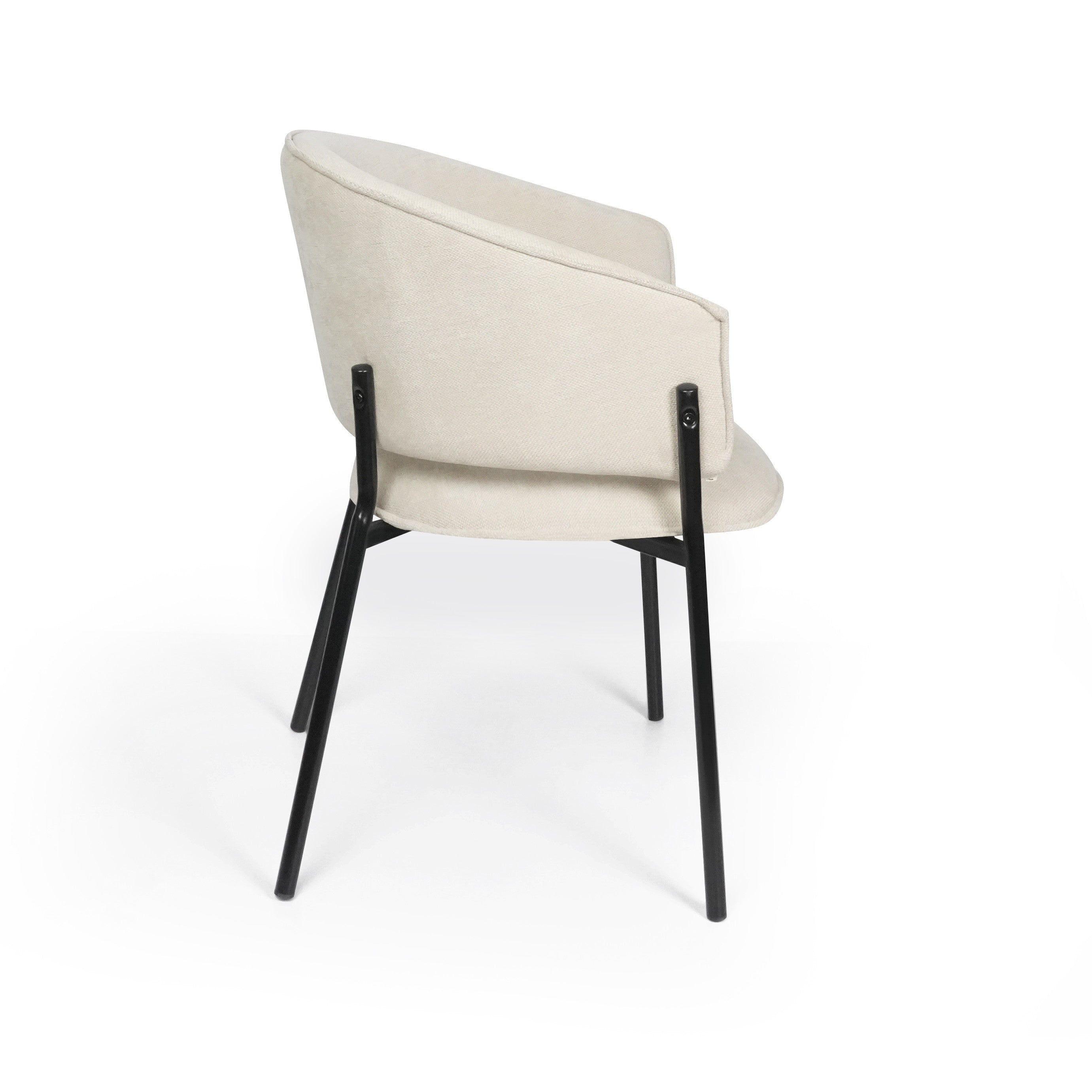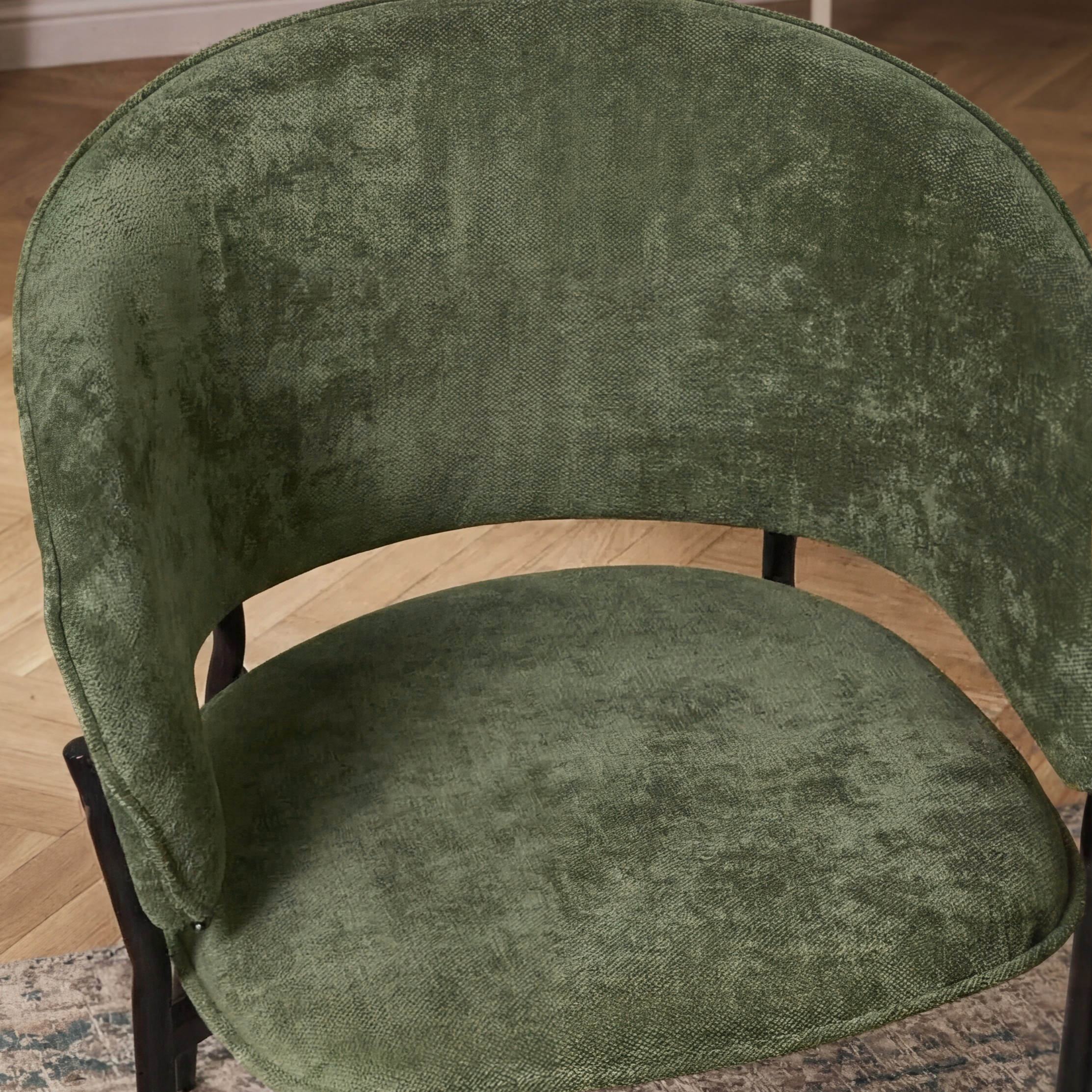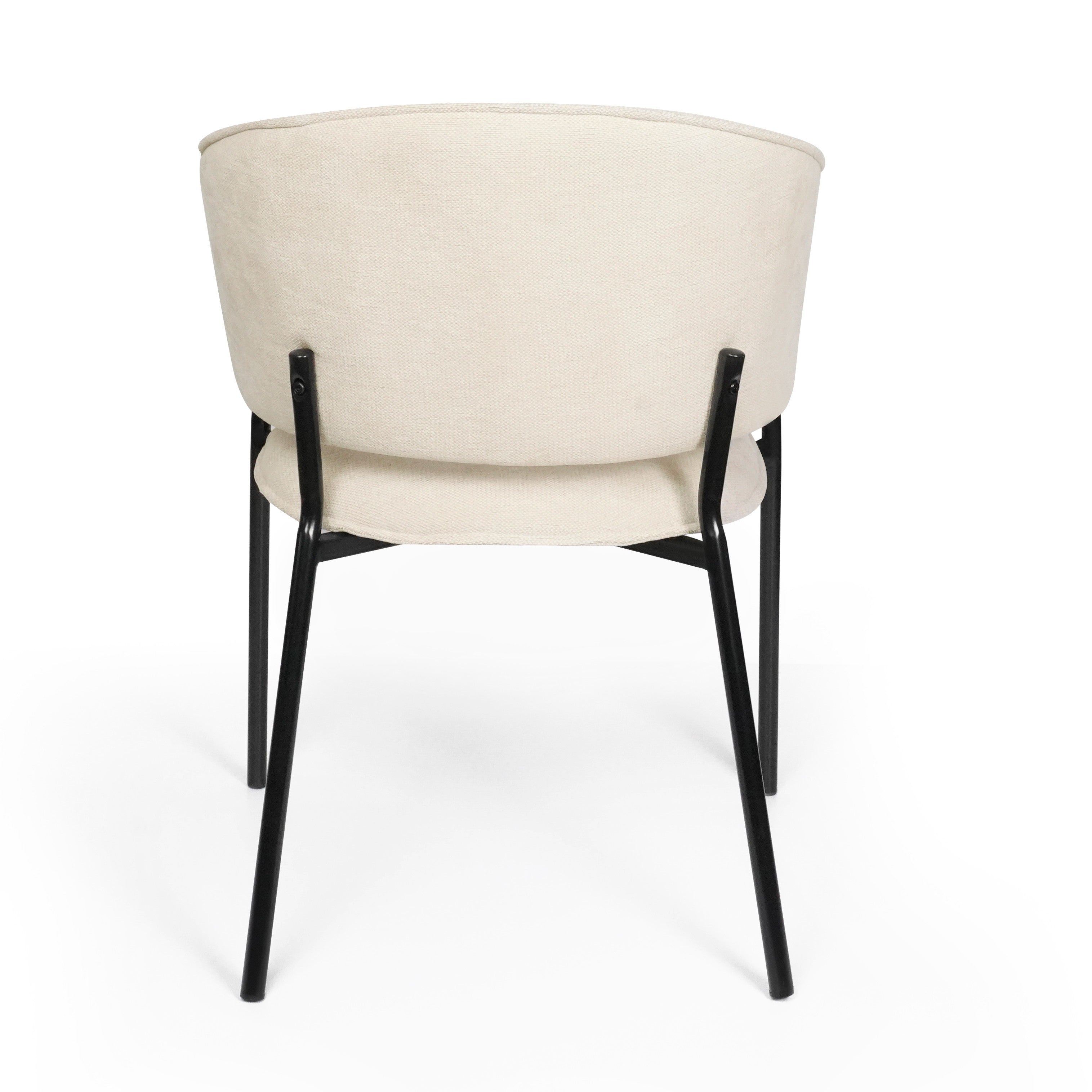 Siedzisko oraz oparcie są miękko tapicerowane, co zapewnia wysoki komfort podczas codziennego użytkowania. Charakterystyczne, półokrągłe oparcie delikatnie otula plecy, a zintegrowane podłokietniki zwiększają wygodę siedzenia i pozwalają na naturalne ułożenie ramion.