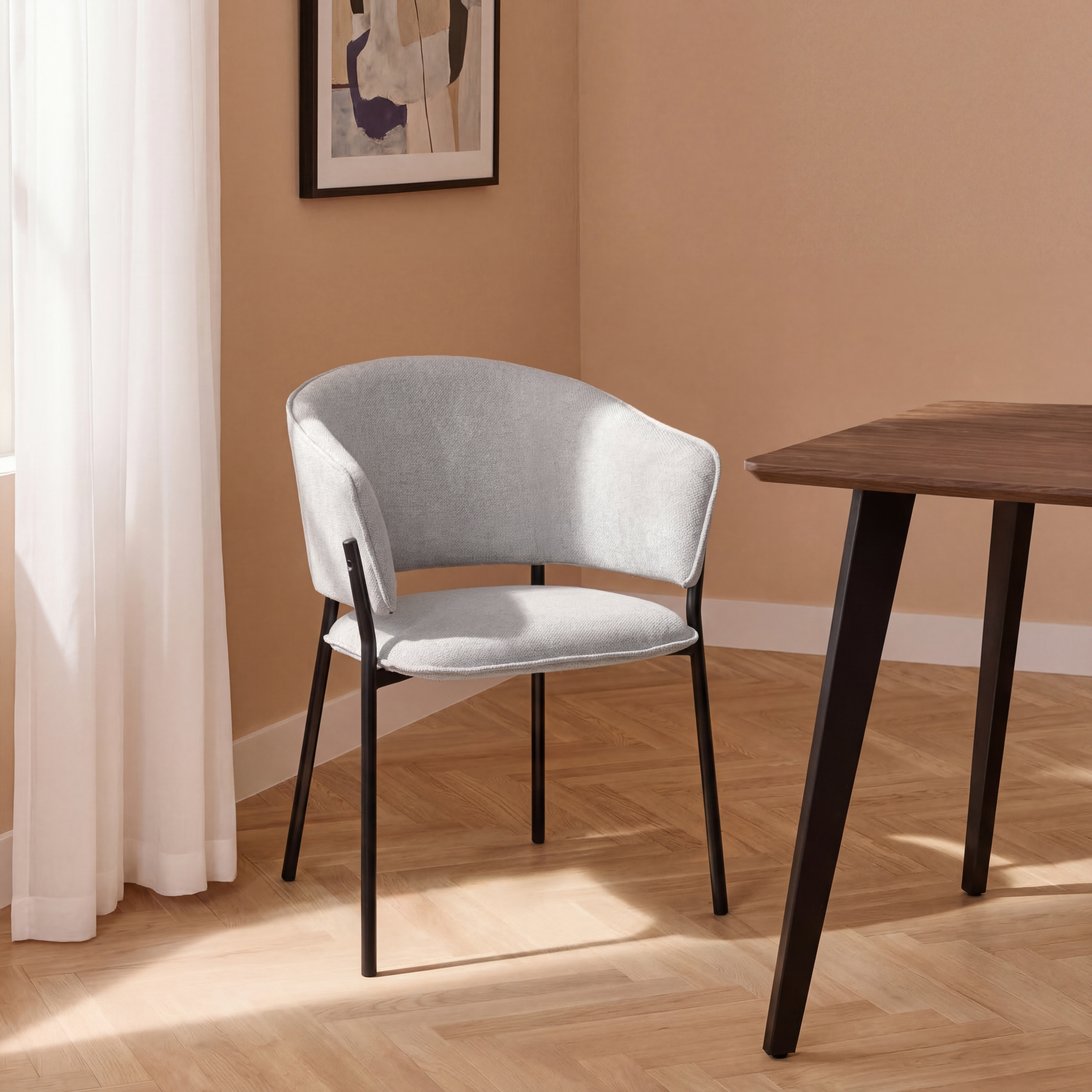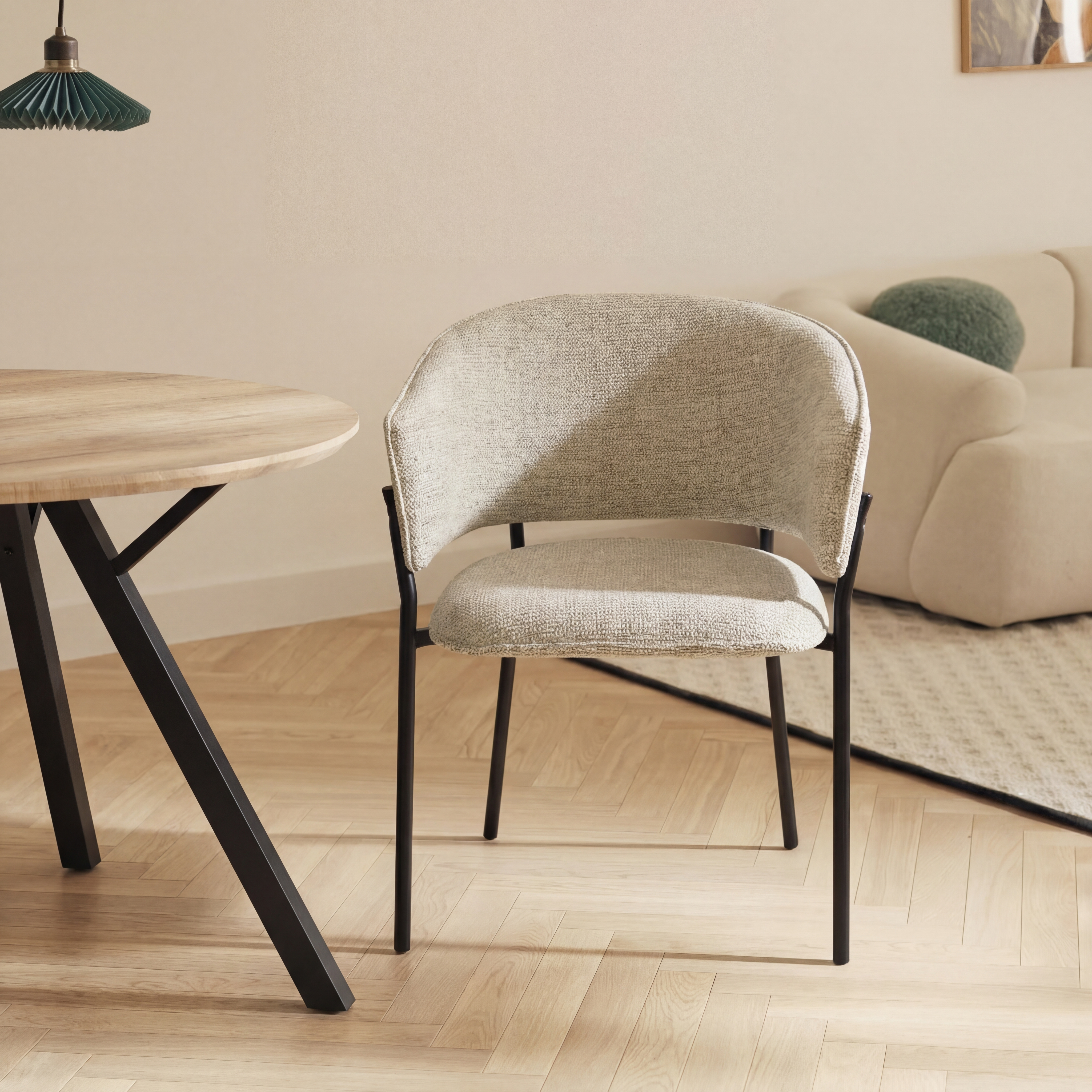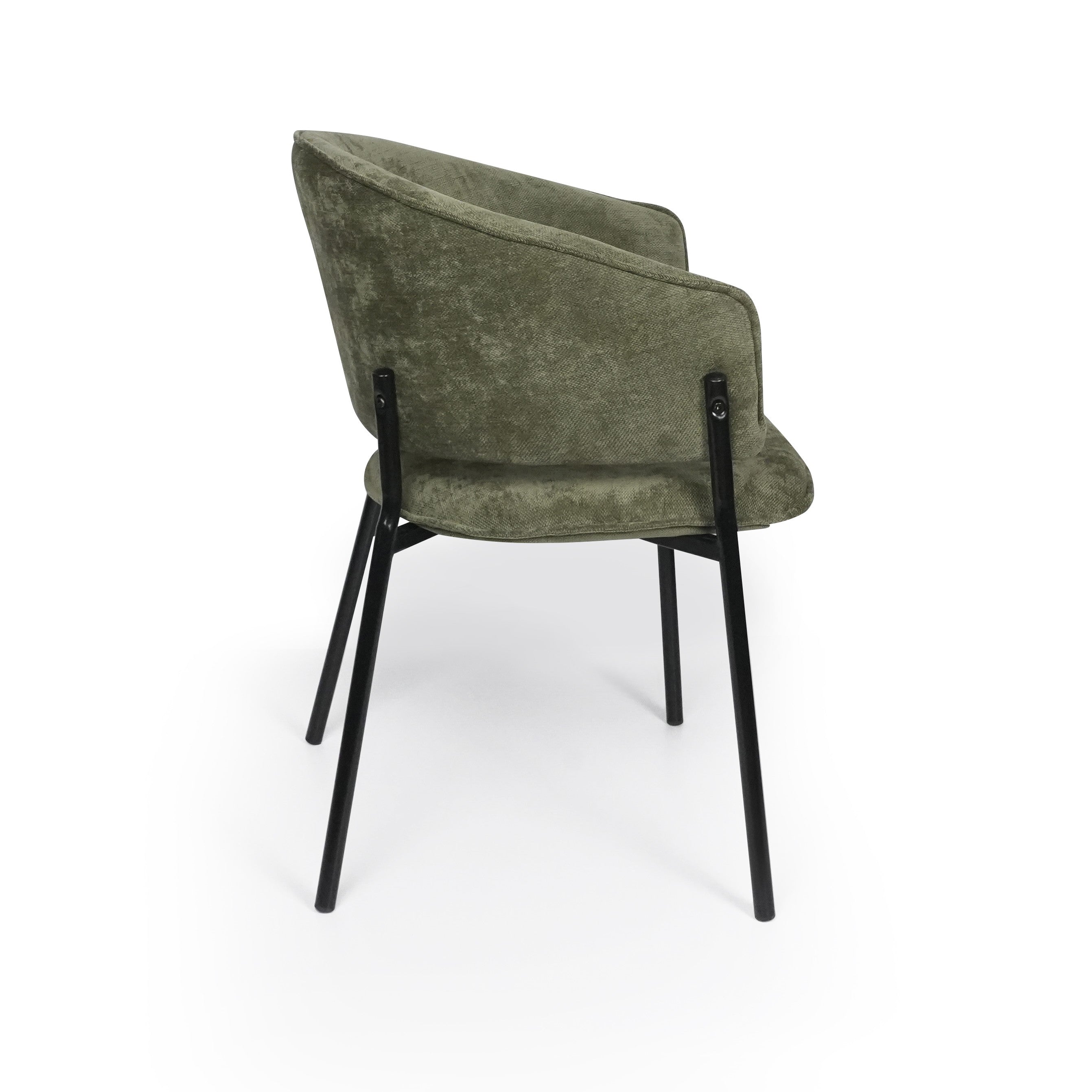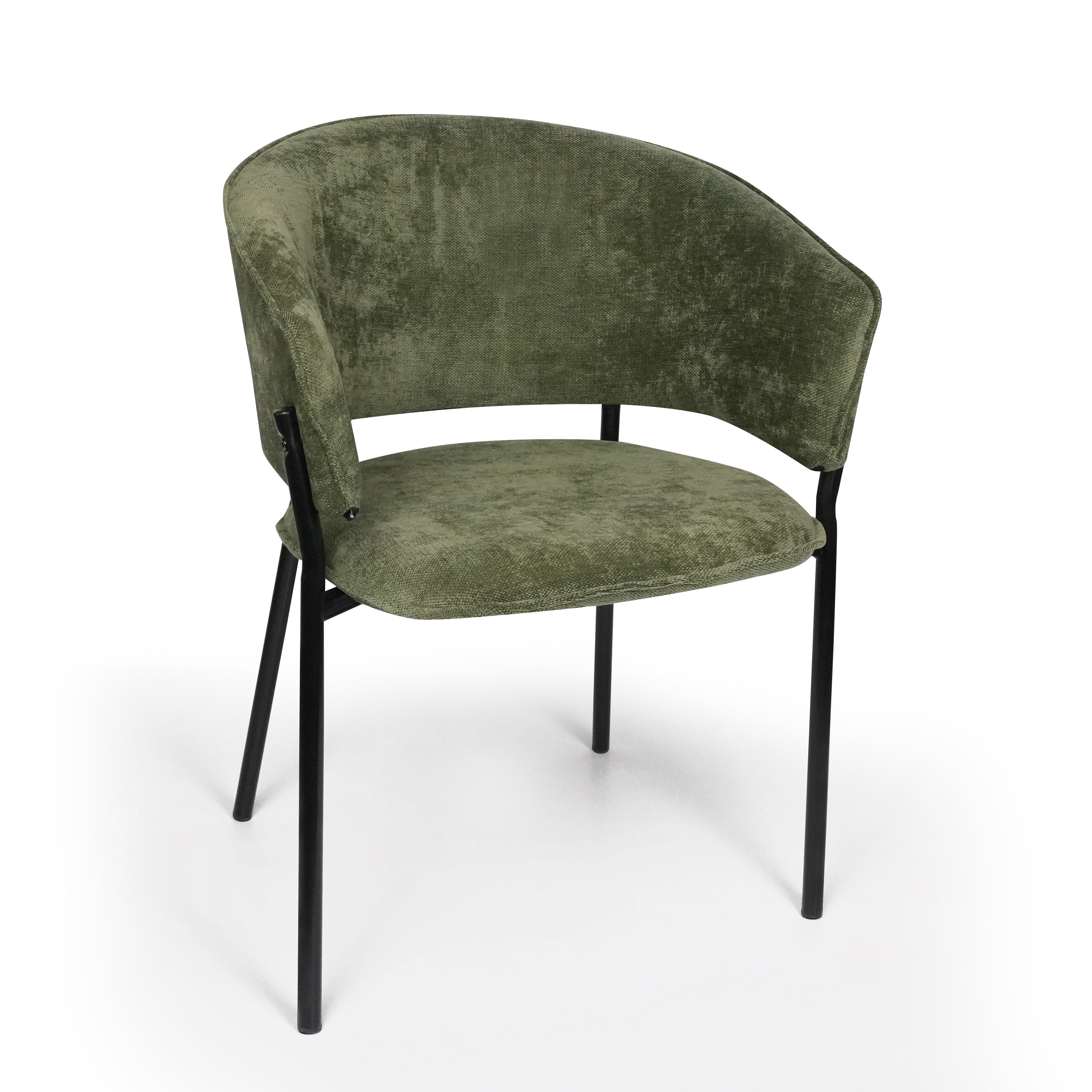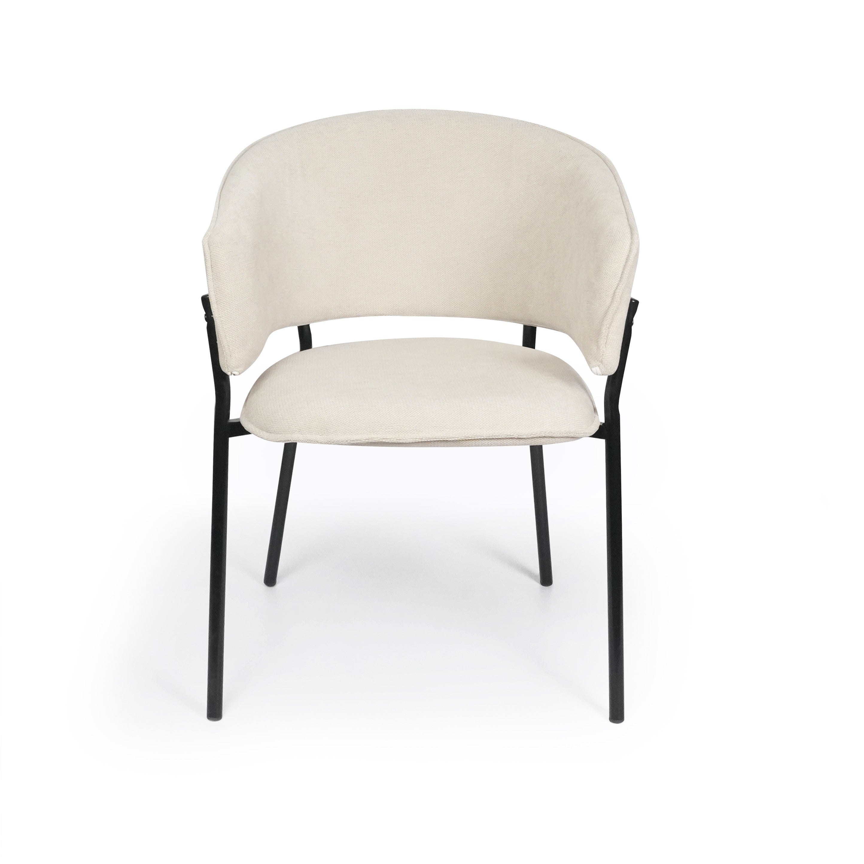 Siedzisko oraz oparcie są miękko tapicerowane, co zapewnia wysoki komfort podczas codziennego użytkowania. Charakterystyczne, półokrągłe oparcie delikatnie otula plecy, a zintegrowane podłokietniki zwiększają wygodę siedzenia i pozwalają na naturalne ułożenie ramion.