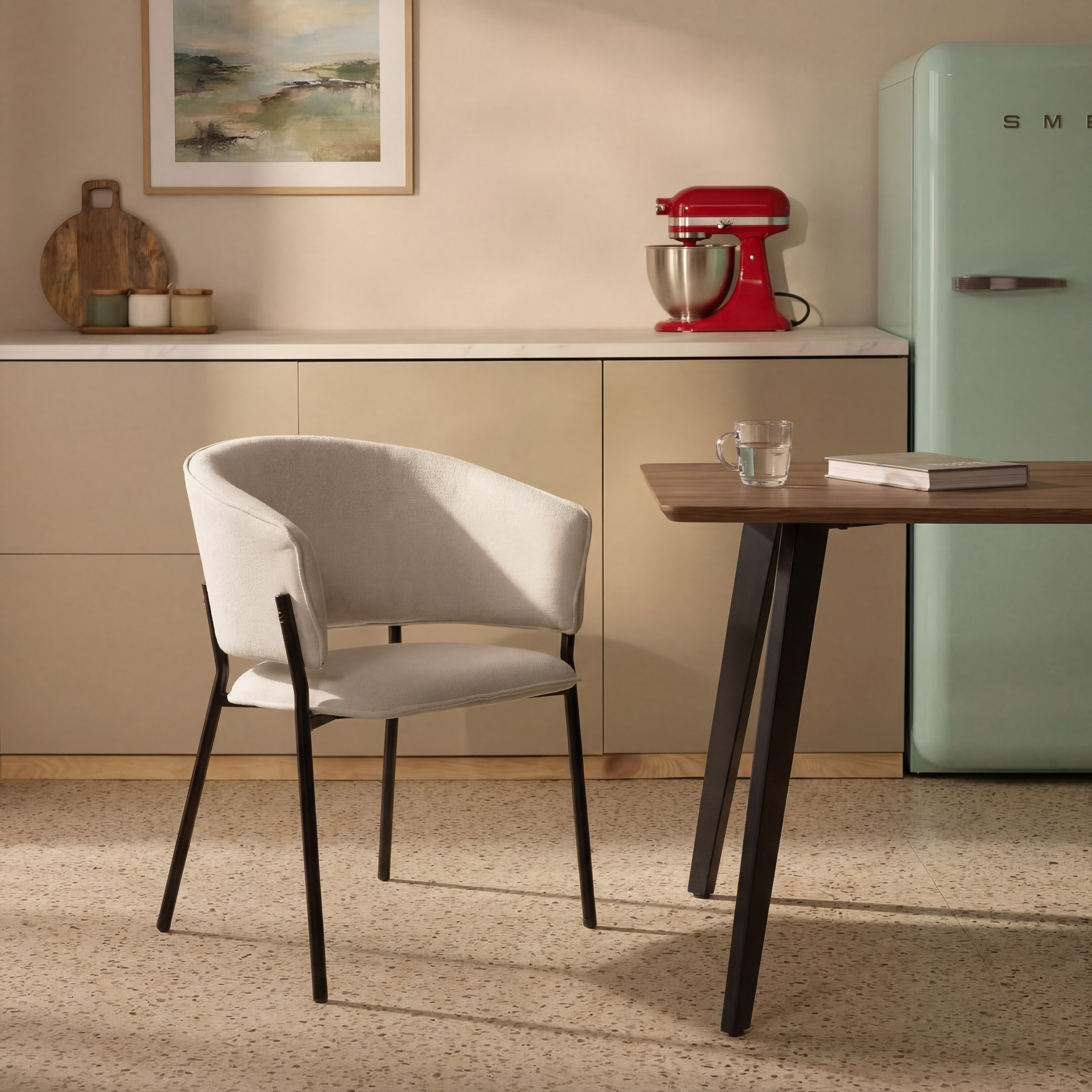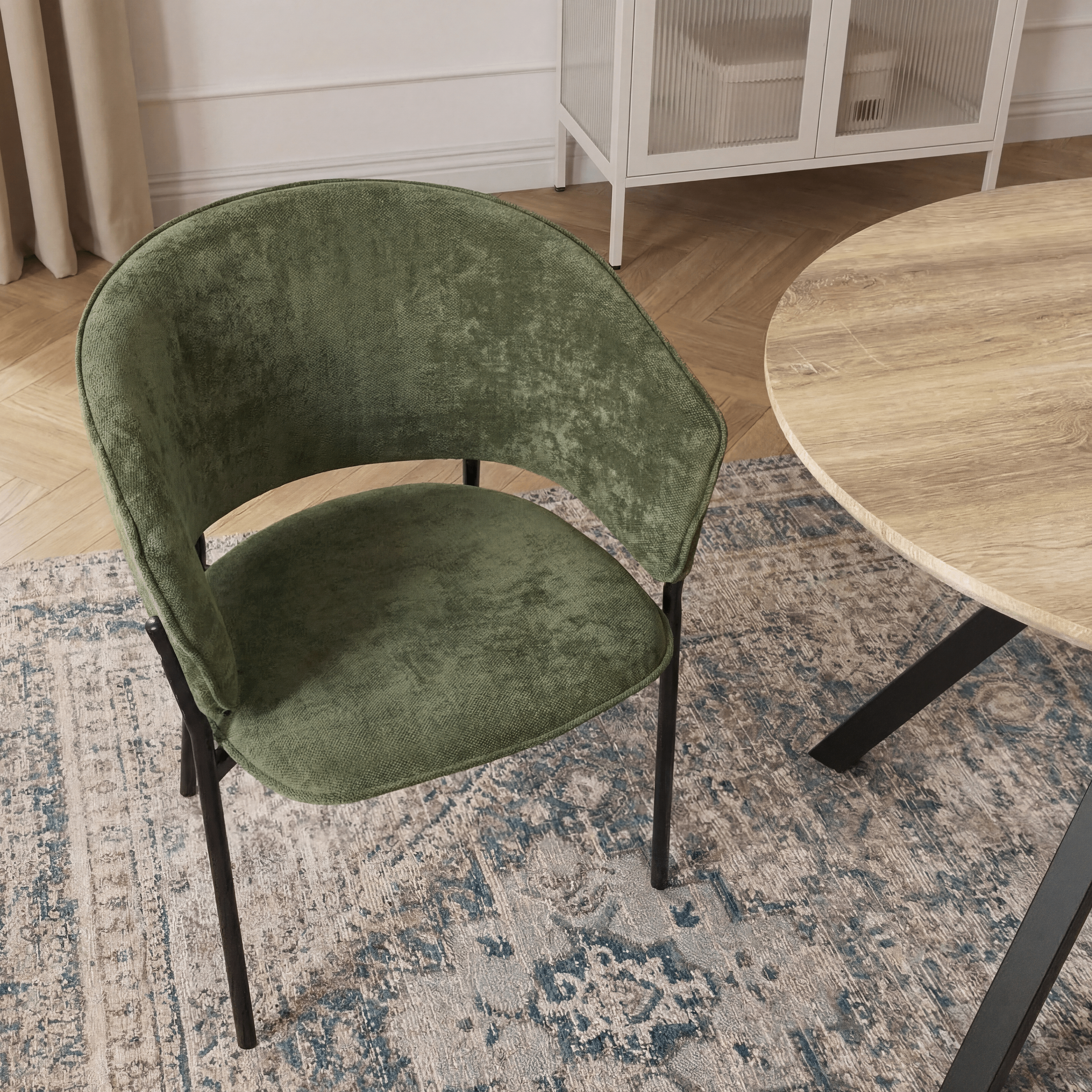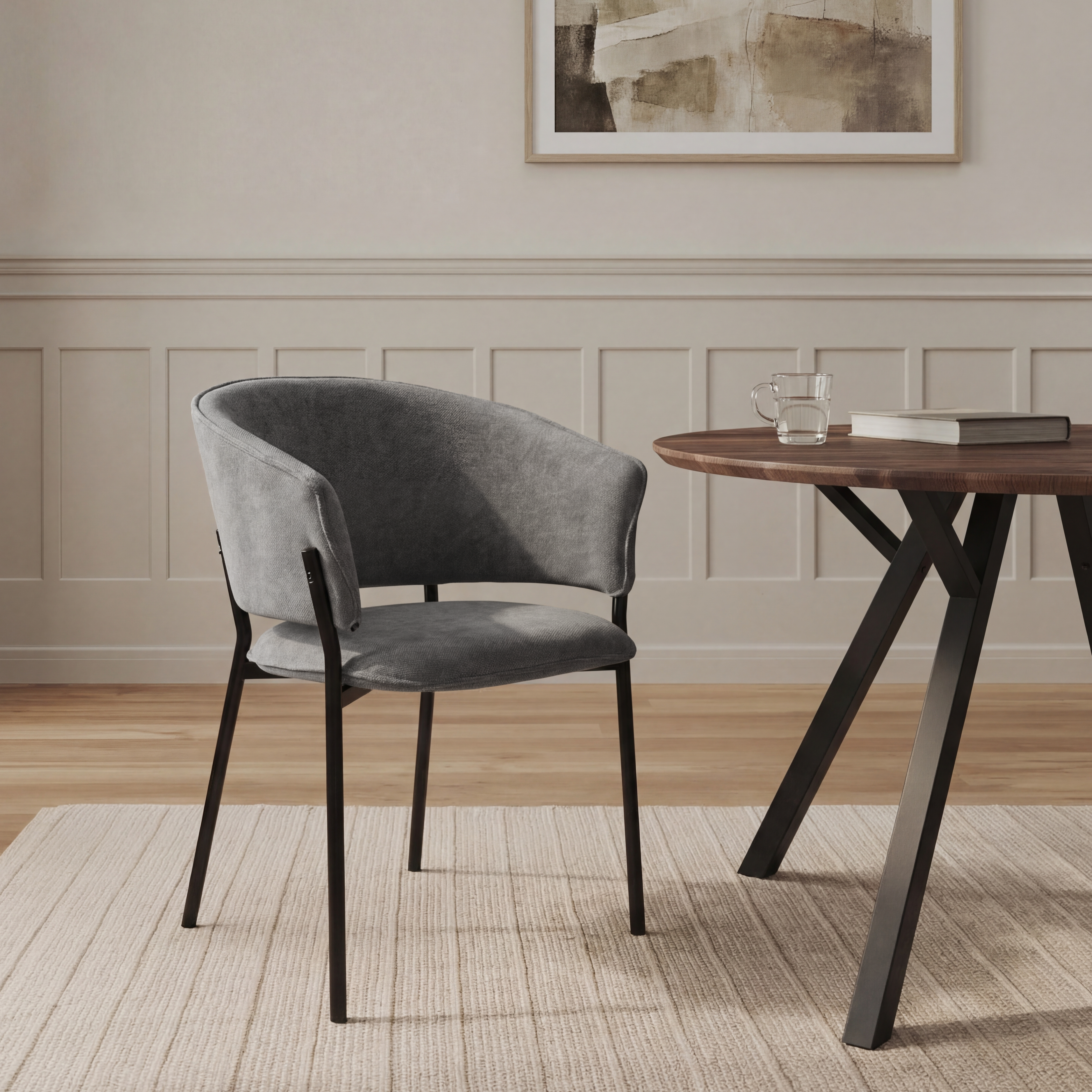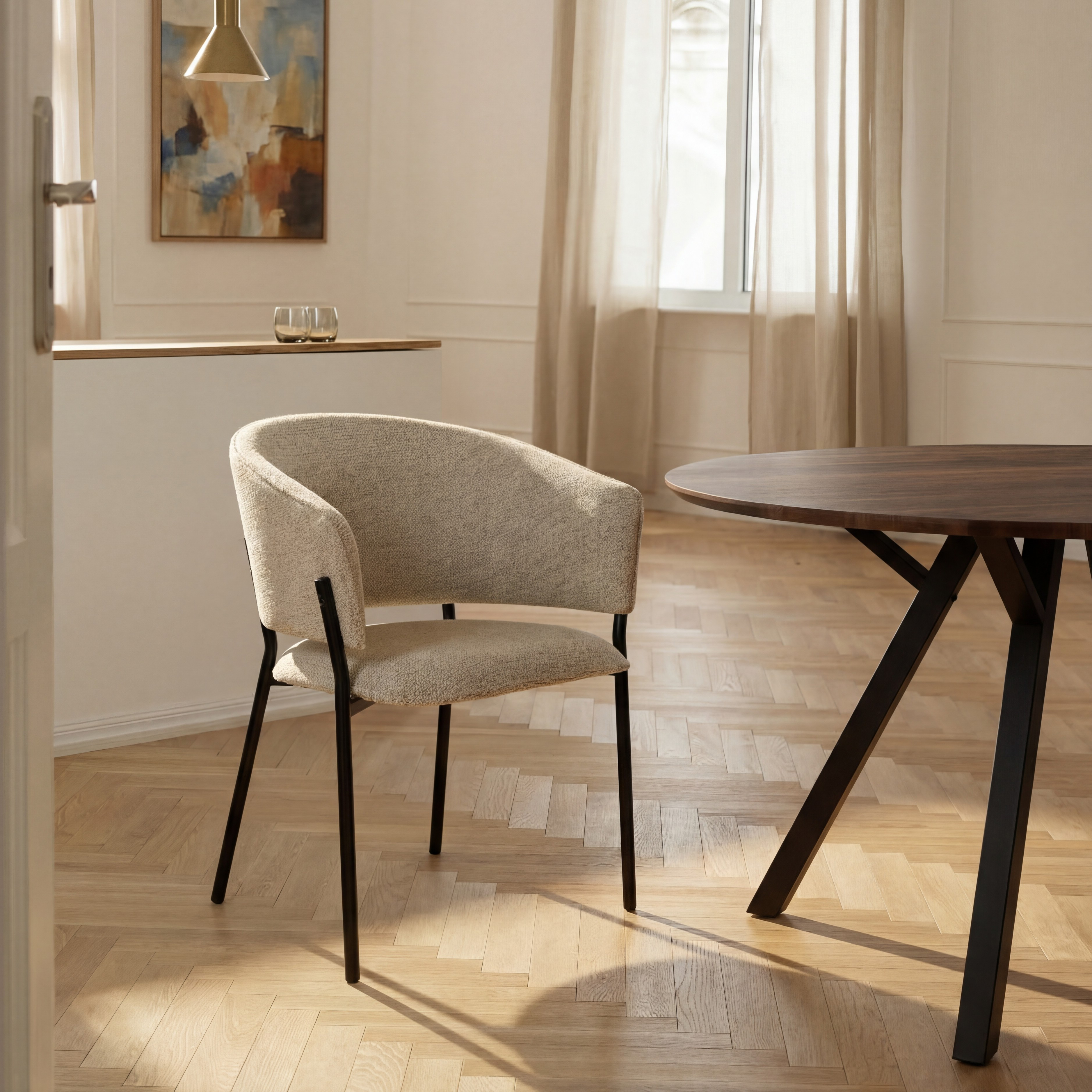 Siedzisko oraz oparcie są miękko tapicerowane, co zapewnia wysoki komfort podczas codziennego użytkowania. Charakterystyczne, półokrągłe oparcie delikatnie otula plecy, a zintegrowane podłokietniki zwiększają wygodę siedzenia i pozwalają na naturalne ułożenie ramion.