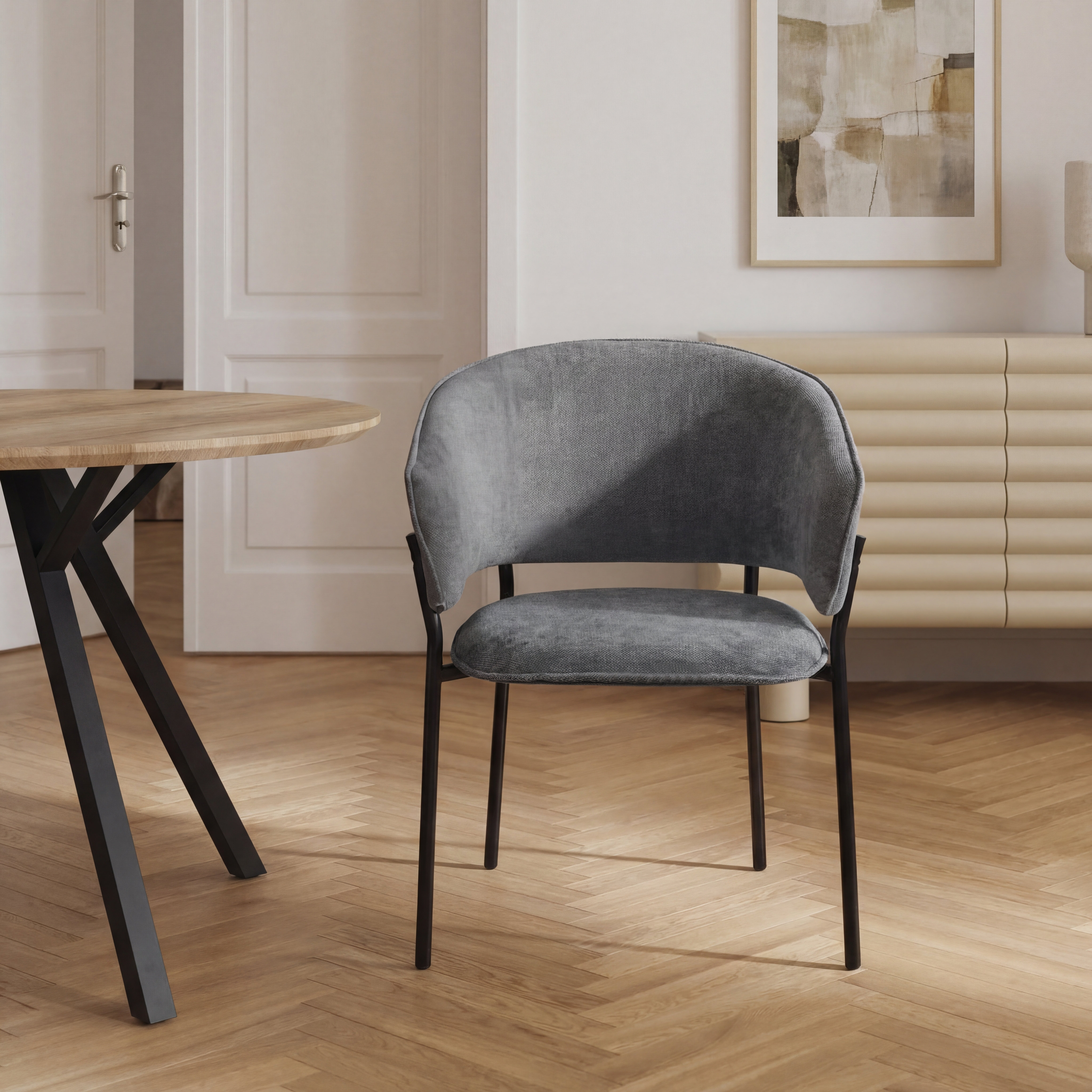 Nowoczesne krzesło do jadalni w kolorze ciemnoszarym to praktyczne i stylowe rozwiązanie do współczesnych wnętrz. Uniwersalna kolorystyka nadaje meblowi elegancki charakter i sprawia, że krzesło doskonale komponuje się z różnymi stylami aranżacji – od minimalistycznych po loftowe.