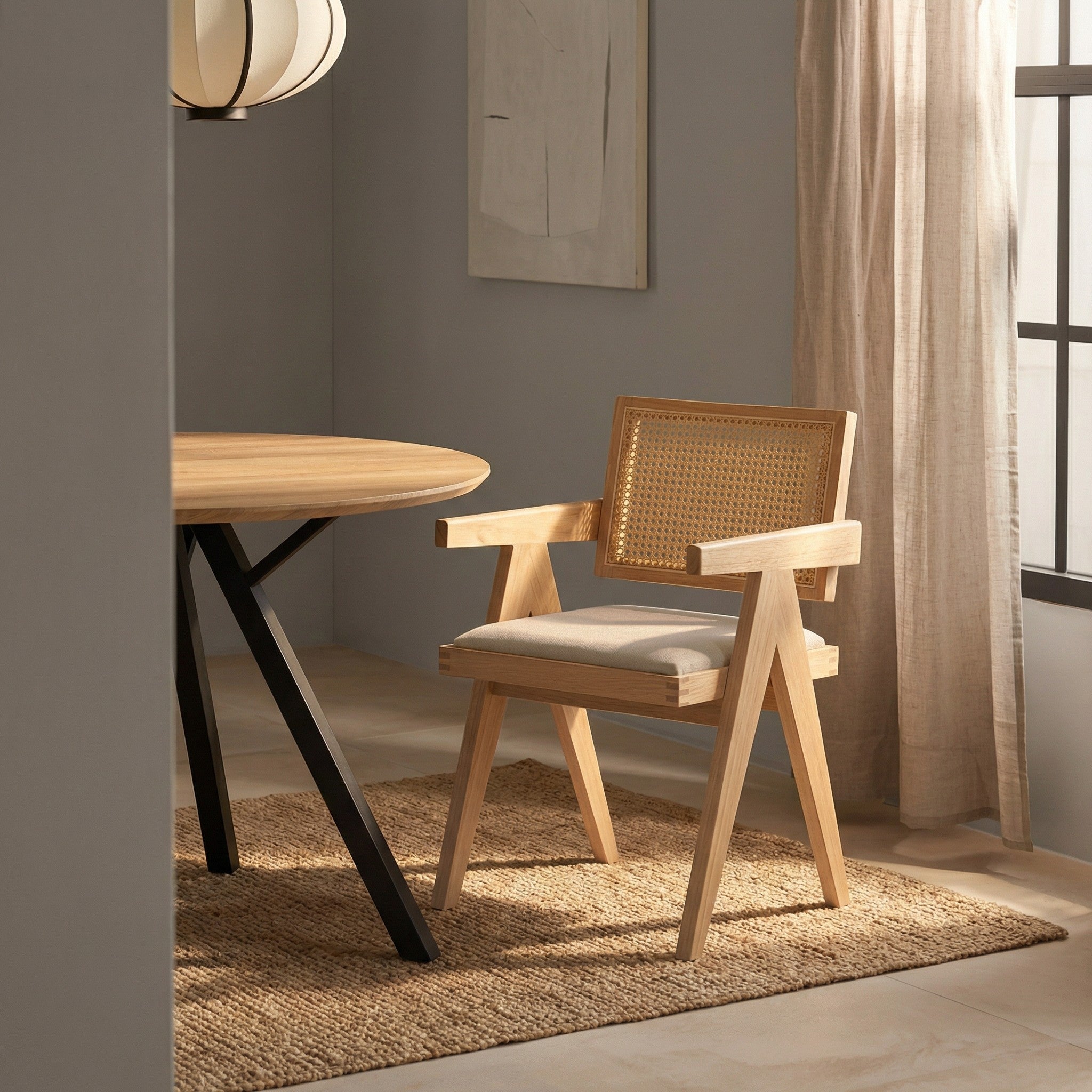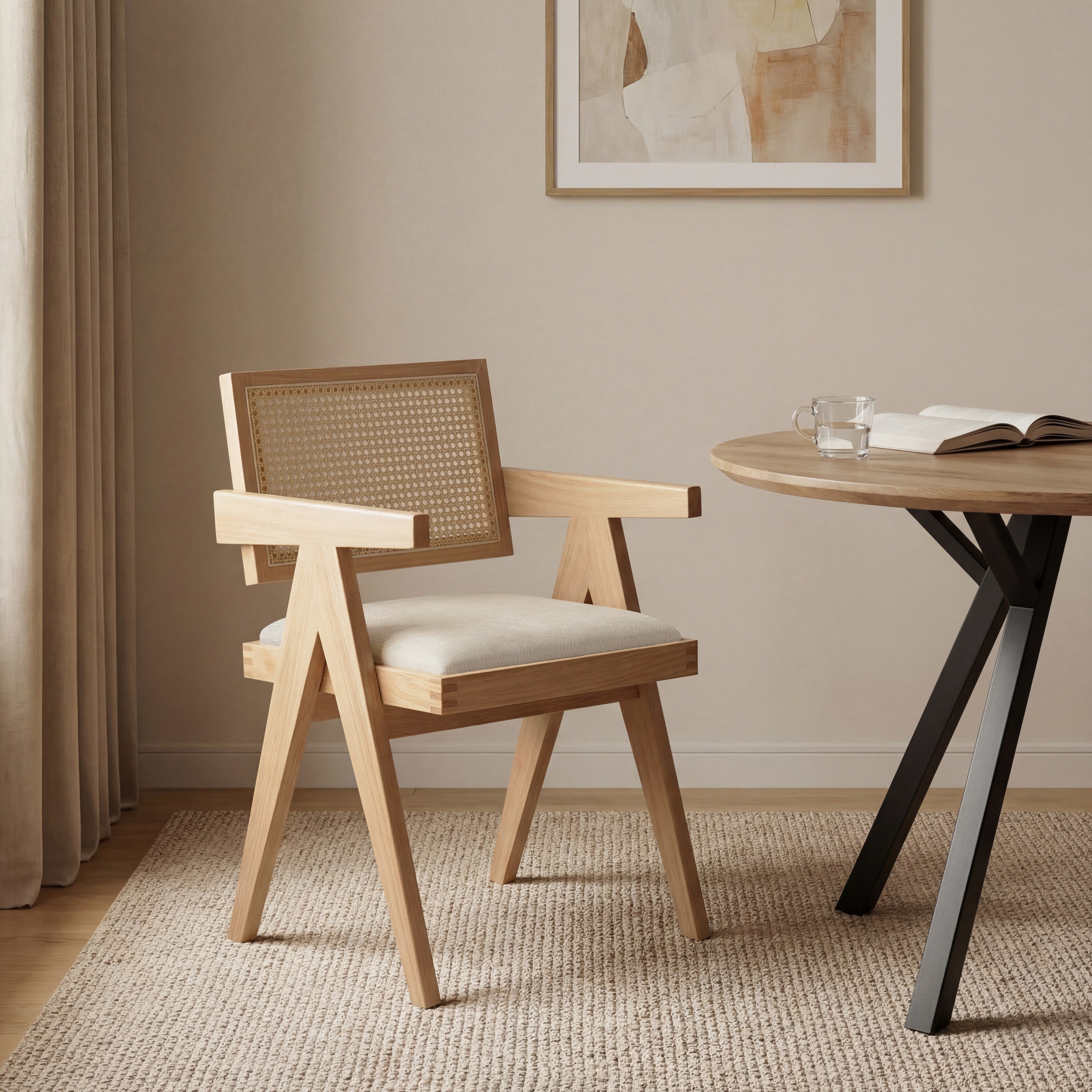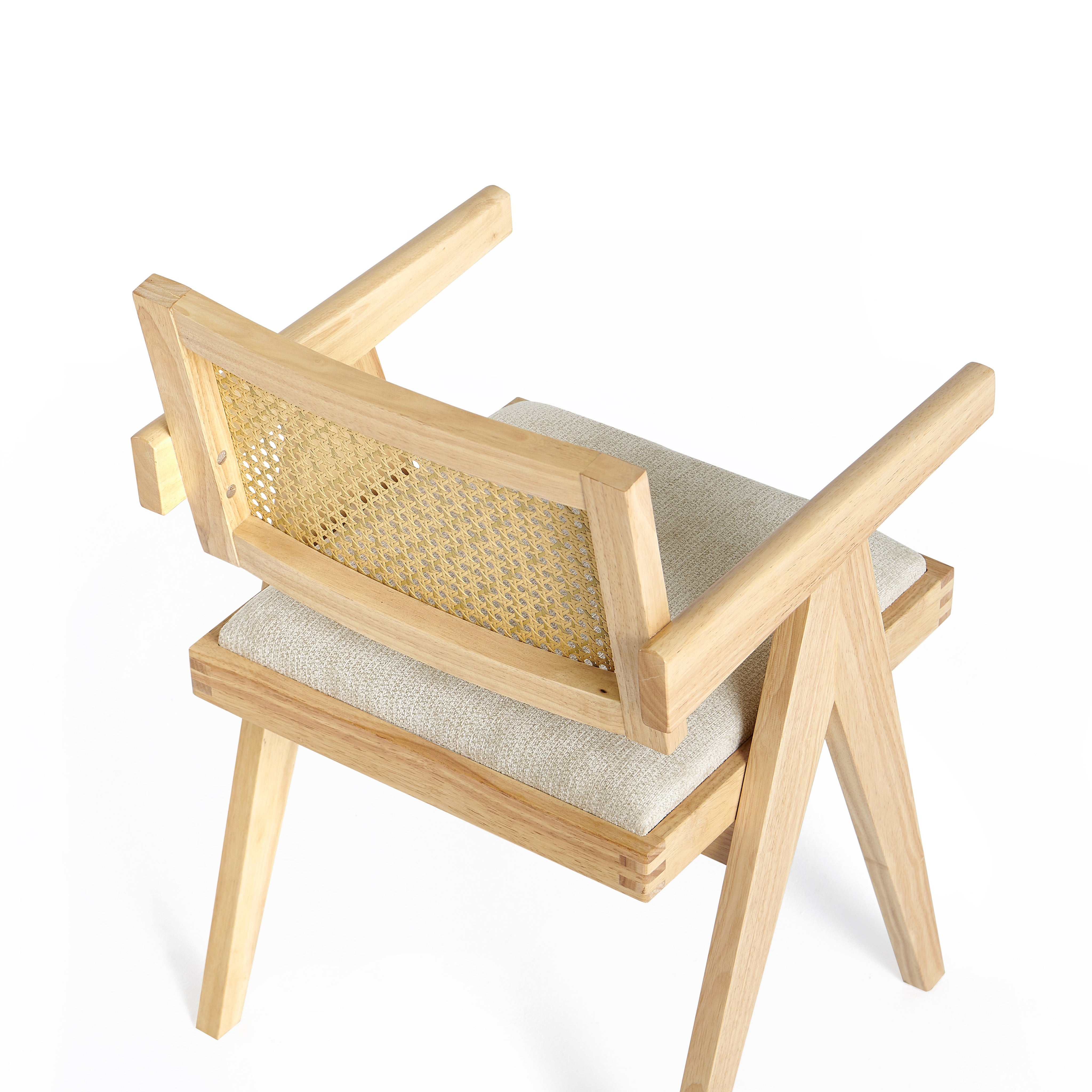 Model wyposażony jest w miękką, tapicerowaną poduszkę siedziska w kolorze jasnobeżowym, która zapewnia komfort podczas codziennego użytkowania. Oparcie wykonane z naturalnej plecionki rattanowej zapewnia dobre podparcie pleców oraz poprawia wentylację, co zwiększa wygodę siedzenia.