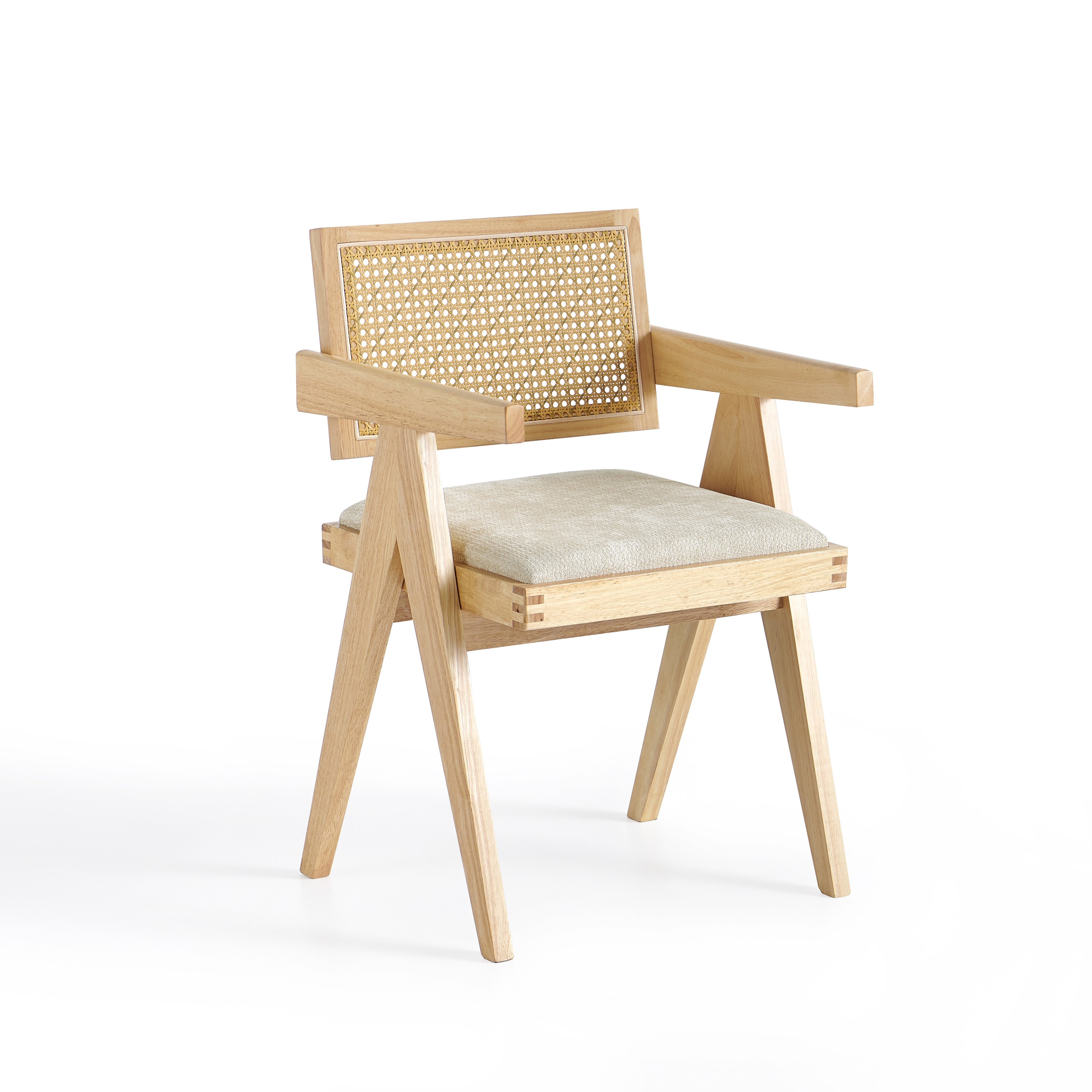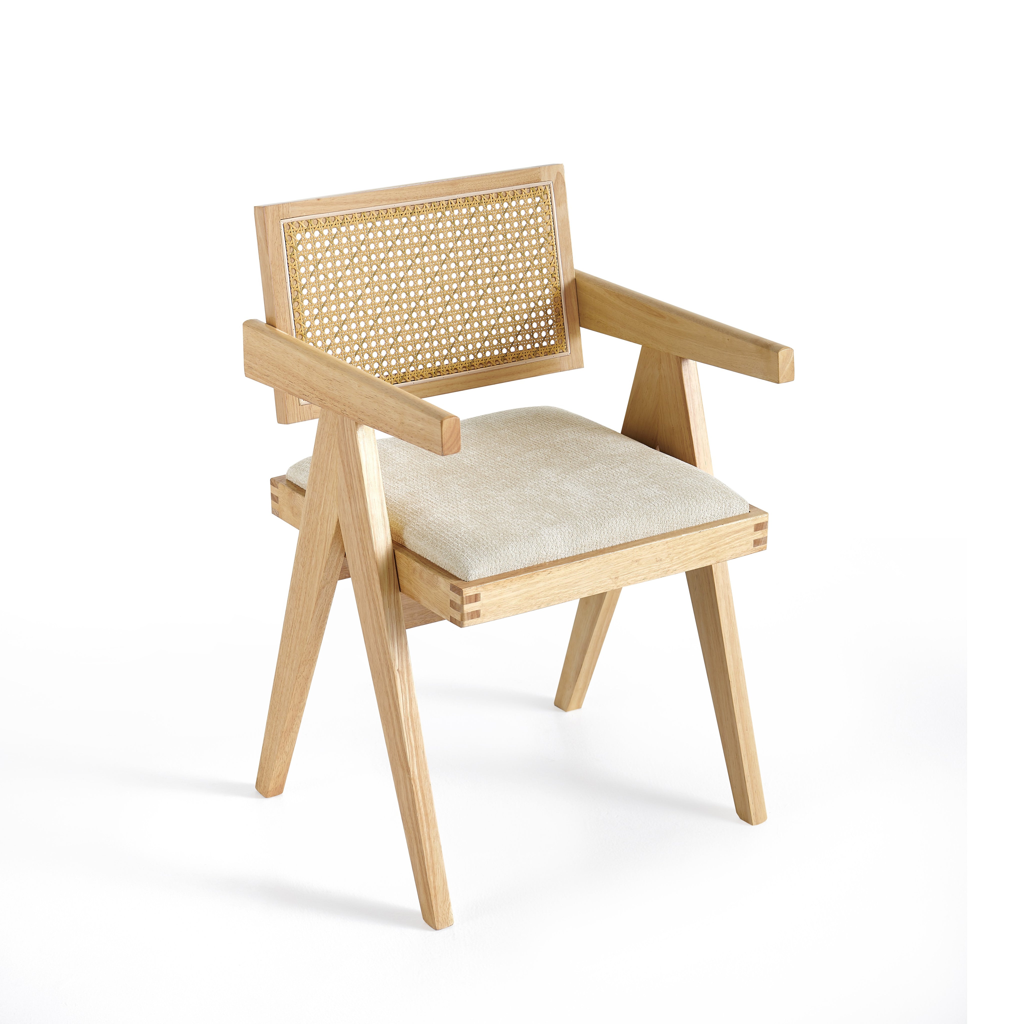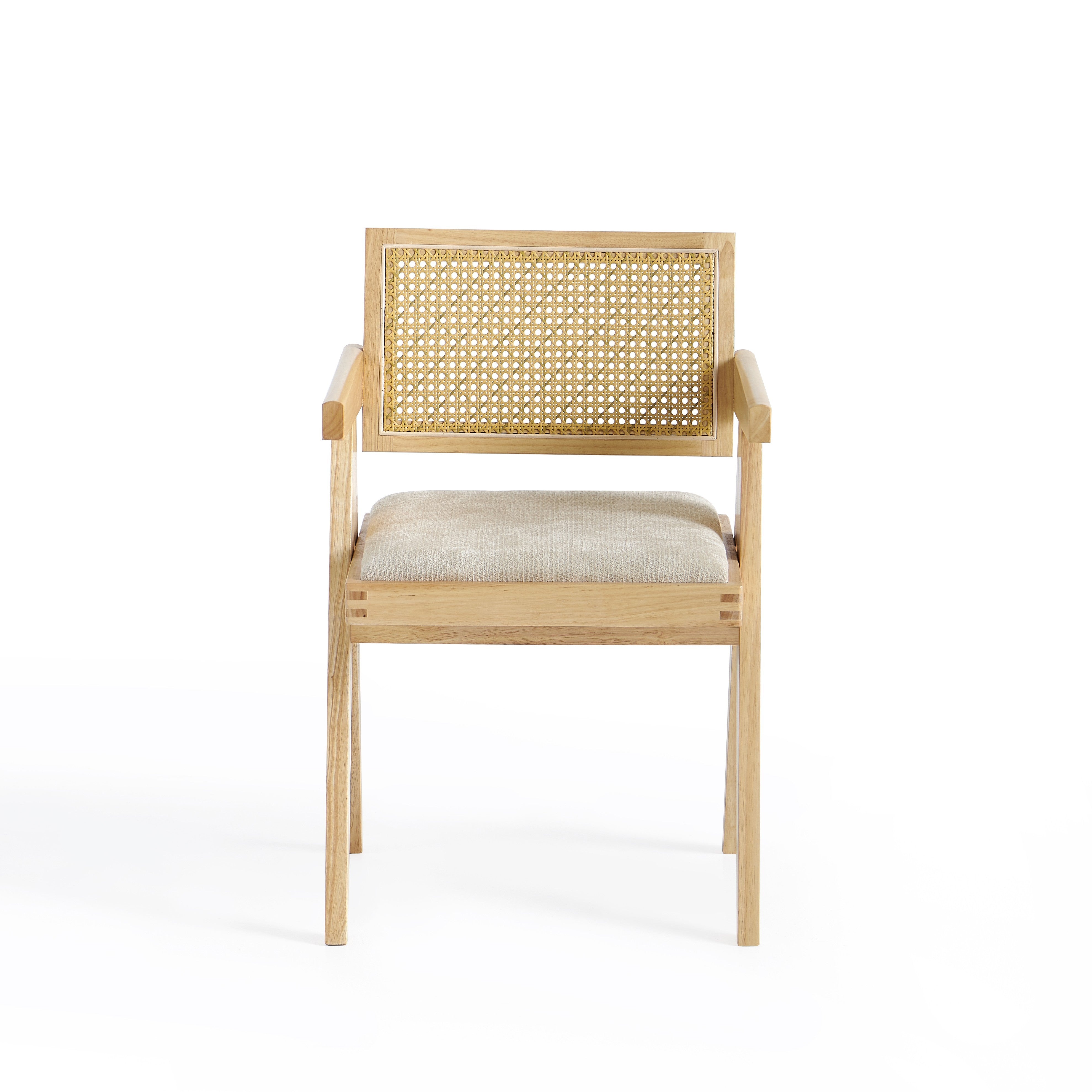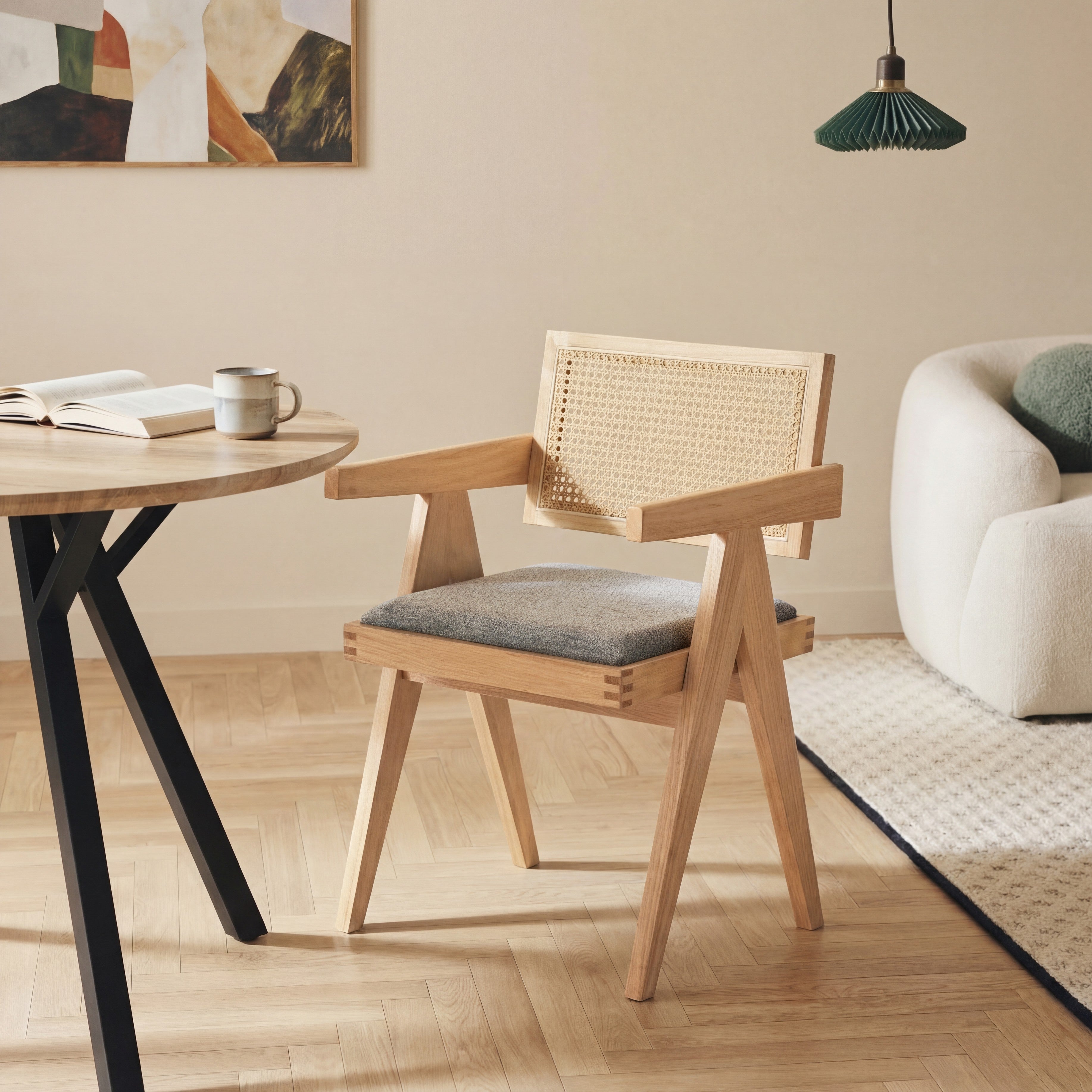 Model wyposażony jest w miękką, tapicerowaną poduszkę siedziska w kolorze jasnobeżowym, która zapewnia komfort podczas codziennego użytkowania. Oparcie wykonane z naturalnej plecionki rattanowej zapewnia dobre podparcie pleców oraz poprawia wentylację, co zwiększa wygodę siedzenia.