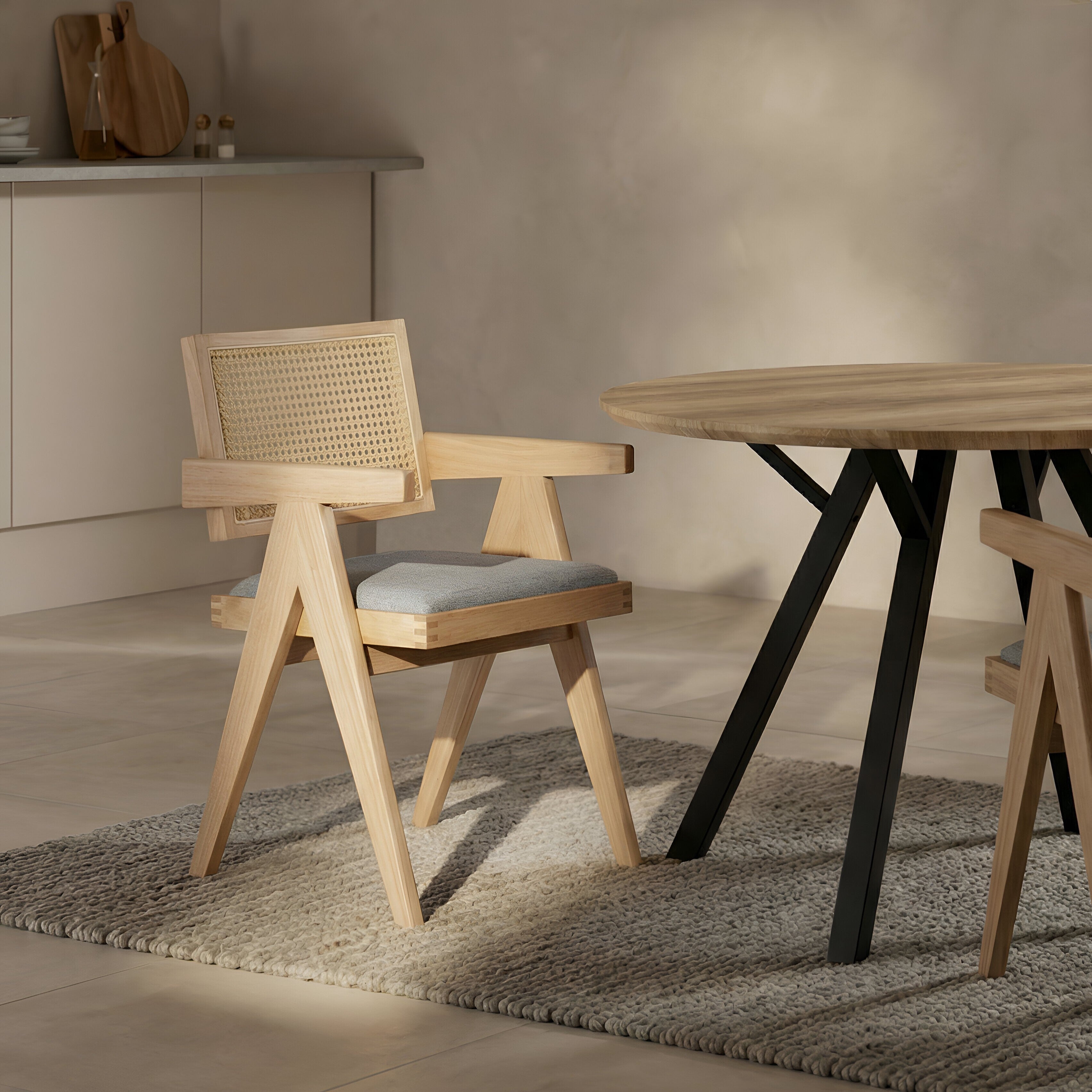 Zintegrowane drewniane podłokietniki podnoszą komfort użytkowania i stabilizują pozycję siedzącą. Solidna konstrukcja z naturalnego drewna oraz staranne połączenia elementów gwarantują trwałość i odporność na codzienne użytkowanie. Krzesło Aether sprawdzi się zarówno w jadalni i kuchni, jak i w restauracjach, kawiarniach czy przestrzeniach hotelowych.