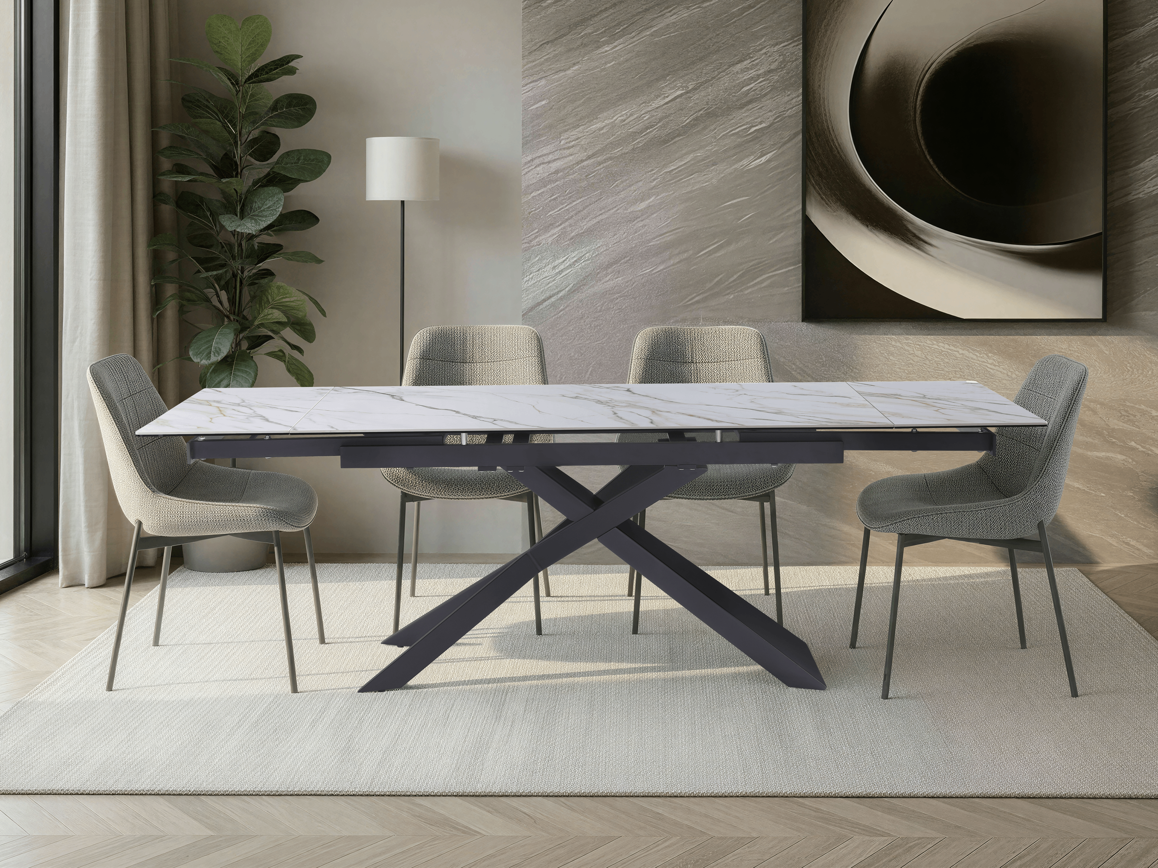 Rozsuwany prostokątny stół jadalny ceramiczny Rapallo łączy nowoczesny design z funkcjonalnością. Ceramiczny blat na hartowanym szkle o efekcie marmuru z unikalnym układem żył sprawia, że każdy egzemplarz jest wyjątkowy. Praktyczny stół do codziennego użytku w jadalni lub kuchni. Wygodna przestrzeń do wspólnych posiłków i spotkań. Ceramika odporna na zarysowania, wysoką temperaturę i plamy - łatwa w utrzymaniu czystości. Nowoczesna konstrukcja ceramiki na hartowanym szkle łączy piękno i wytrzymałość ceramiki z lekkością i bezpieczeństwem szkła hartowanego - stół jest znacznie lżejszy od tradycyjnych stołów ceramicznych, co ułatwia transport i przestawianie. Rozsuwany mechanizm pozwala rozłożyć stół z 160cm do 240cm. Wystarczy przetrzeć wilgotną szmatką - ceramiczny blat zachowa piękny wygląd na lata. Solidna stalowa konstrukcja zapewnia stabilność i długowieczność na lata użytkowania.