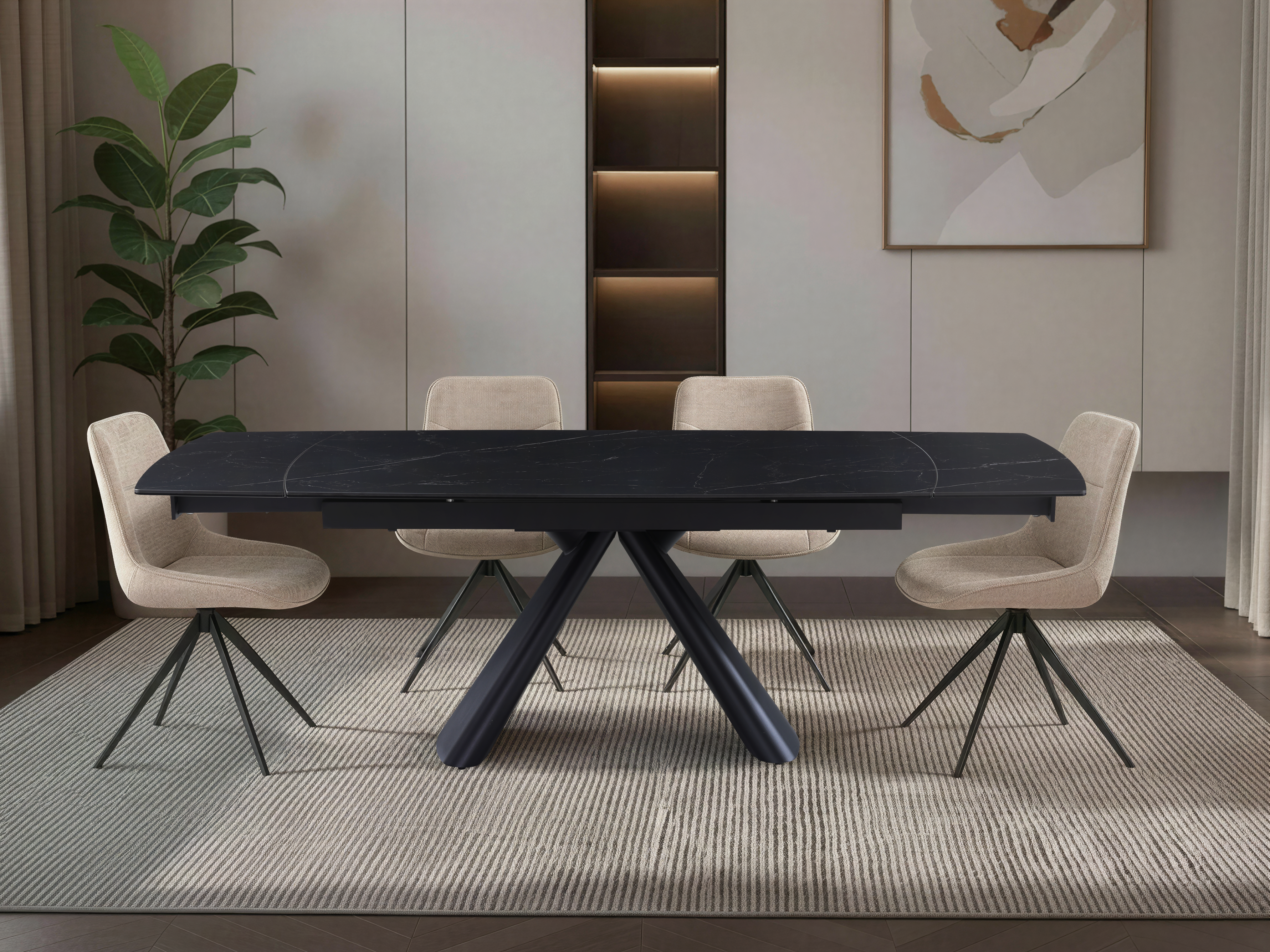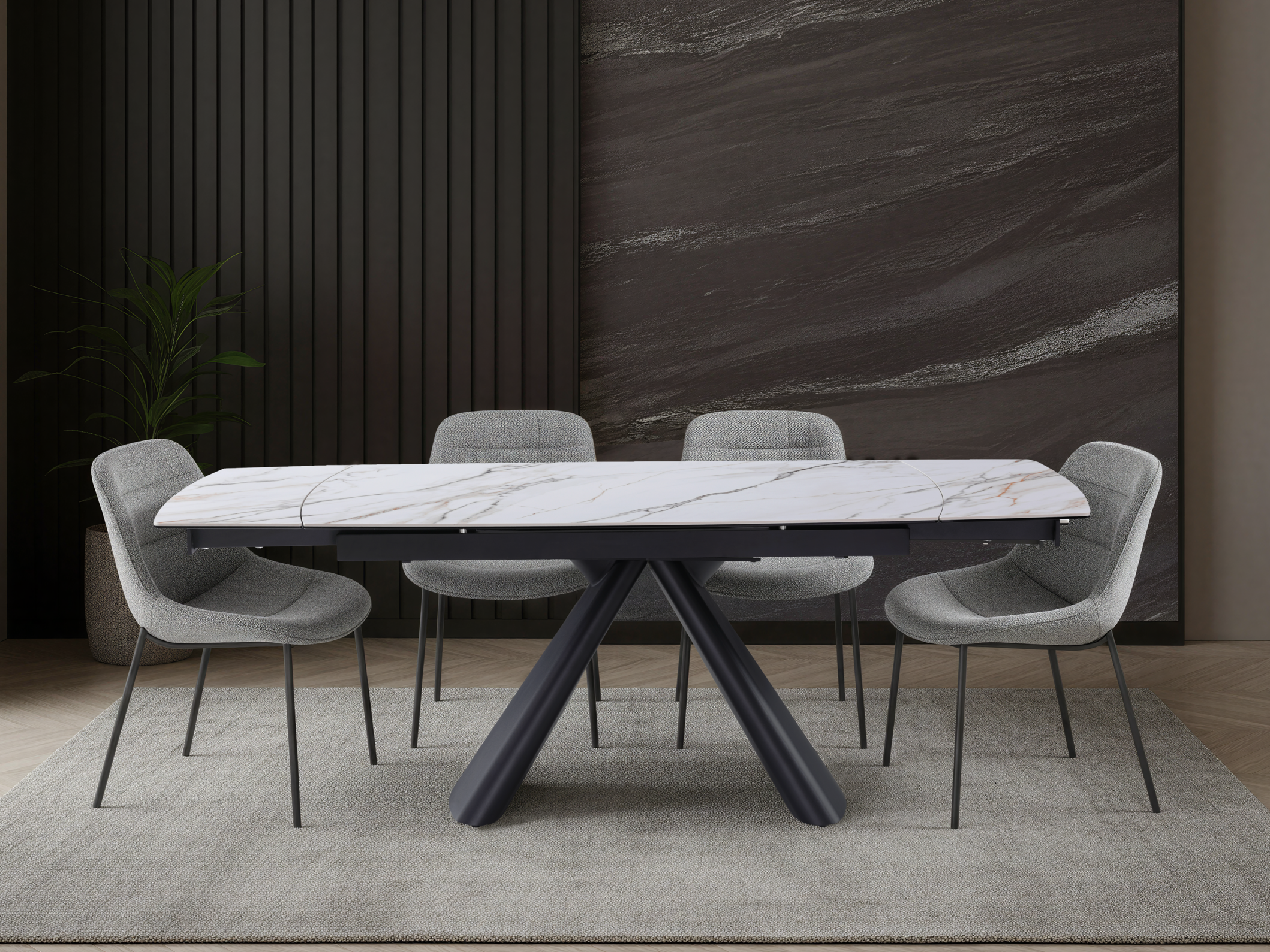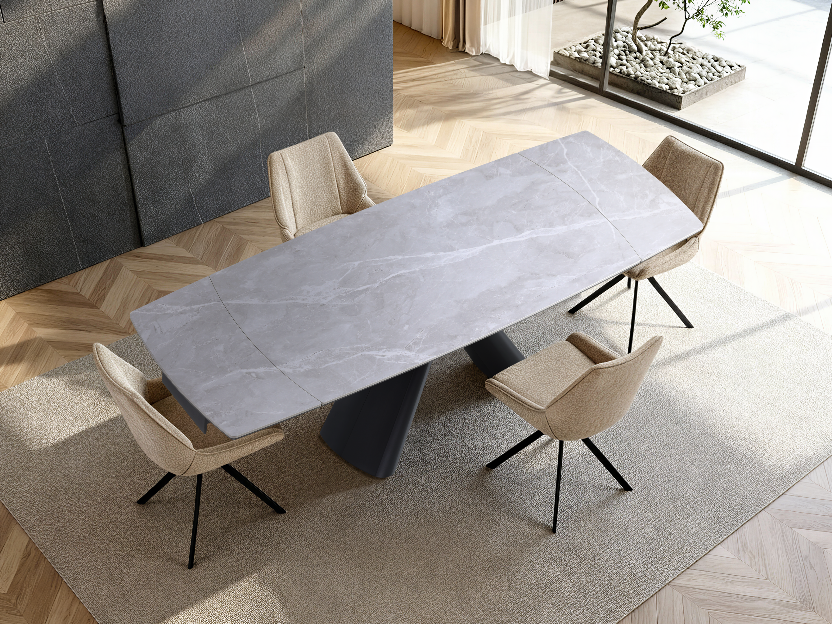 Wnieś do swojej jadalni nowoczesną elegancję dzięki stołowi rozkładanemu Clarity – modelowi łączącemu ceramiczny blat dwuwarstwowy z charakterystyczną podstawą składającą się z trzech masywnych, cylindrycznych nóg o dynamicznej, rzeźbiarskiej formie.