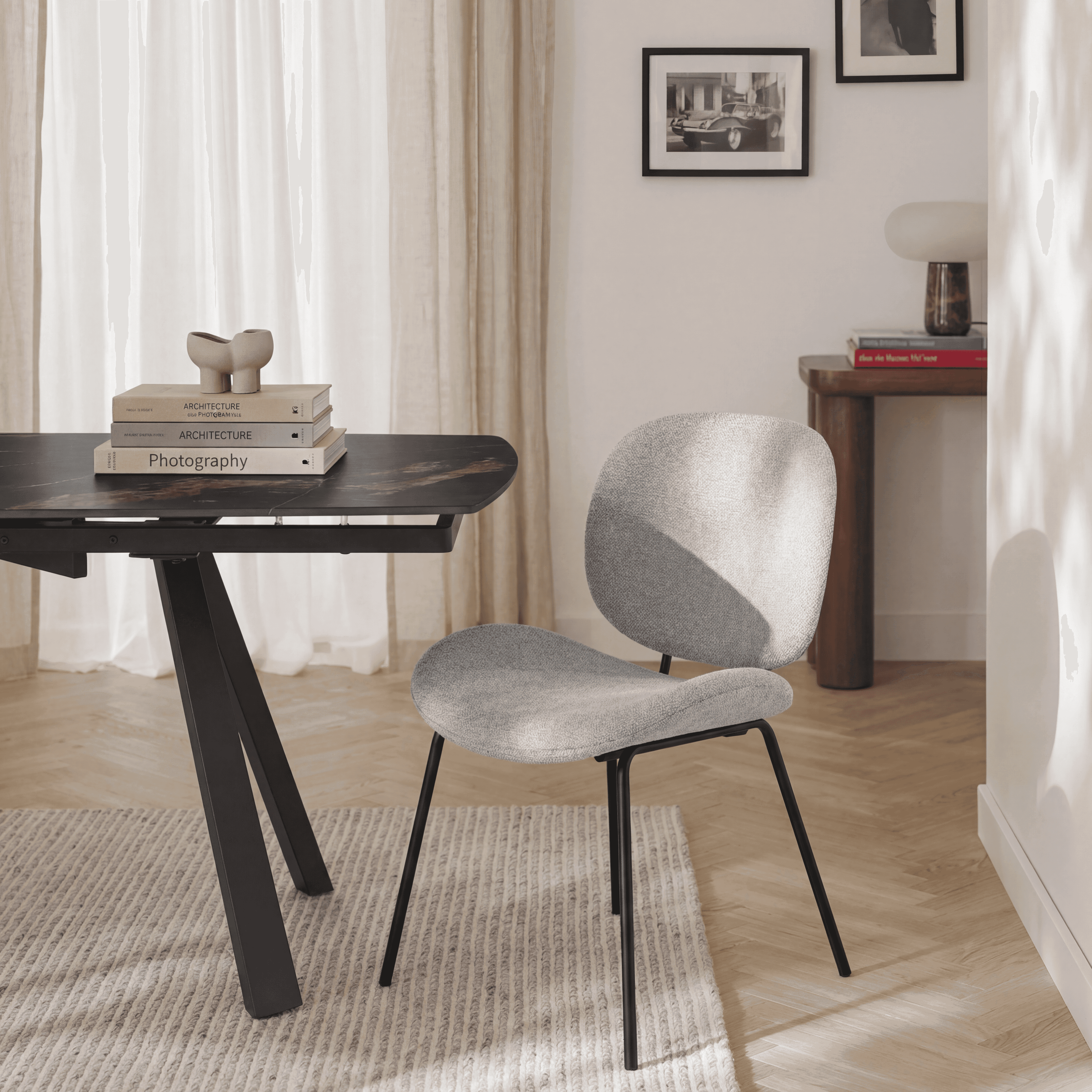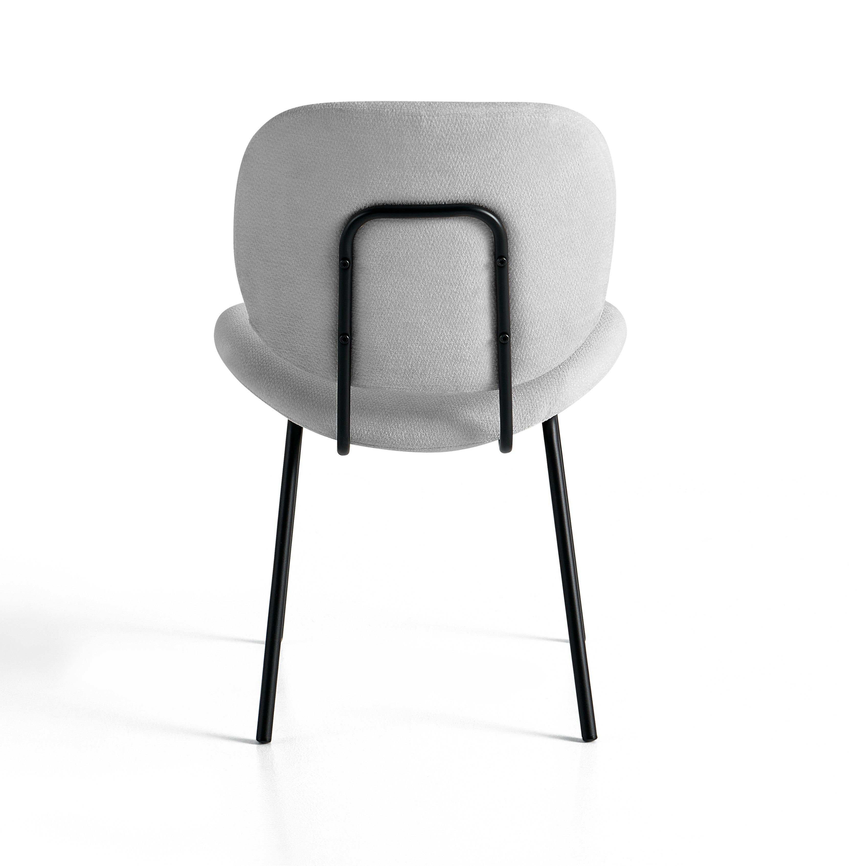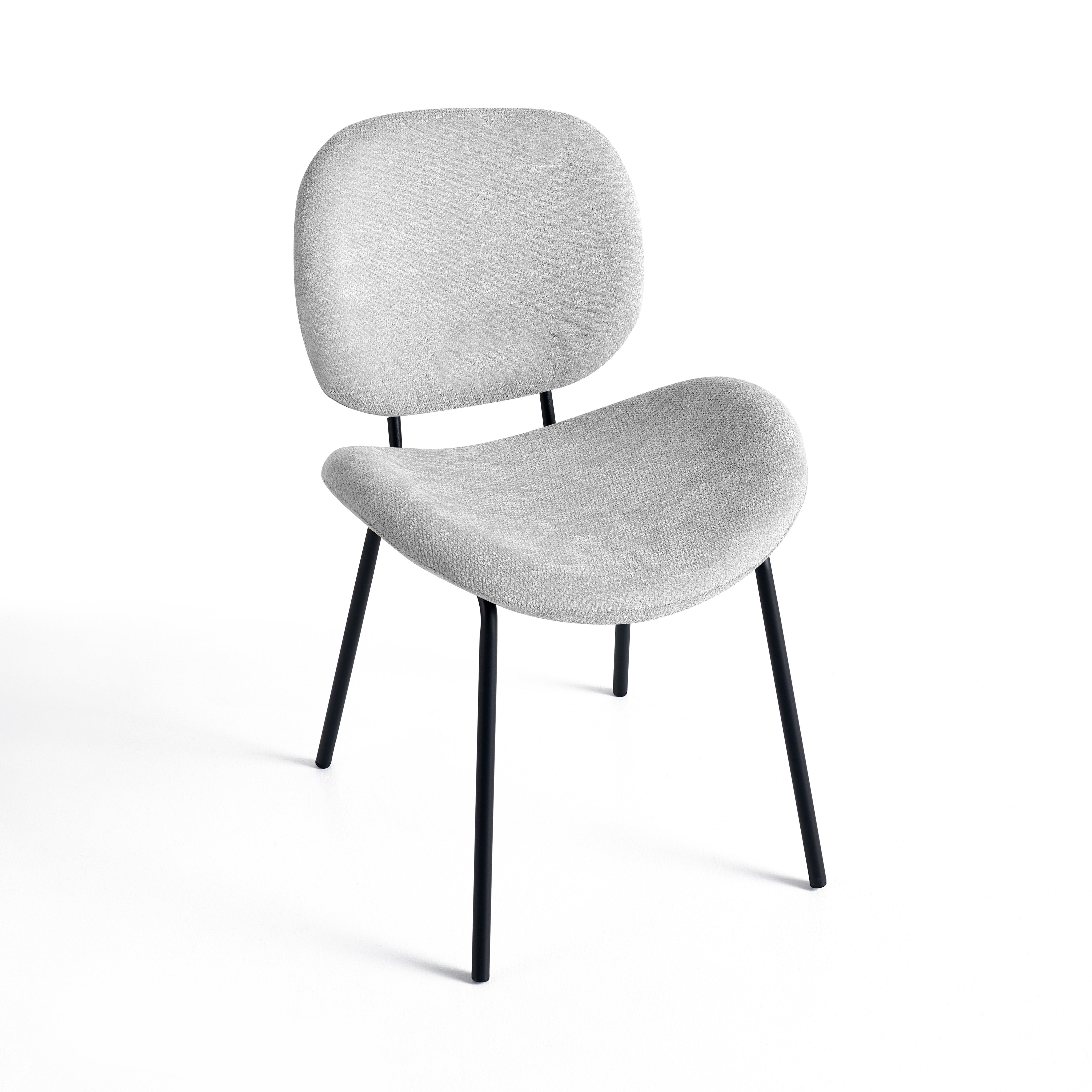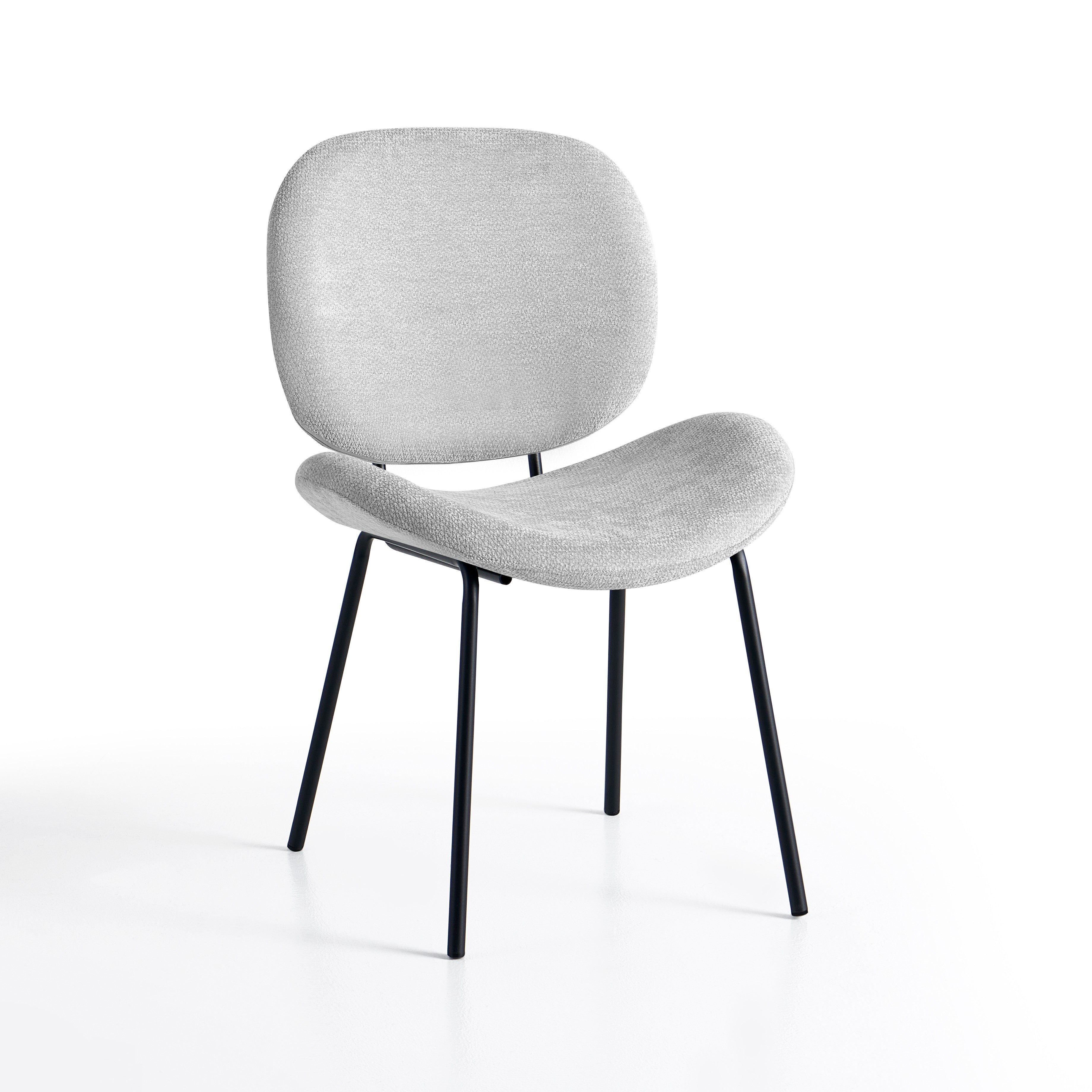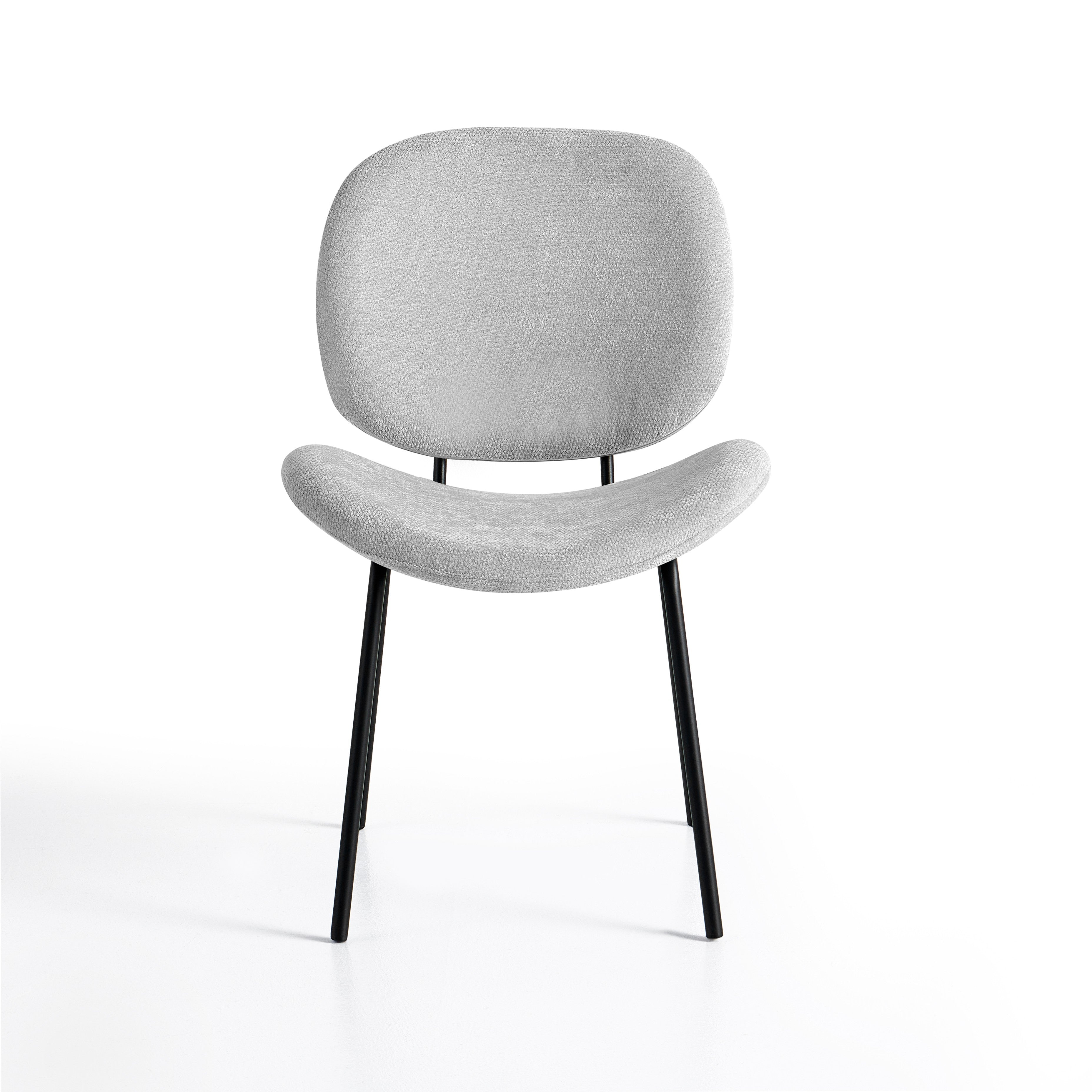 Krzesło tapicerowane w kolorze jasnoszarym to nowoczesny model o lekkiej, minimalistycznej formie. Prosta konstrukcja w połączeniu z metalowymi nogami malowanymi na czarno sprawia, że krzesło dobrze wpisuje się w aranżacje loftowe oraz współczesne wnętrza.