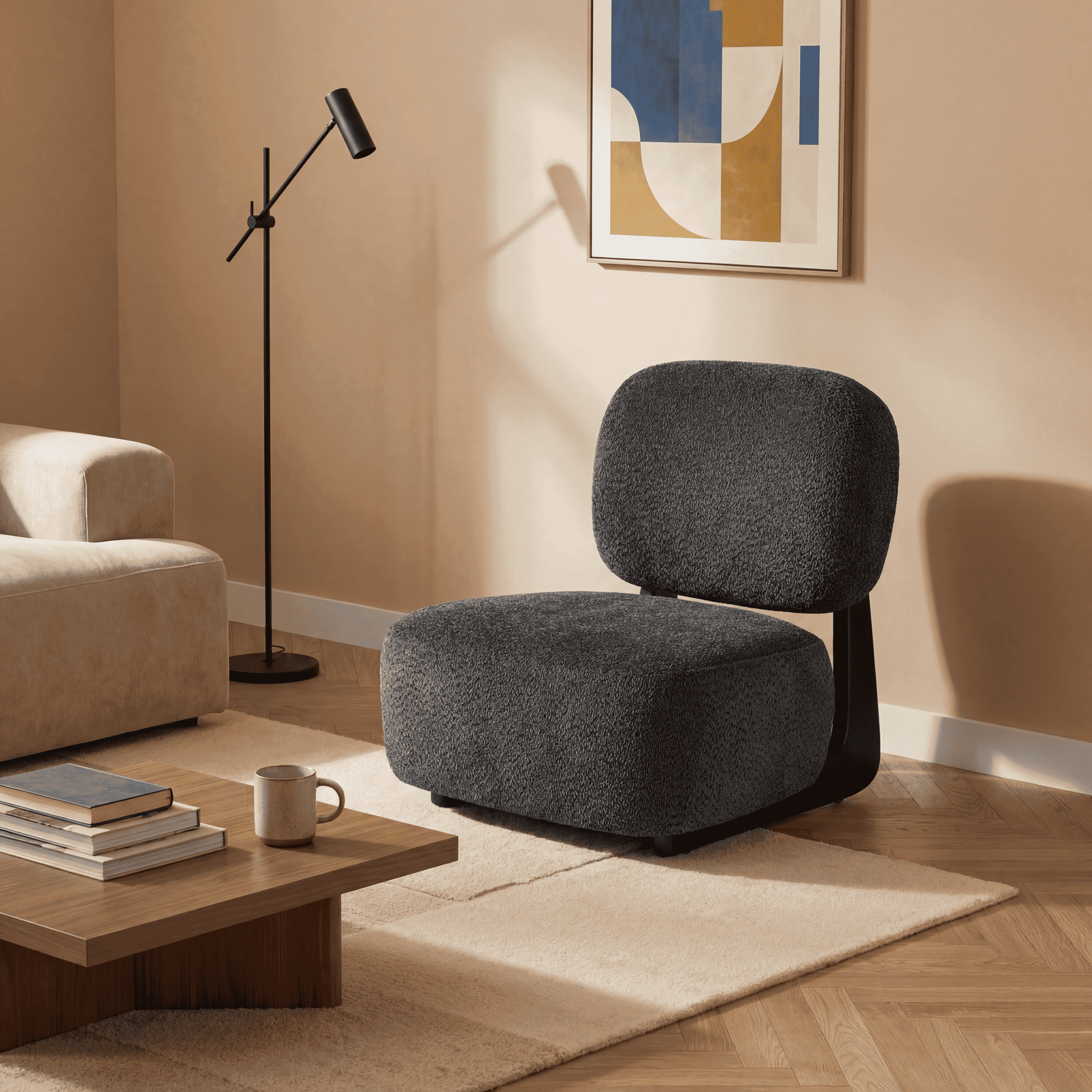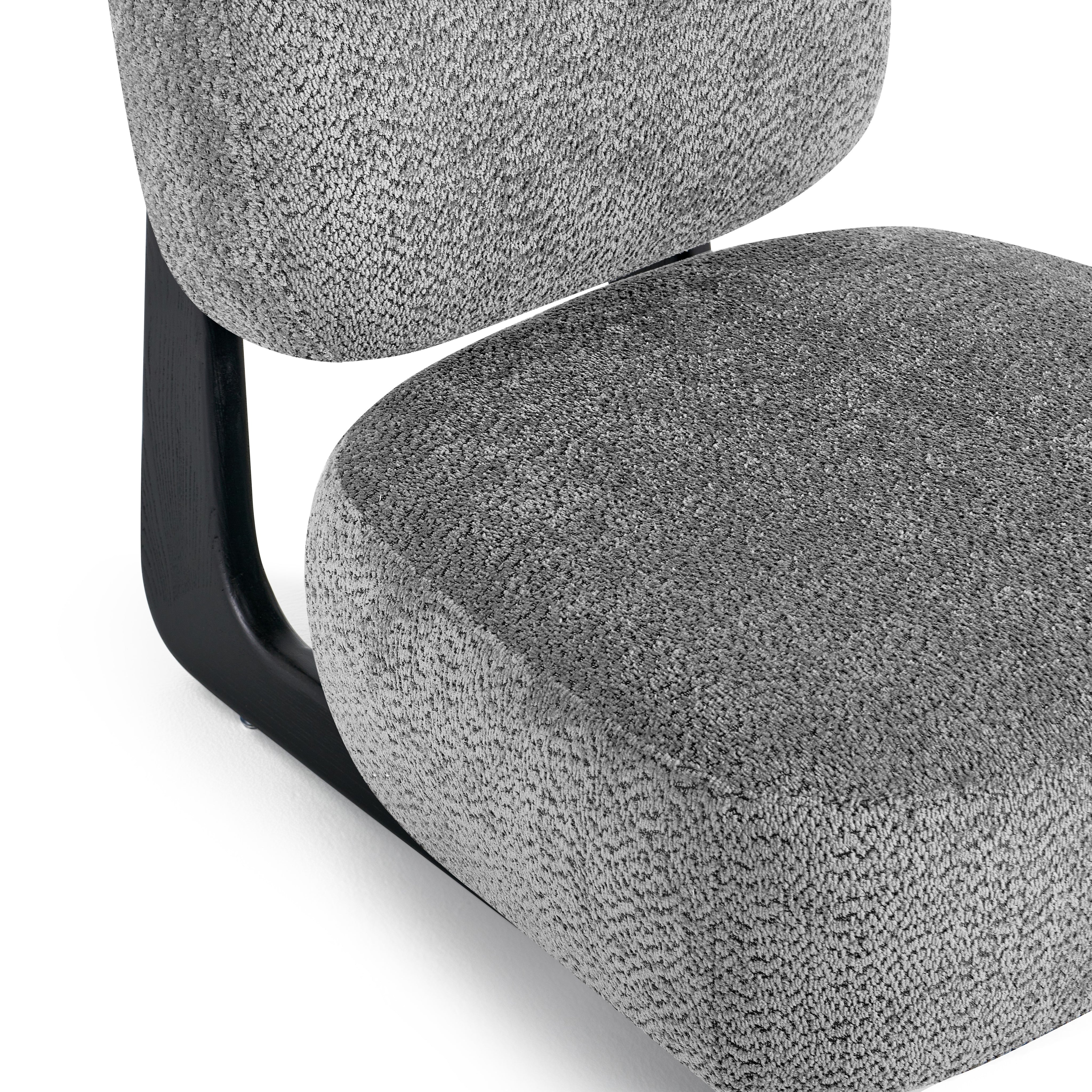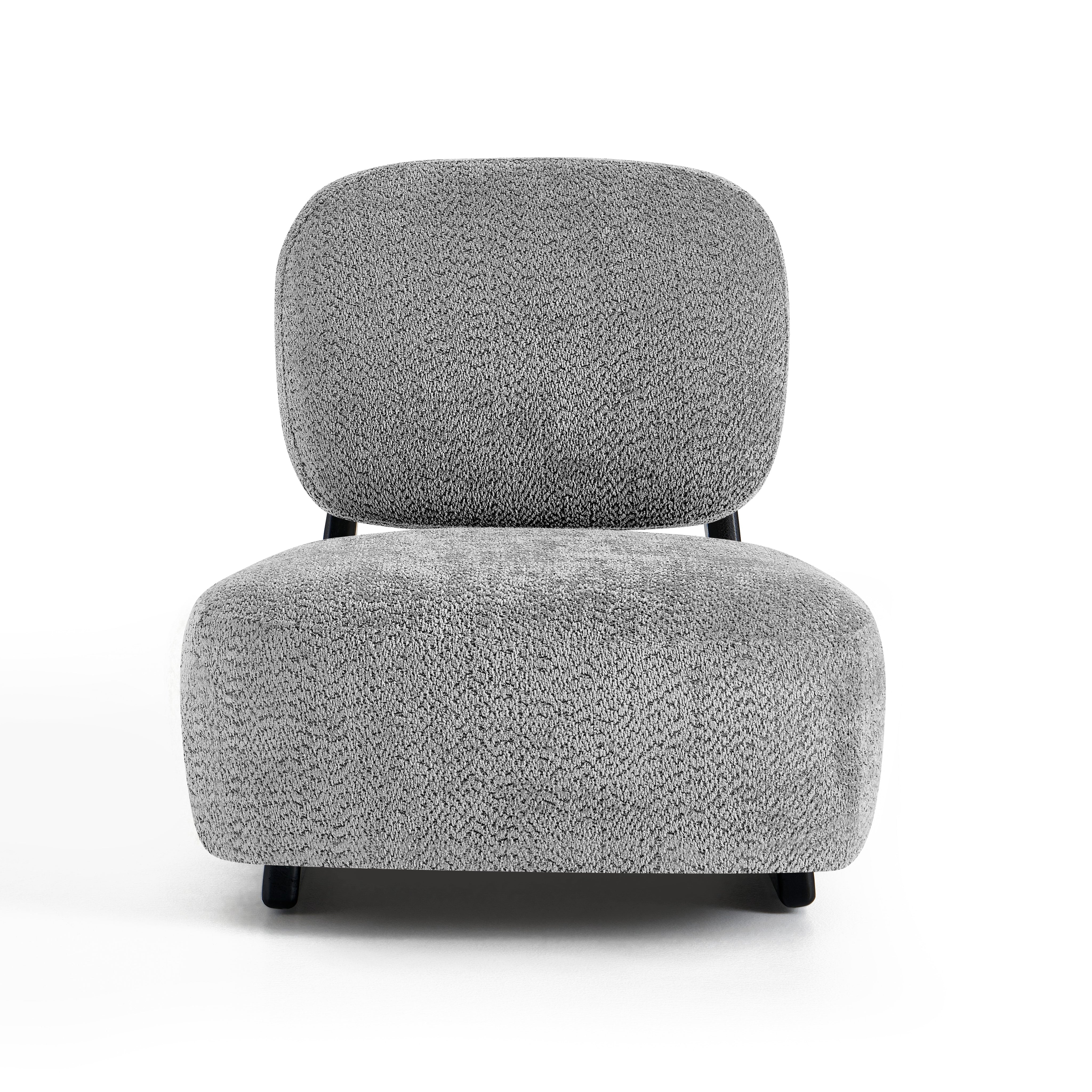 Szerokie, wygodne siedzisko oraz miękkie oparcie zapewniają wysoki komfort podczas codziennego odpoczynku. Tapicerka z tkaniny premium jest przyjemna w dotyku i trwała, natomiast czarna metalowa podstawa podkreśla nowoczesny design oraz gwarantuje stabilność konstrukcji.