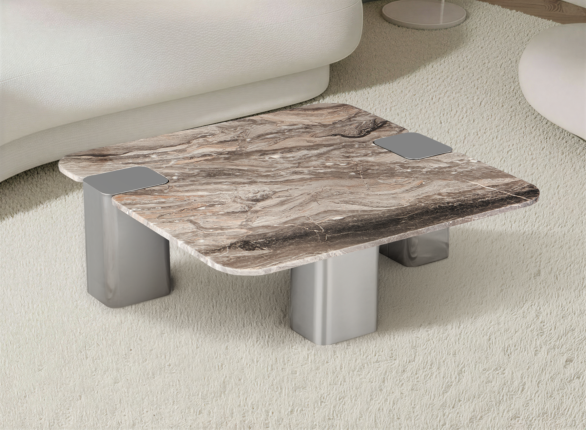 Nowoczesny stolik kawowy z naturalnego kamienia 100x100 – marmur brązowy, nogi inox chromowany