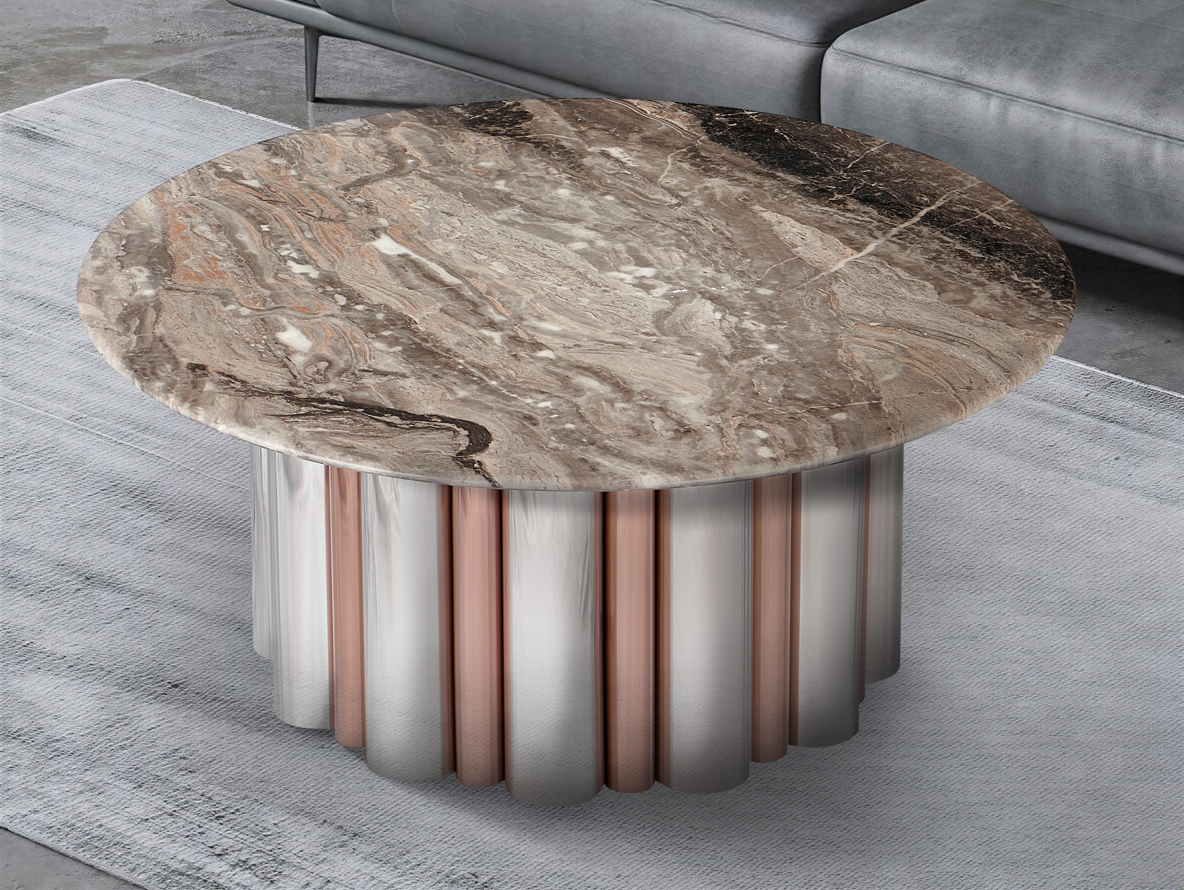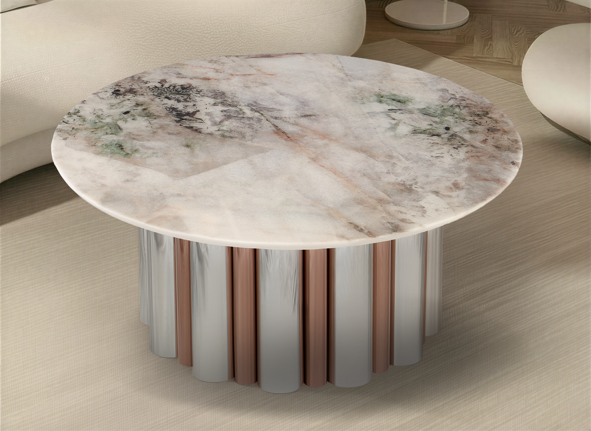 Stabilna podstawa z inoxu chromowanego podkreśla luksusowy styl stolika i zapewnia pewność użytkowania. Okrągły blat o średnicy 90 cm oferuje wygodną powierzchnię na dekoracje, książki oraz serwowanie napojów, a zaokrąglona forma zwiększa bezpieczeństwo i komfort w codziennym korzystaniu.