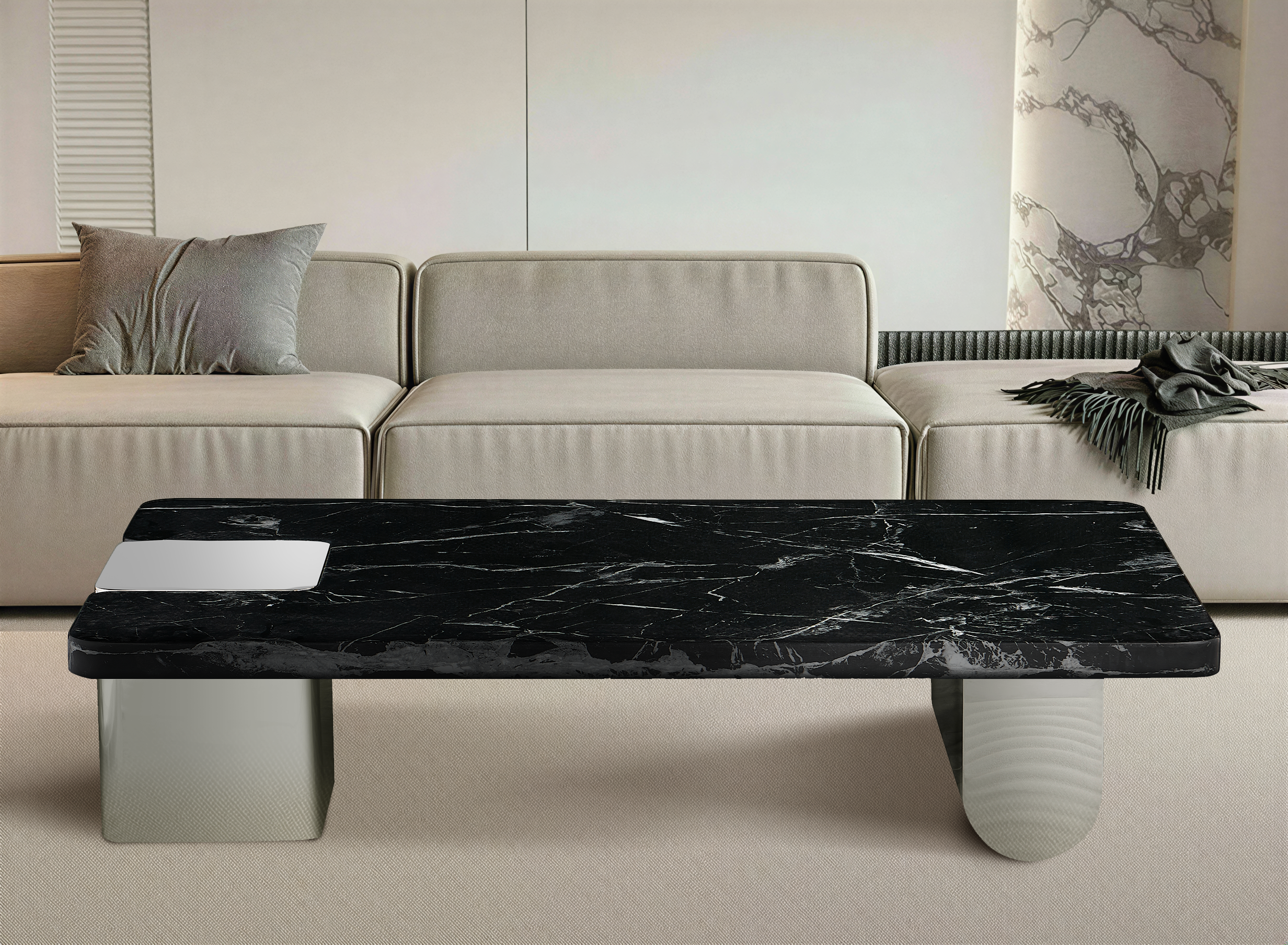 Nowoczesny stolik kawowy z kamieniem naturalnym 140×80 cm – marmur czarny na nogach z inoxu chromowanego