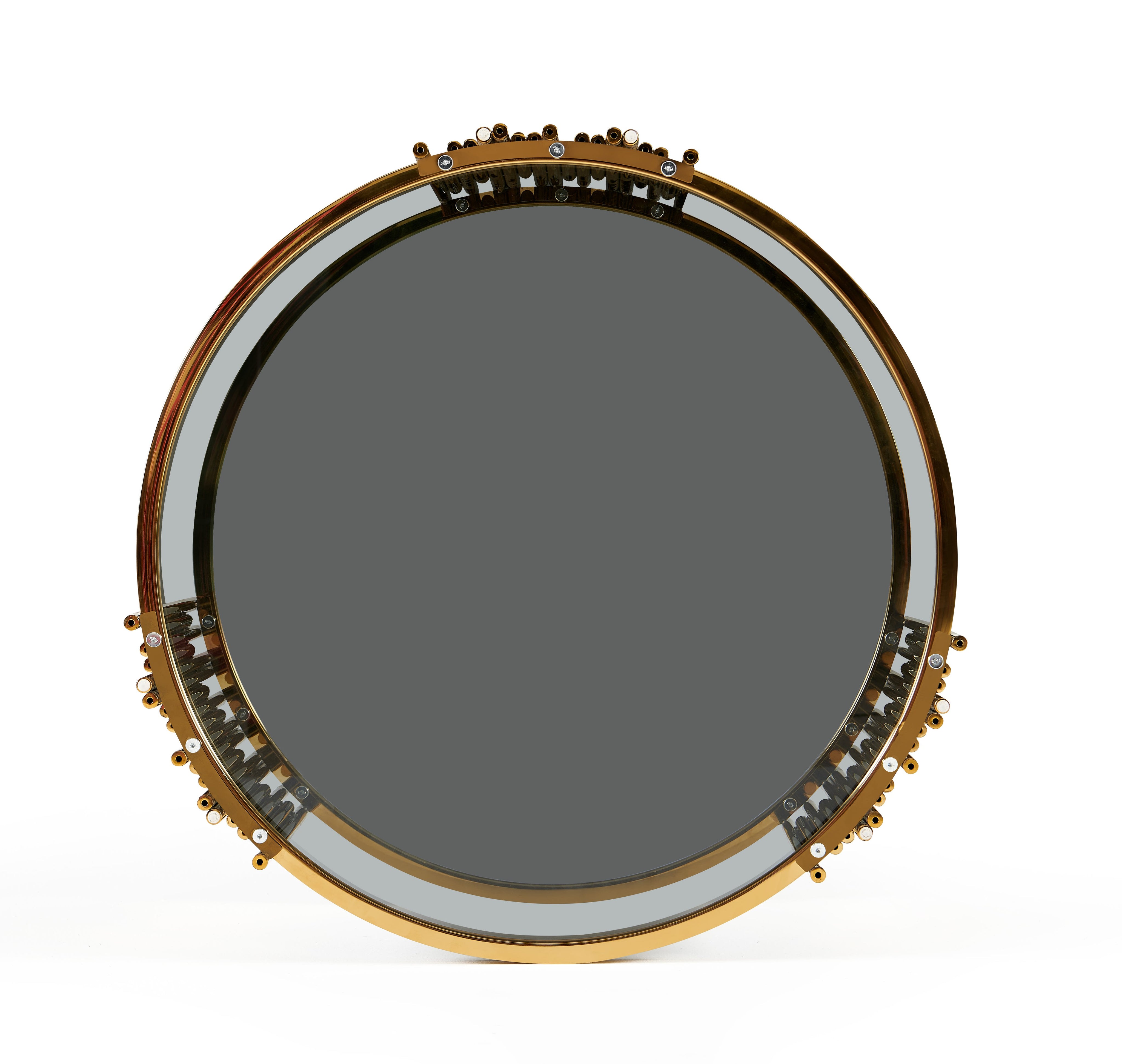 - Okrągłe siedzisko z obiciem tapicerowanym i mosiężnymi zdobieniami