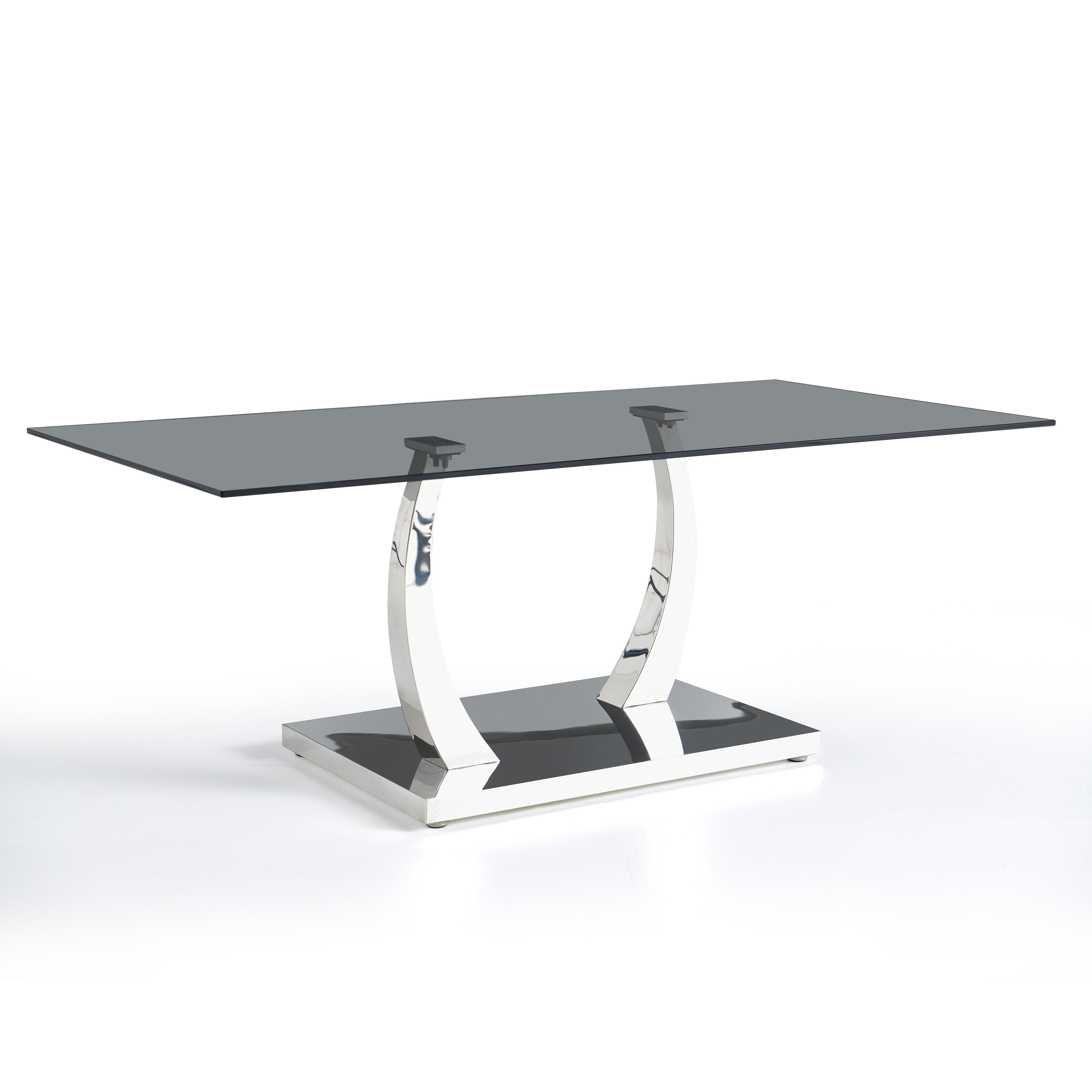 Blat wykonany z czarnego szkła hartowanego cechuje się wysoką odpornością na codzienne użytkowanie oraz łatwością utrzymania w czystości. Dekoracyjny metalowy stelaż o łagodnie wygiętej formie pełni zarówno funkcję nośną, jak i estetyczną, tworząc spójną i nowoczesną konstrukcję.