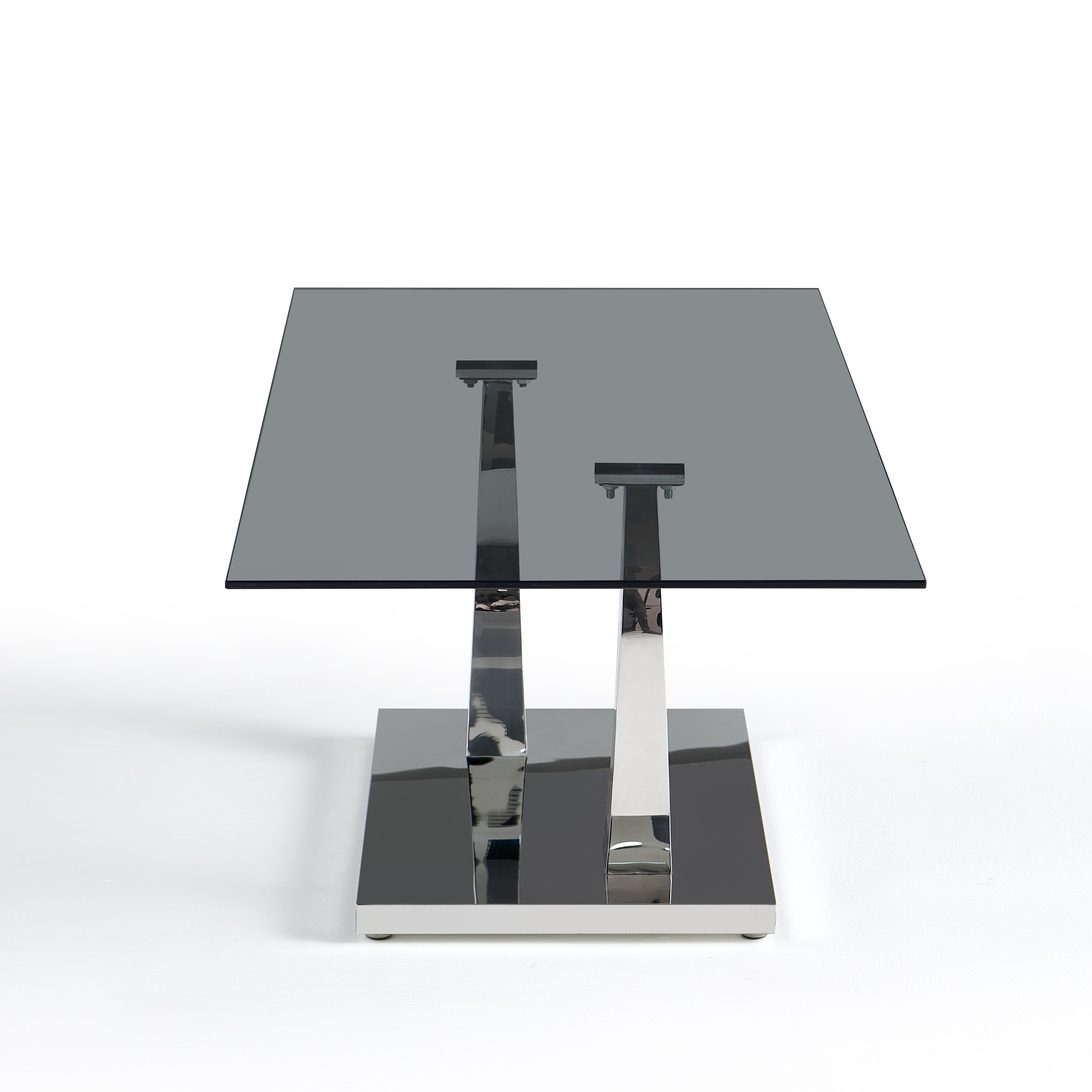 Stolik kawowy GLOW to nowoczesny model o prostokątnej formie 120×60 cm, z blatem z czarnego szkła hartowanego oraz chromowanym stelażem.