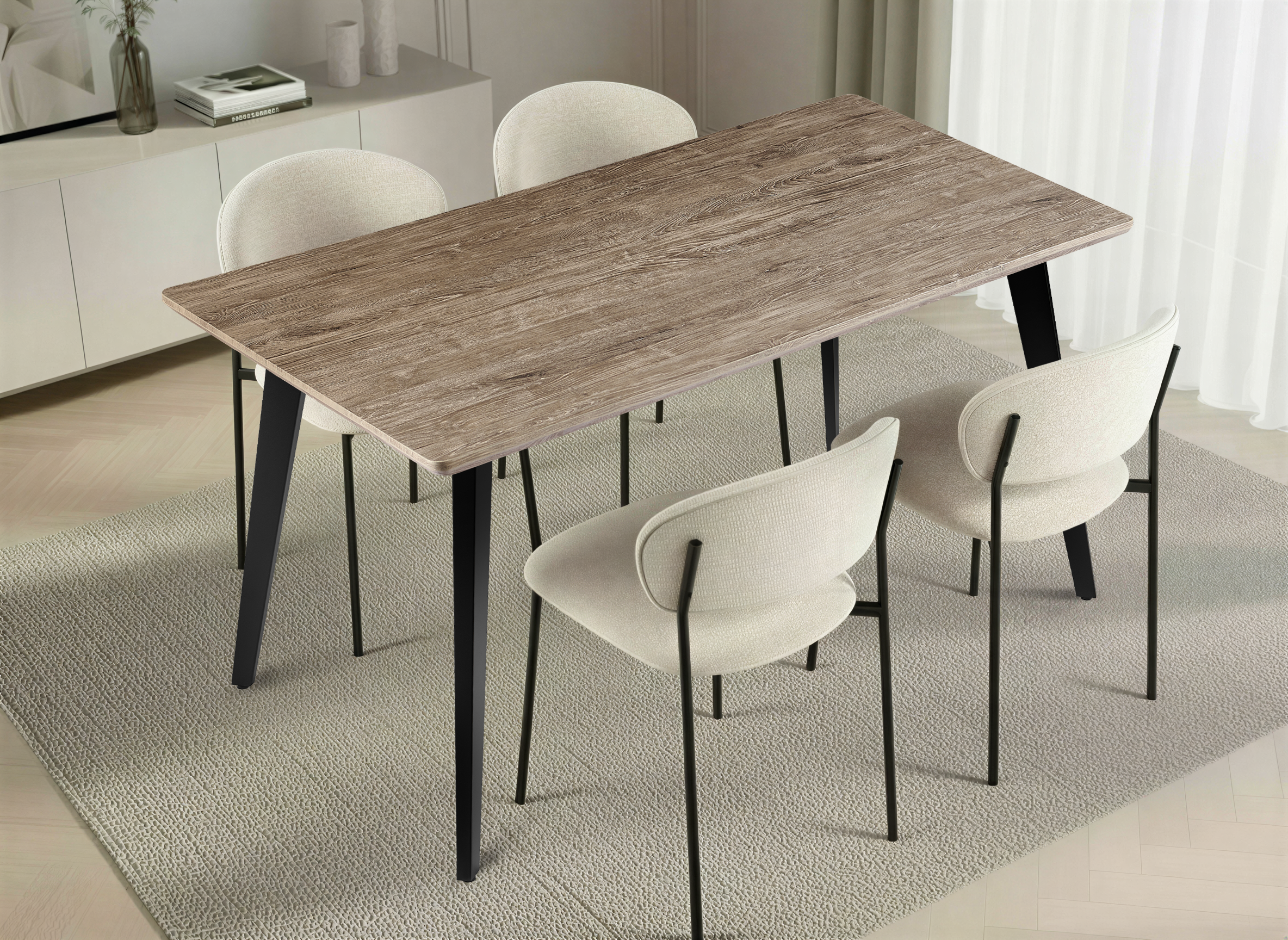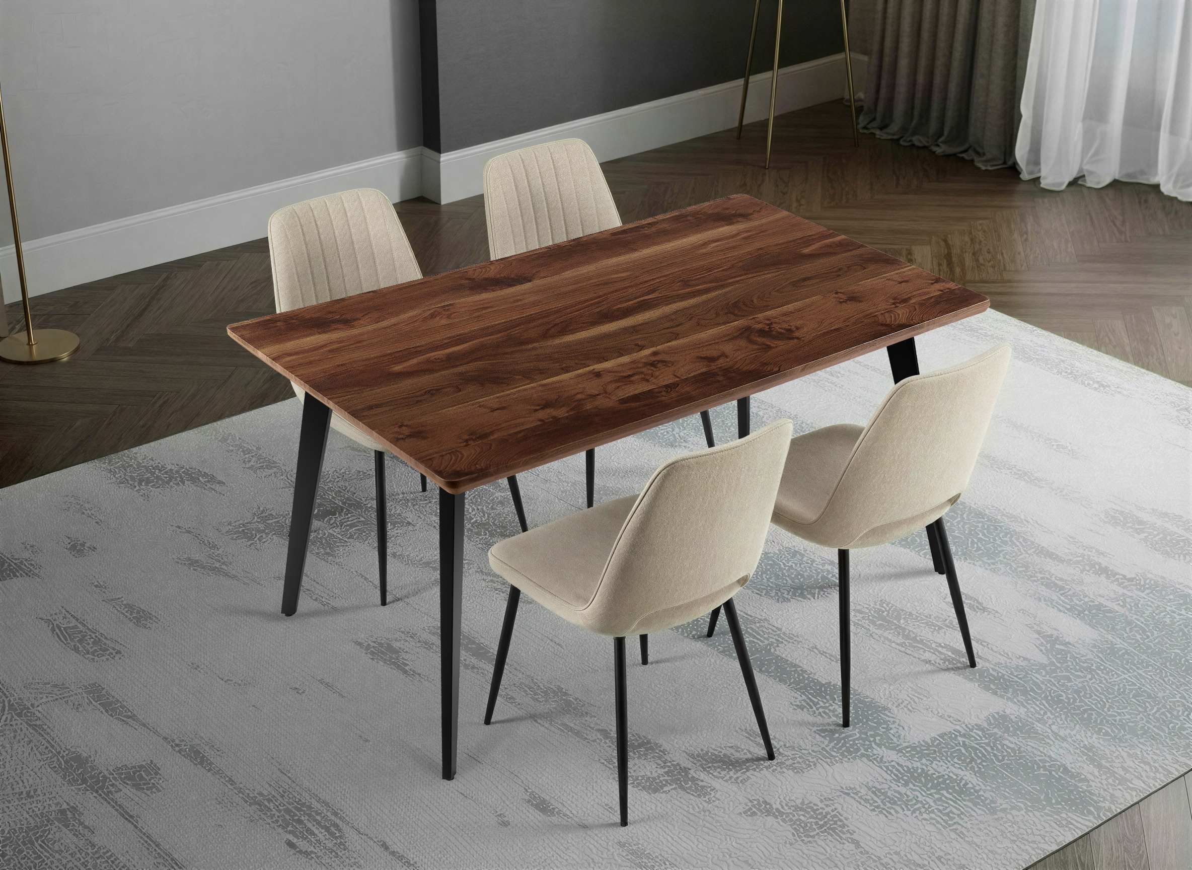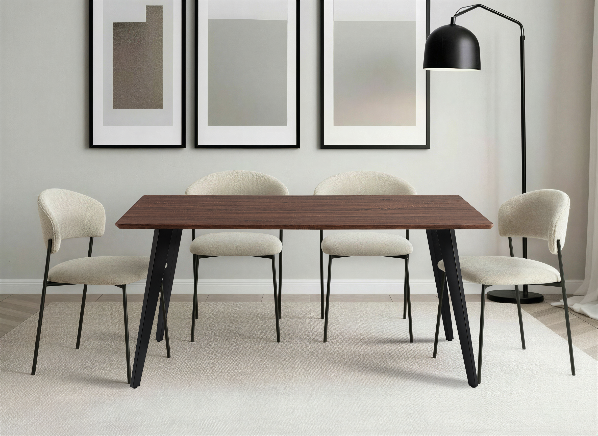 Ten prostokątny stół został zaprojektowany w nowoczesnym stylu loftowym i idealnie pasuje do jadalni, kuchni oraz salonu. Blat wykonany z płyty meblowej o wyraźnej strukturze drewna w kolorze Orzech Brązowy posiada matową, gładką powierzchnię, która nadaje naturalny wygląd, ogranicza poślizg i ułatwia codzienne czyszczenie.