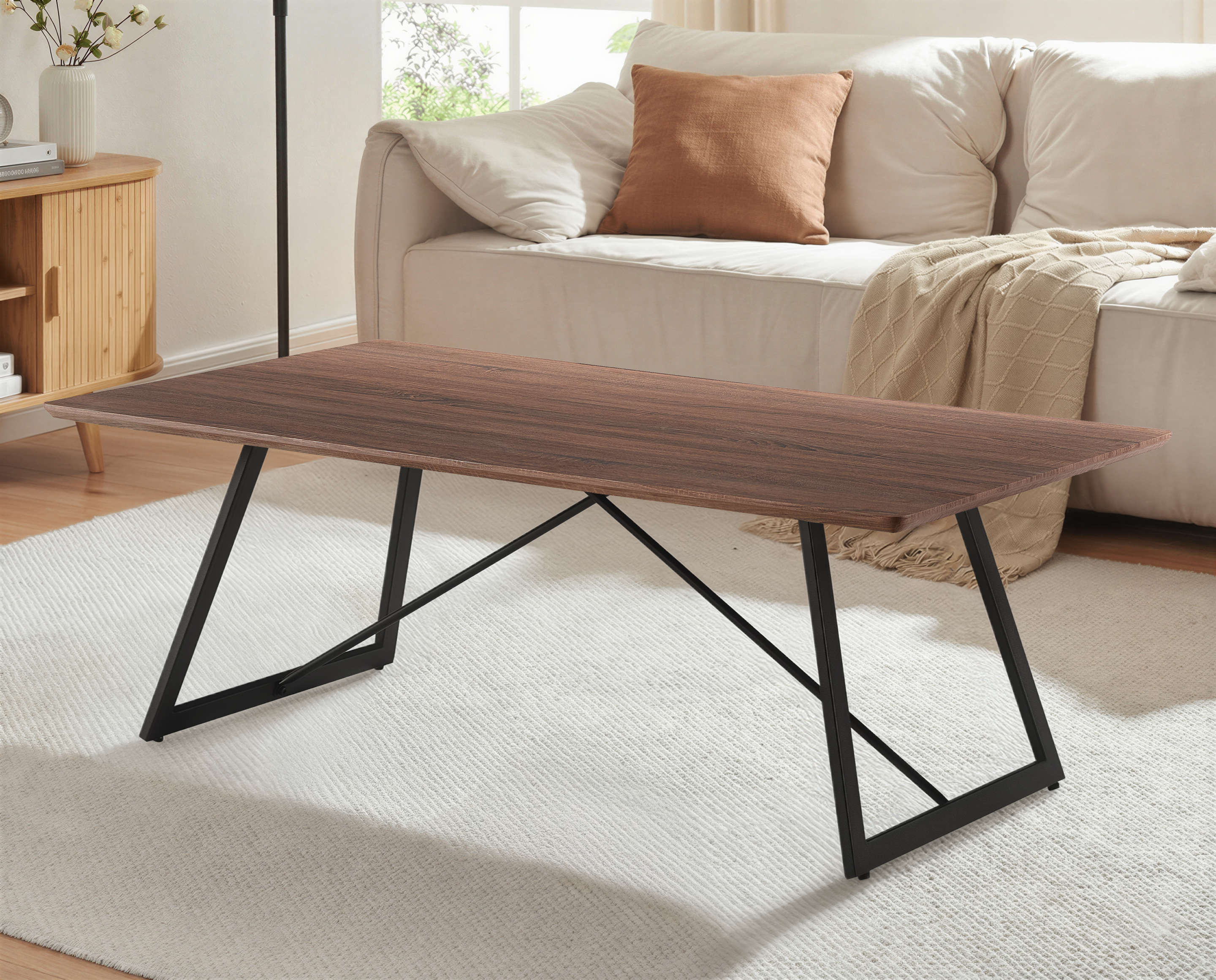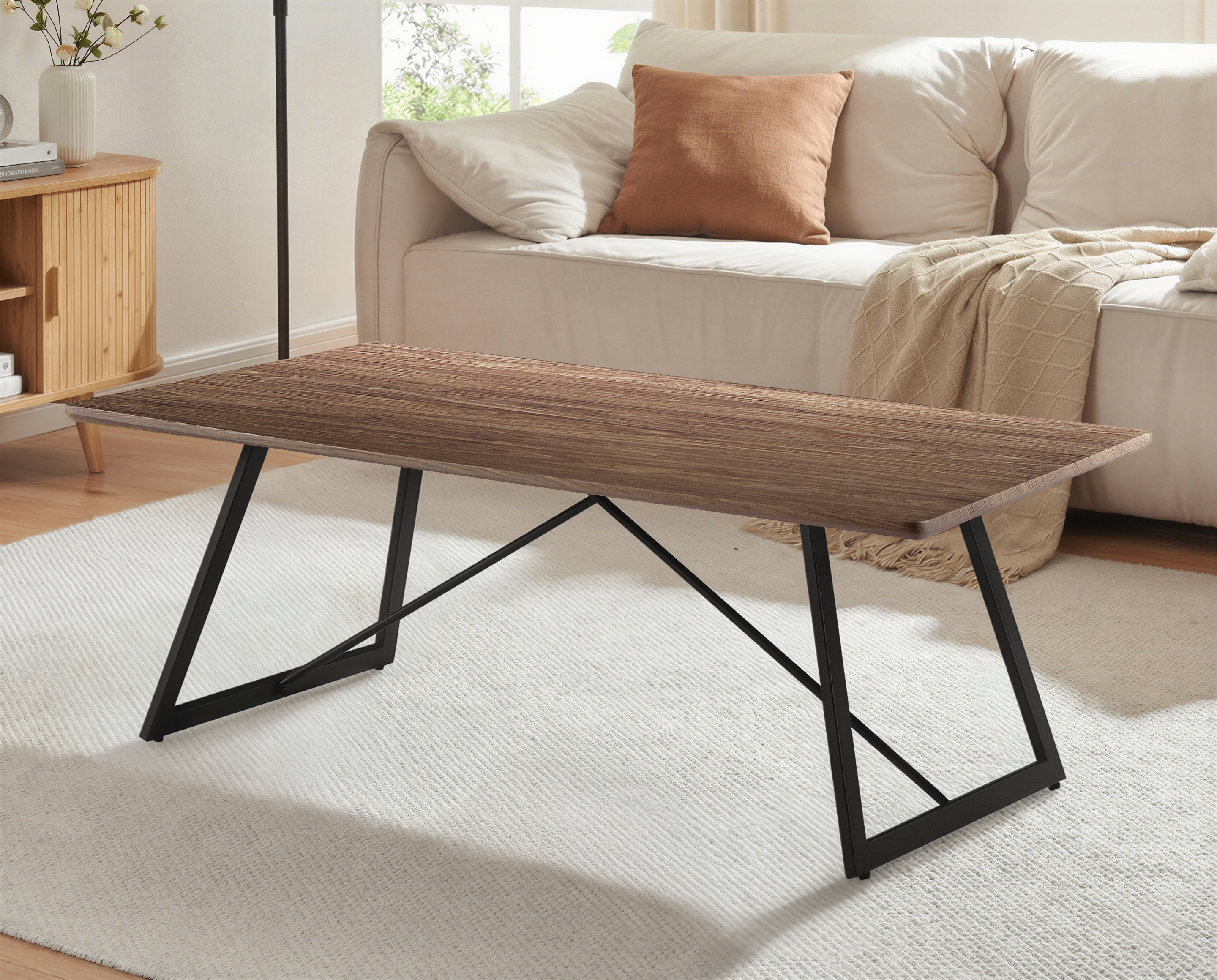 Solidny stelaż oraz metalowe, czarne nogi malowane proszkowo nadają stolikowi wyjątkowej stabilności, a także podkreślają surowy i loftowy wygląd. Połączenie ciepłego odcienia drewna w kolorze Orzech Brązowy z czarną, geometryczną podstawą tworzy kontrast idealny dla aranżacji inspirowanych pofabrycznymi przestrzeniami.