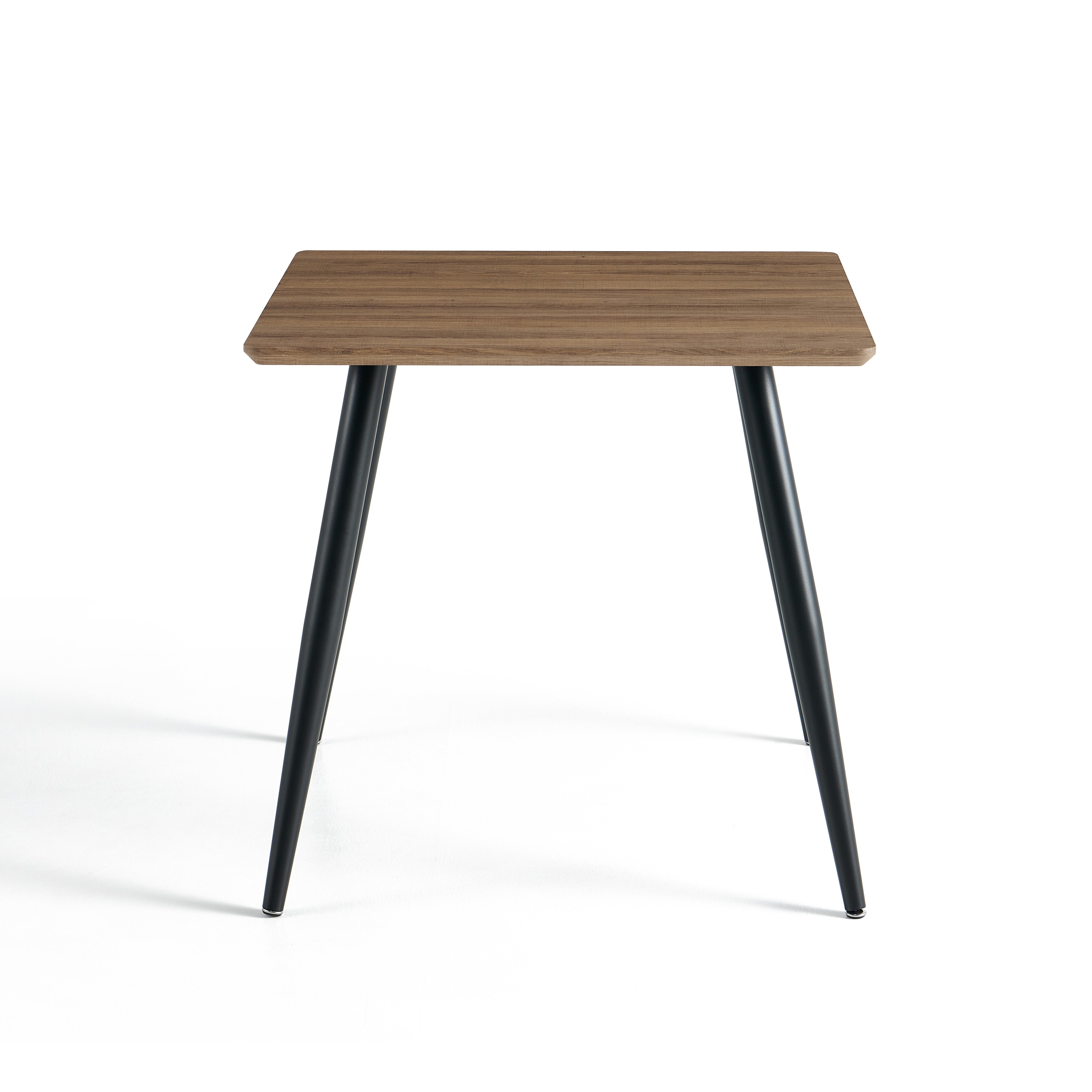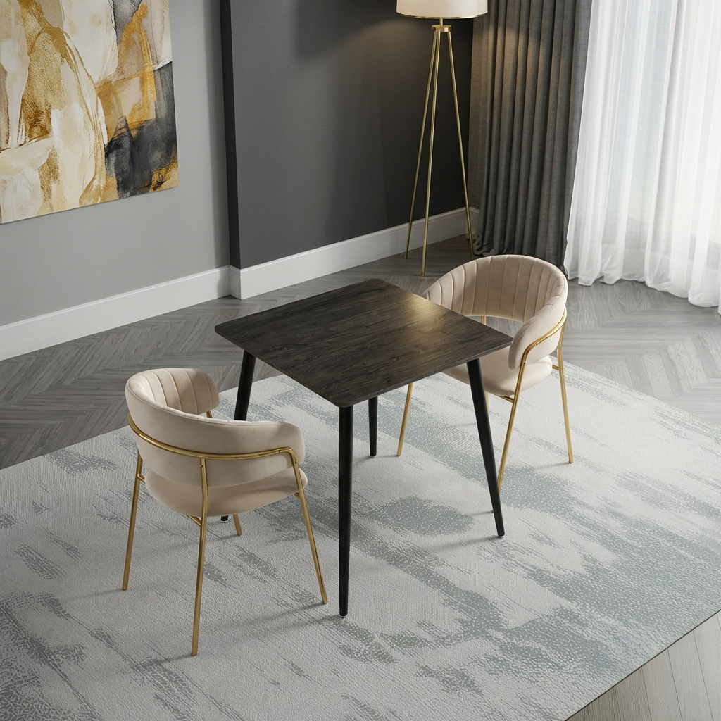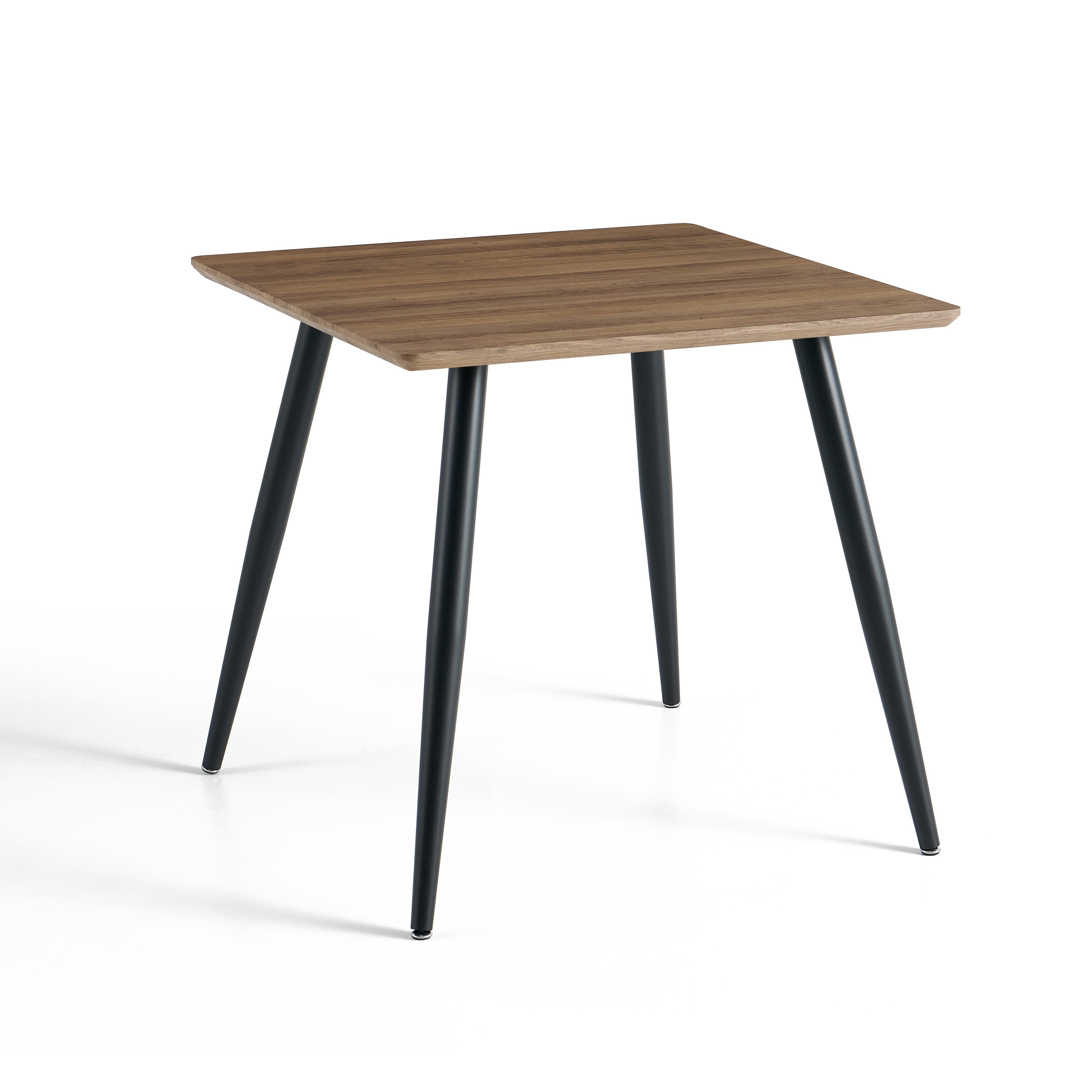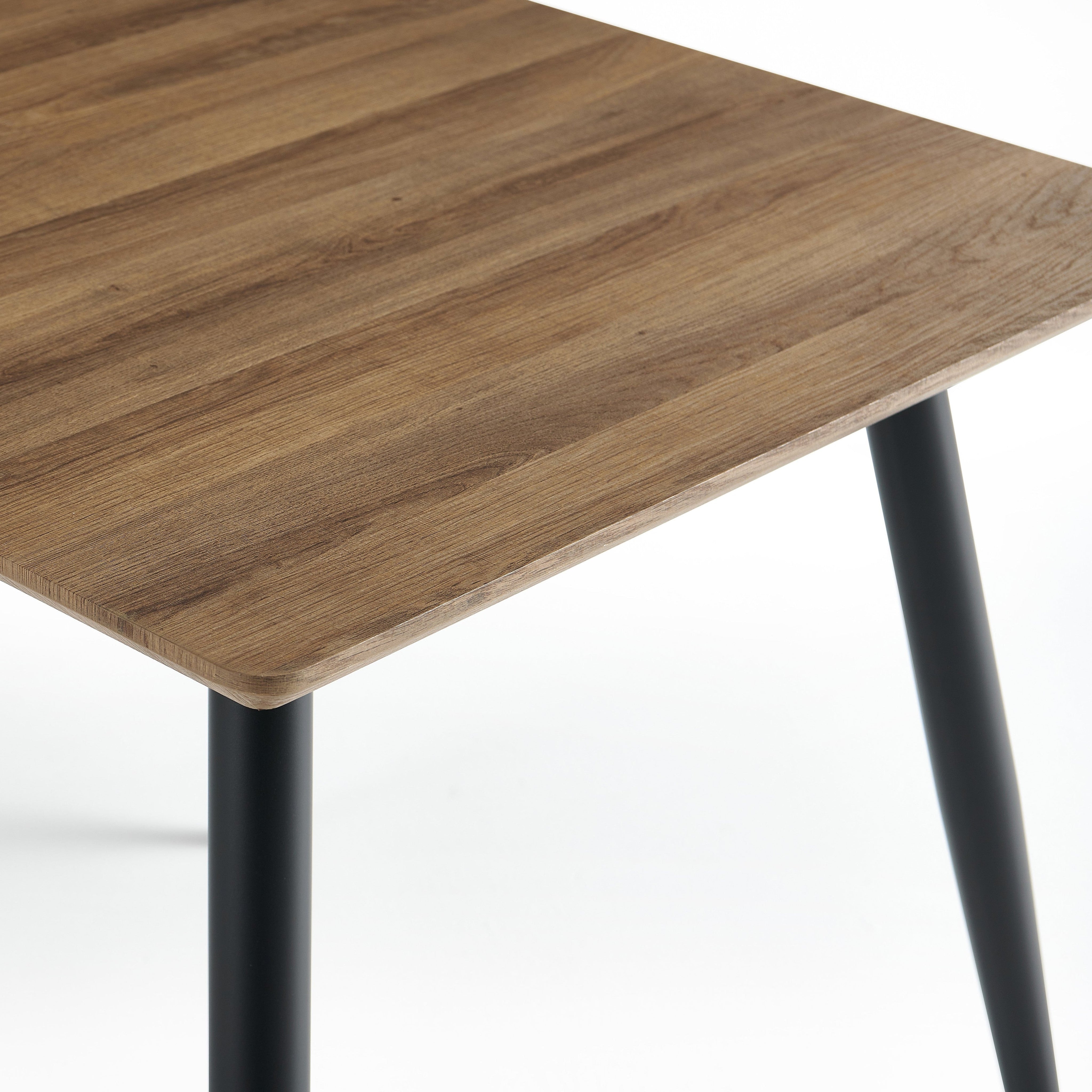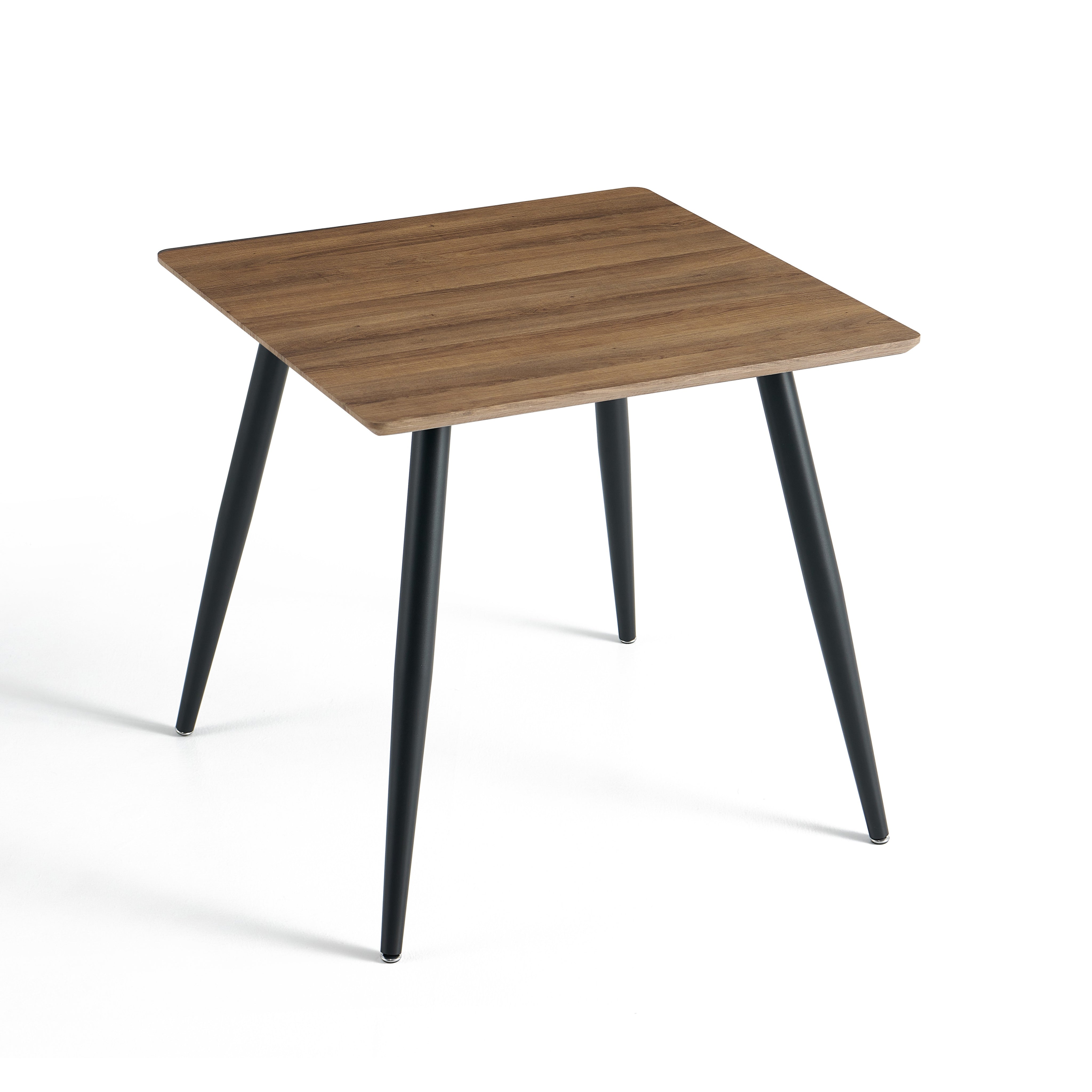 Czarne metalowe nogi malowane proszkowo zapewniają stabilność konstrukcji oraz tworzą elegancki kontrast z ciepłym kolorem blatu. Kompaktowy format 80×80 cm sprawdzi się doskonale w mniejszych jadalniach, kuchniach oraz przestrzeniach w stylu skandynawskim i nowoczesnym.