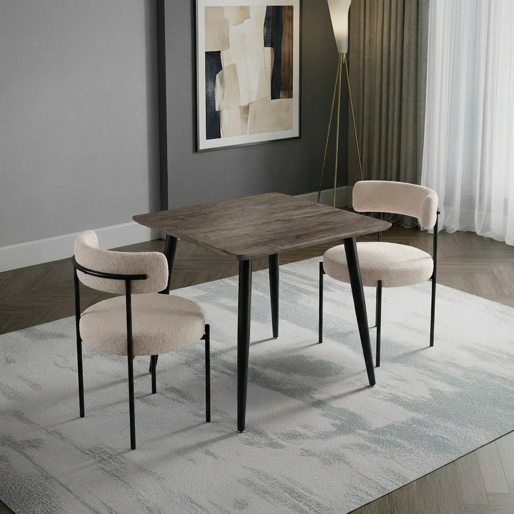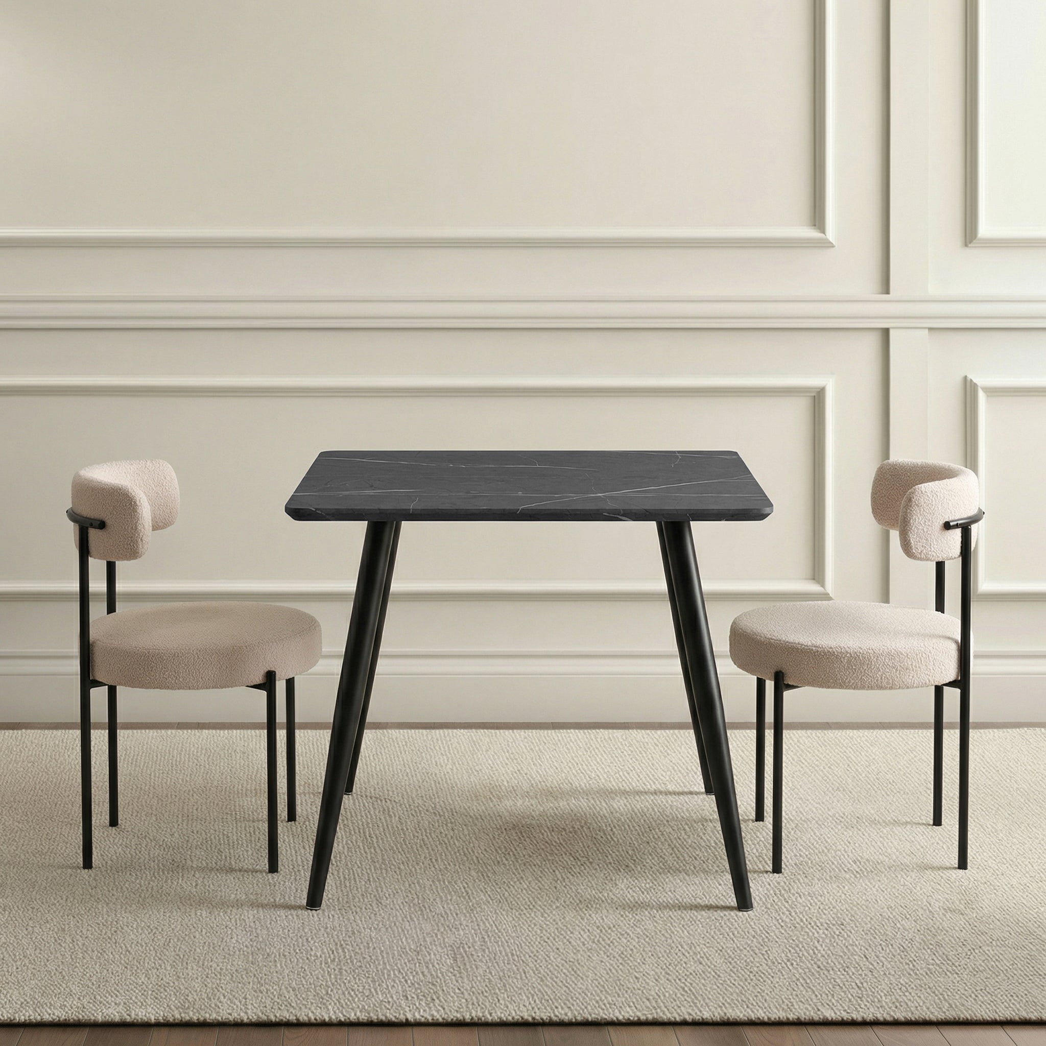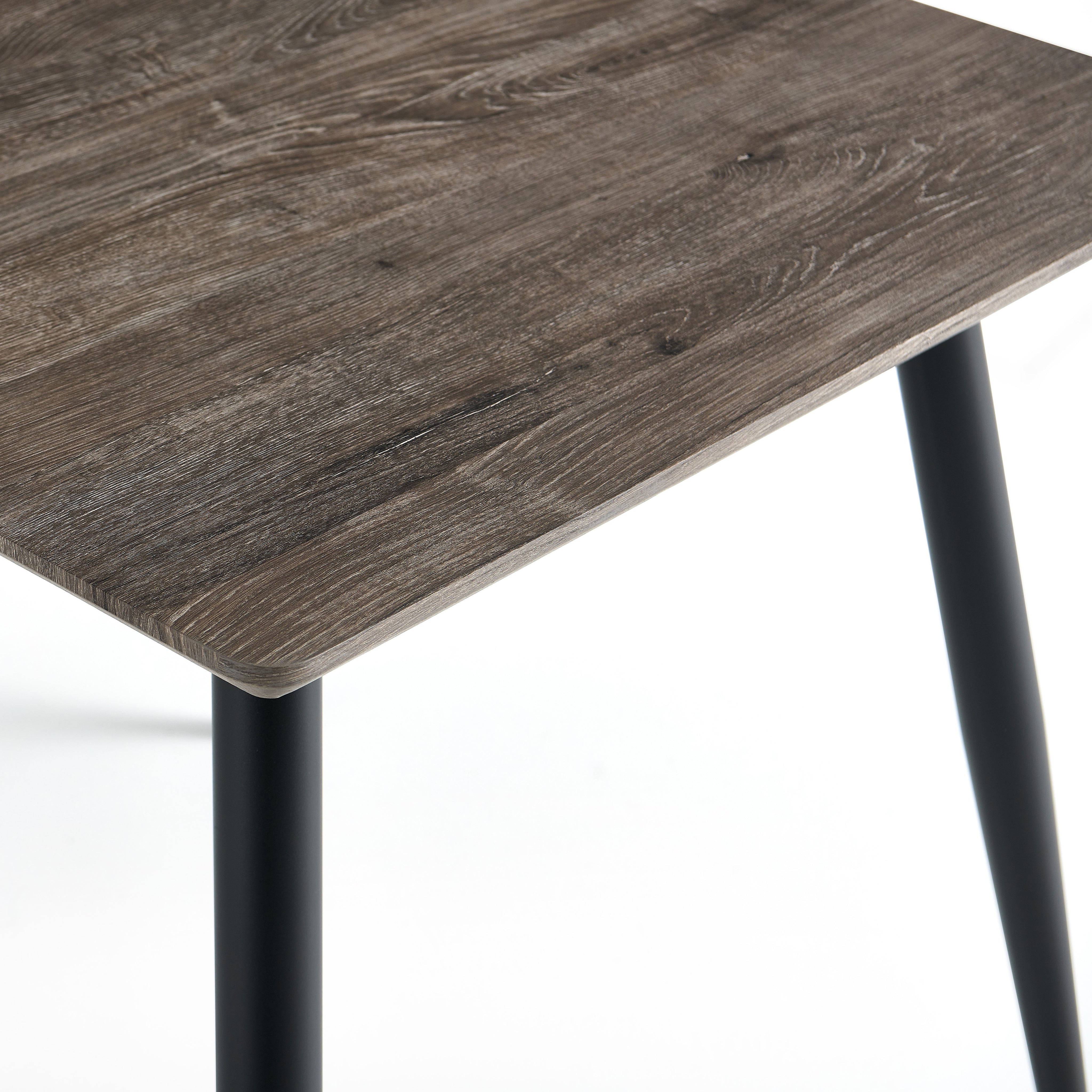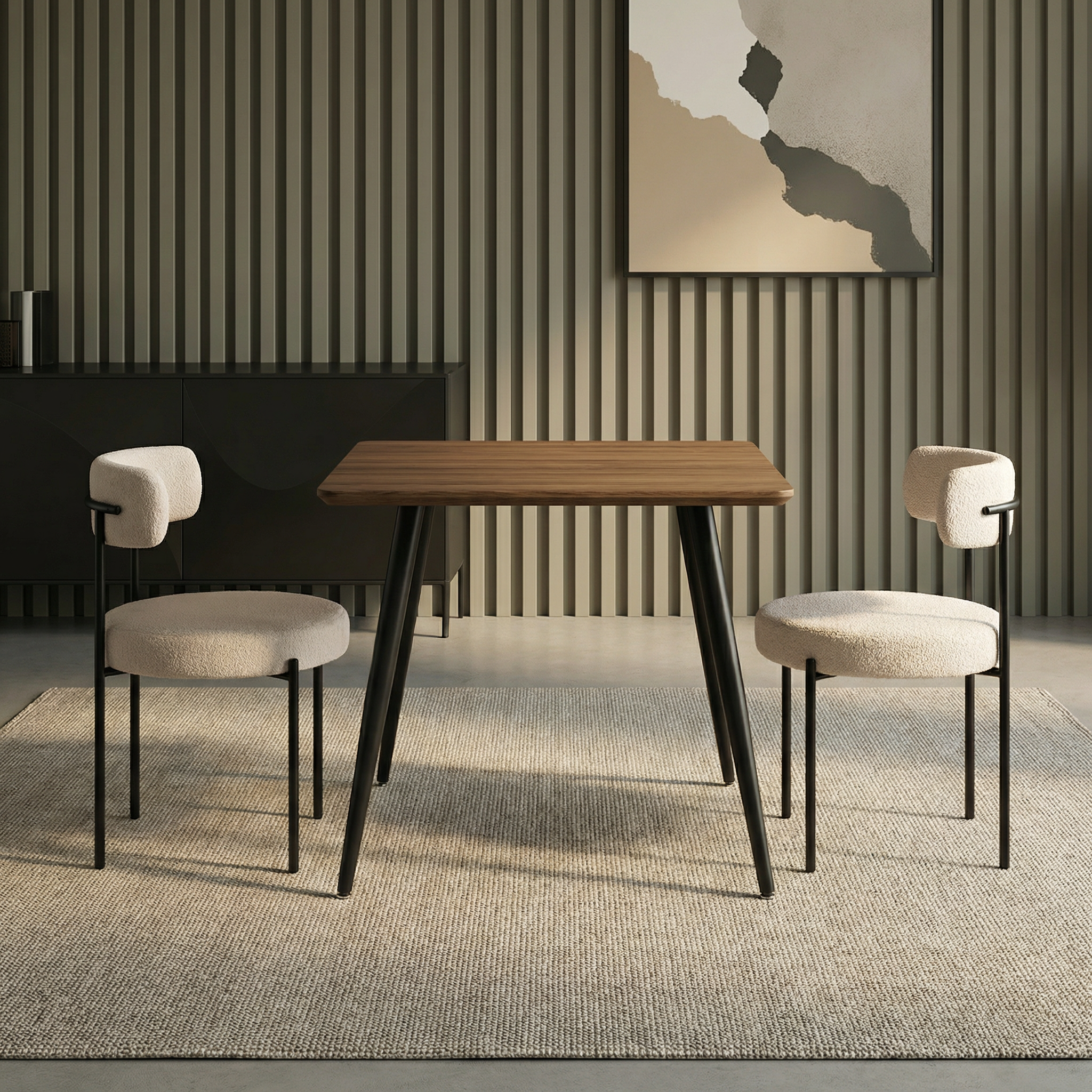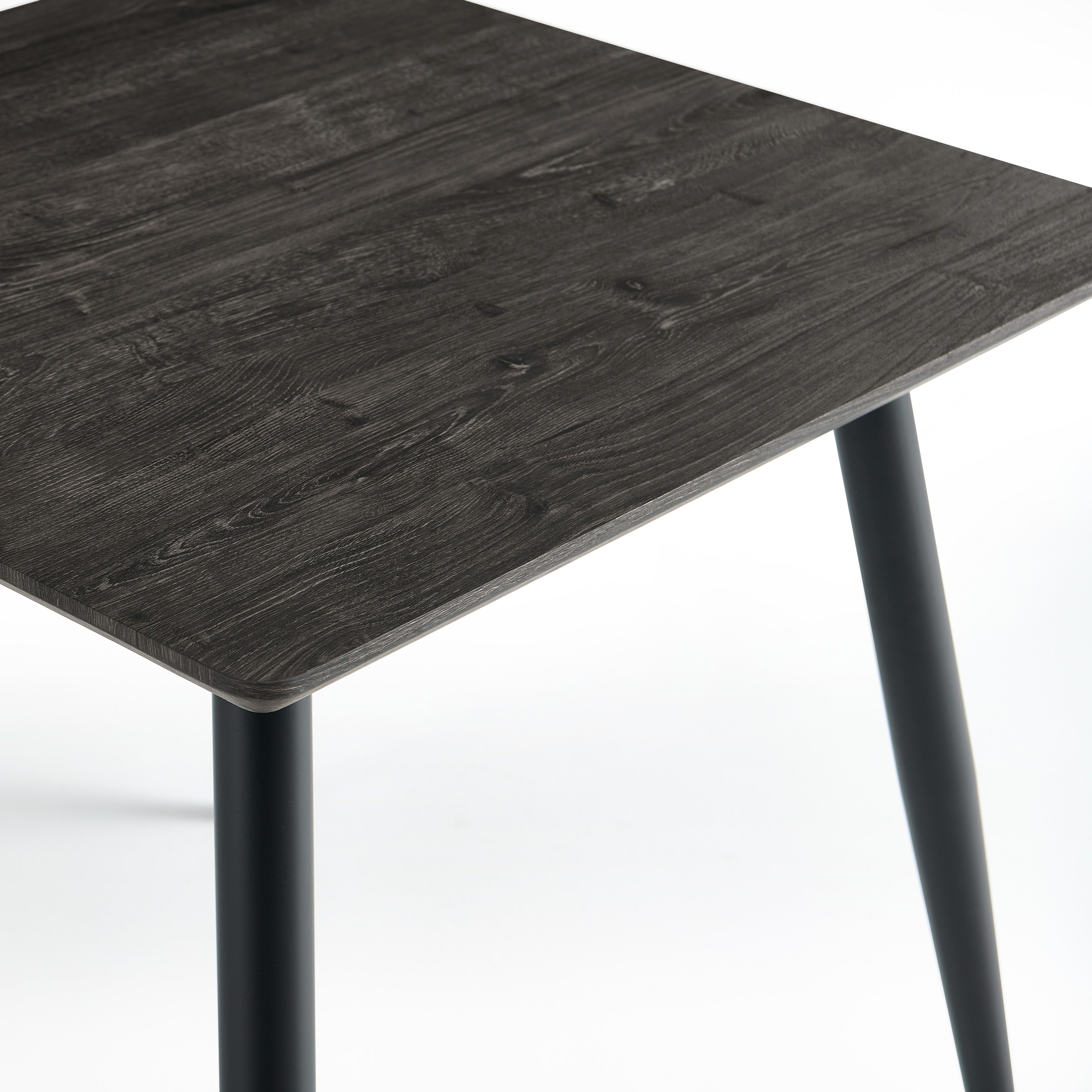 Czarne metalowe nogi malowane proszkowo zapewniają stabilność konstrukcji oraz tworzą elegancki kontrast z ciepłym kolorem blatu. Kompaktowy format 80×80 cm sprawdzi się doskonale w mniejszych jadalniach, kuchniach oraz przestrzeniach w stylu skandynawskim i nowoczesnym.