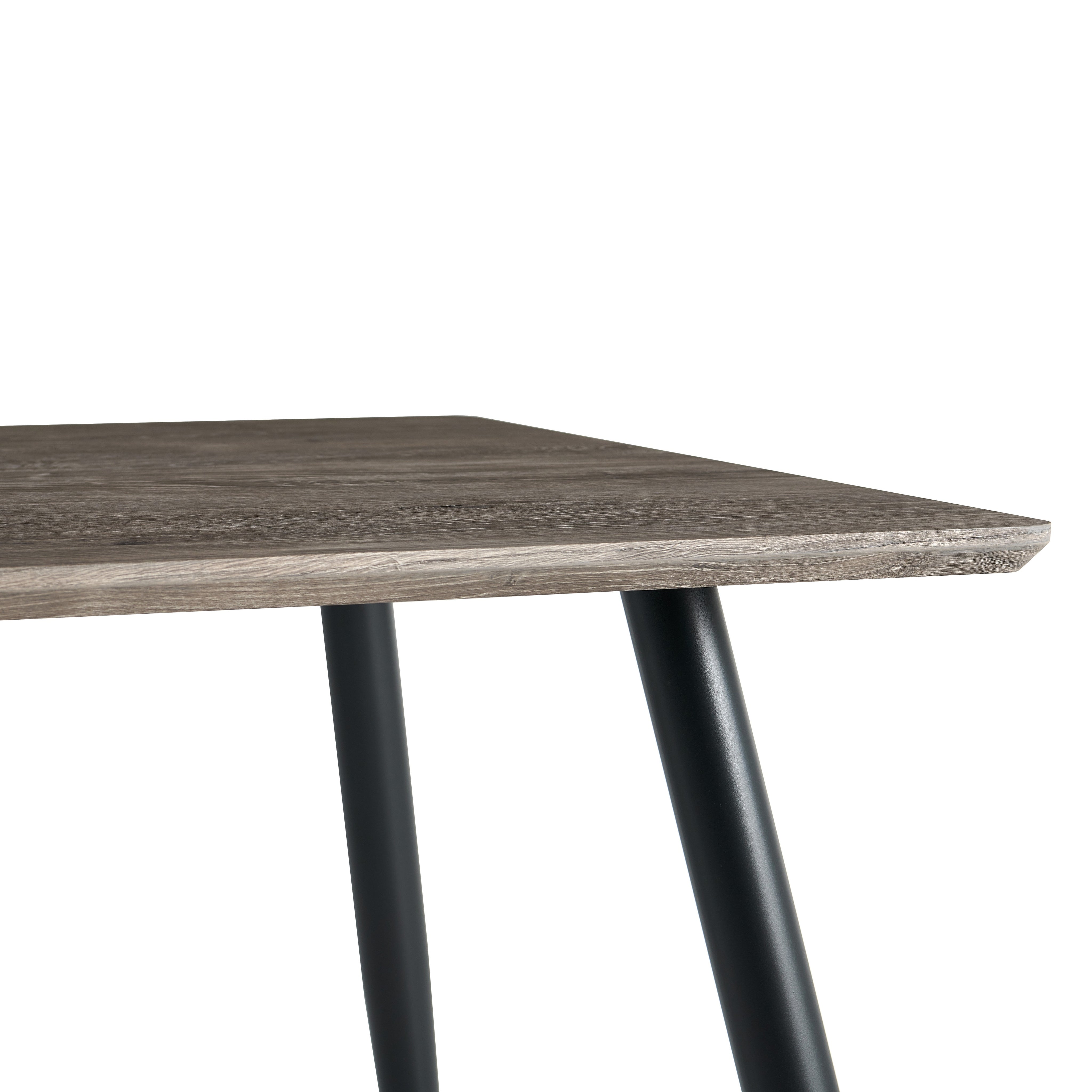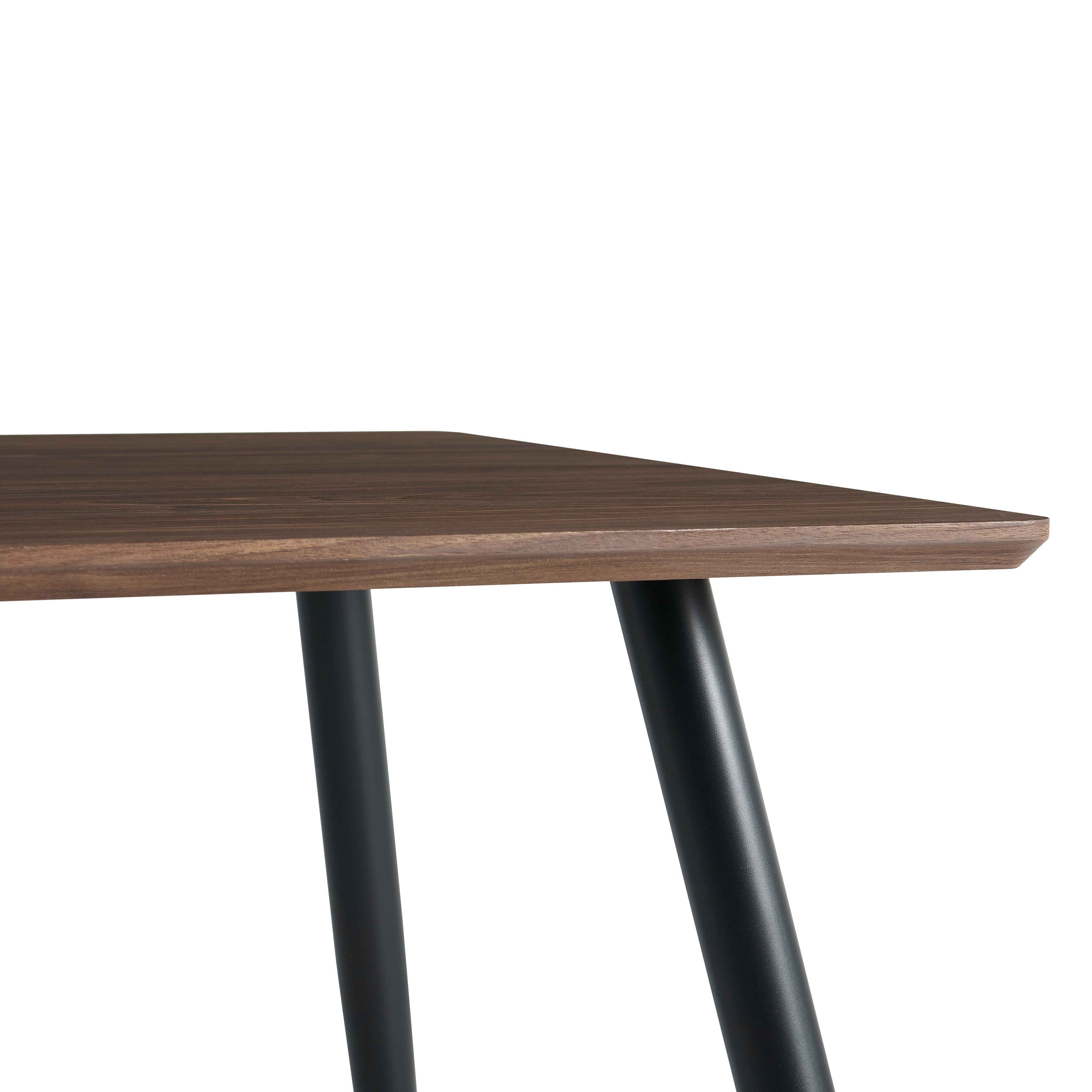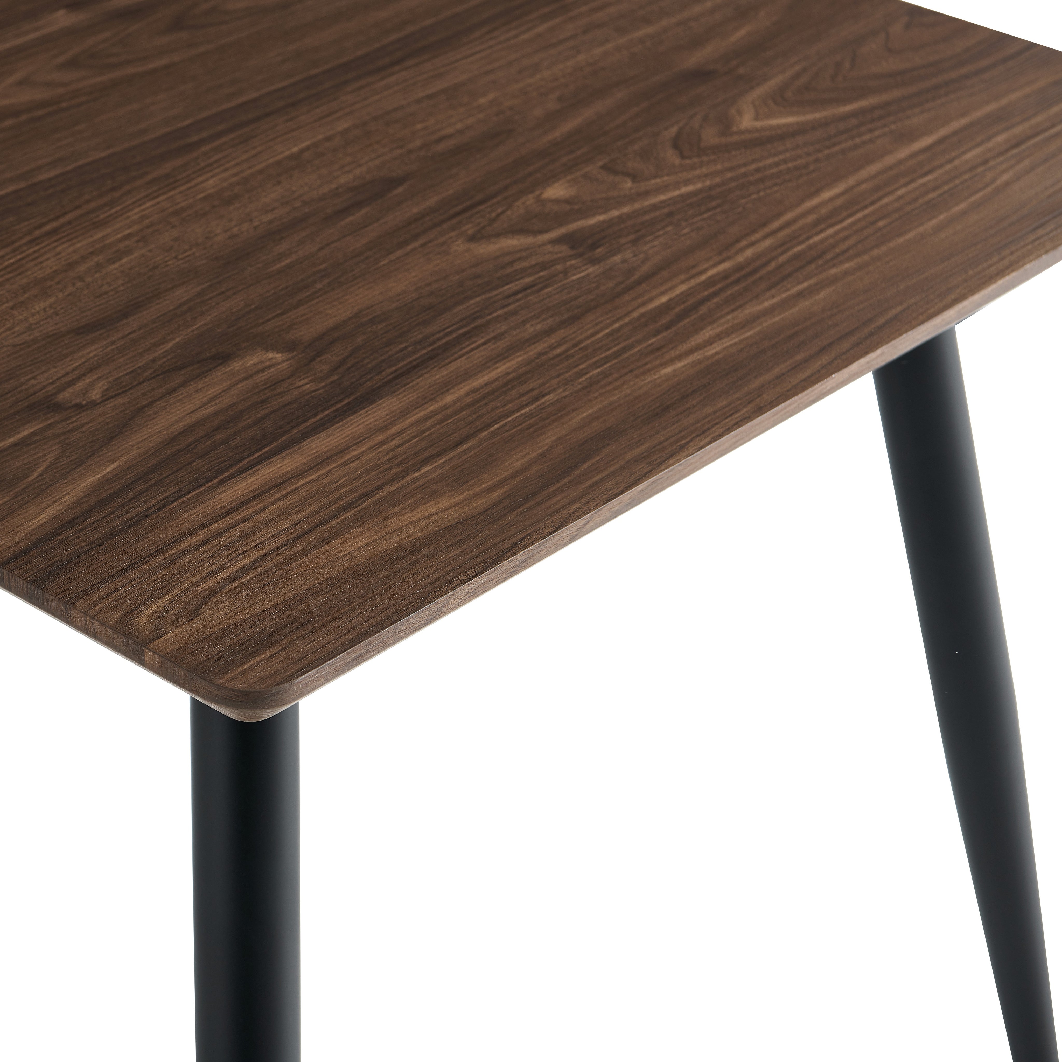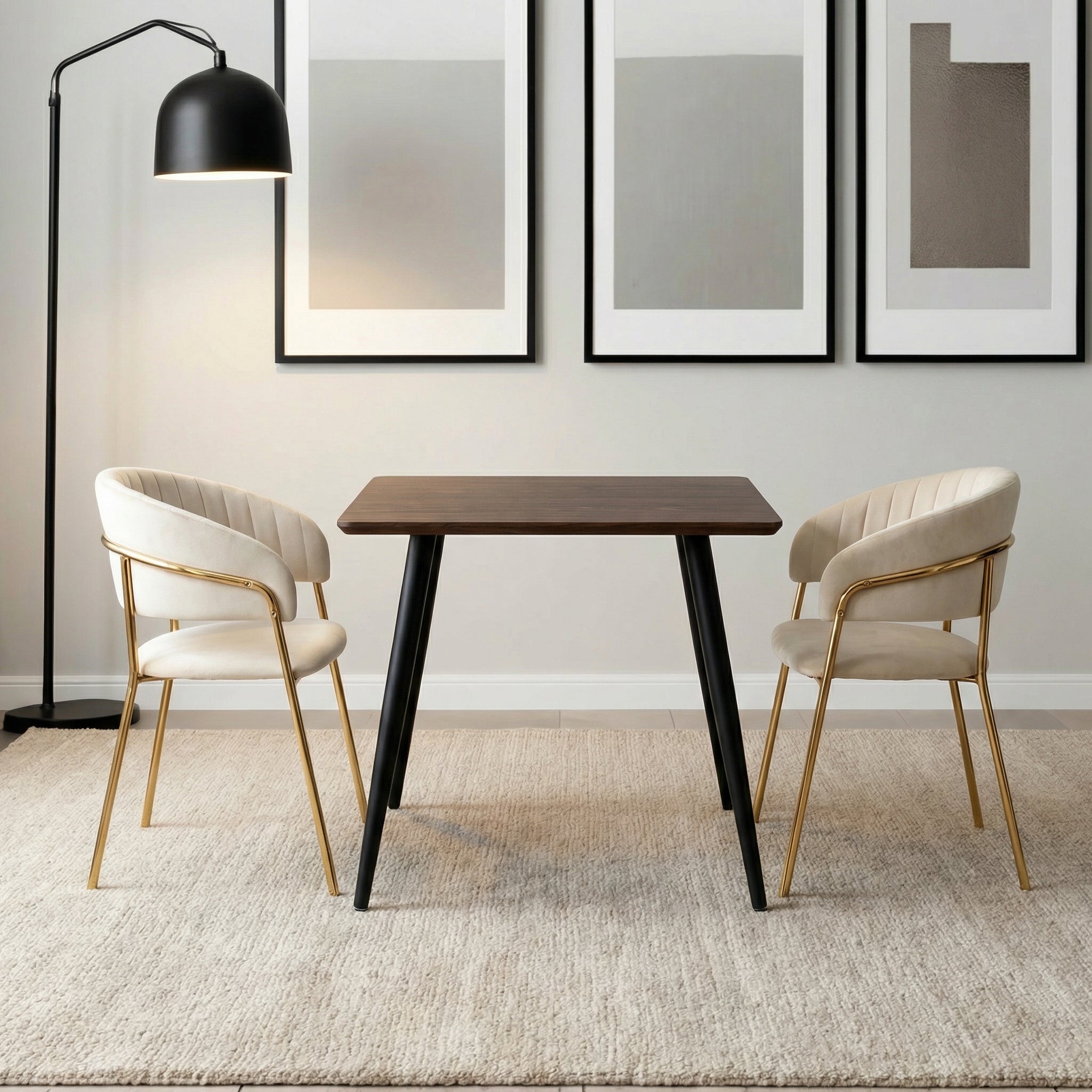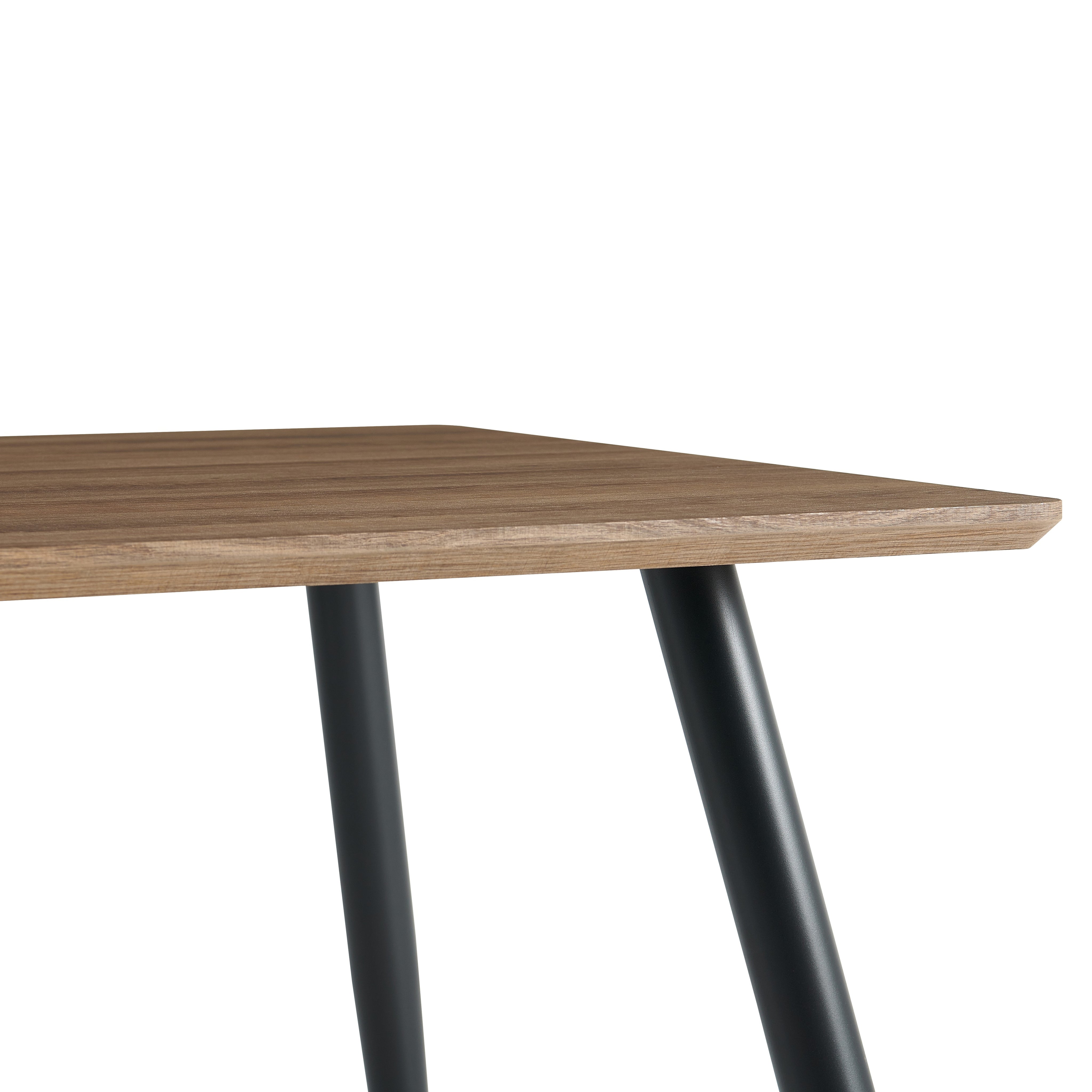 Czarne metalowe nogi malowane proszkowo zapewniają stabilność konstrukcji oraz tworzą elegancki kontrast z ciepłym kolorem blatu. Kompaktowy format 80×80 cm sprawdzi się doskonale w mniejszych jadalniach, kuchniach oraz przestrzeniach w stylu skandynawskim i nowoczesnym.
