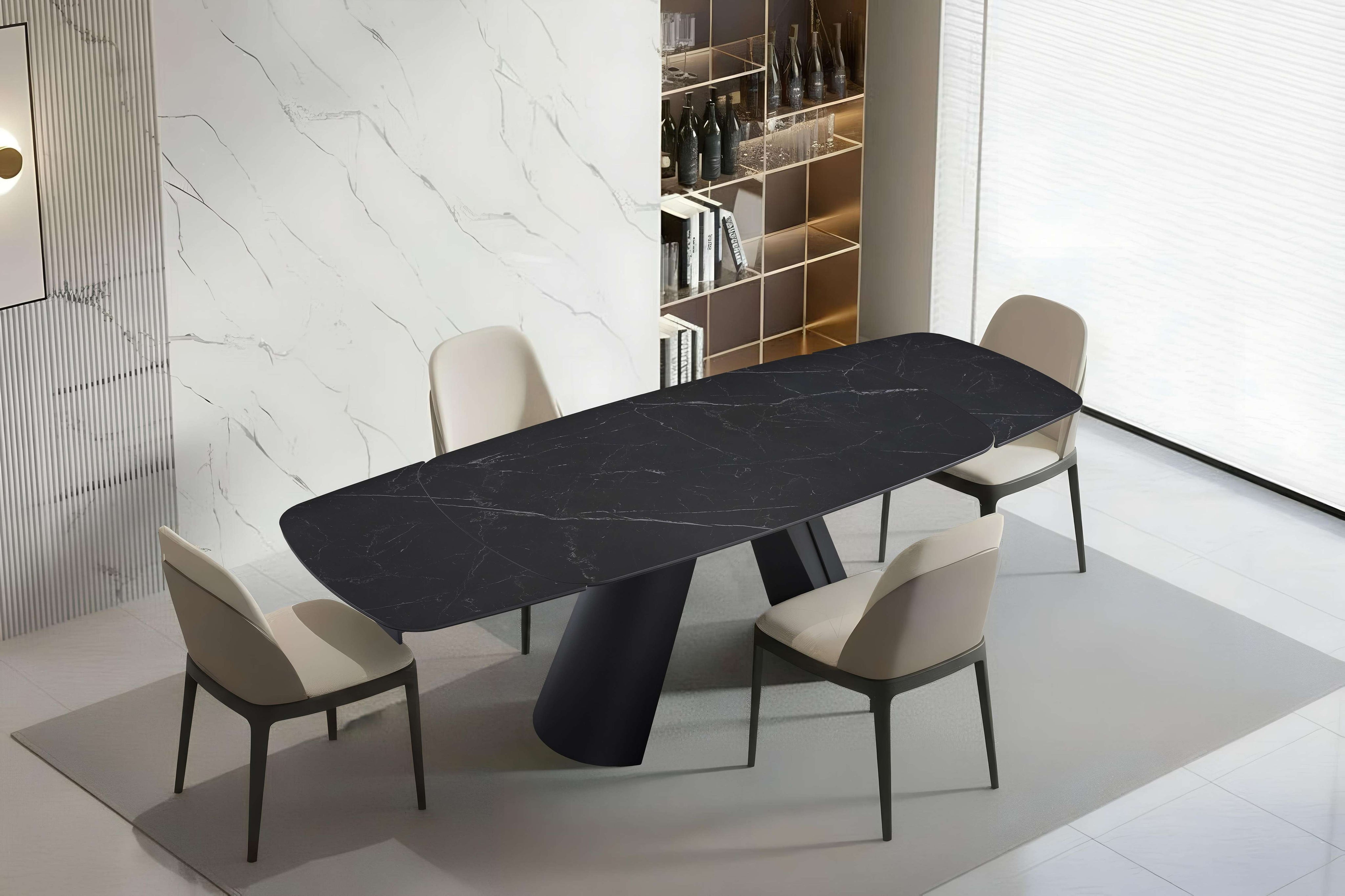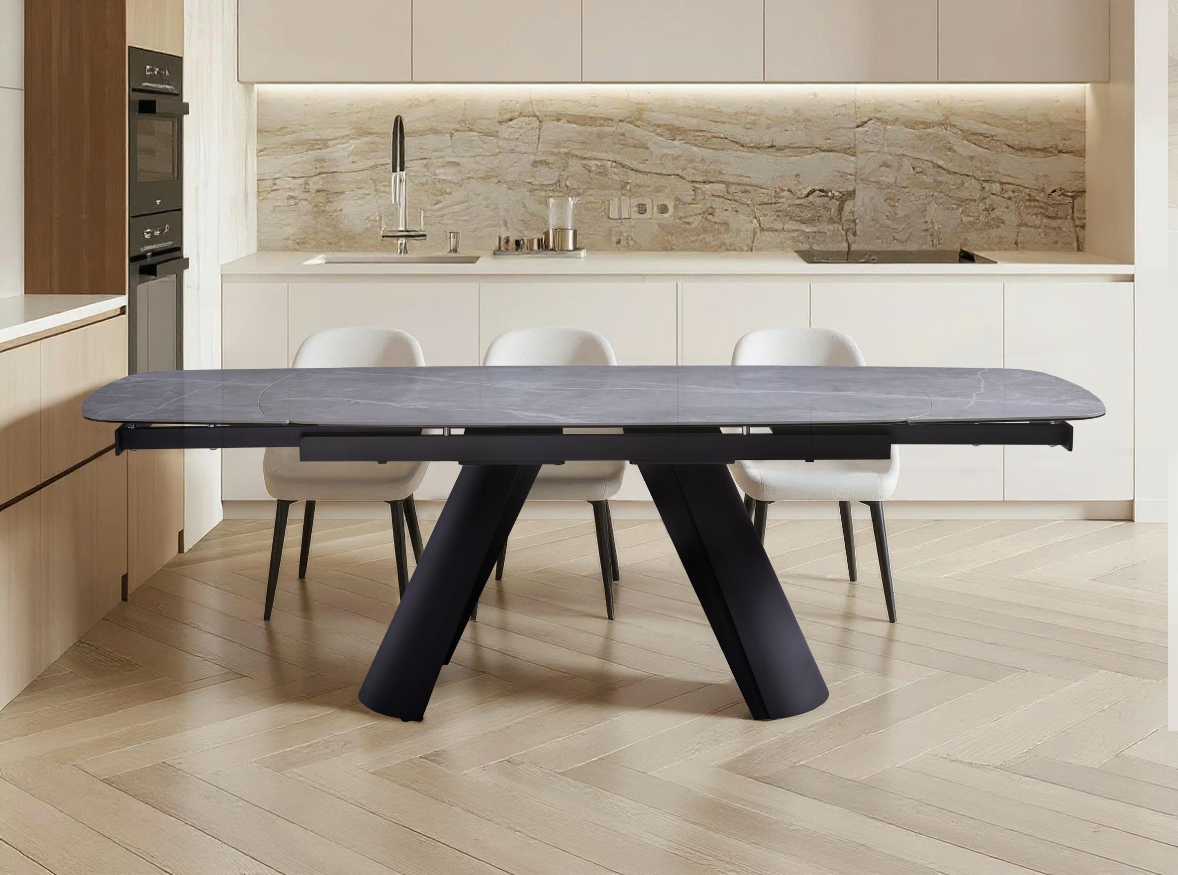 Rozsuwany prostokątny stół jadalny ceramiczny Cinque łączy nowoczesny design z funkcjonalnością. Ceramiczny blat na hartowanym szkle o efekcie marmuru z unikalnym układem żył sprawia, że każdy egzemplarz jest wyjątkowy. Praktyczny stół do codziennego użytku w jadalni lub kuchni. Wygodna przestrzeń do wspólnych posiłków i spotkań. Ceramika odporna na zarysowania, wysoką temperaturę i plamy - łatwa w utrzymaniu czystości. Nowoczesna konstrukcja ceramiki na hartowanym szkle łączy piękno i wytrzymałość ceramiki z lekkością i bezpieczeństwem szkła hartowanego - stół jest znacznie lżejszy od tradycyjnych stołów ceramicznych, co ułatwia transport i przestawianie. Rozsuwany mechanizm pozwala rozłożyć stół z 160cm do 240cm. Wystarczy przetrzeć wilgotną szmatką - ceramiczny blat zachowa piękny wygląd na lata. Solidna stalowa konstrukcja zapewnia stabilność i długowieczność na lata użytkowania.