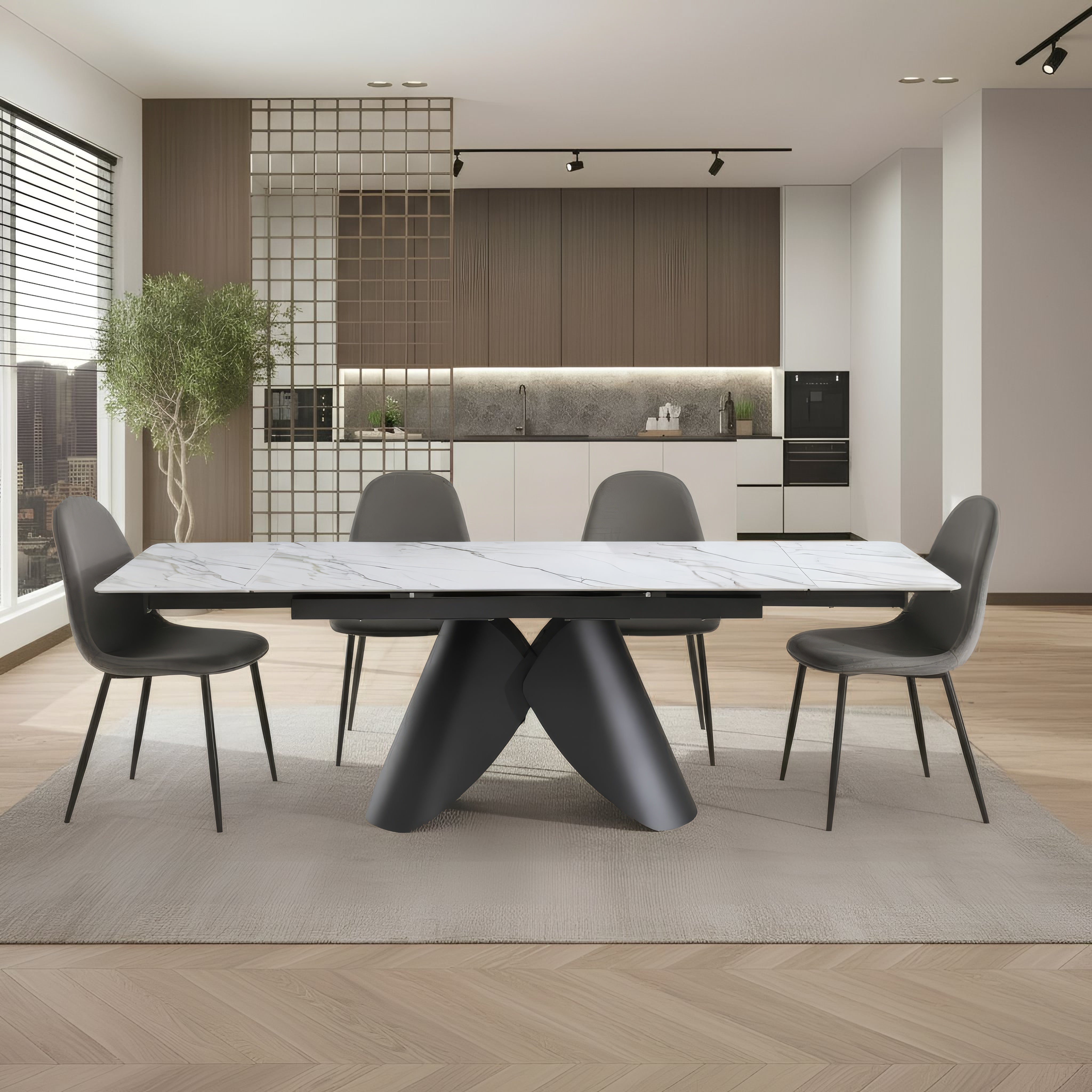 Rozsuwany prostokątny stół jadalny ceramiczny Sestri łączy nowoczesny design z funkcjonalnością. Ceramiczny blat na hartowanym szkle o efekcie marmuru z unikalnym układem żył sprawia, że każdy egzemplarz jest wyjątkowy. Praktyczny stół do codziennego użytku w jadalni lub kuchni. Wygodna przestrzeń do wspólnych posiłków i spotkań. Ceramika odporna na zarysowania, wysoką temperaturę i plamy - łatwa w utrzymaniu czystości. Nowoczesna konstrukcja ceramiki na hartowanym szkle łączy piękno i wytrzymałość ceramiki z lekkością i bezpieczeństwem szkła hartowanego - stół jest znacznie lżejszy od tradycyjnych stołów ceramicznych, co ułatwia transport i przestawianie. Rozsuwany mechanizm pozwala rozłożyć stół z 160cm do 240cm. Wystarczy przetrzeć wilgotną szmatką - ceramiczny blat zachowa piękny wygląd na lata. Solidna stalowa konstrukcja zapewnia stabilność i długowieczność na lata użytkowania.
